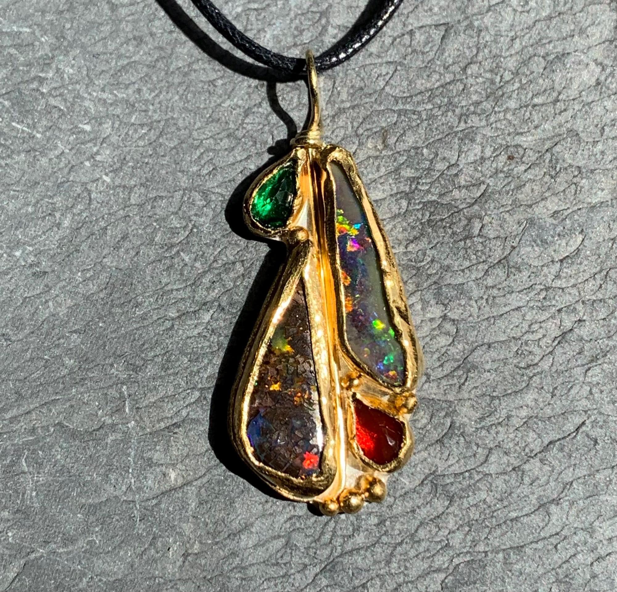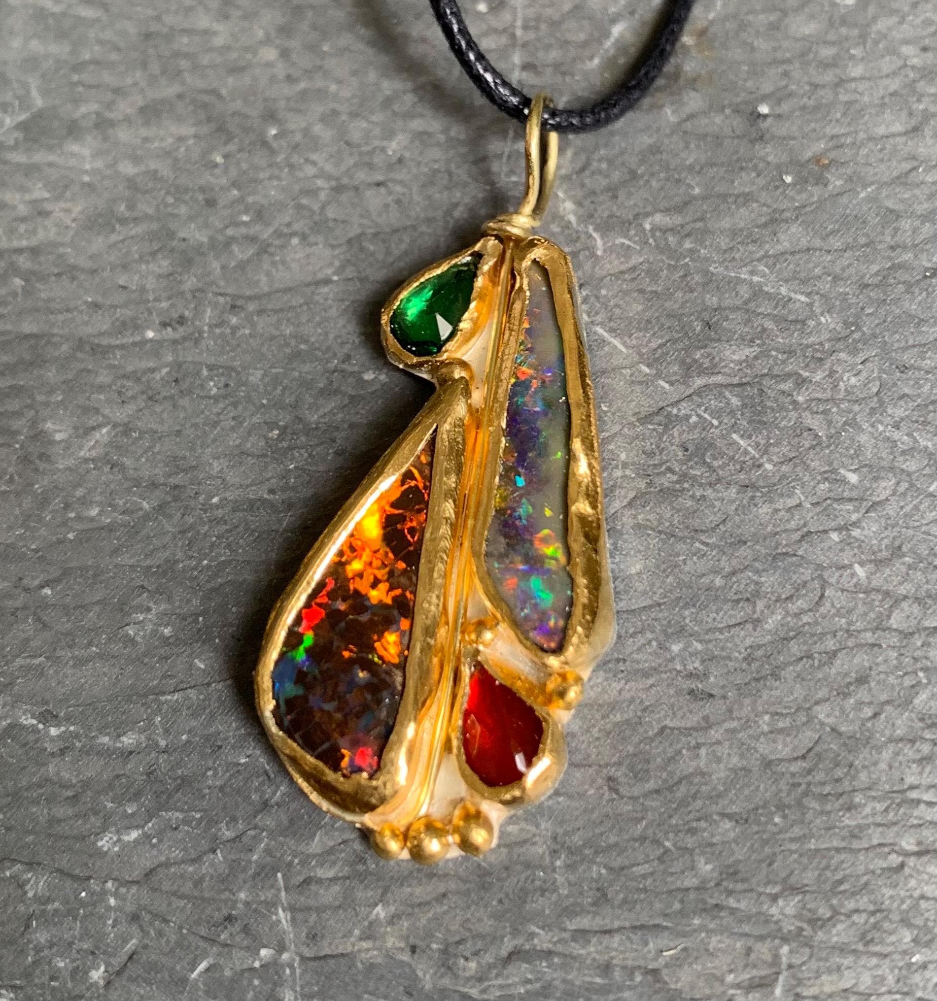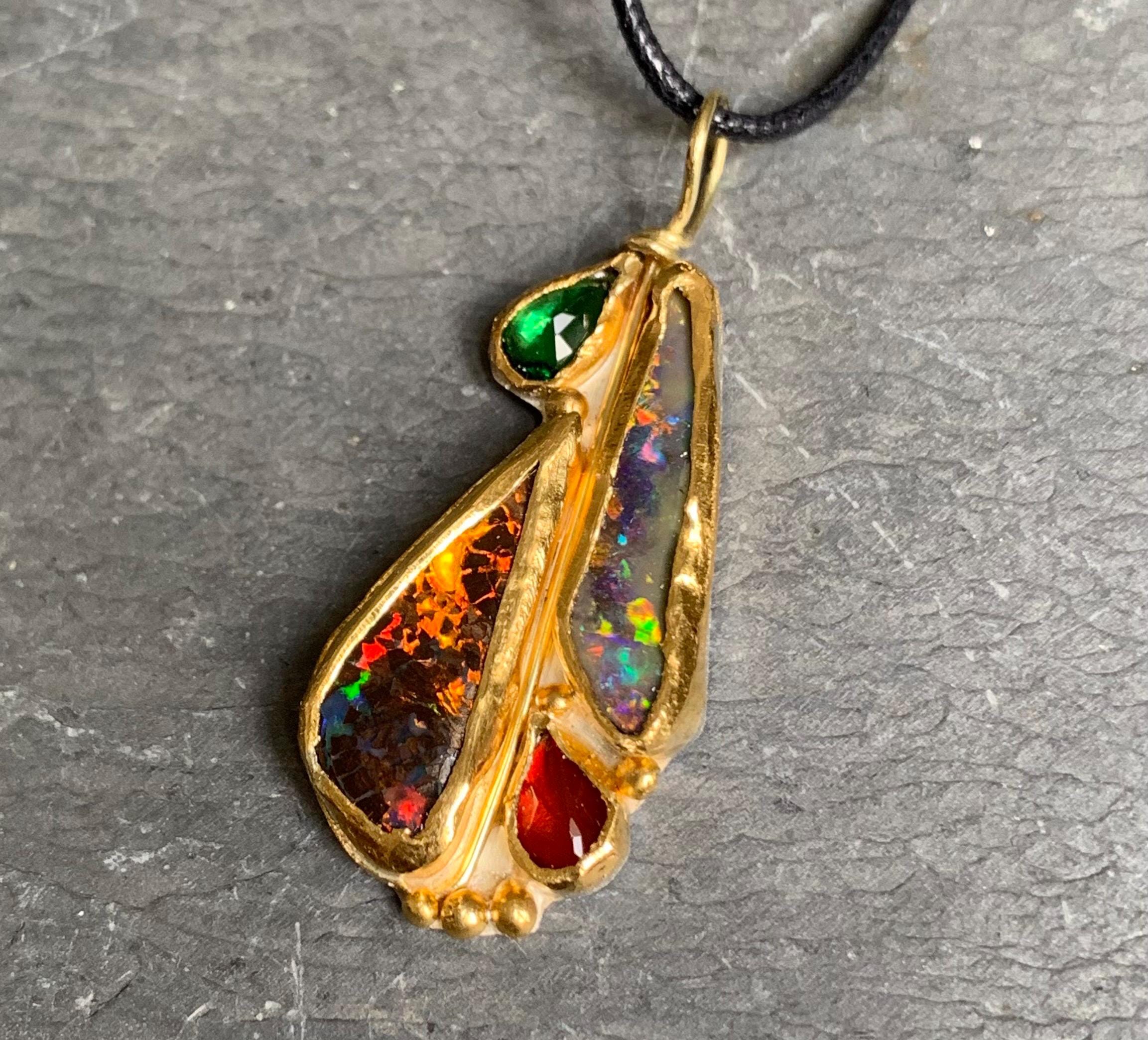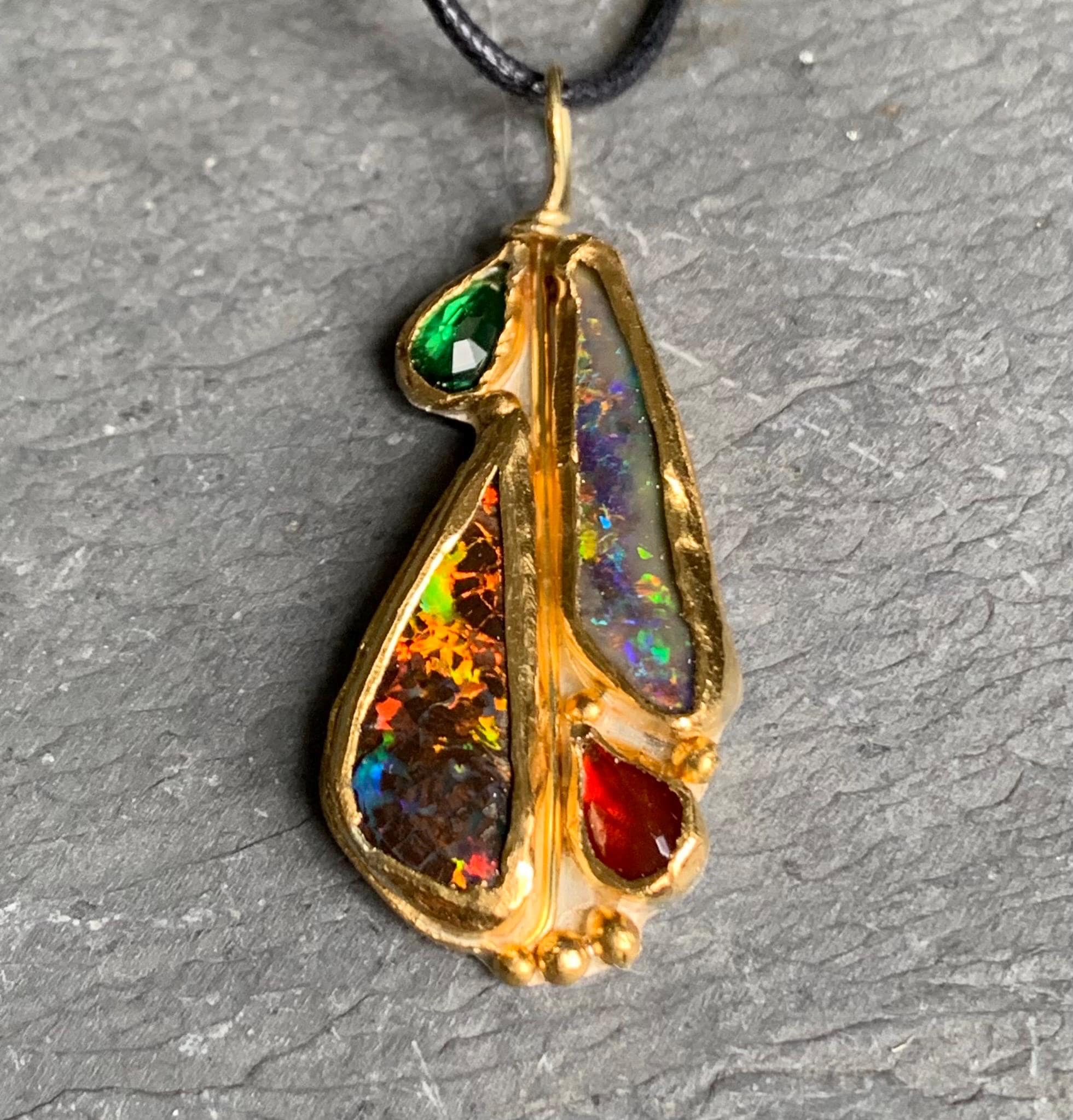 In the pendant are setted 2 australian boulder opals ( 18,4 mm x 6,9 mm; 3,05 ct et 19,6 mm x 10 mm; 1,8 ct ) 1 mexican fire opal ( 0,2 ct; 6,3 mm x 4,2 mm ) and 1 chromdiopside ( 0,25 ct ; 6,3 mm x 3,9 mm ).