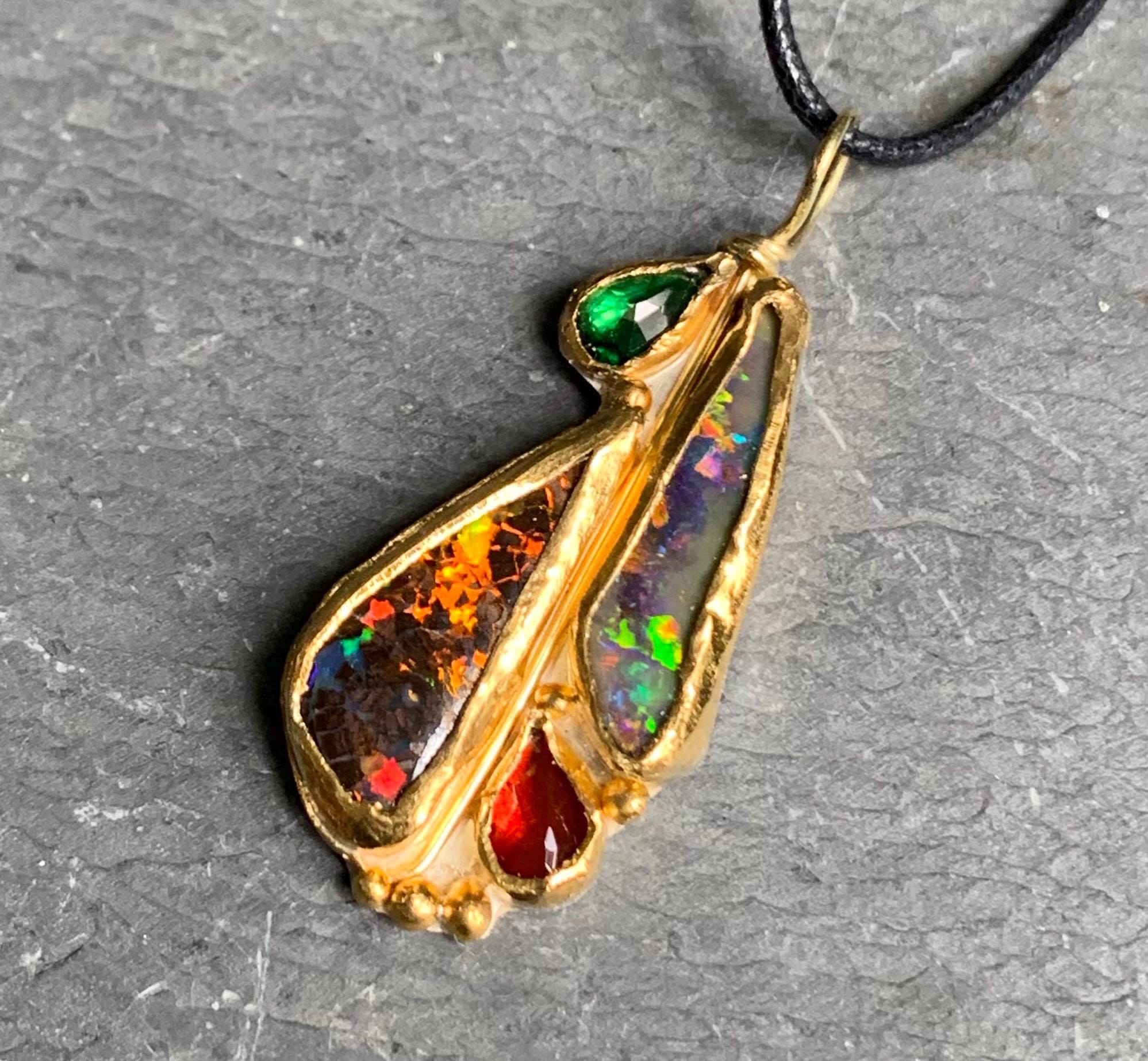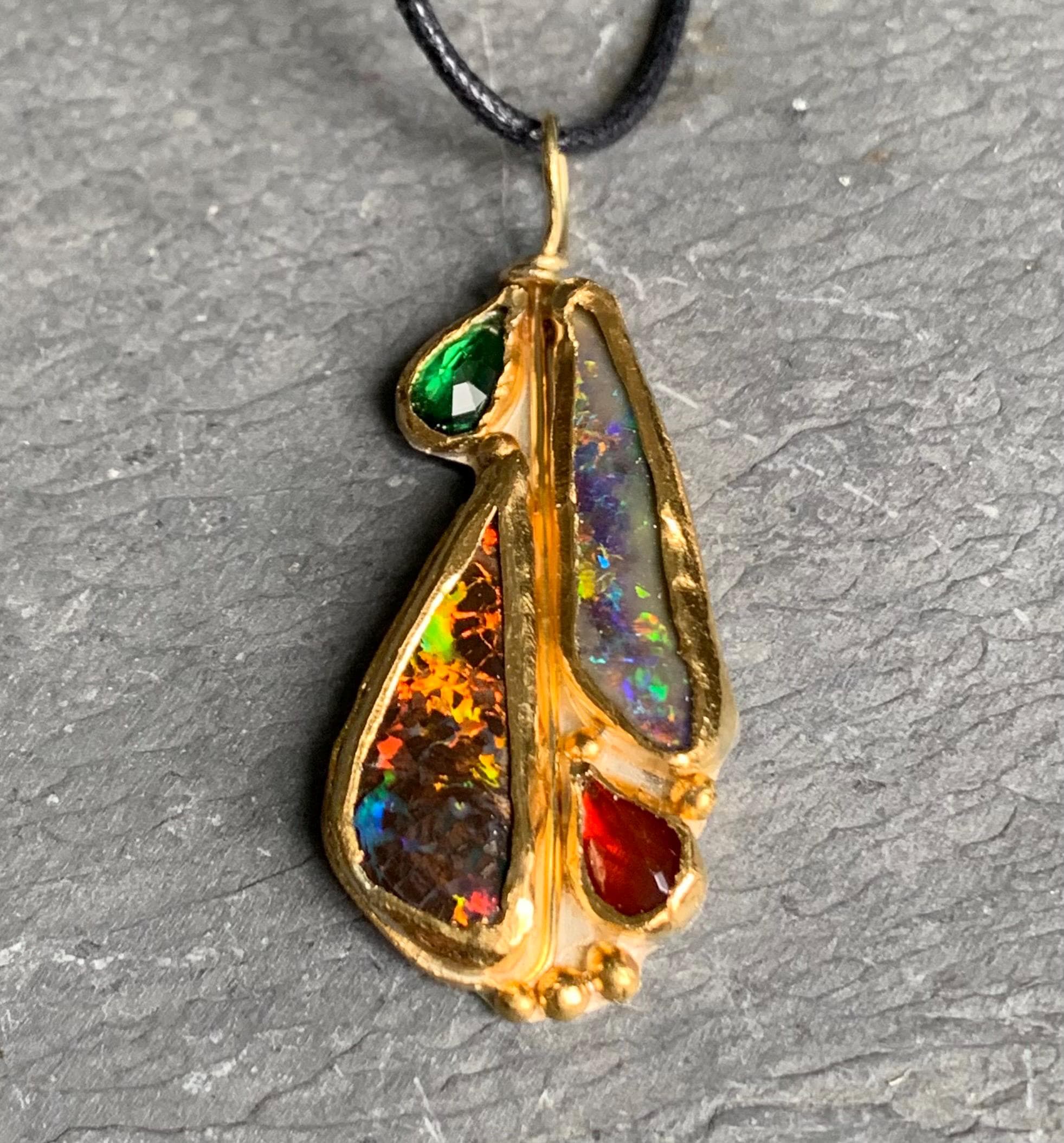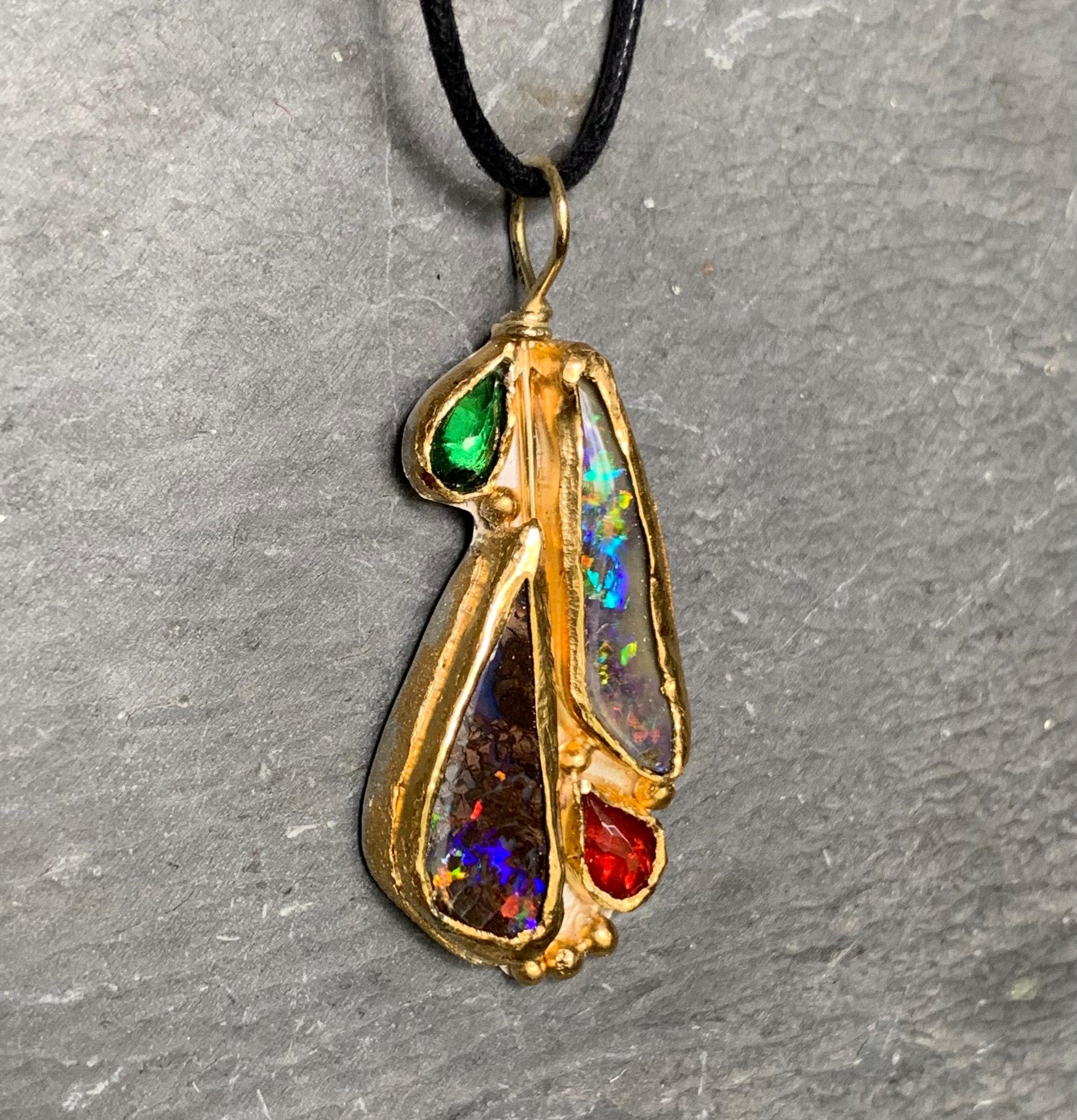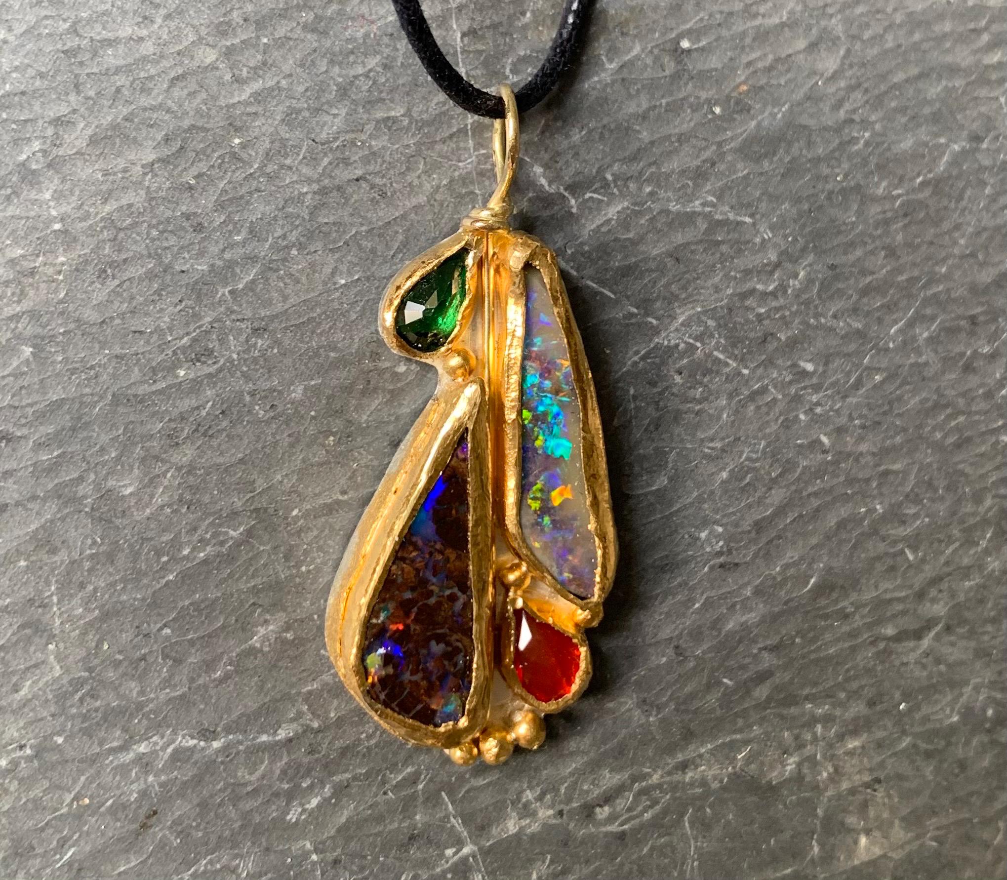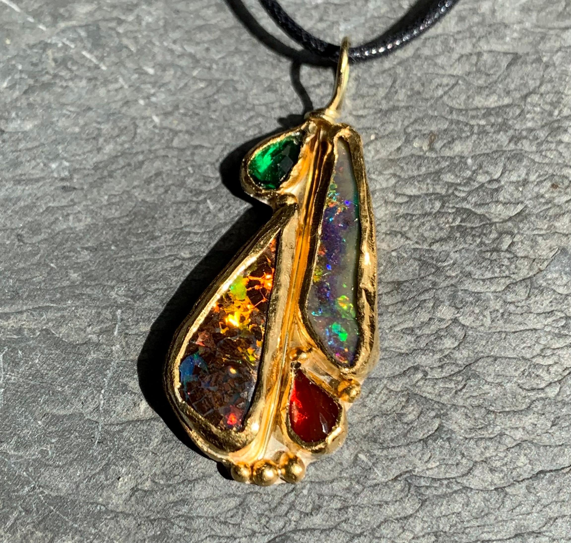 In the pendant are setted 2 australian boulder opals ( 18,4 mm x 6,9 mm; 3,05 ct et 19,6 mm x 10 mm; 1,8 ct ) 1 mexican fire opal ( 0,2 ct; 6,3 mm x 4,2 mm ) and 1 chromdiopside ( 0,25 ct ; 6,3 mm x 3,9 mm ).