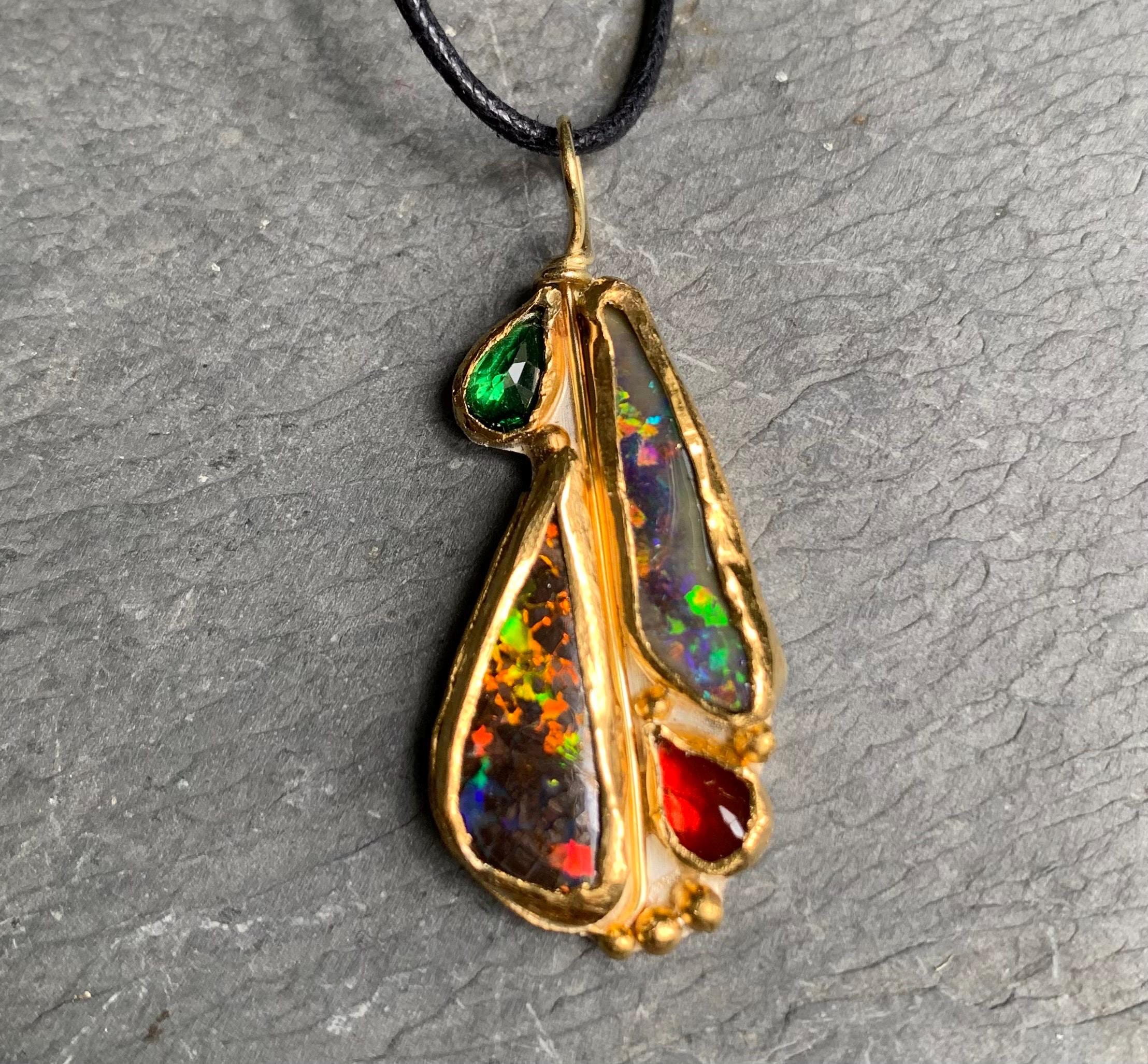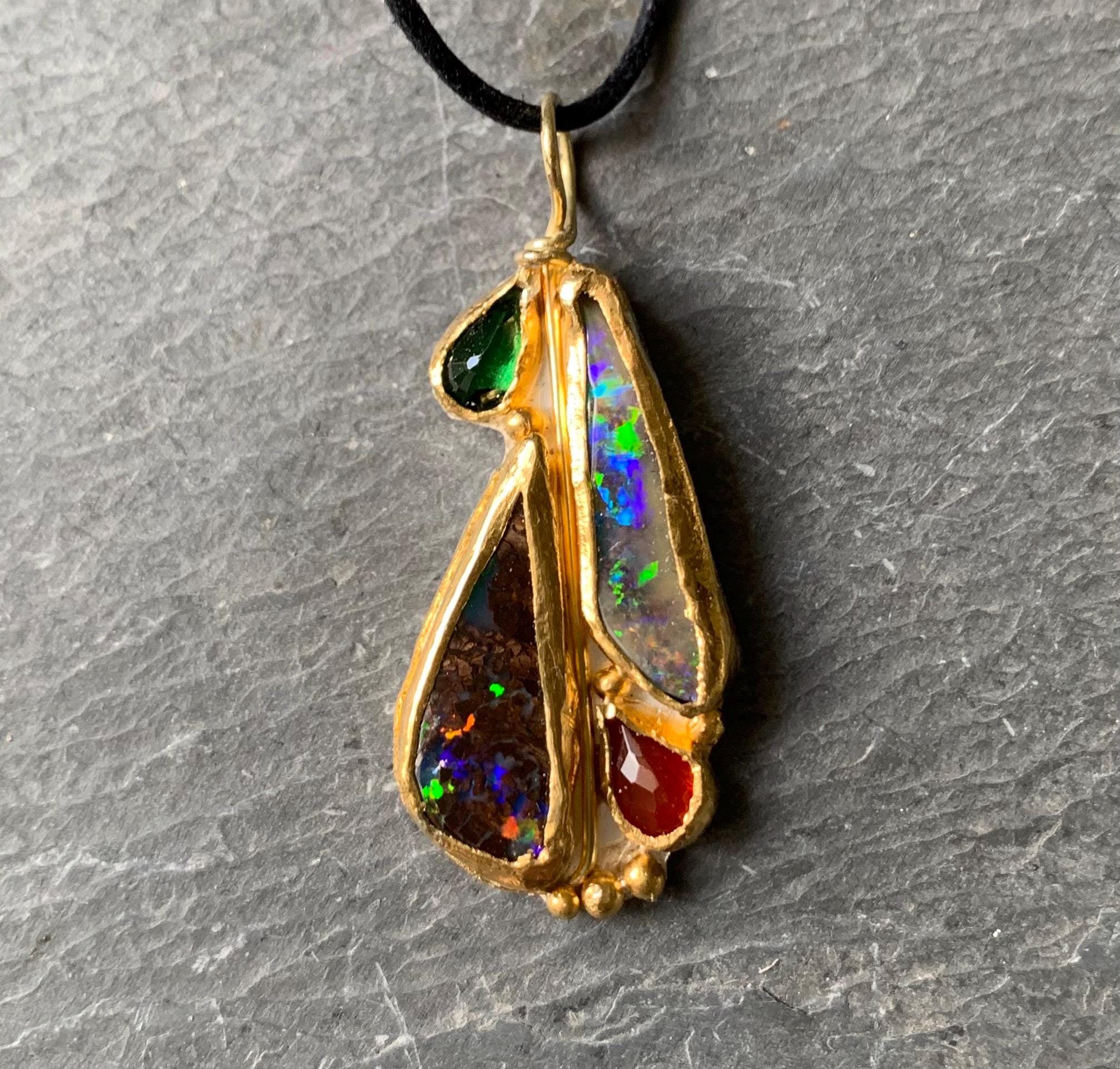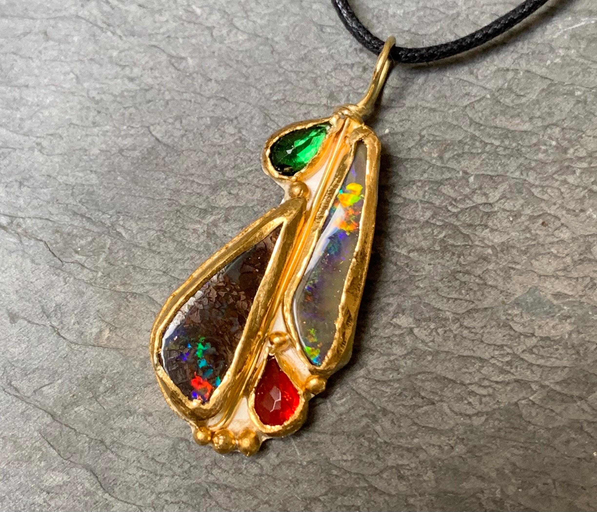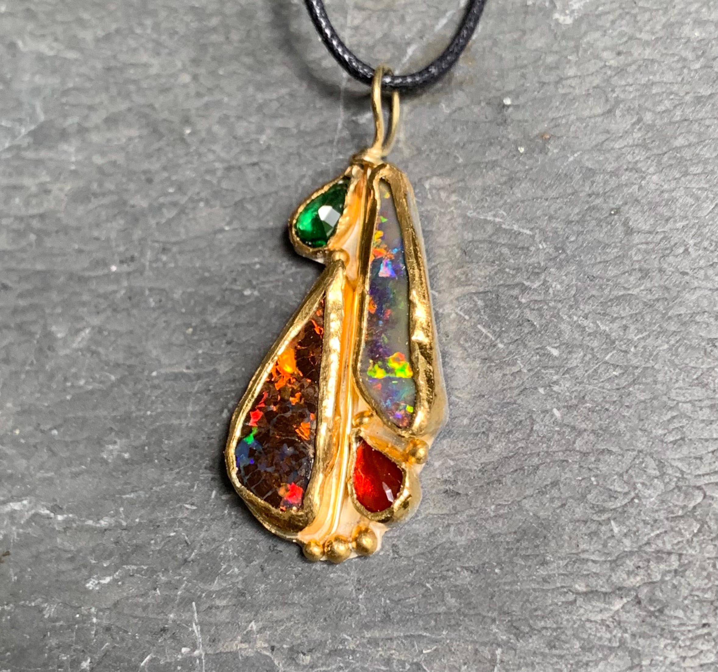 In the pendant are setted 2 australian boulder opals ( 18,4 mm x 6,9 mm; 3,05 ct et 19,6 mm x 10 mm; 1,8 ct ) 1 mexican fire opal ( 0,2 ct; 6,3 mm x 4,2 mm ) and 1 chromdiopside ( 0,25 ct ; 6,3 mm x 3,9 mm ).