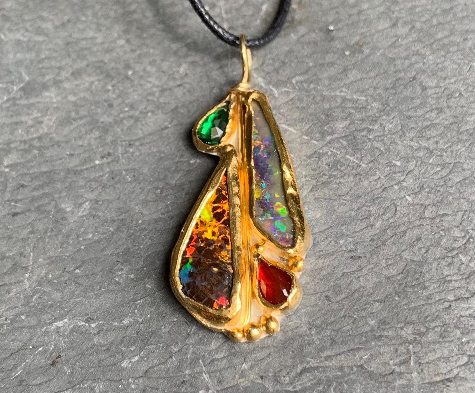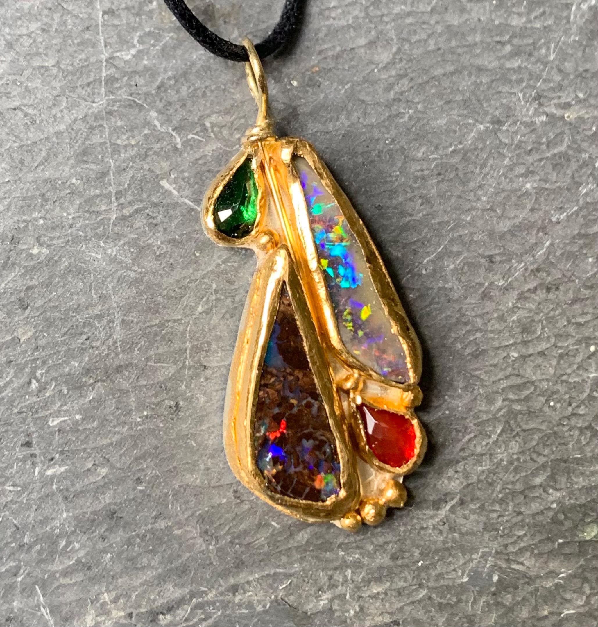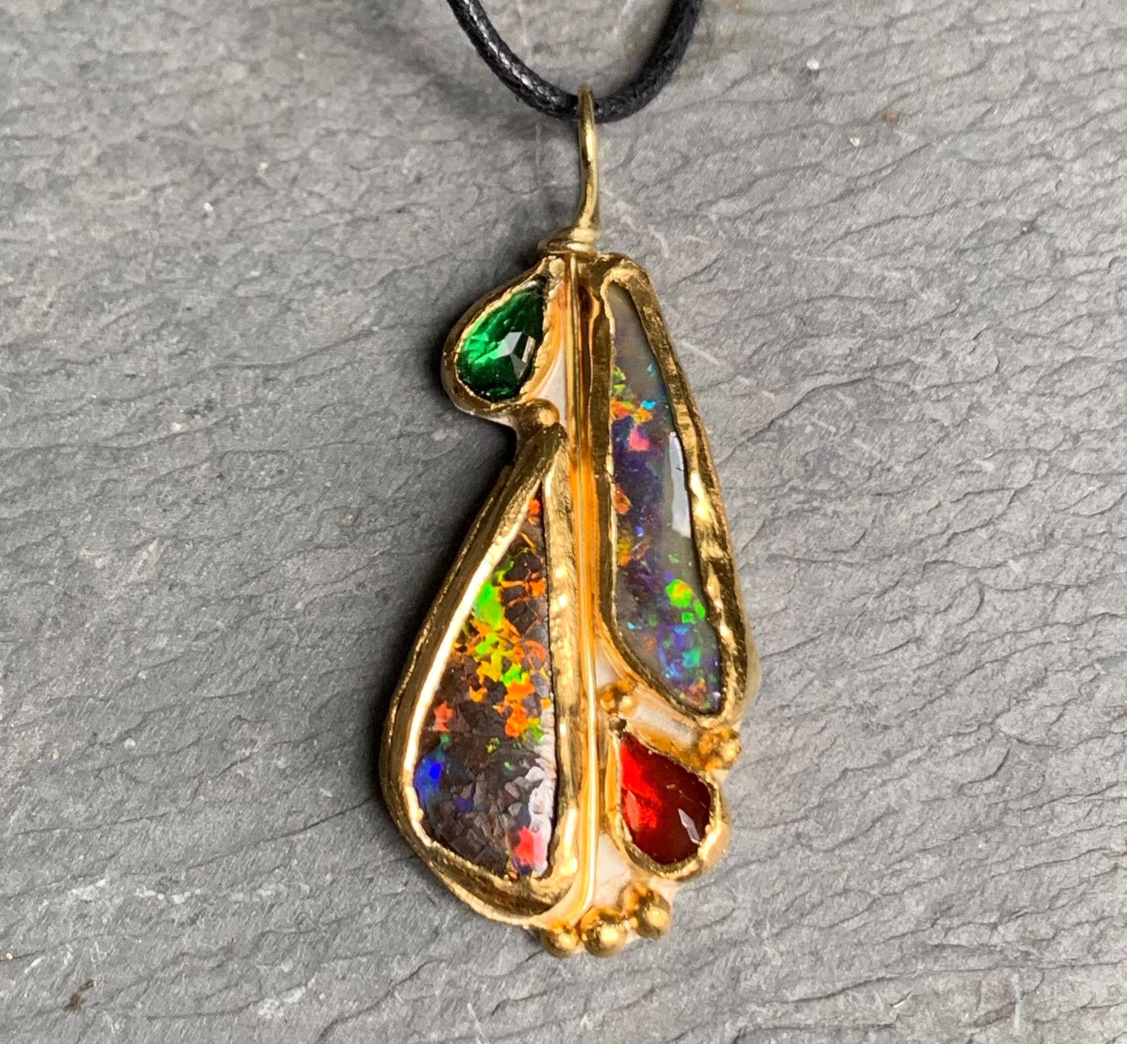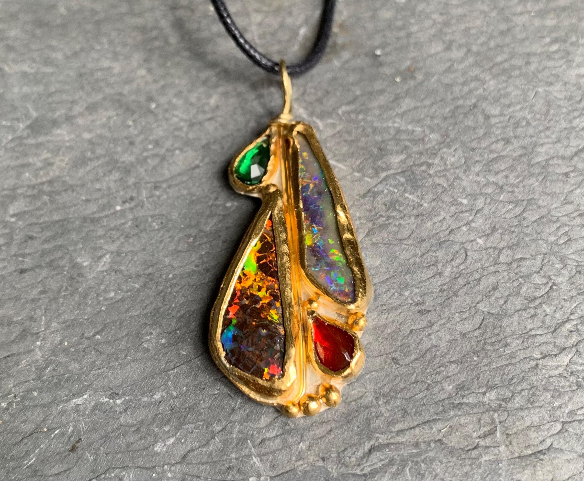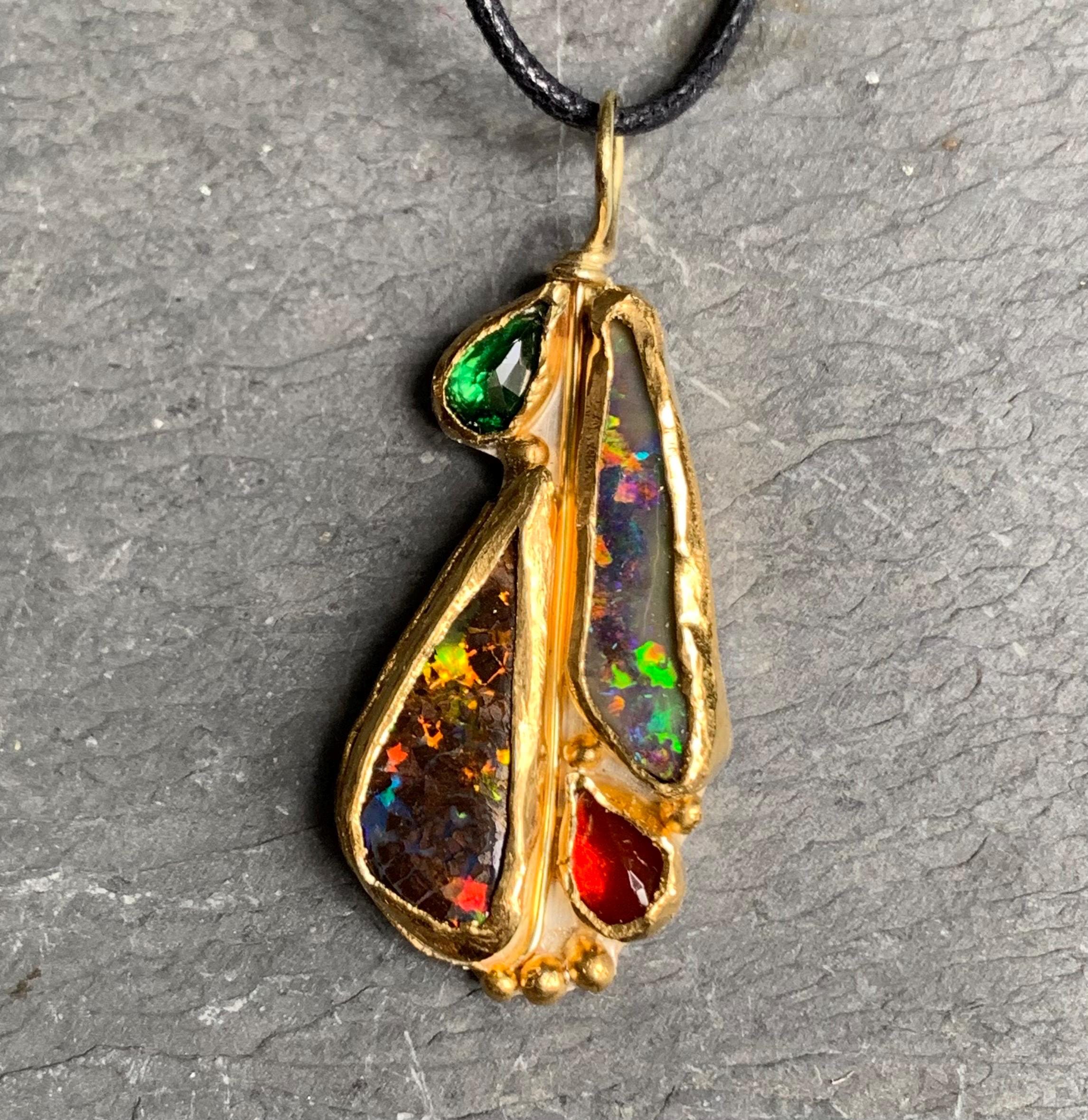In the pendant are setted 2 australian boulder opals ( 18,4 mm x 6,9 mm; 3,05 ct et 19,6 mm x 10 mm; 1,8 ct ) 1 mexican fire opal ( 0,2 ct; 6,3 mm x 4,2 mm ) and 1 chromdiopside ( 0,25 ct ; 6,3 mm x 3,9 mm ).