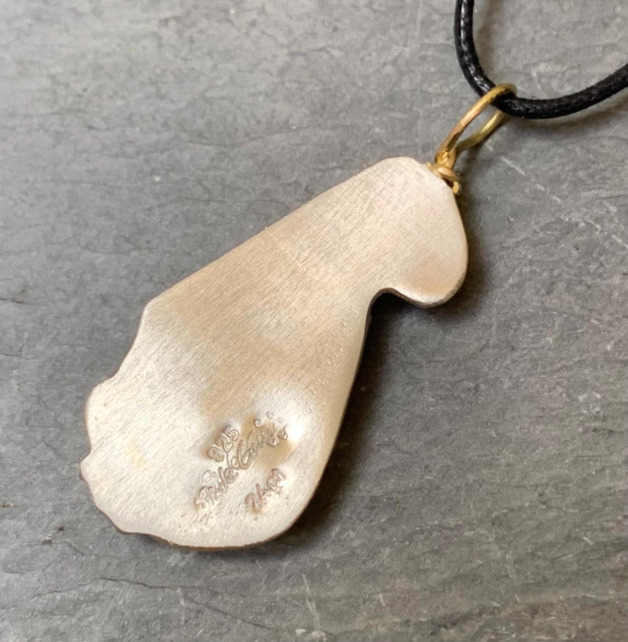 The pendant is done in a combination of silver, 18 kt yellow gold and hammered finegold (24 kt) .