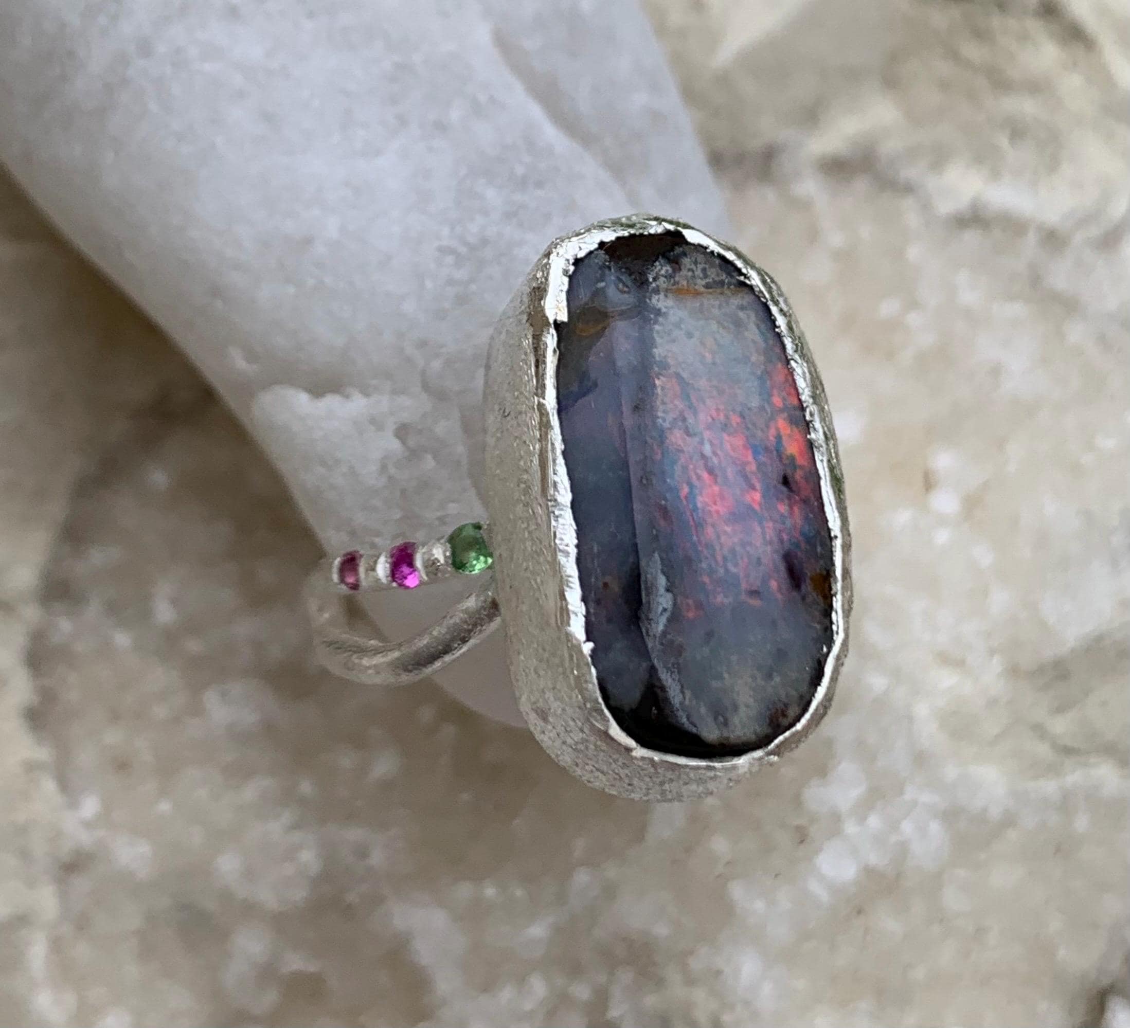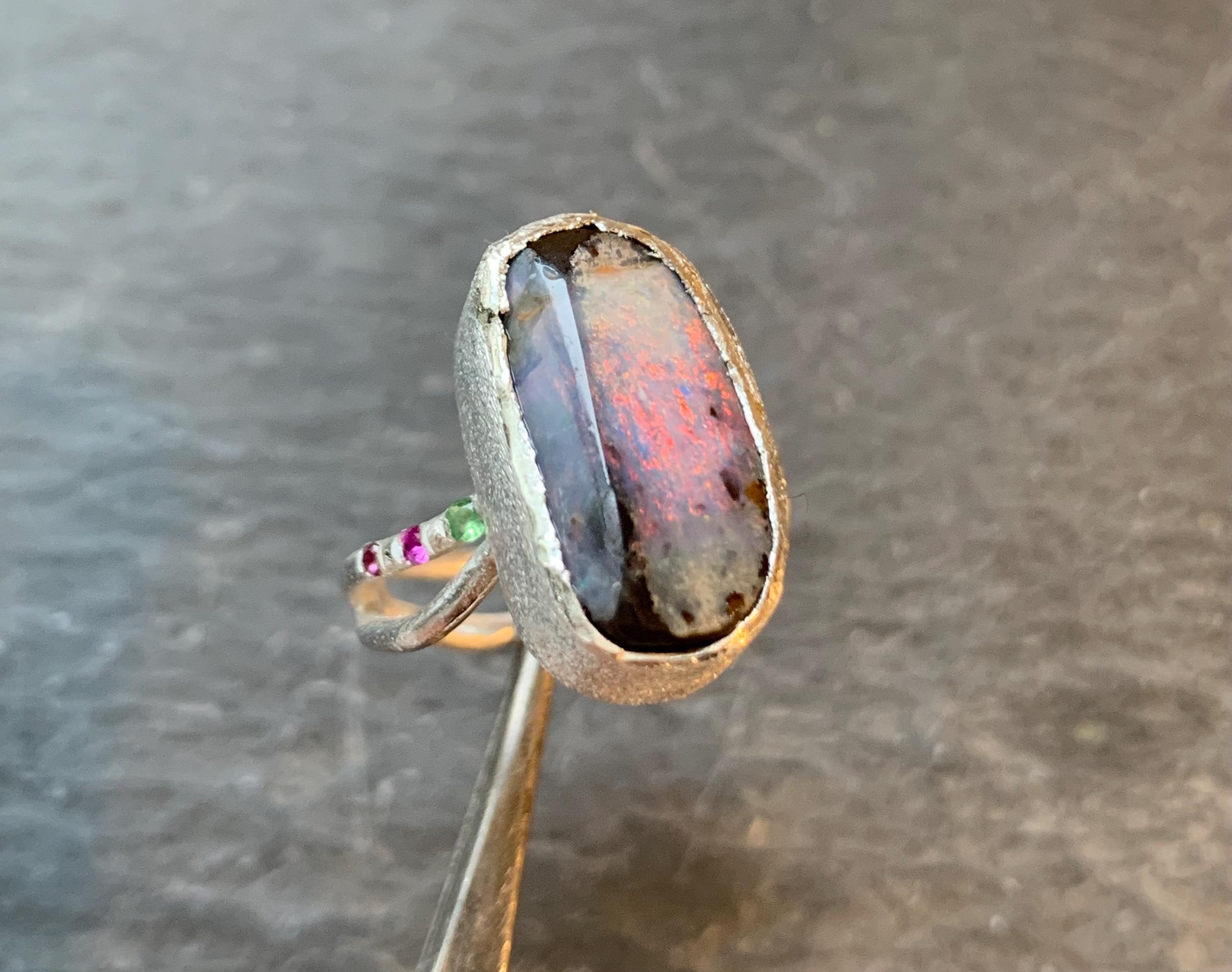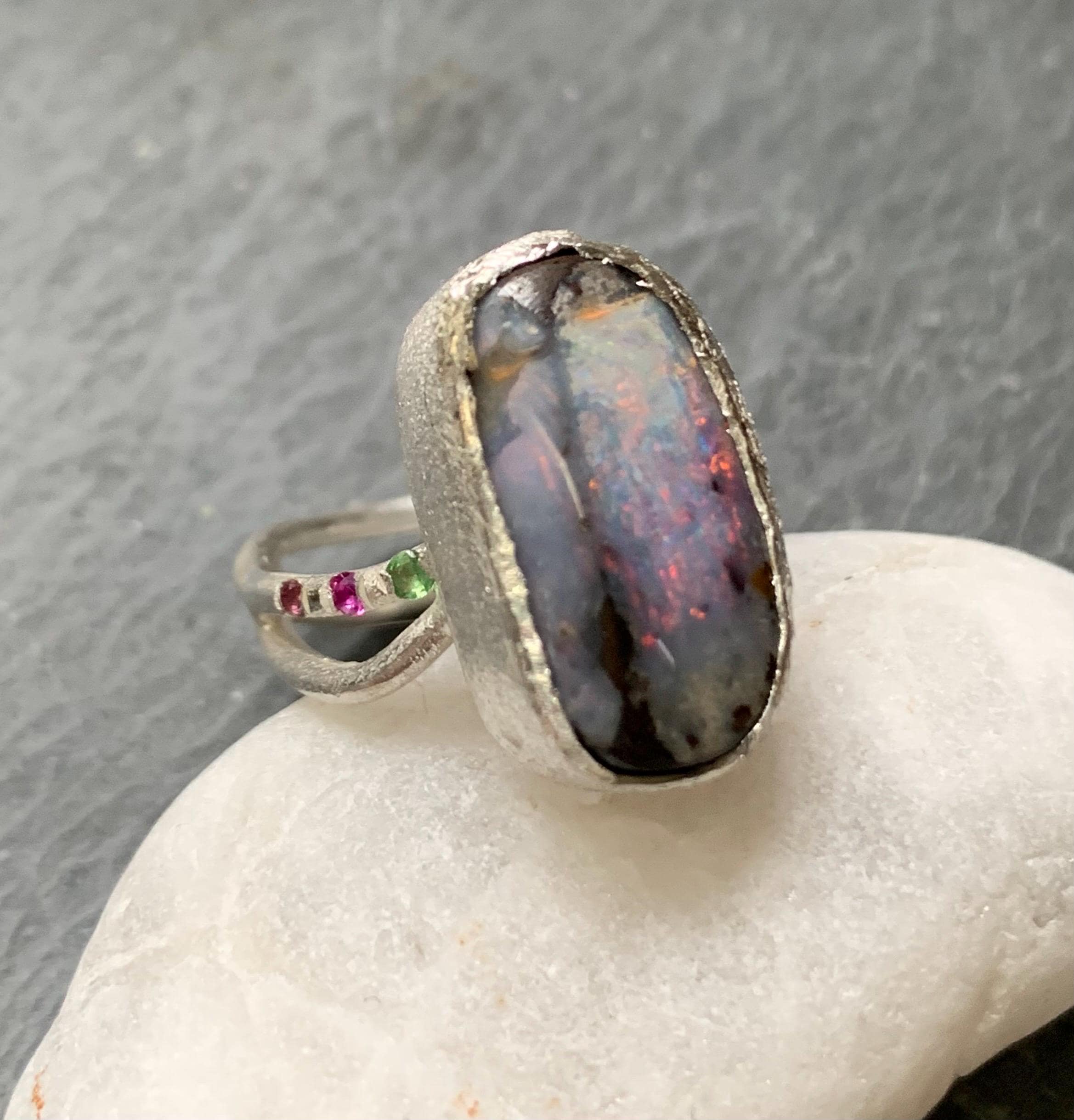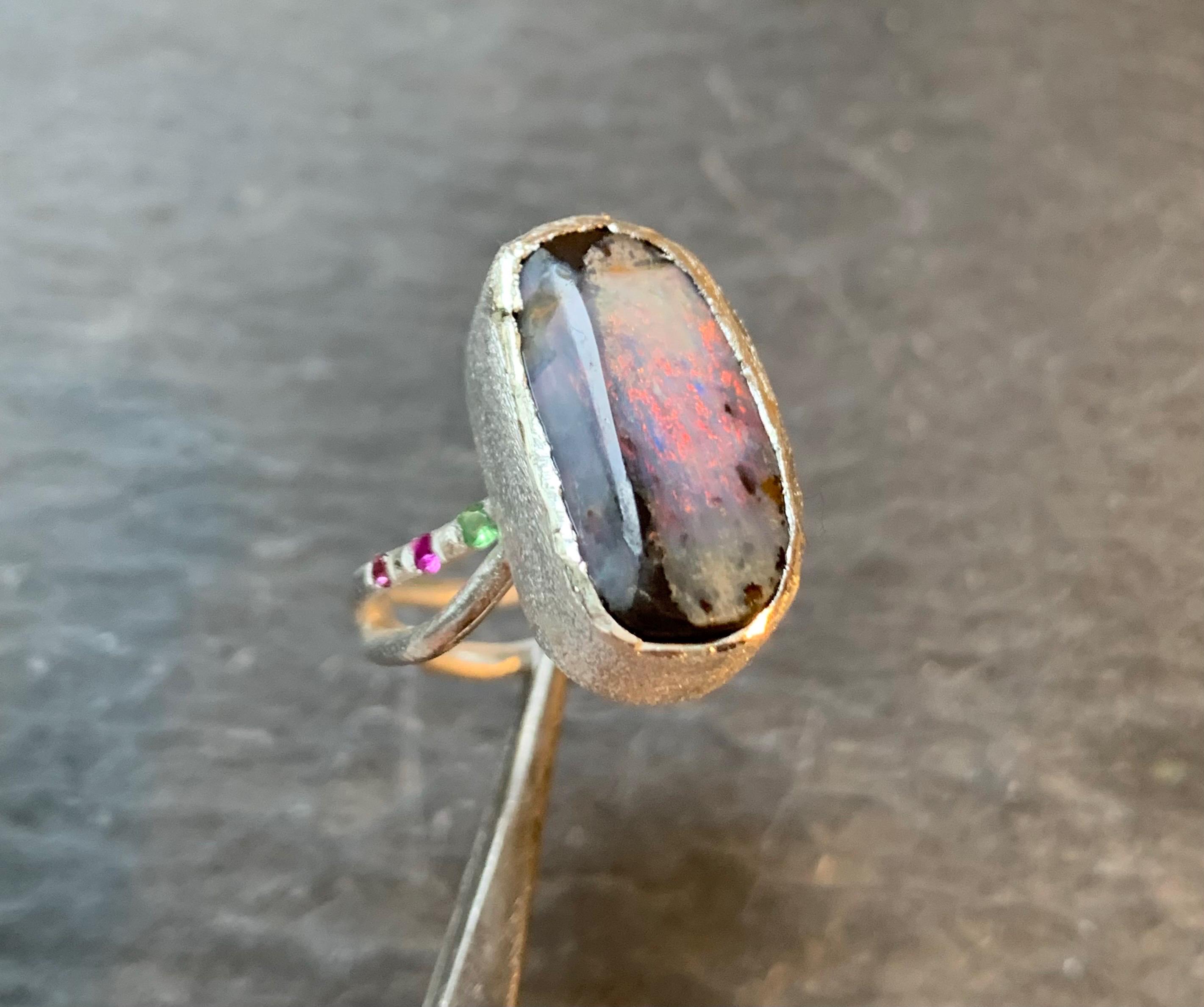 The ring is done in silver with 1 australian boulder opal and 4 little gem stones, 1 garnet, 1 ruby, 2 tsavorites setted beside the opal.