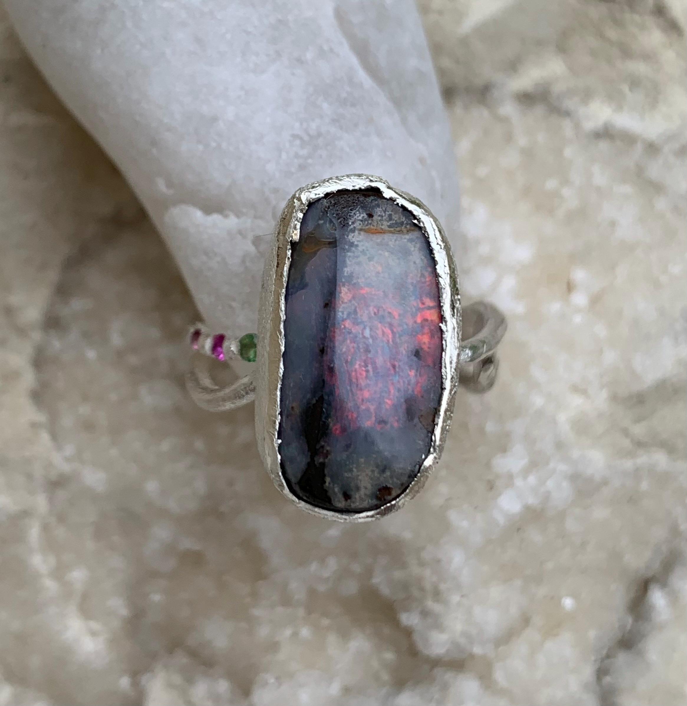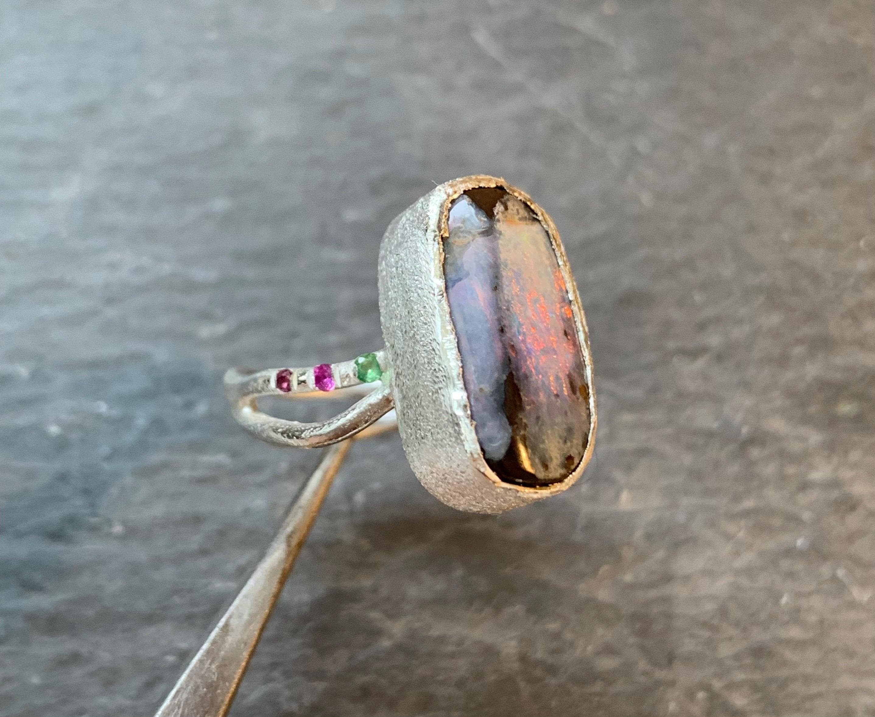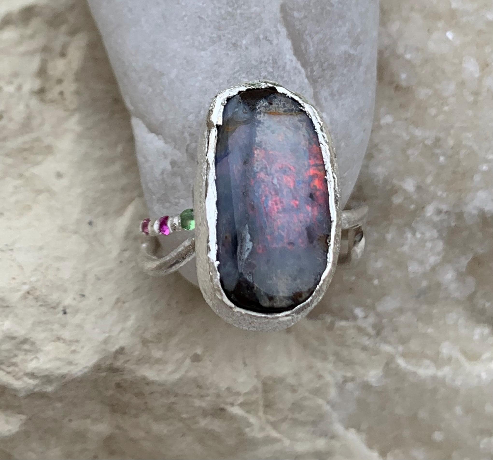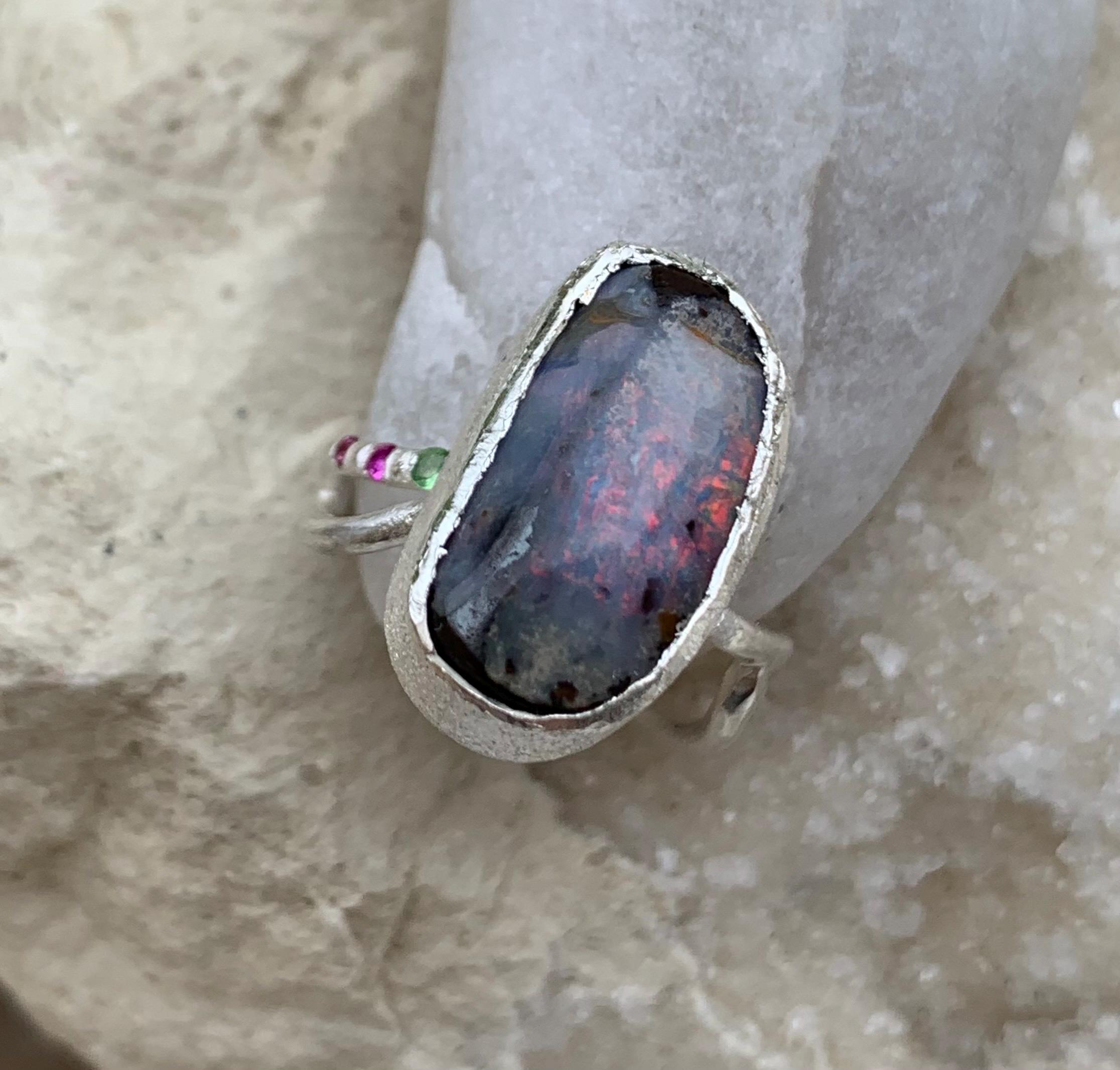 The ring is done in silver with 1 australian boulder opal and 4 little gem stones, 1 garnet, 1 ruby, 2 tsavorites setted beside the opal.