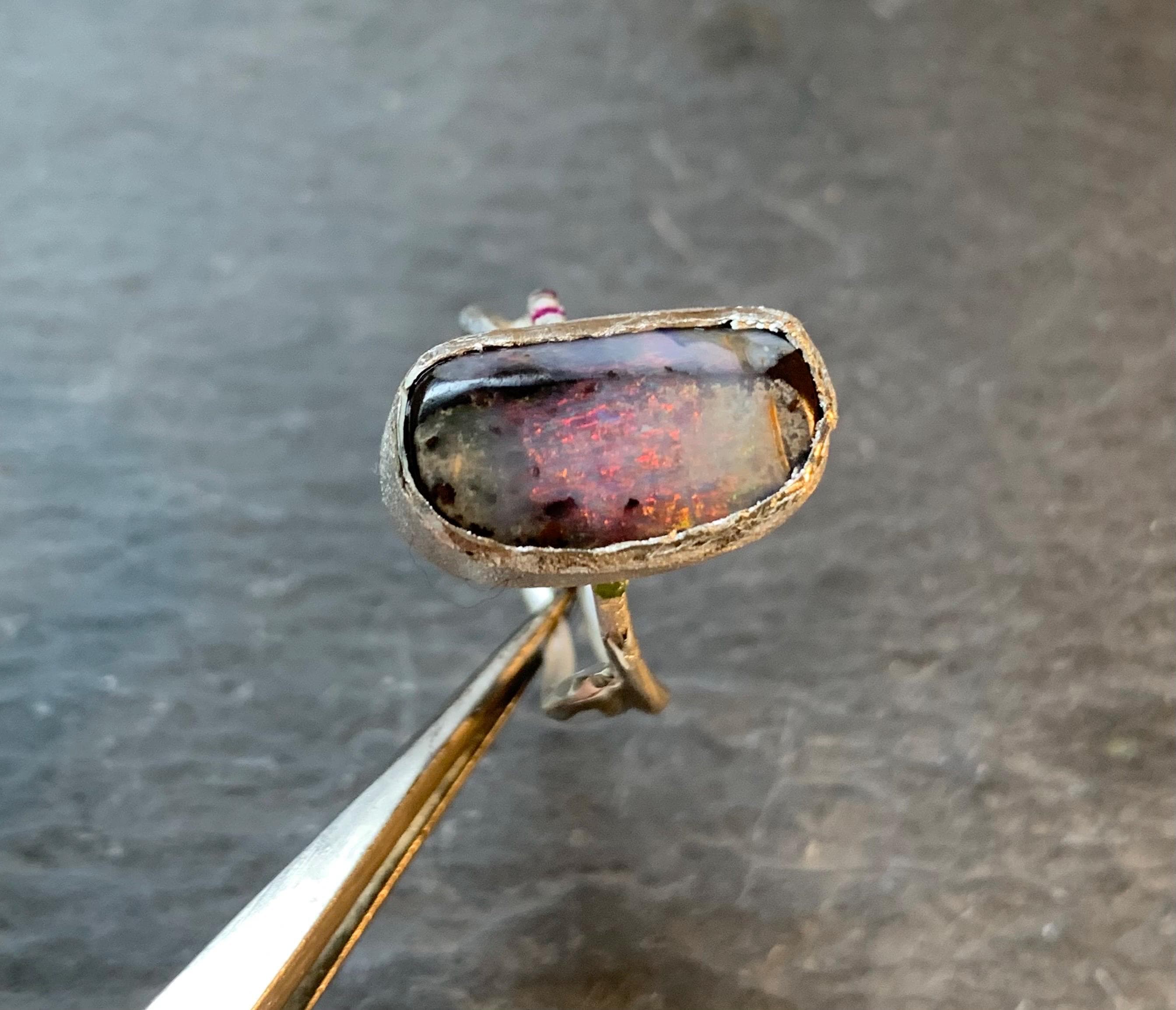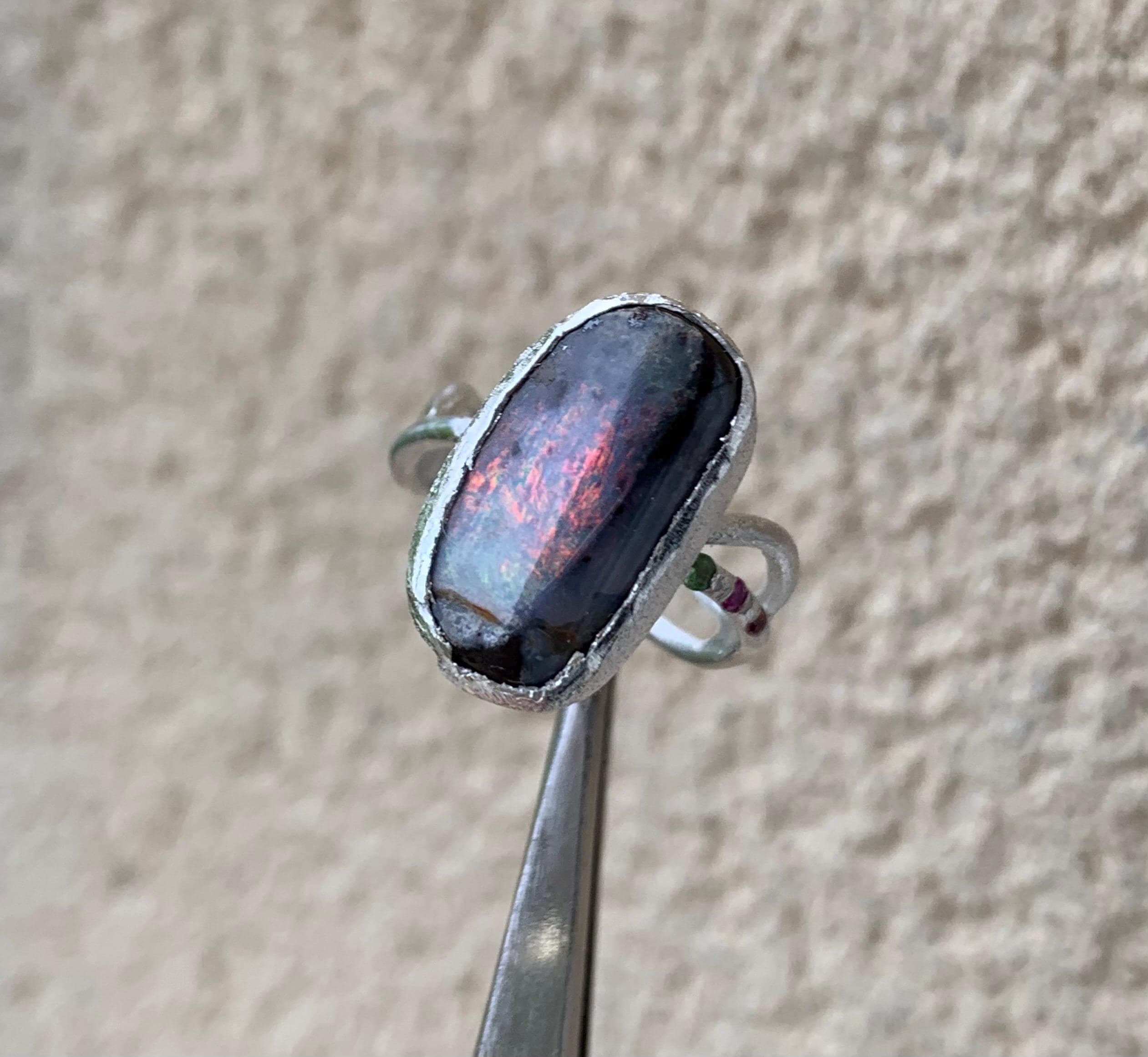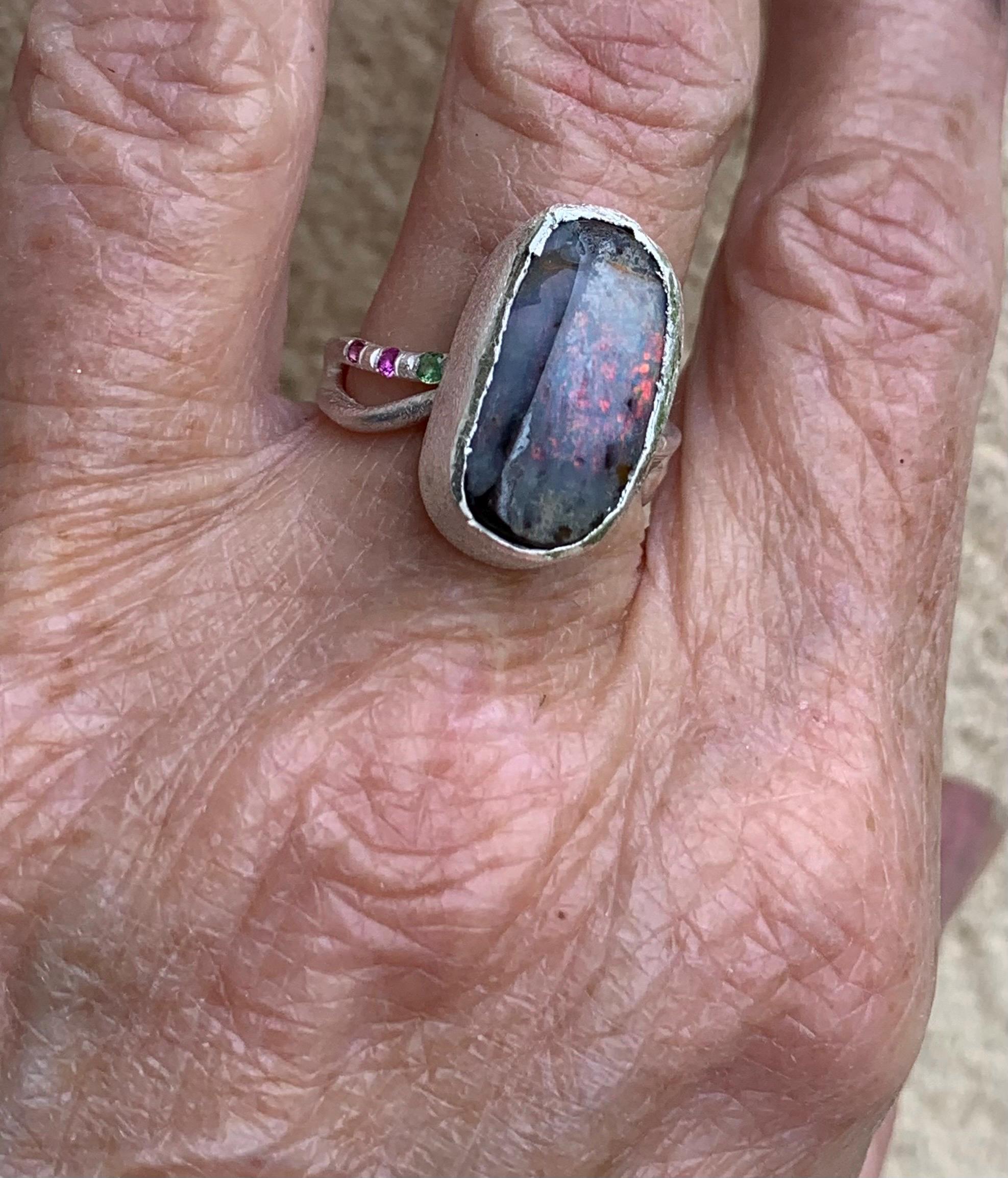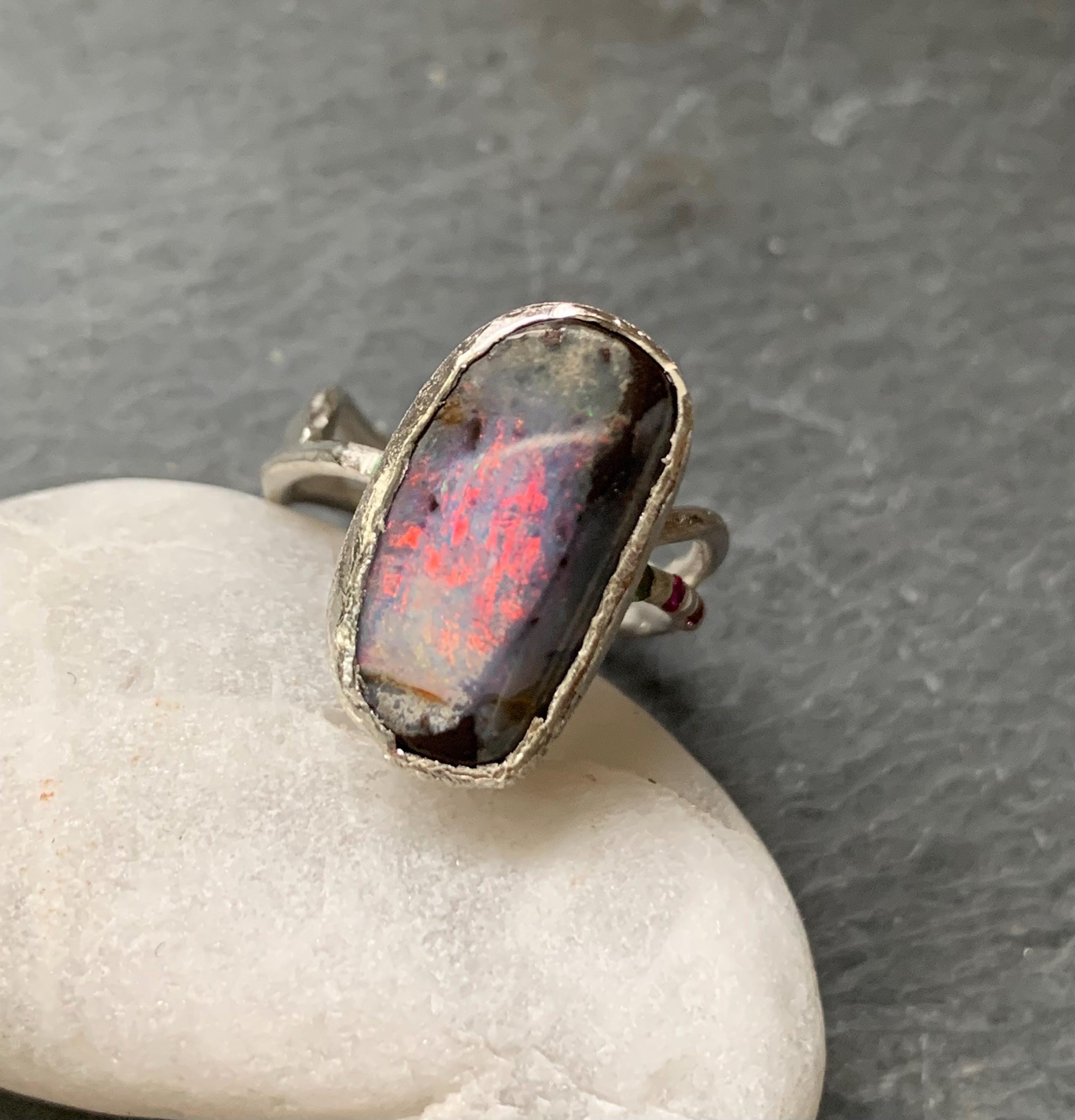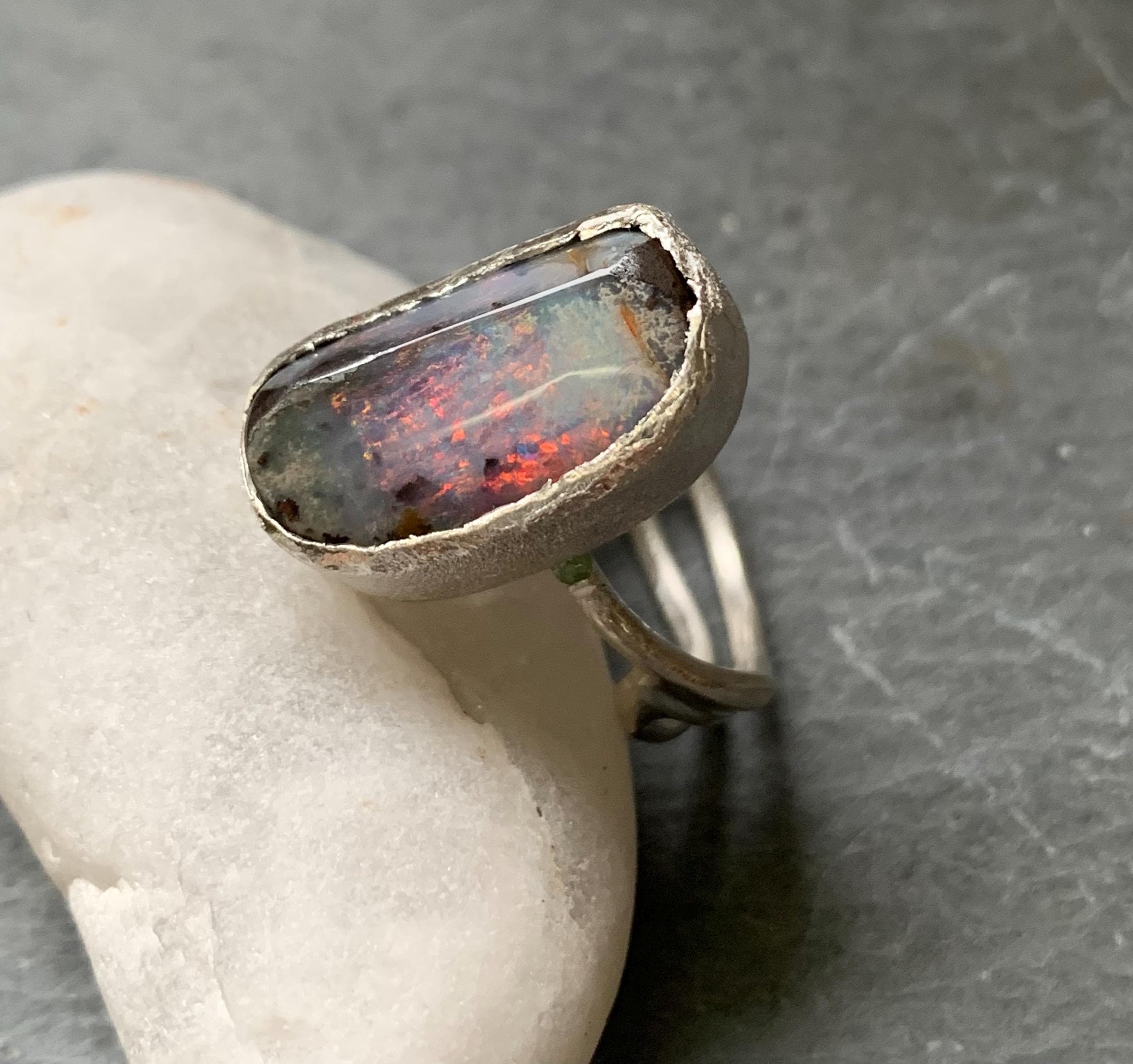 The ring is done in silver with 1 australian boulder opal and 4 little gem stones, 1 garnet, 1 ruby, 2 tsavorites setted beside the opal.
