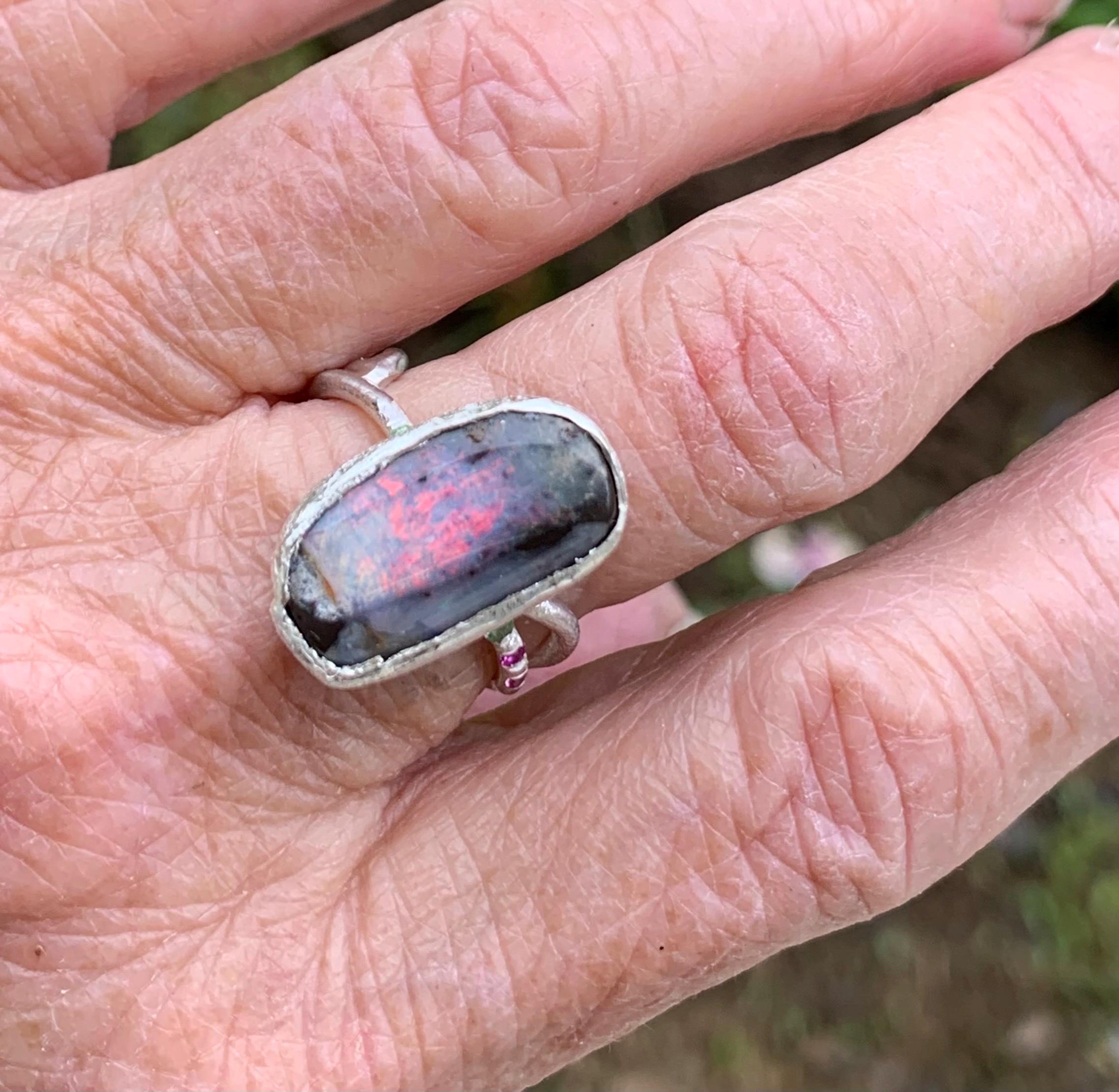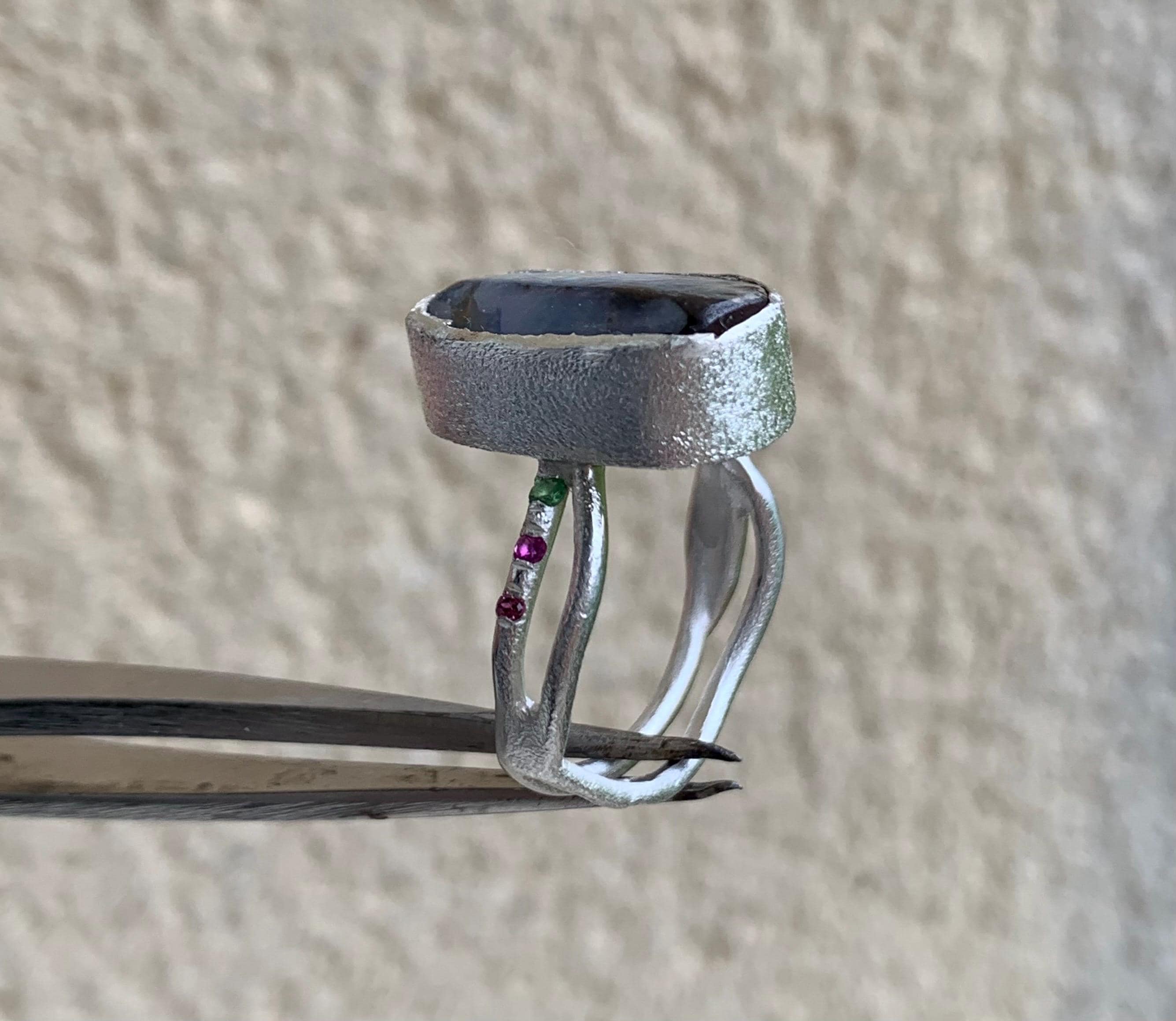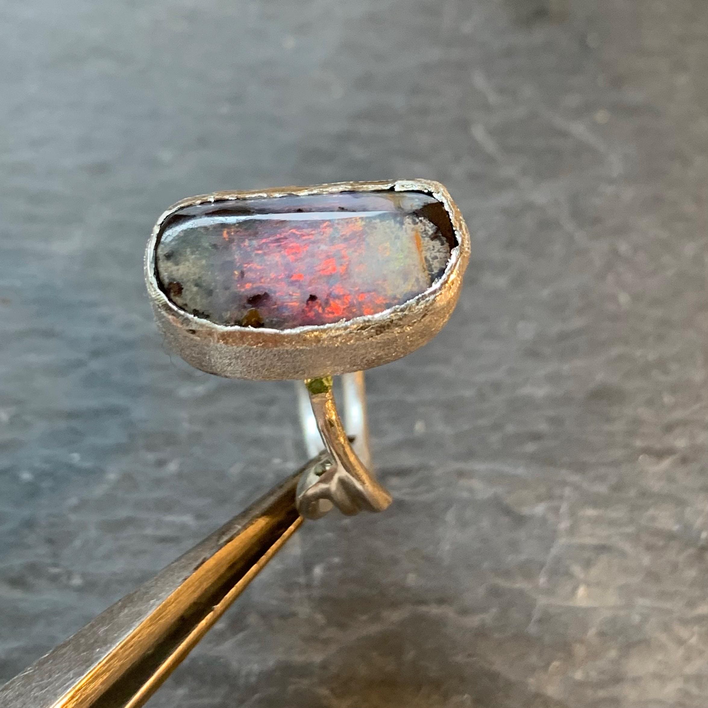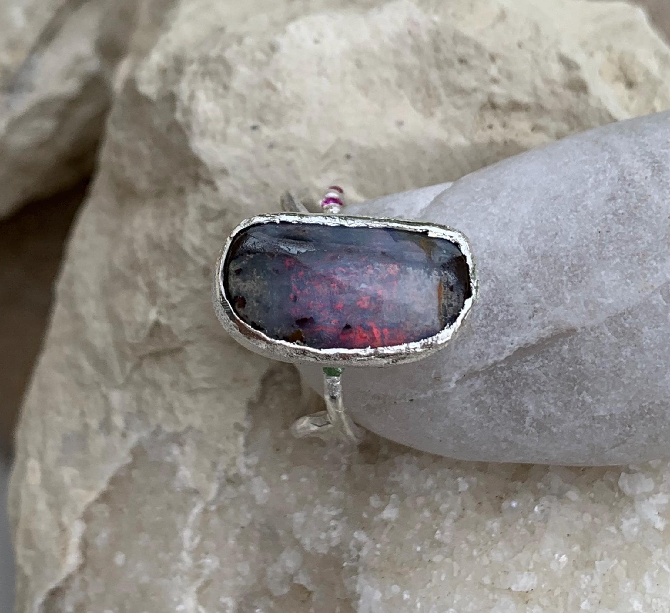 The ring is done in silver with 1 australian boulder opal and 4 little gem stones, 1 garnet, 1 ruby, 2 tsavorites setted beside the opal.