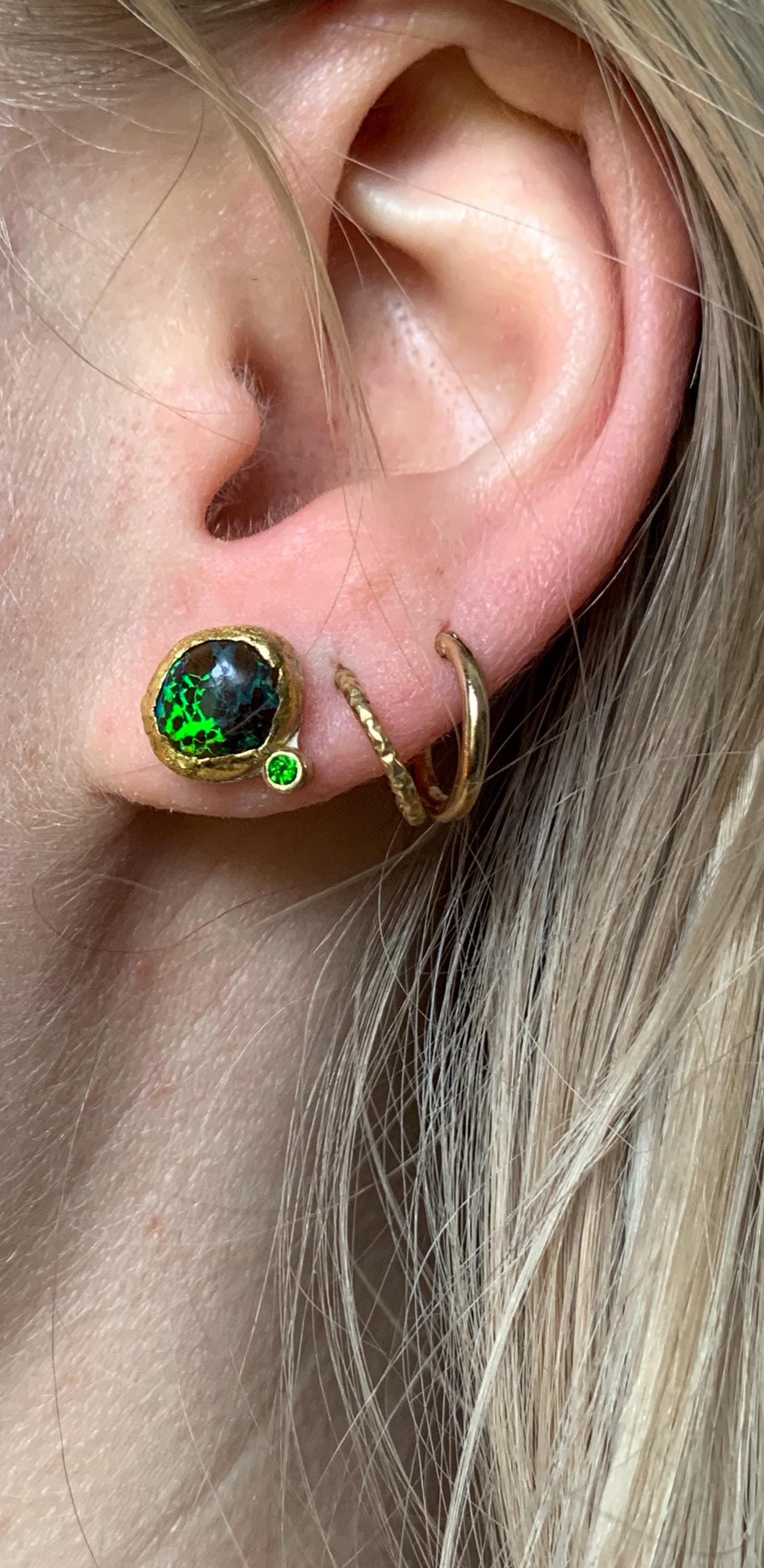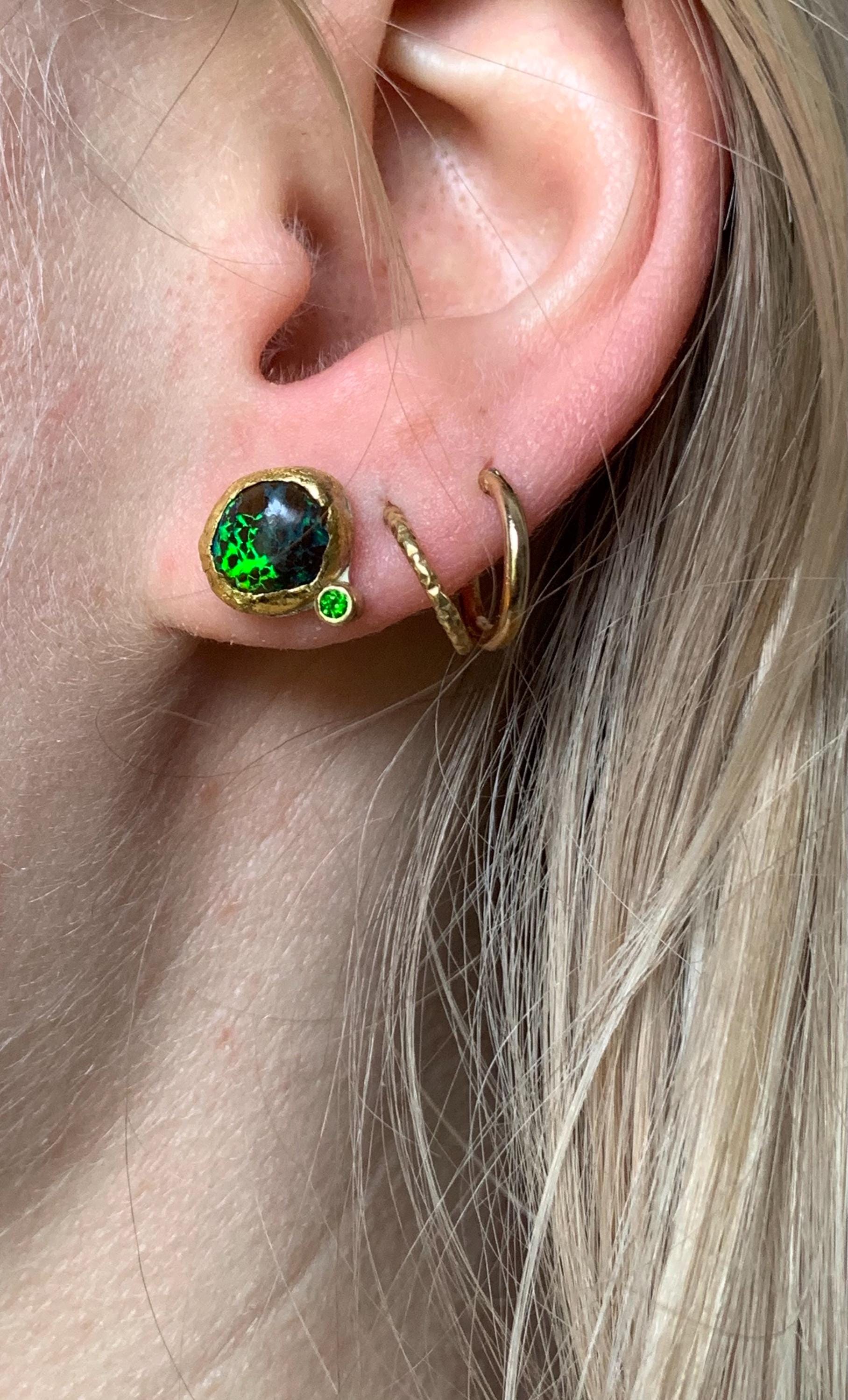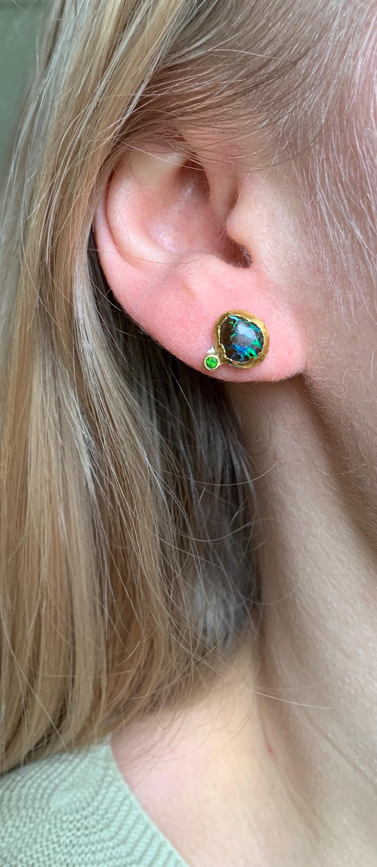 The studs are done in silver with 2 solid australian boulder opals ( 4,85 ct the both; 0,92 cm x 0,81 cm and 0,92 cm x 0,76 cm ) setted in 24 k fine gold and 2 little tsavorites ( 2 mm ) setted in 18 k gold.