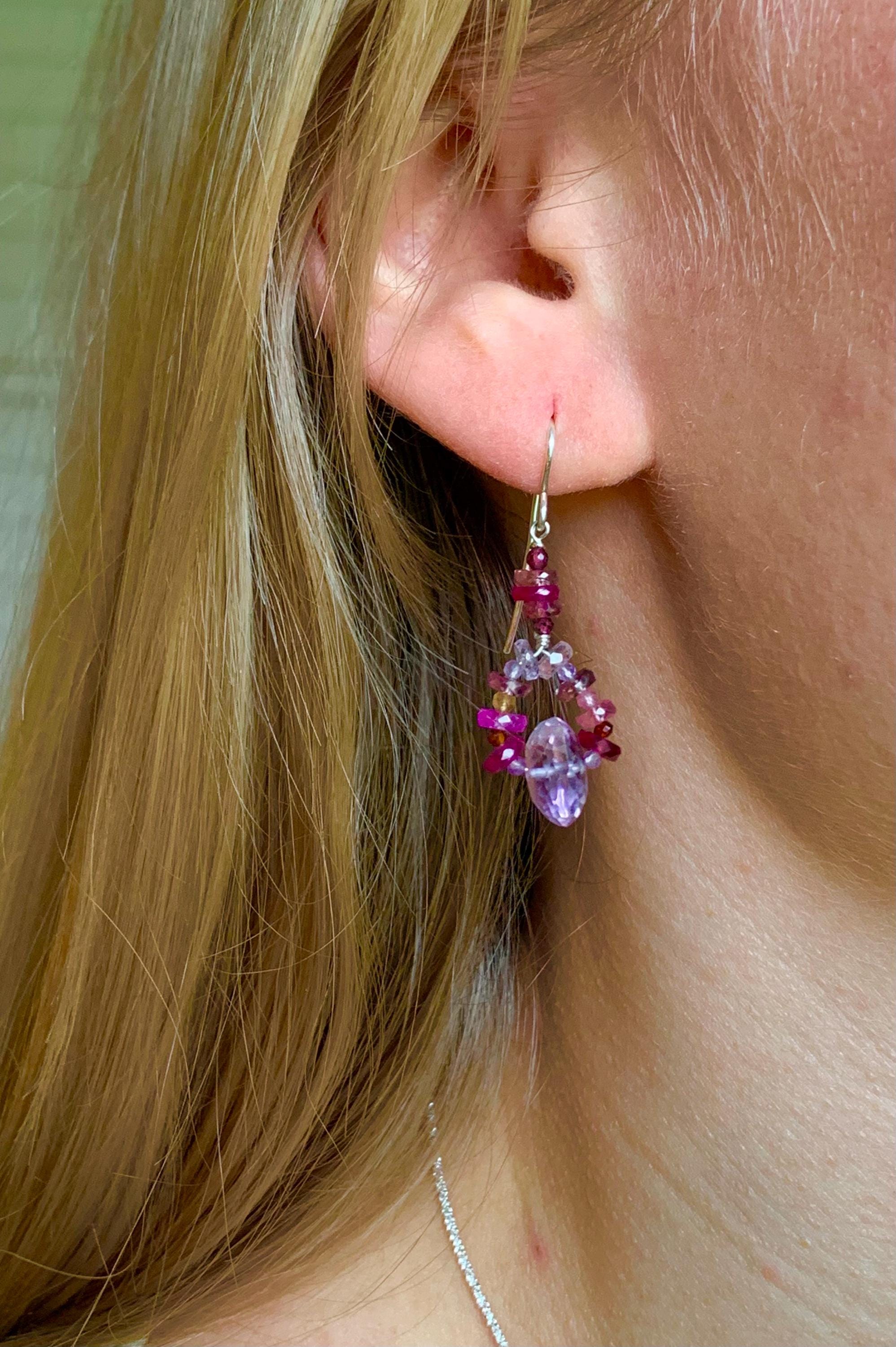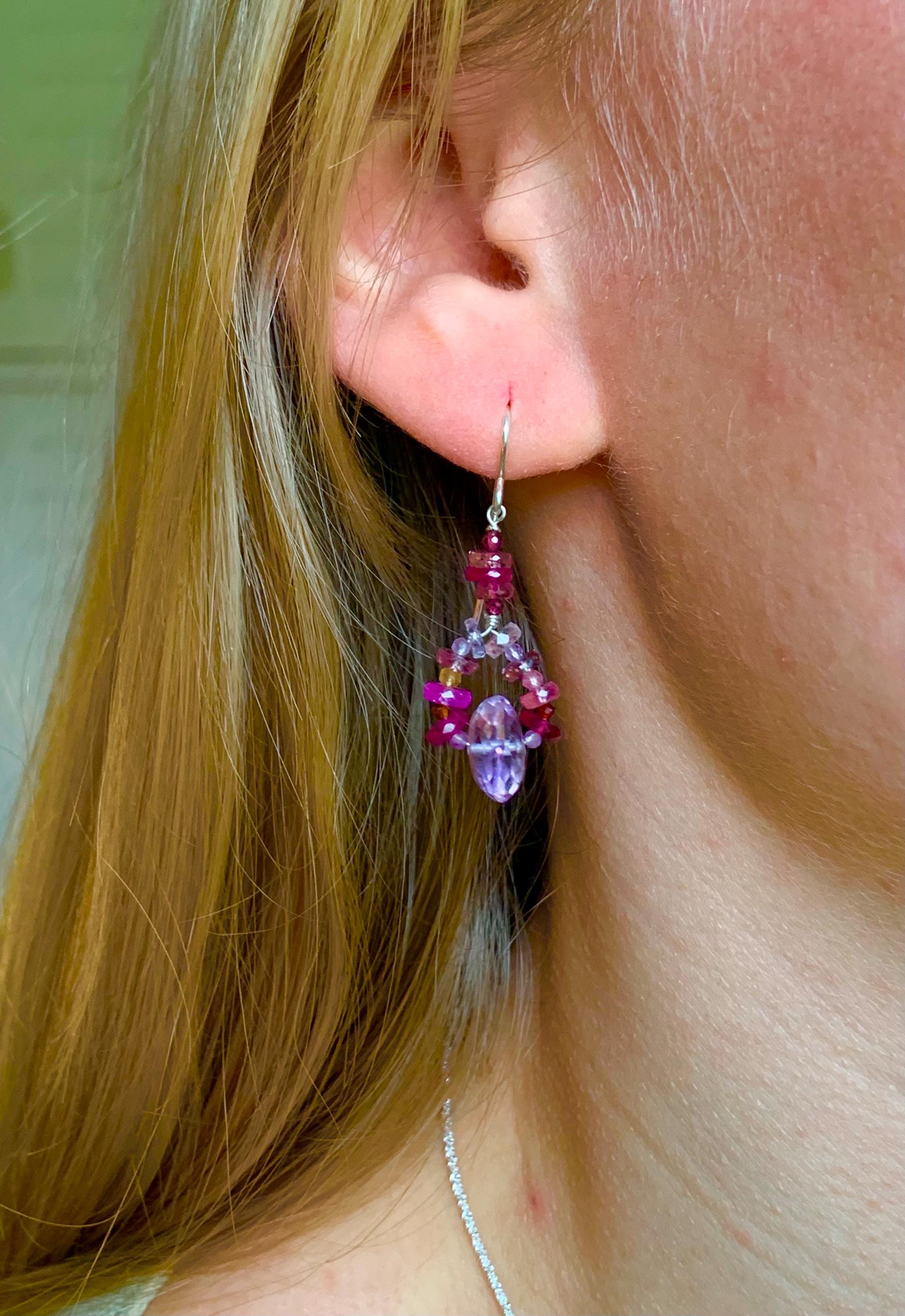 They are done with gemstones ( rose, and white sapphire, améthystes and little garnets) hanging on silver wire and leverbacks