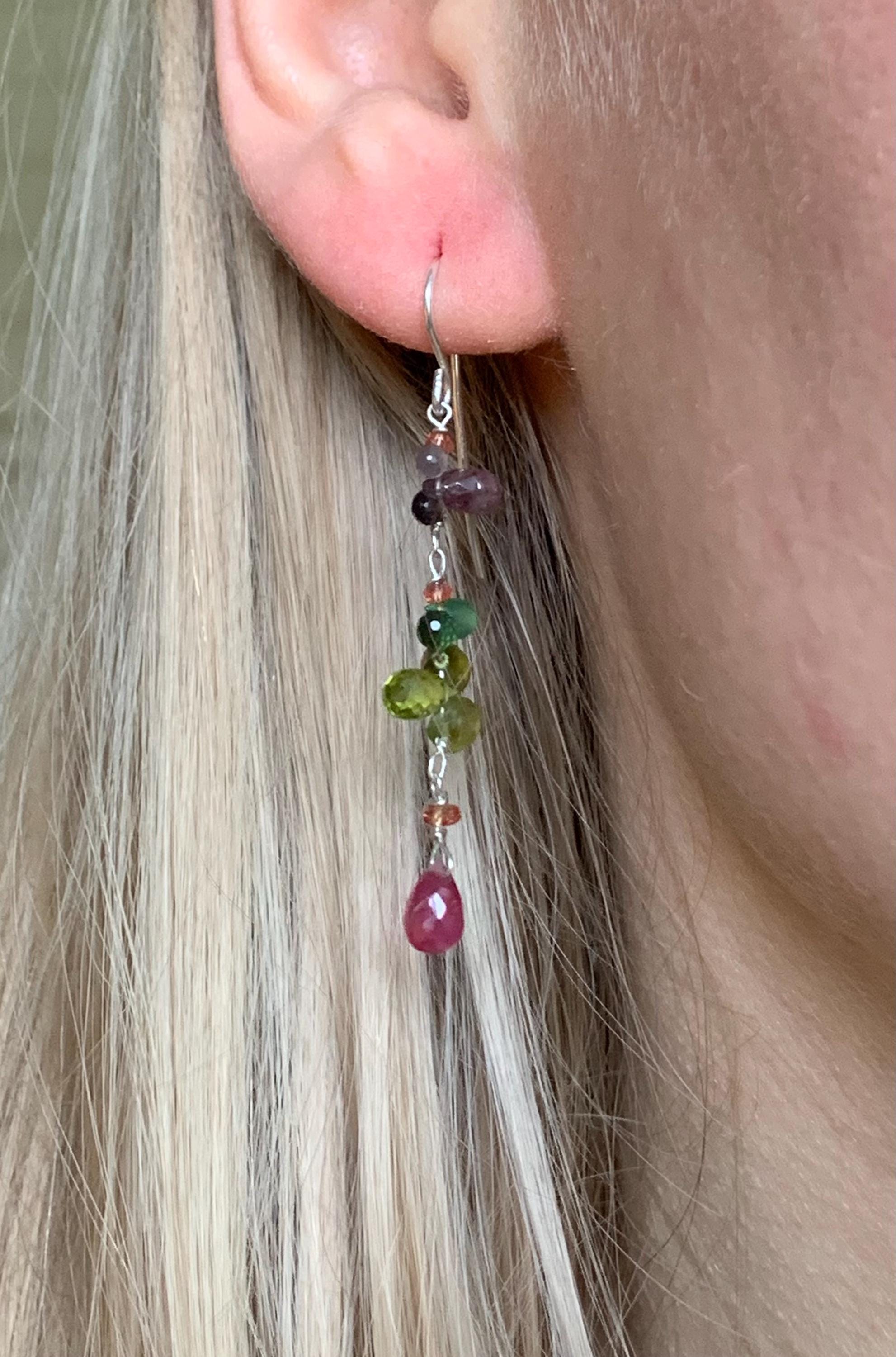 They are done with gemstones ( rose, yellow and lavender sapphire, péridot, aventurine, tourmaline ) hanging on silver wire and leverbacks