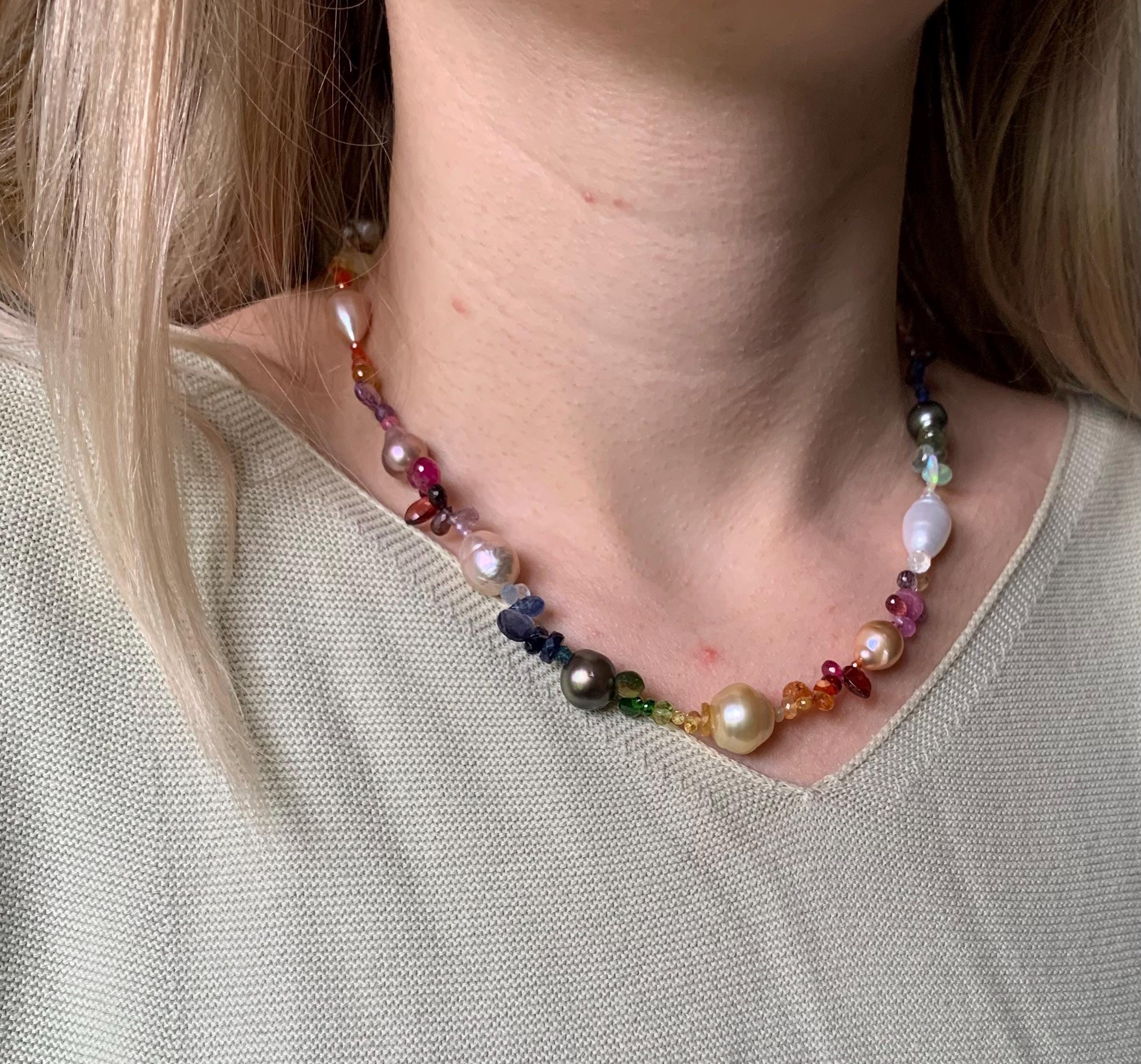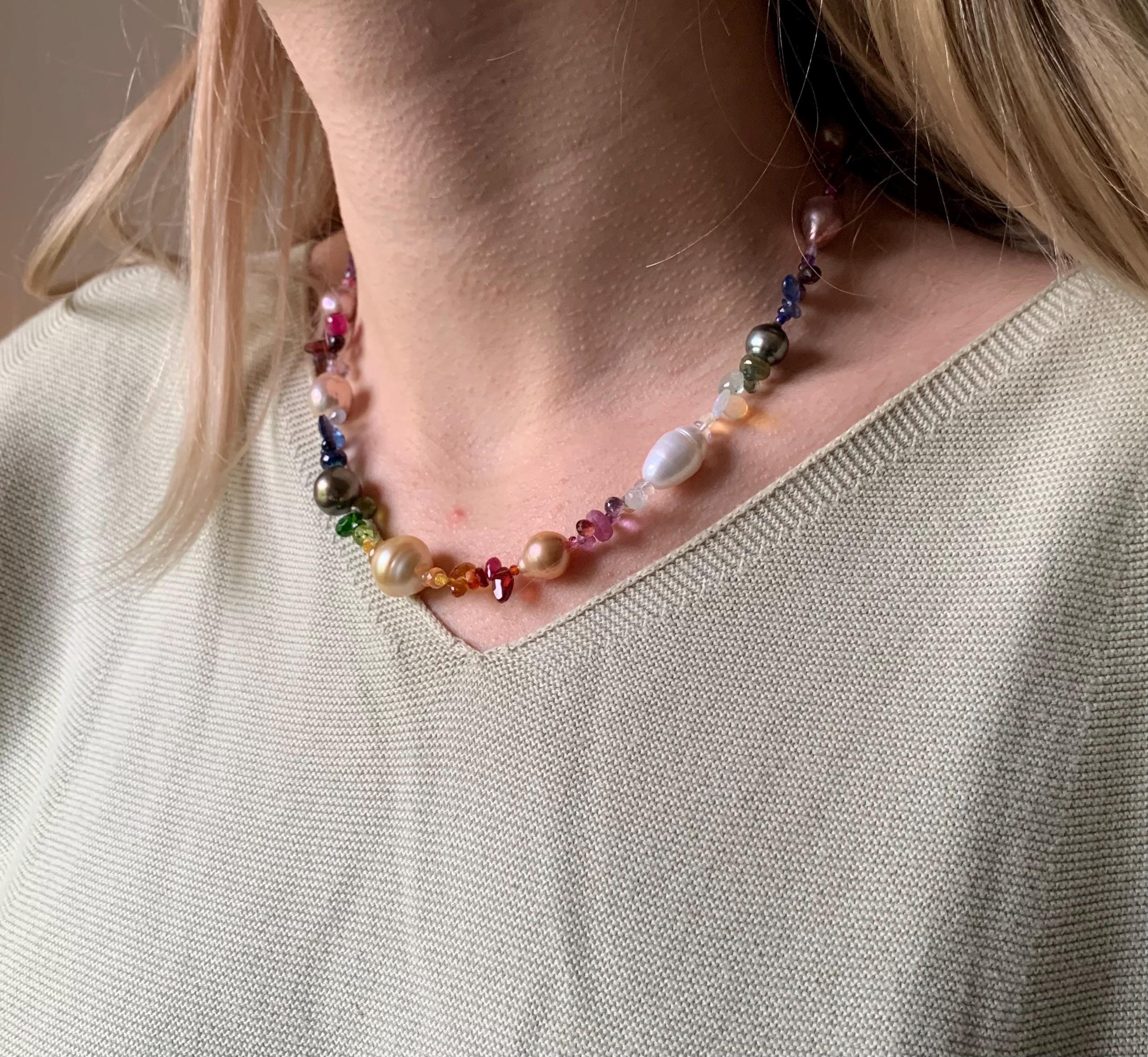 It is done with 1 strand of very colourful fresh-water barock pearls, Tahitian pearls, 1 golden Southsea pearl and precious stones: Cyanites, prehnits, aquamarines, quartzes, citrines, mexican opals, ethiopian opals, peridots, sapphires, rubys, apatites, tourmalines, tsavorites, carnelians, spessartites and garnets