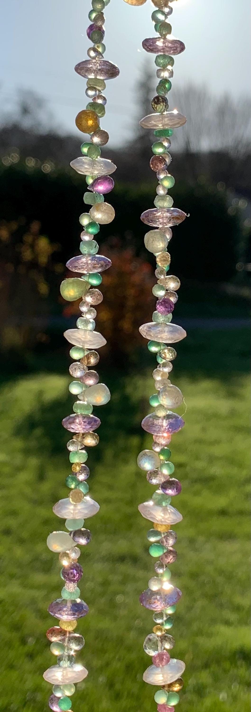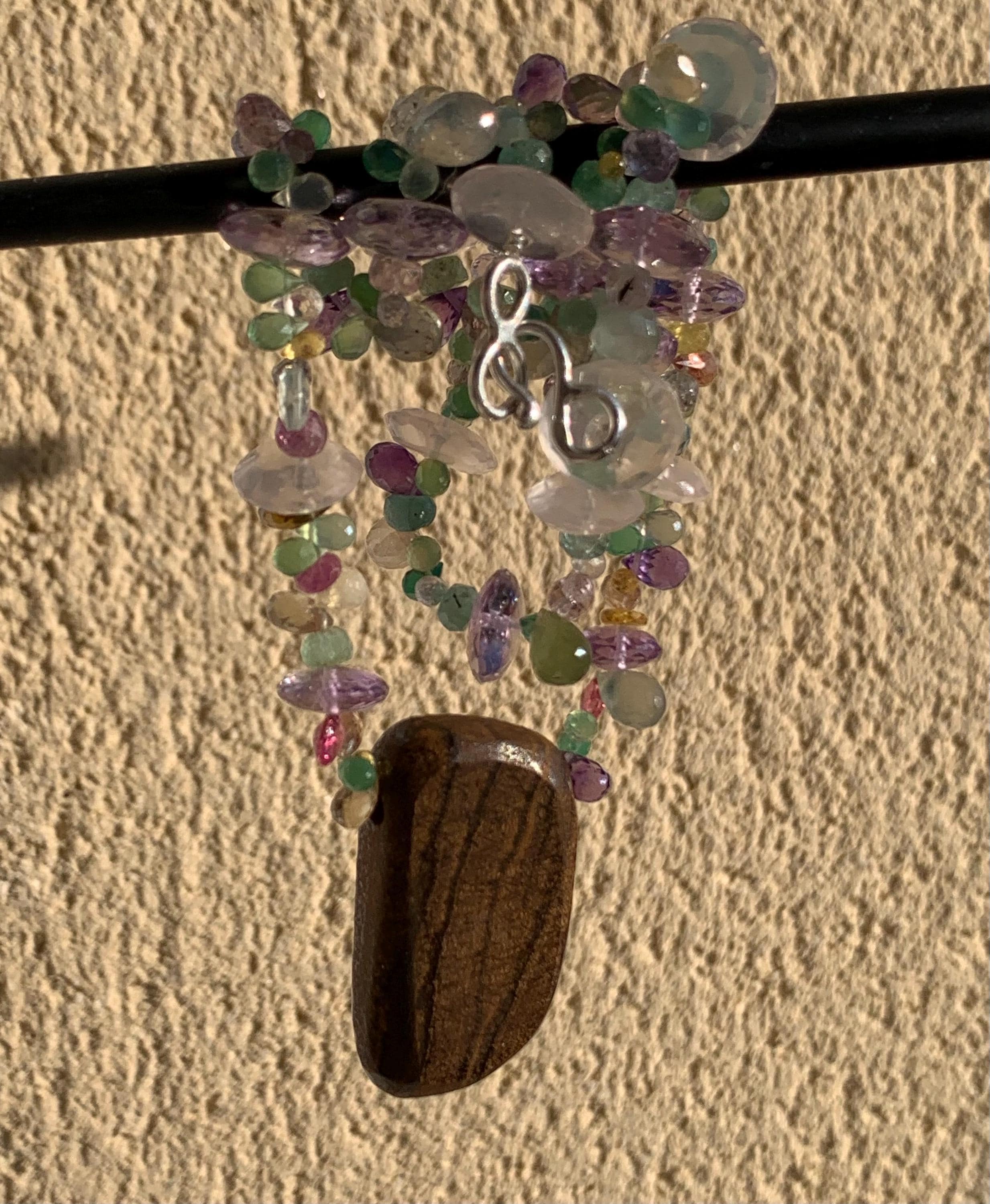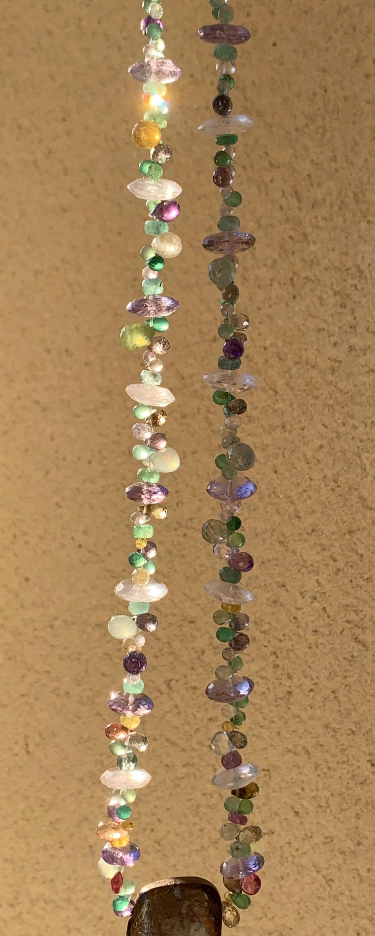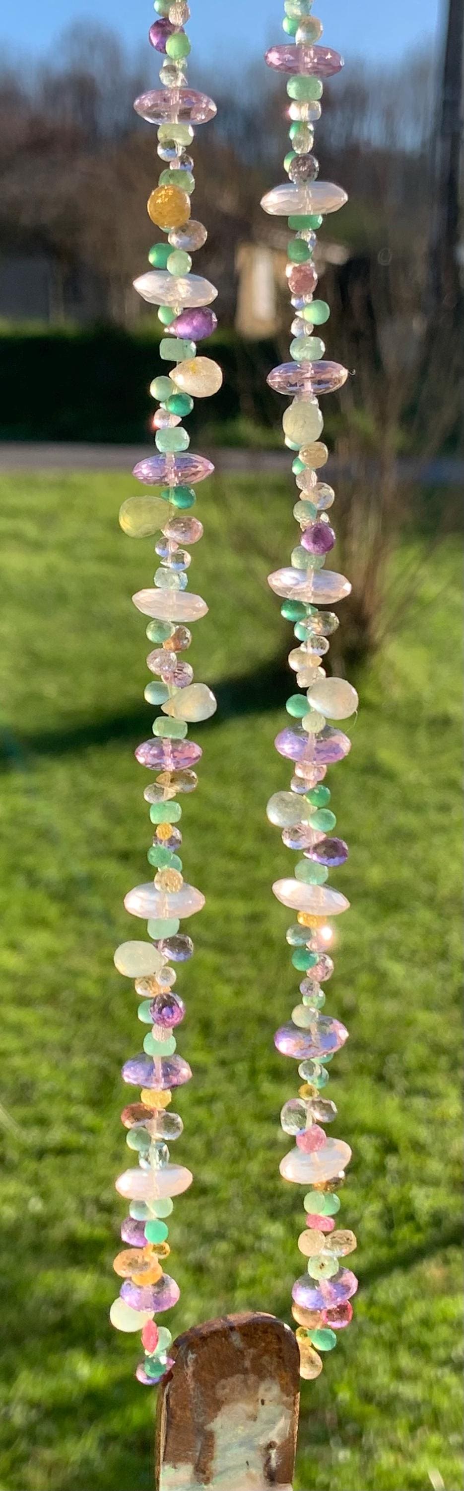 Ce collier est fait d'une chaine avec des améthystes, quartzs rose, aventurines, saphirs de couleur.