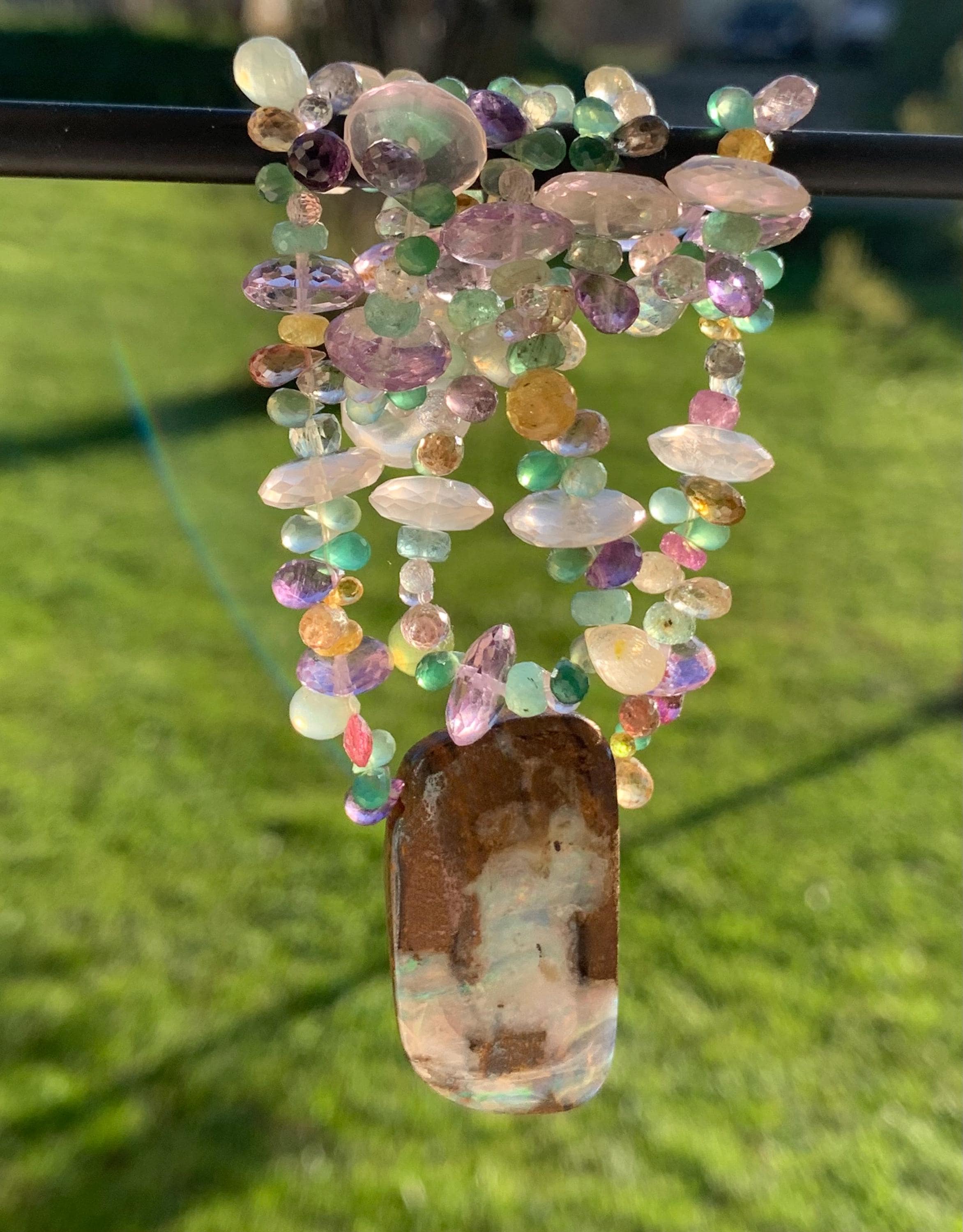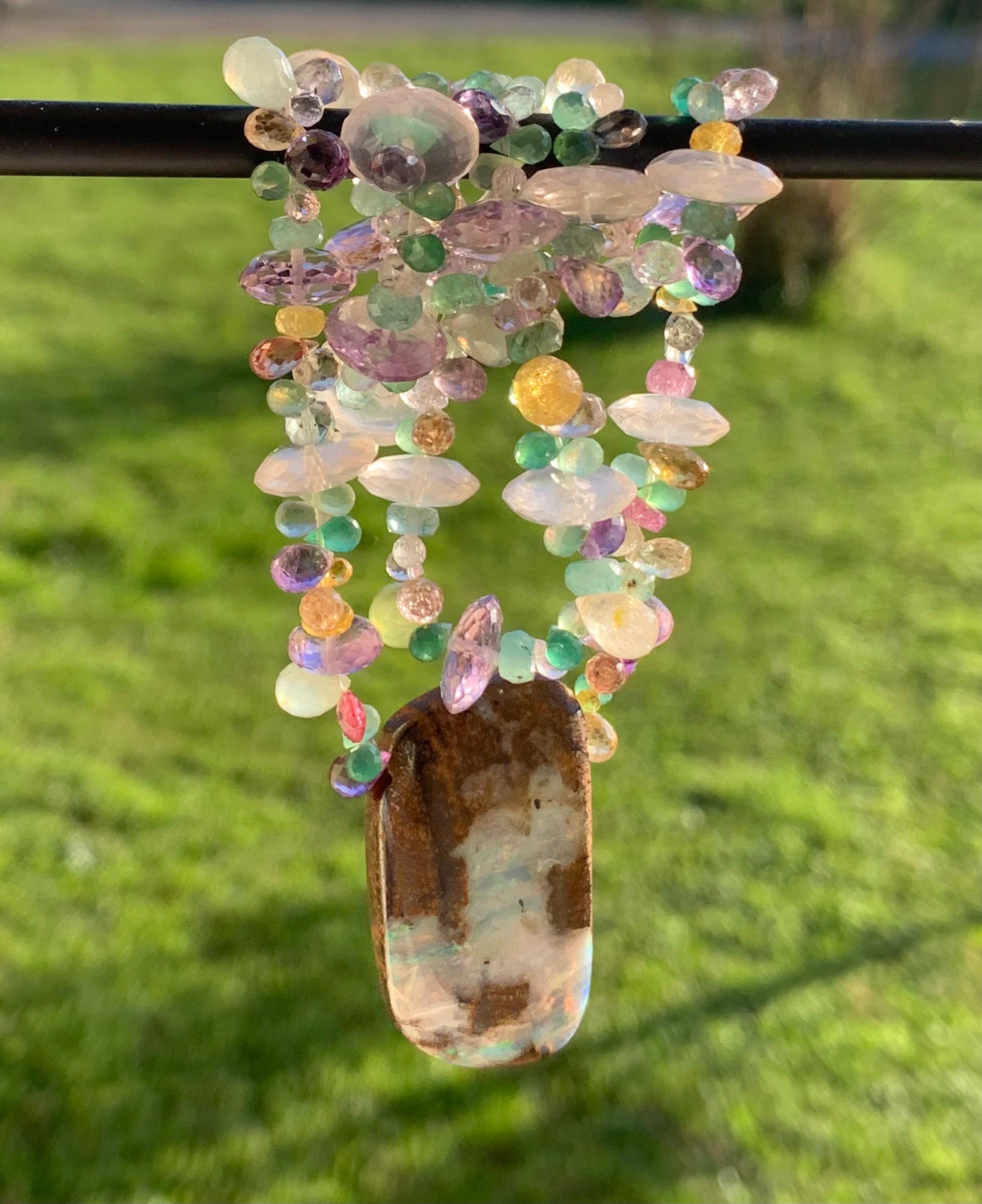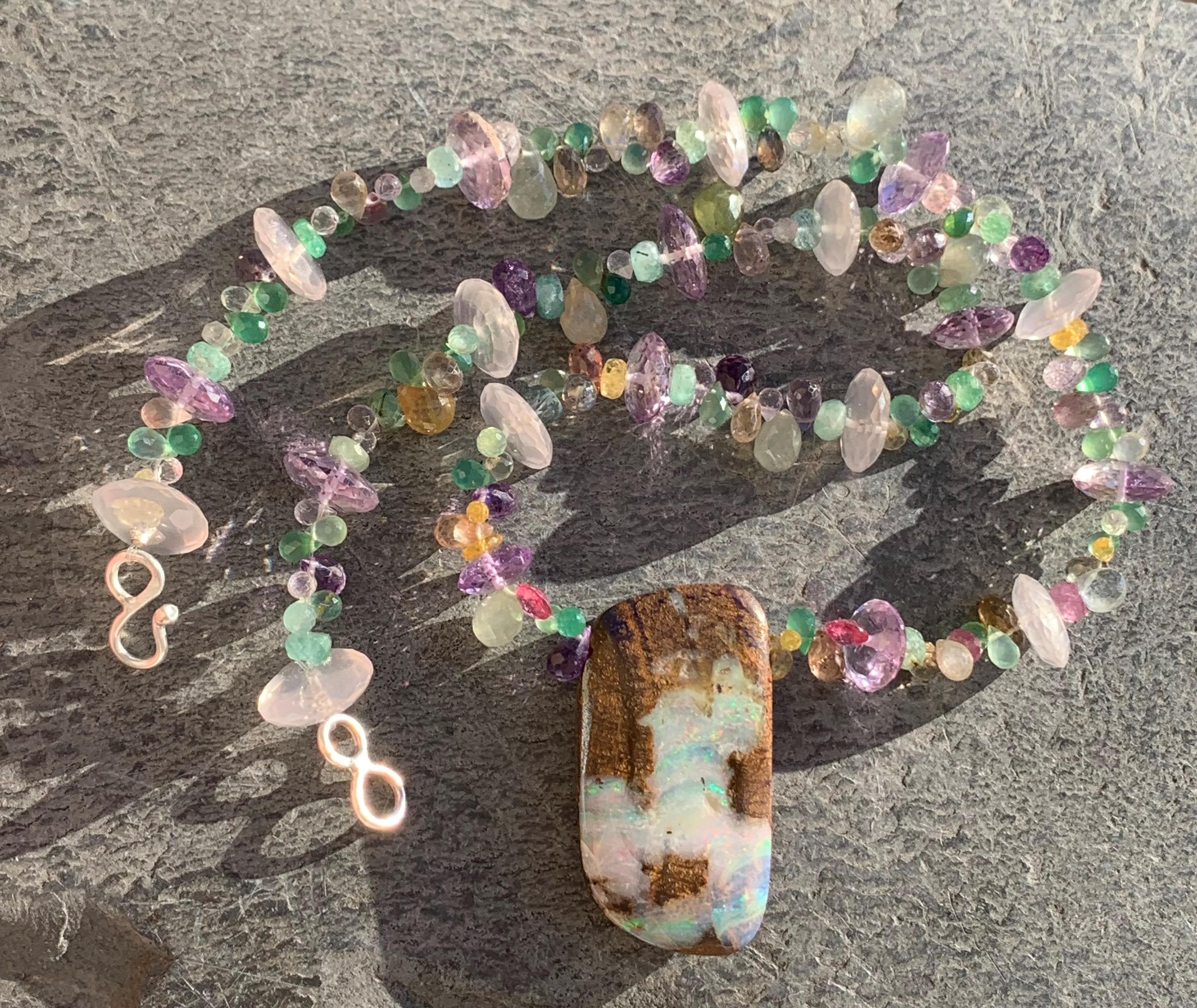 Ce collier est fait d'une chaine avec des améthystes, quartzs rose, aventurines, saphirs de couleur.
