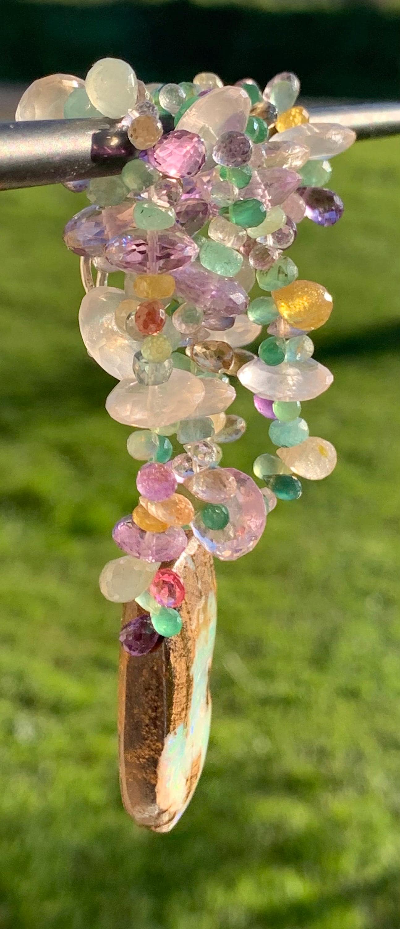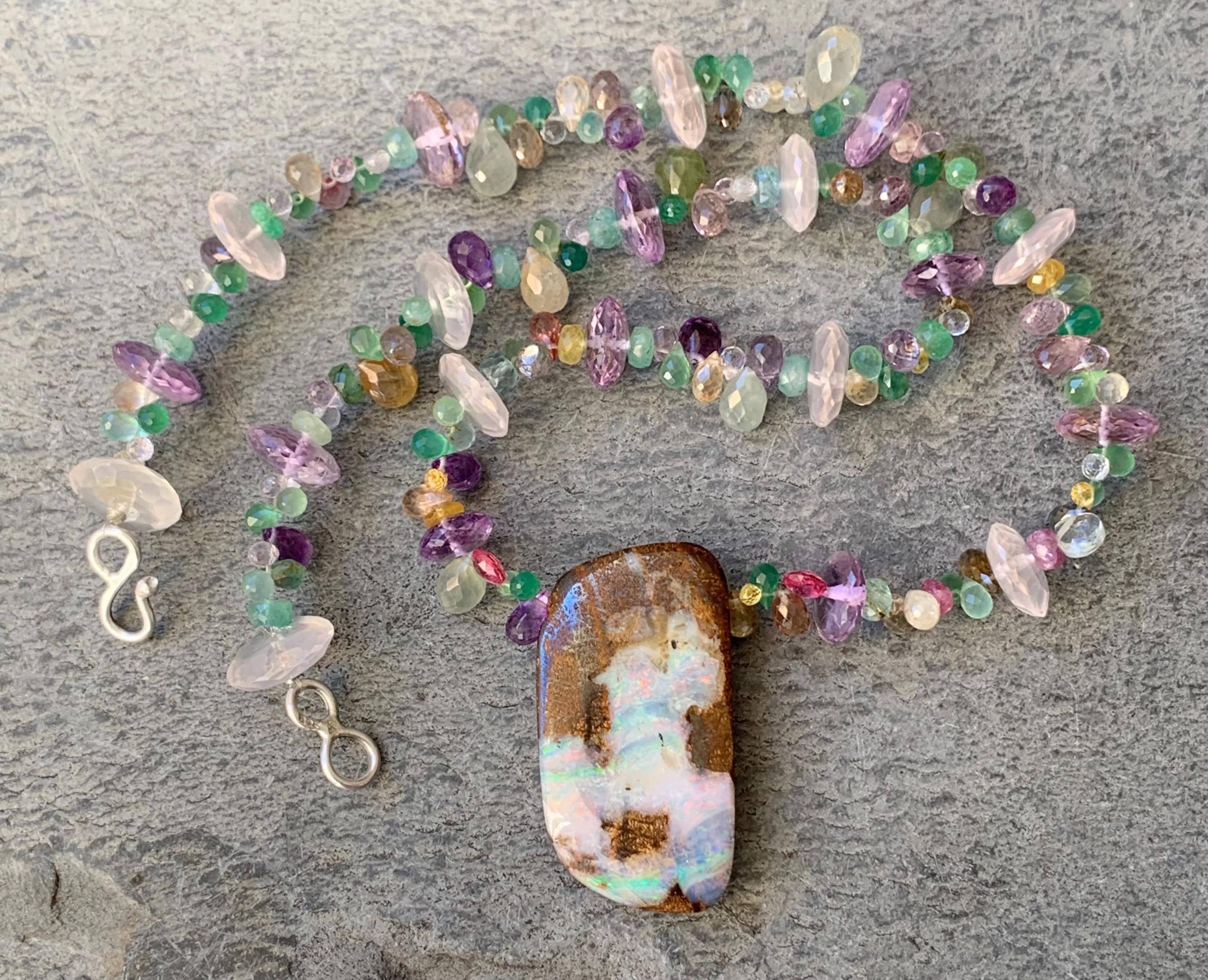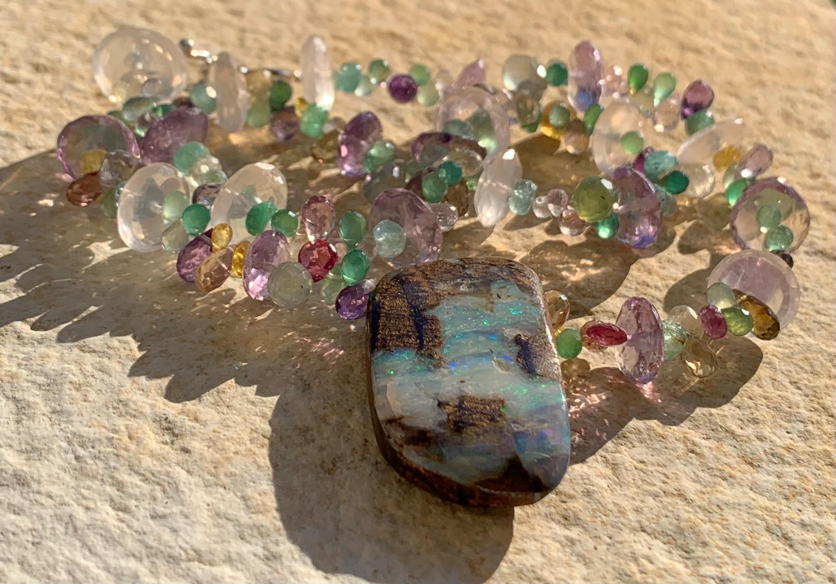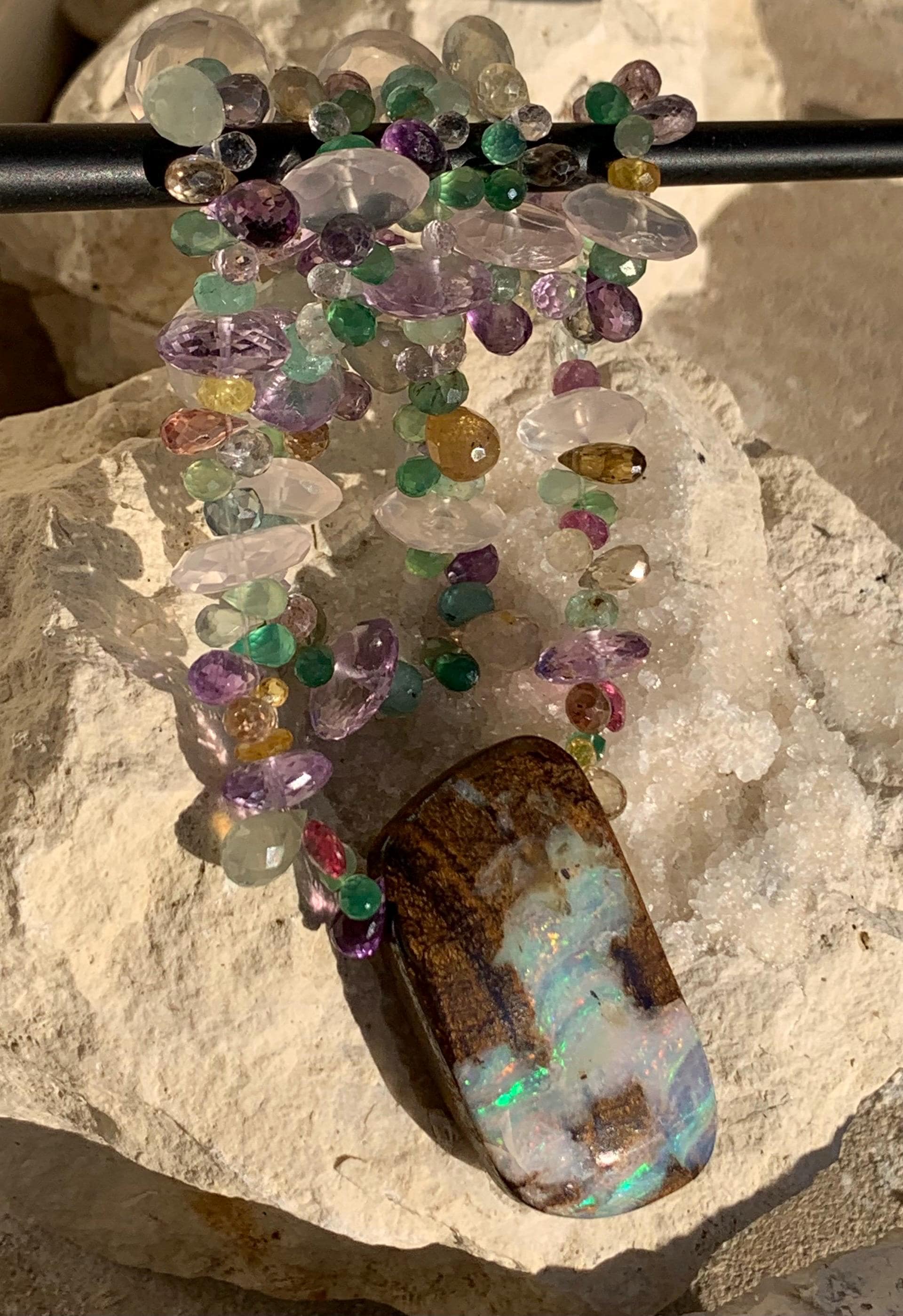 Ce collier est fait d'une chaine avec des améthystes, quartzs rose, aventurines, saphirs de couleur.