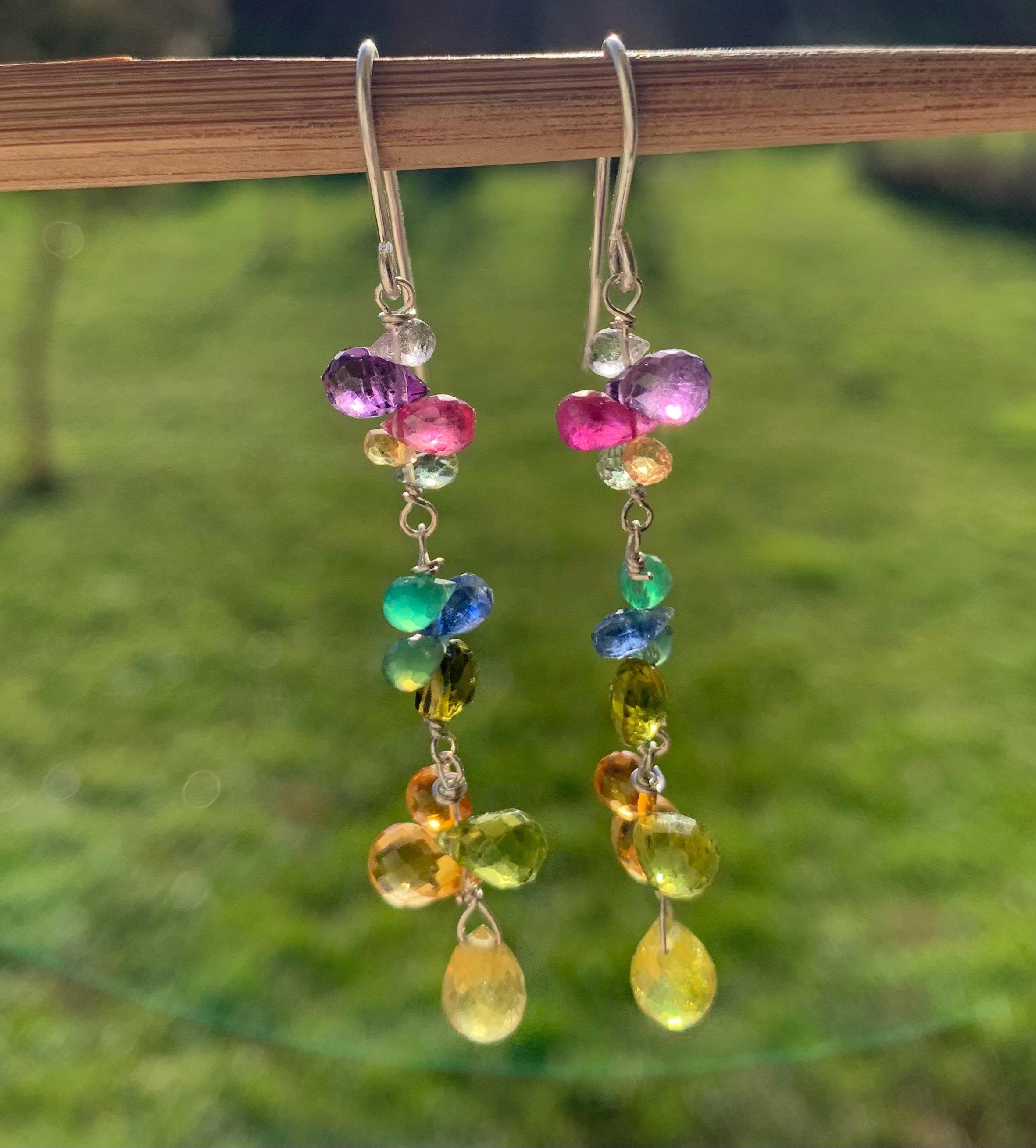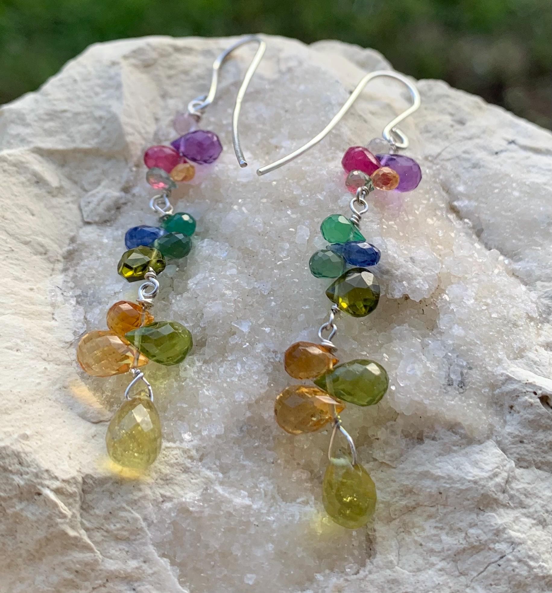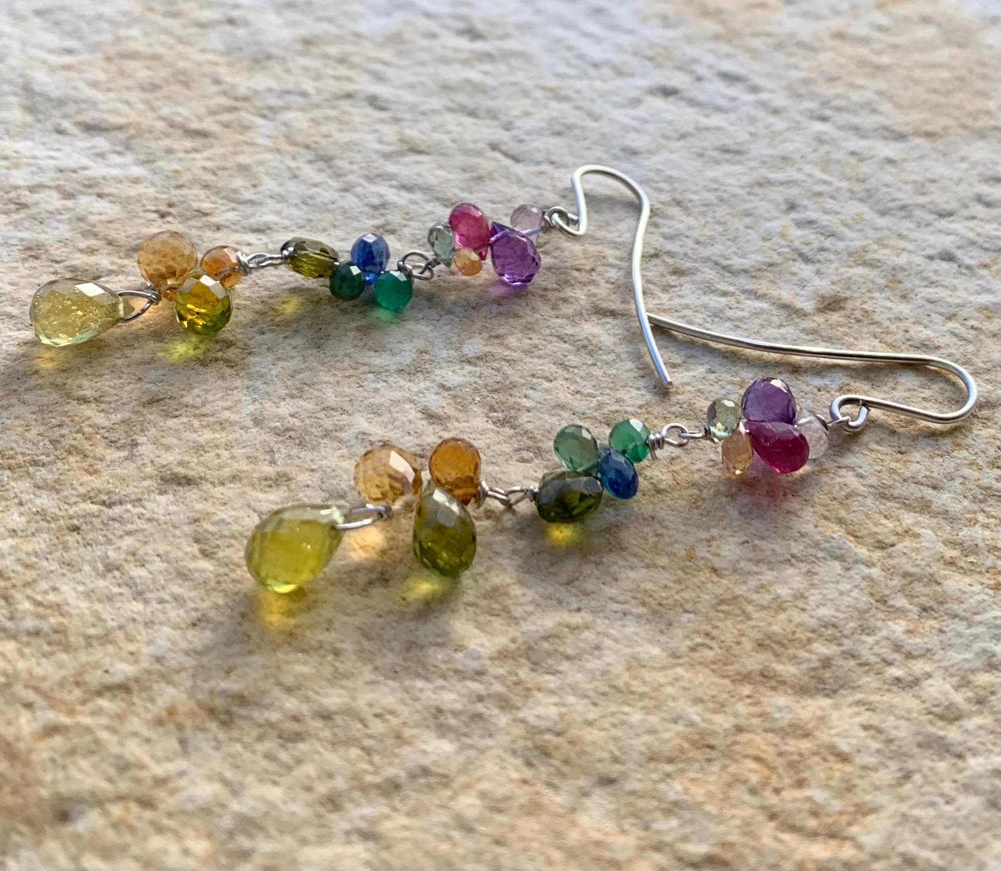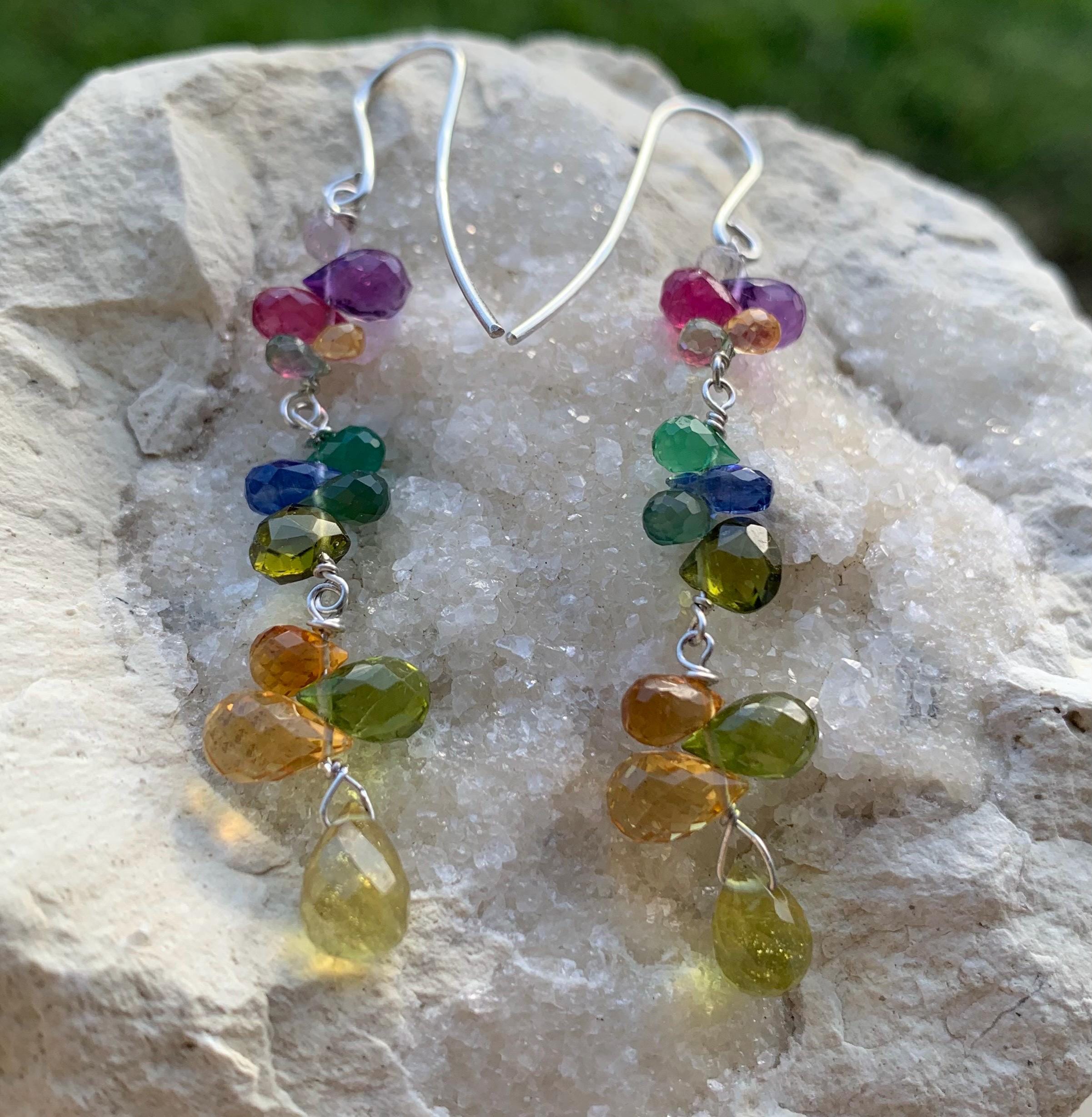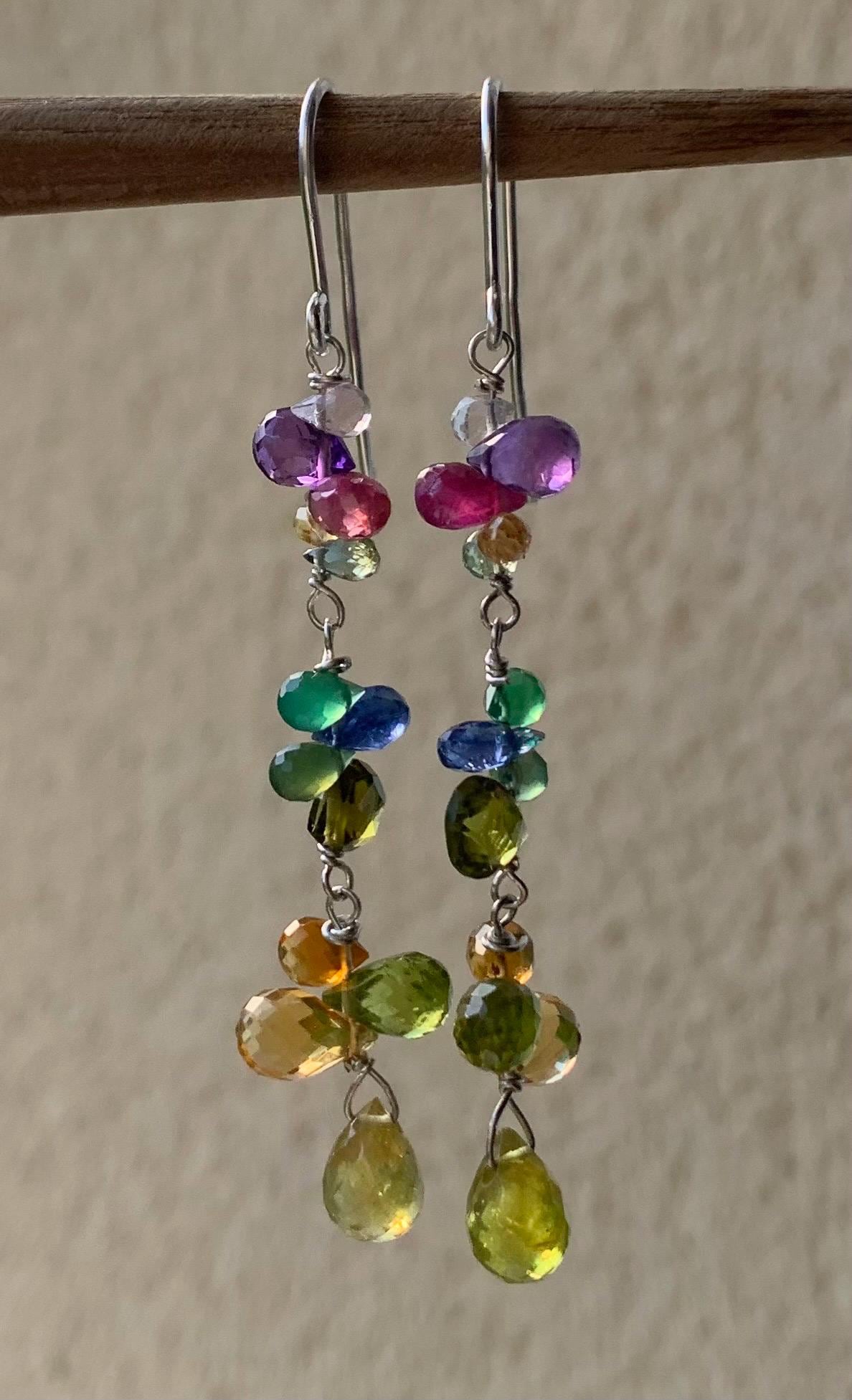 These earrings are done in silver with amethysts, colored sapphires, citrines, rubys, peridots, cyanits, tourmalines and aventurines.