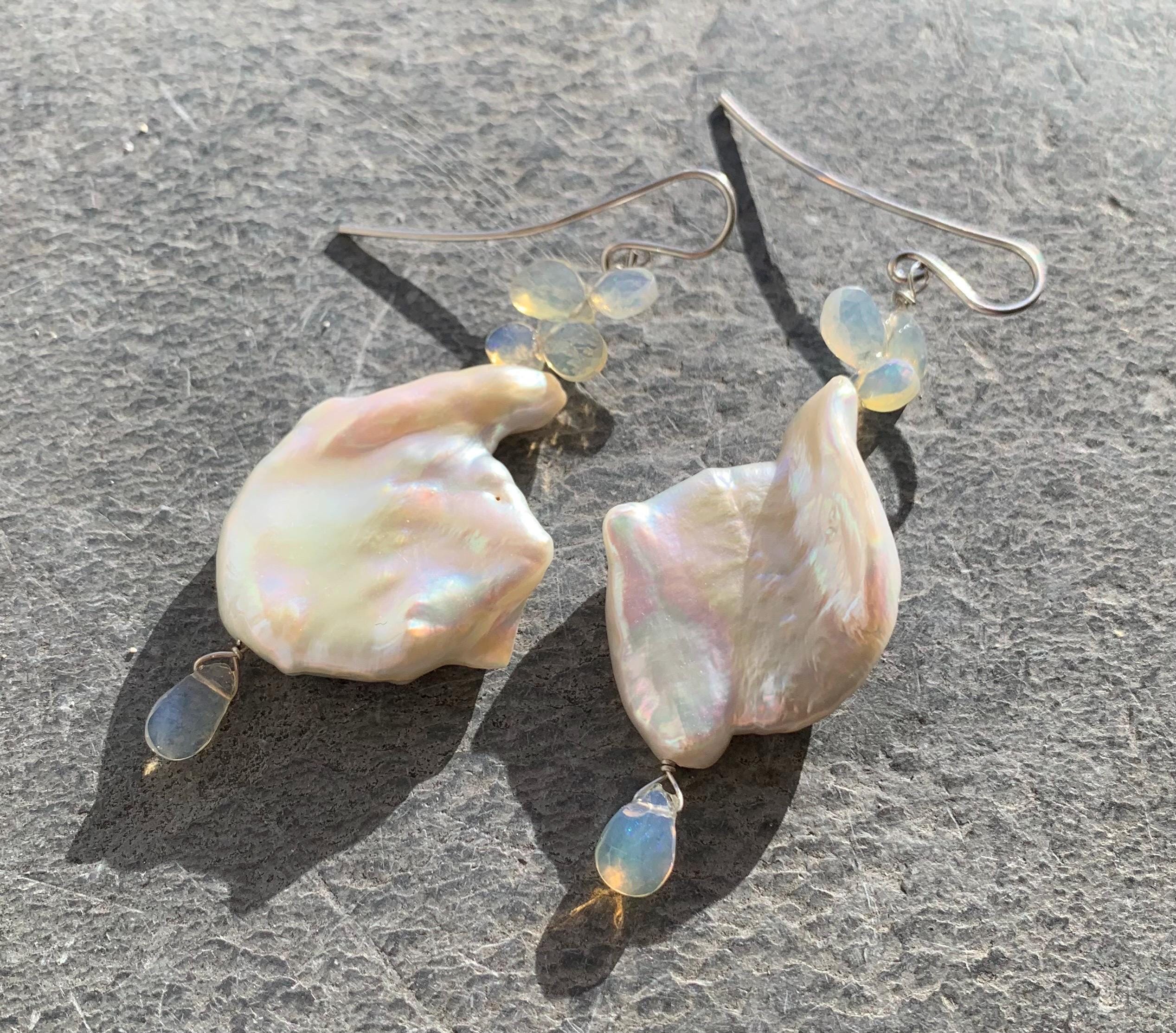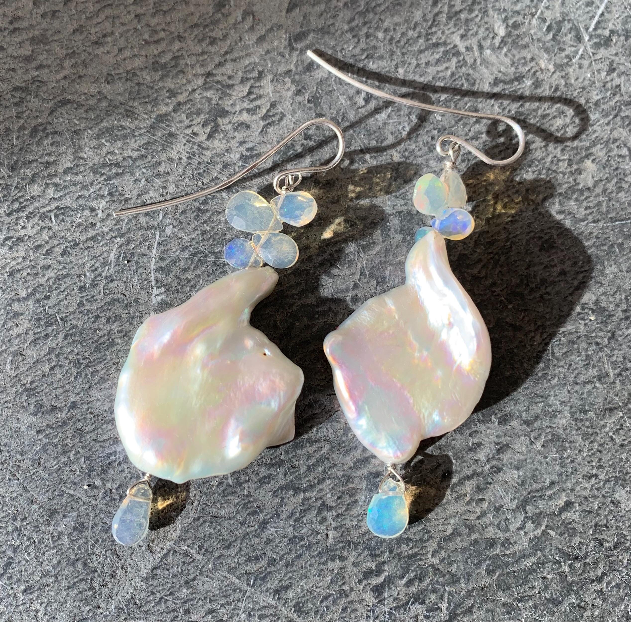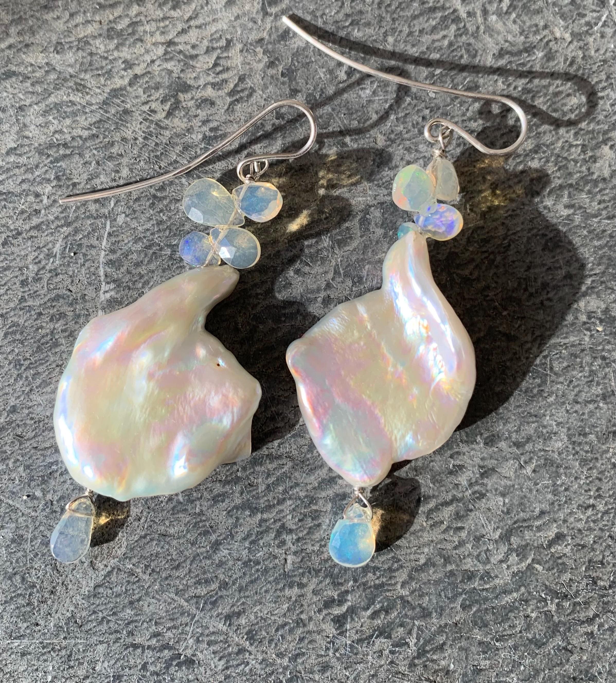They are done in 925 silver with 2 x 5 ethiopian opals and 2 white baroque, keishi, freshwaterpearls.