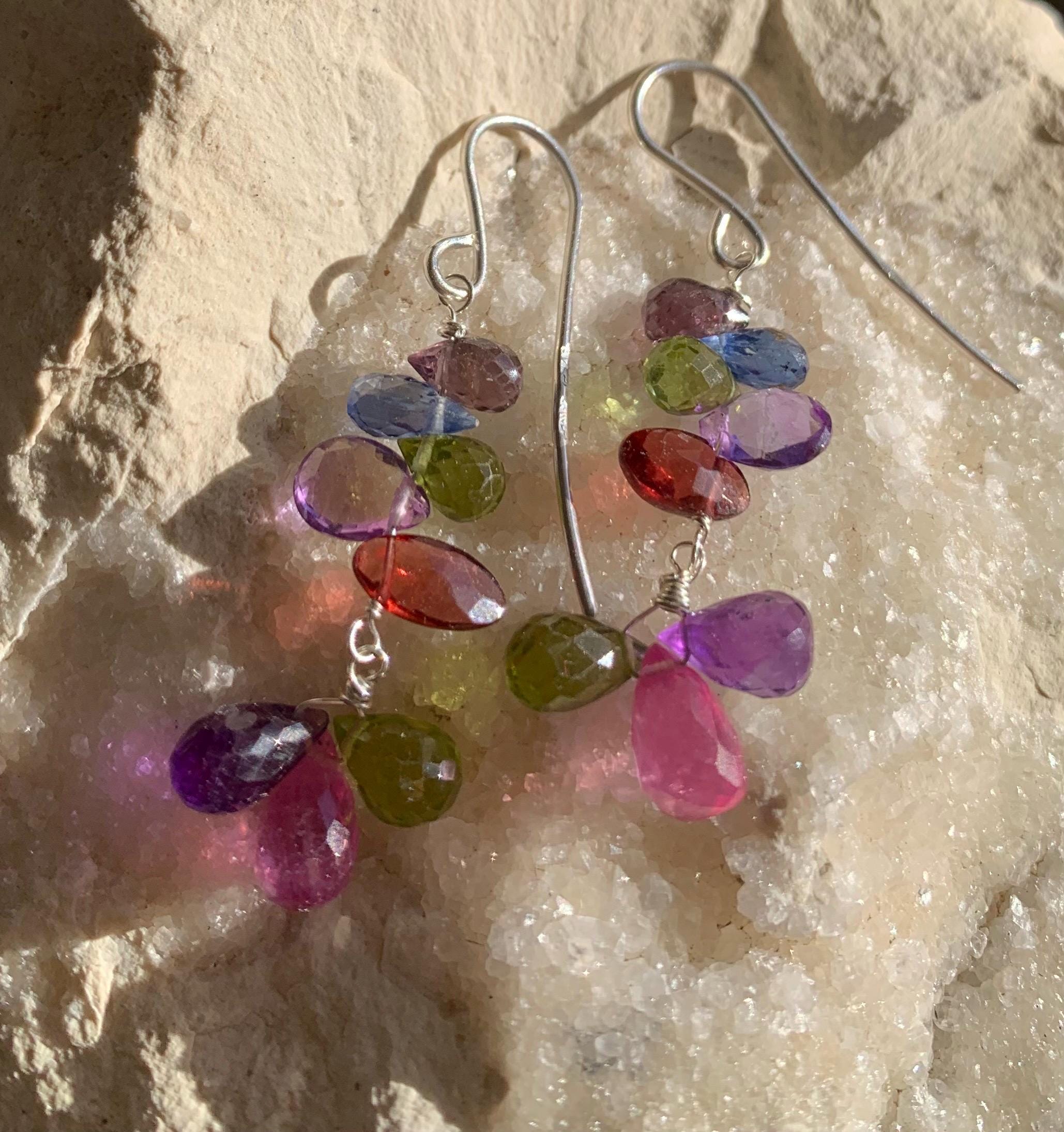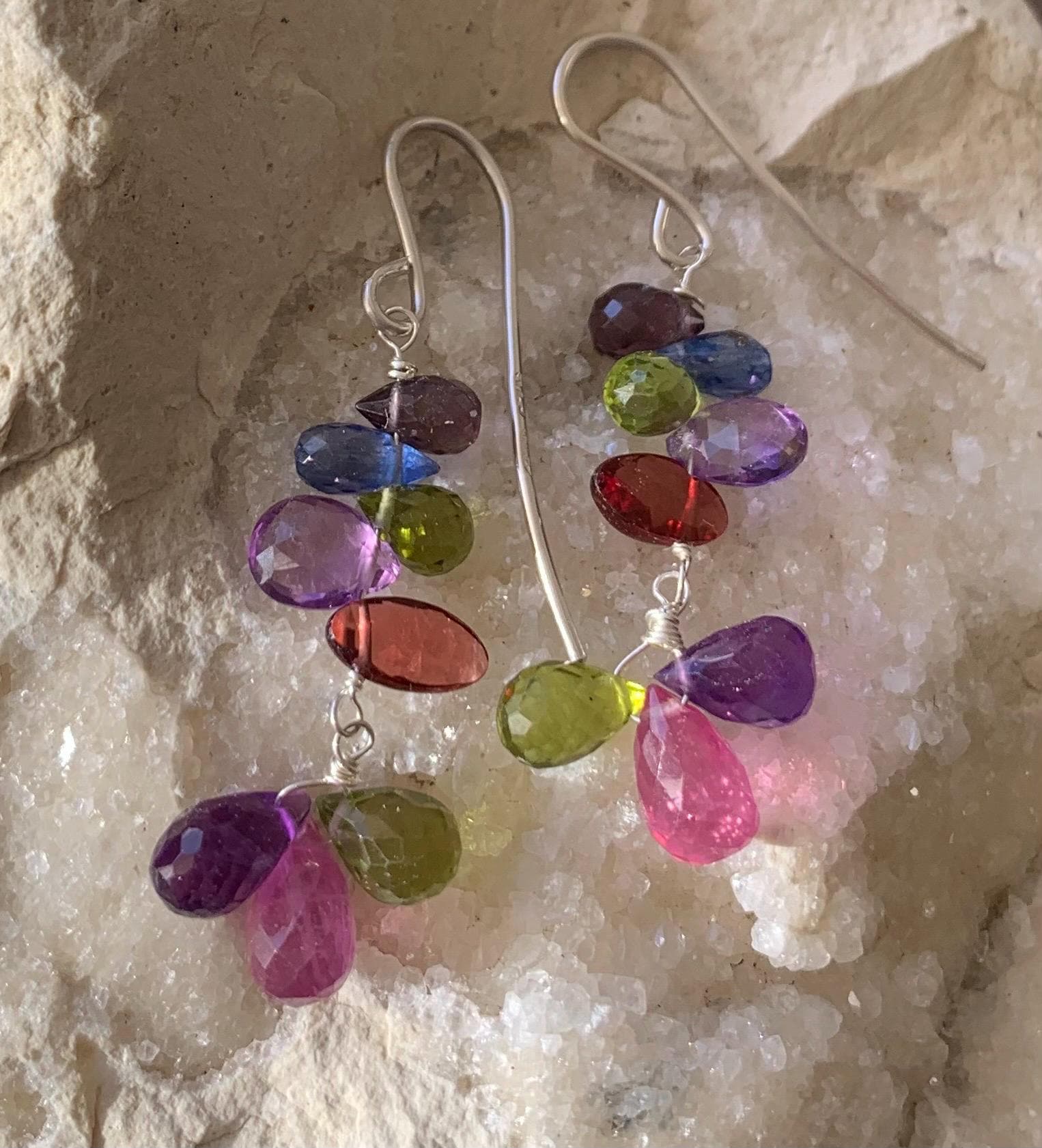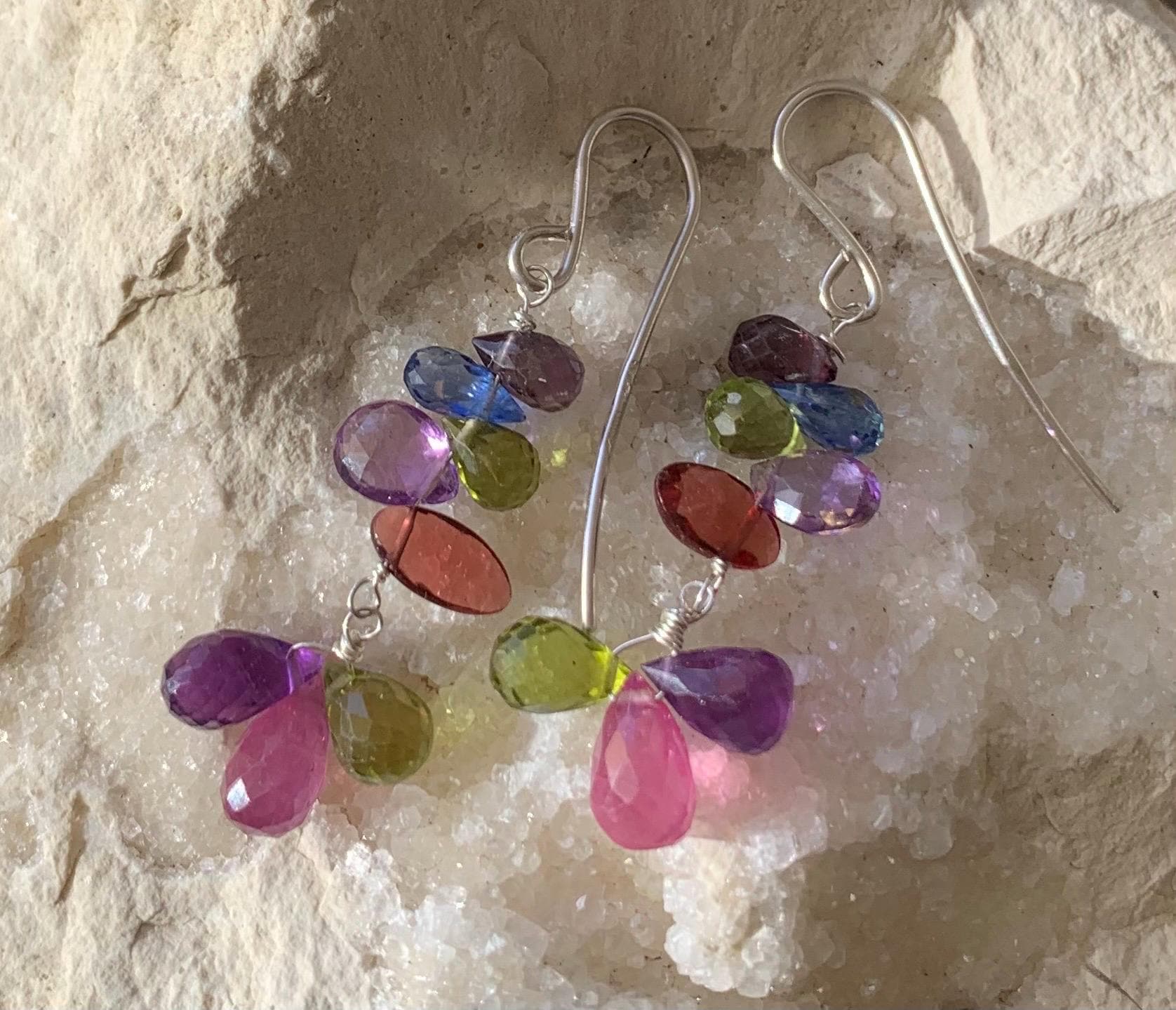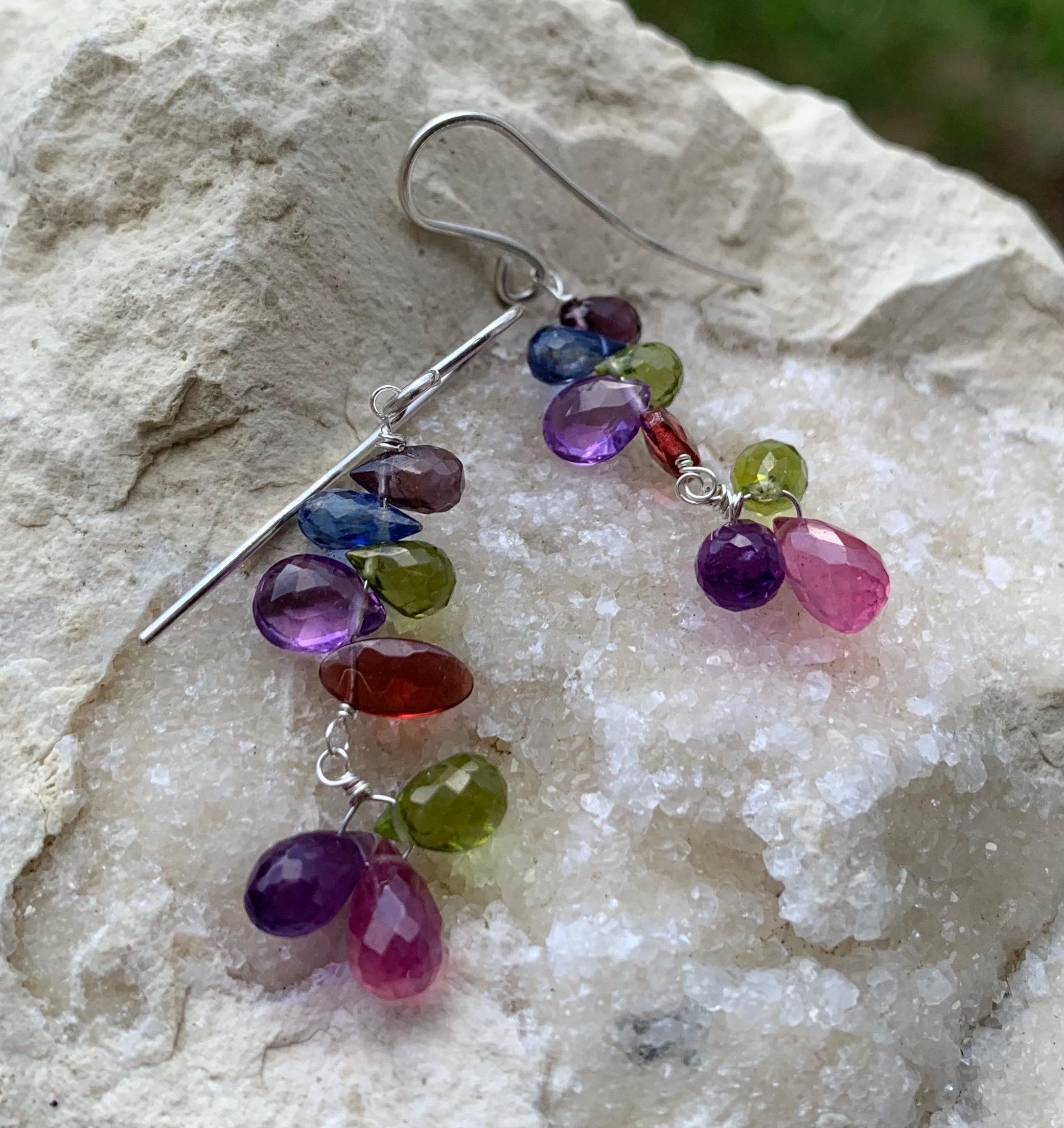 These earrings are done in silver with garnets, cyanites, rubys, péridots and amethystes.