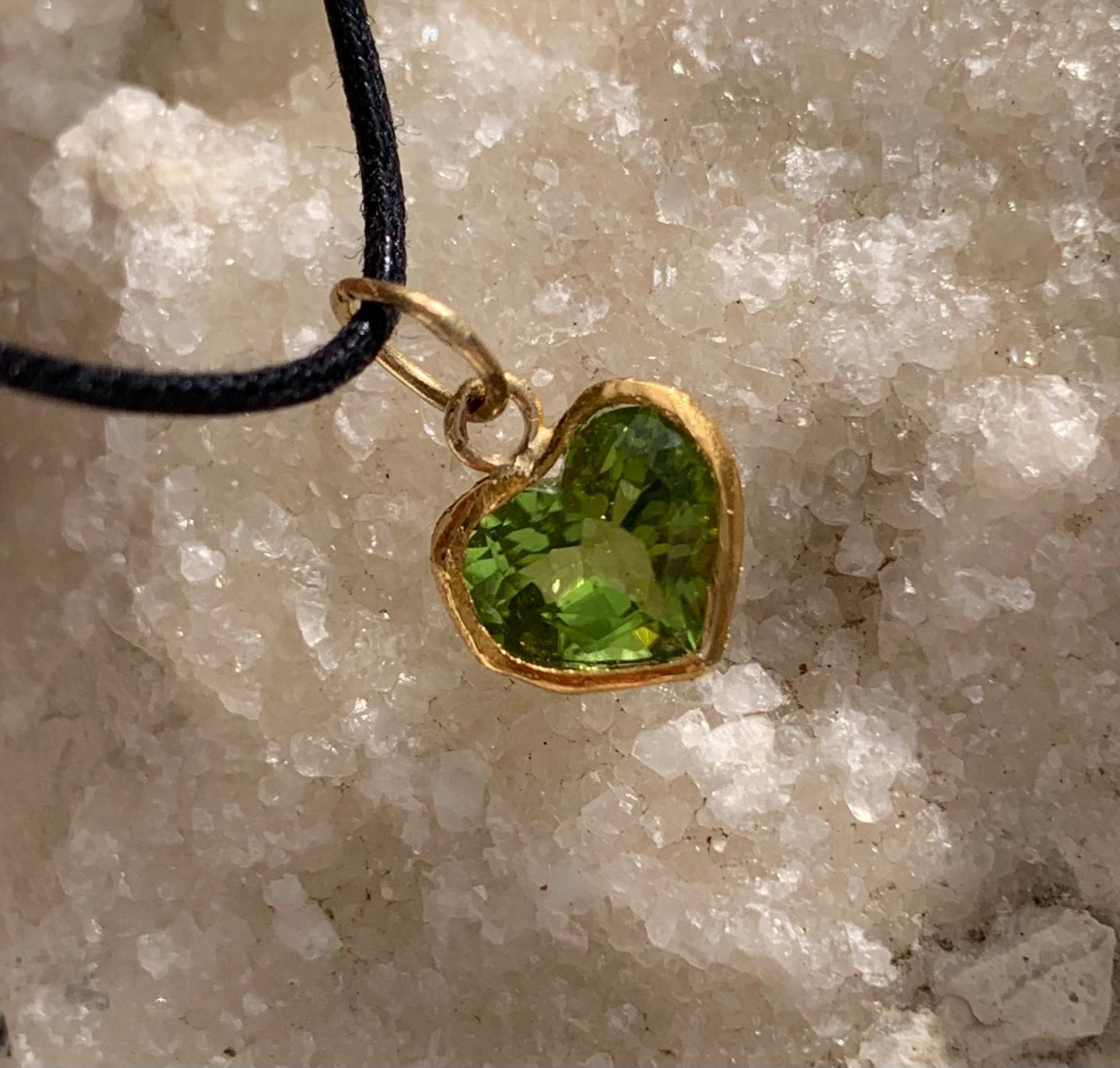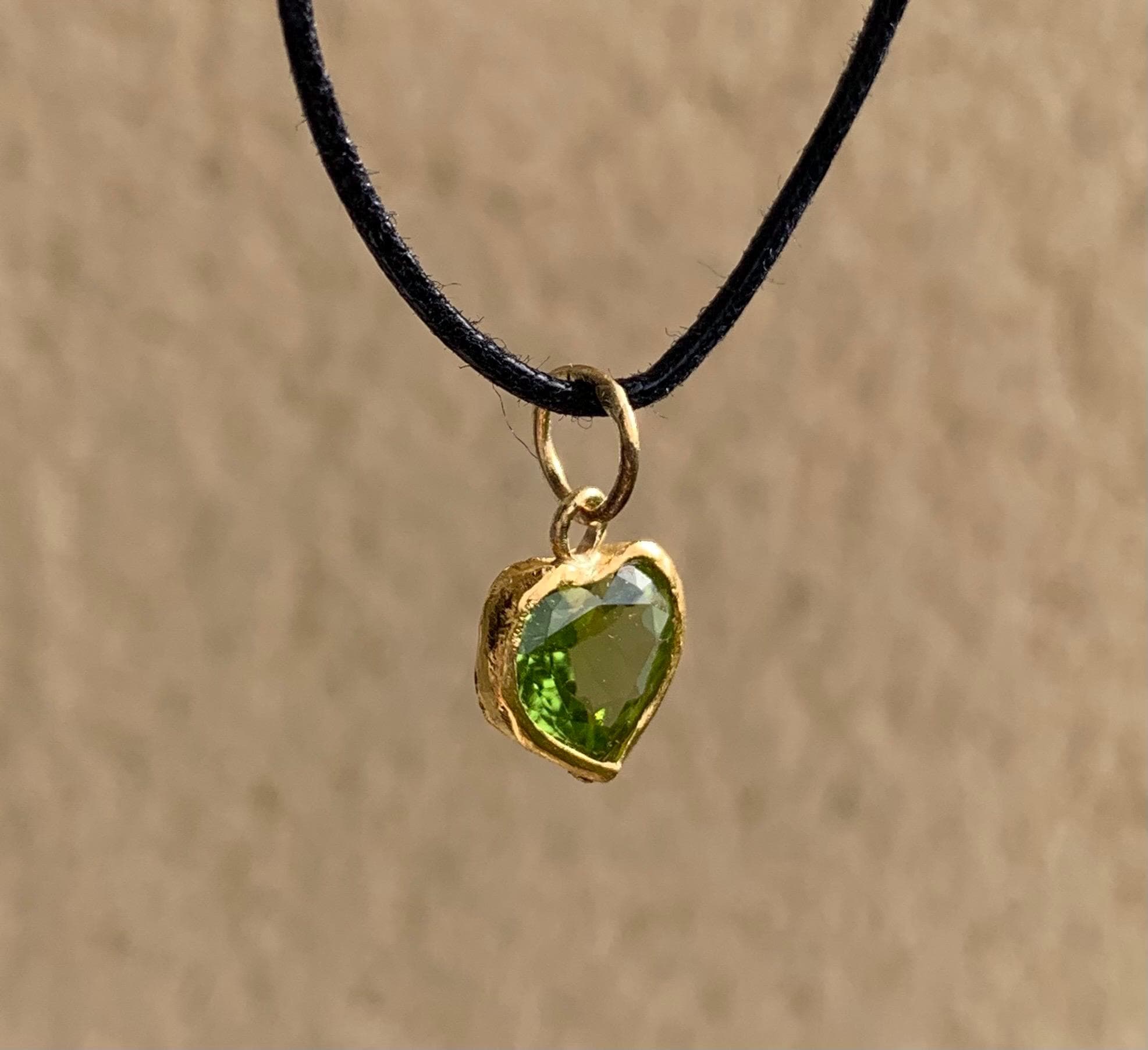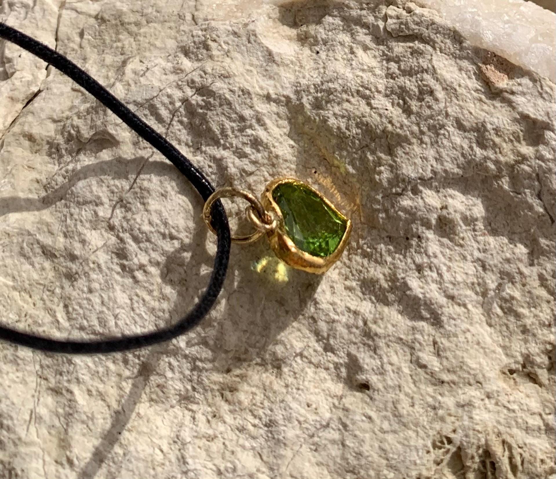 The pendant is done with 1 peridot ( 0,83 cm x 0,75 cm; 1,8 kt ) setted in 24 ct fine gold, with a loop done in 18 k gold.
