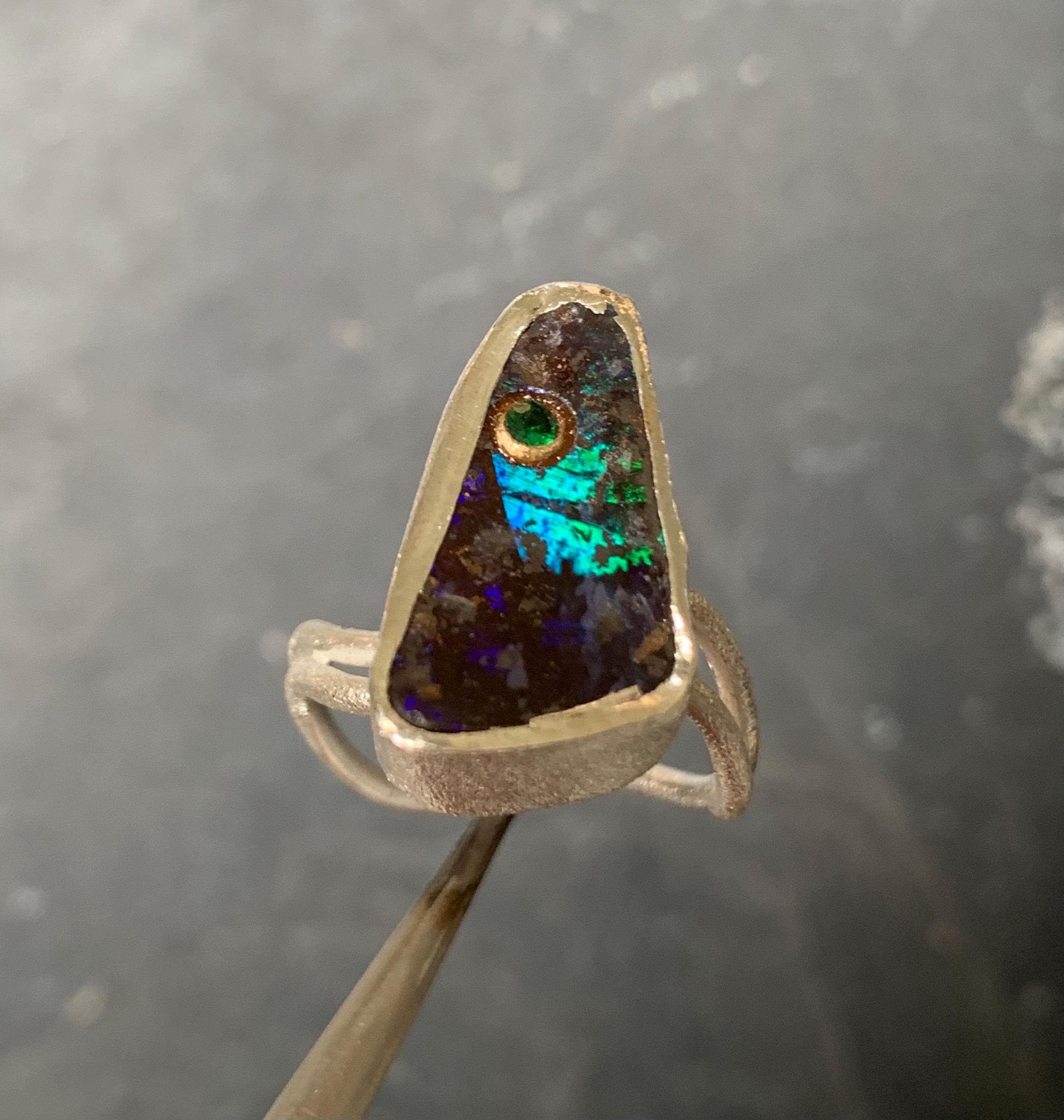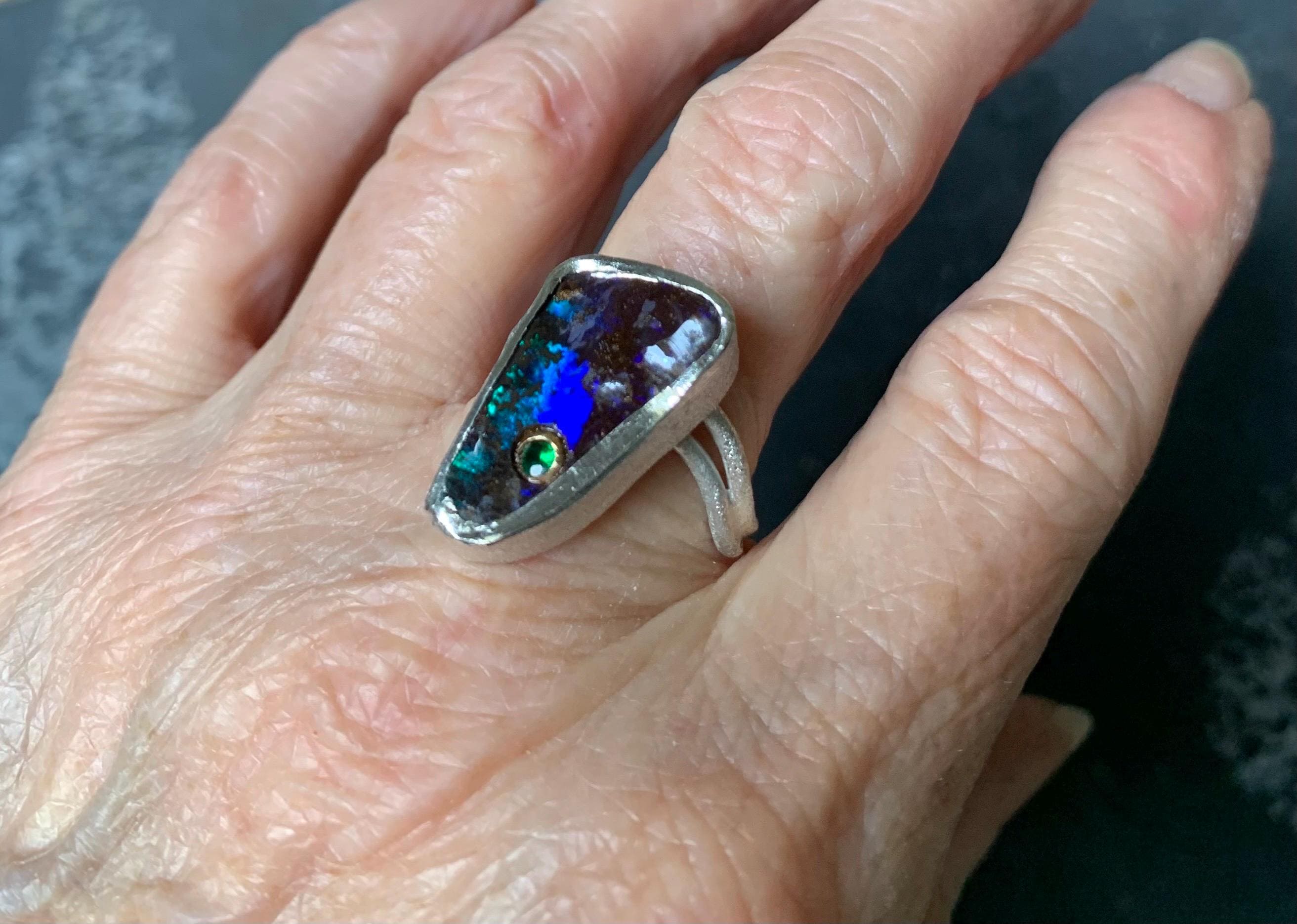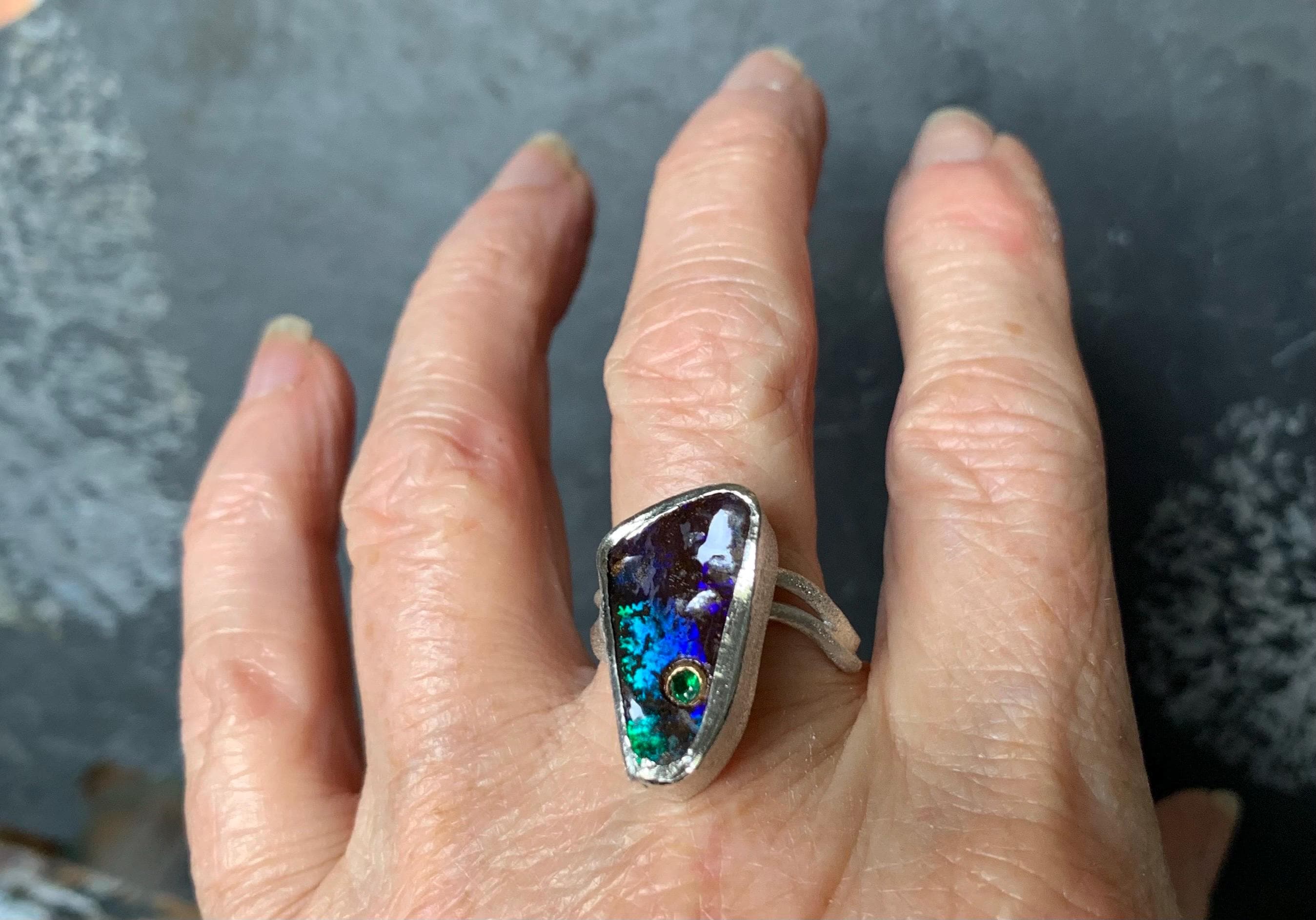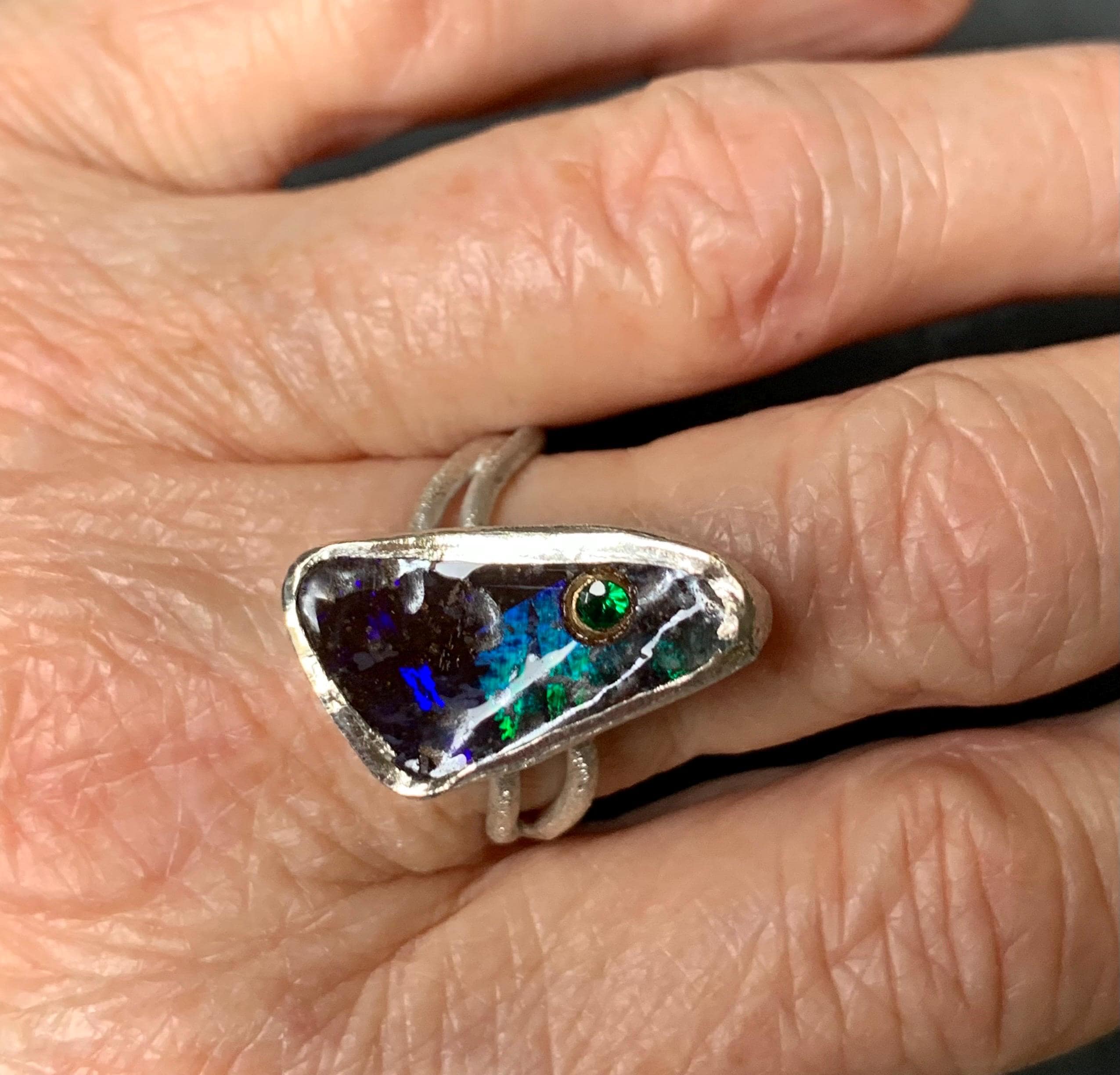 The ring is done in silver with 1 australian boulder opal and a little 18 ct gold setting with a tsavorite.