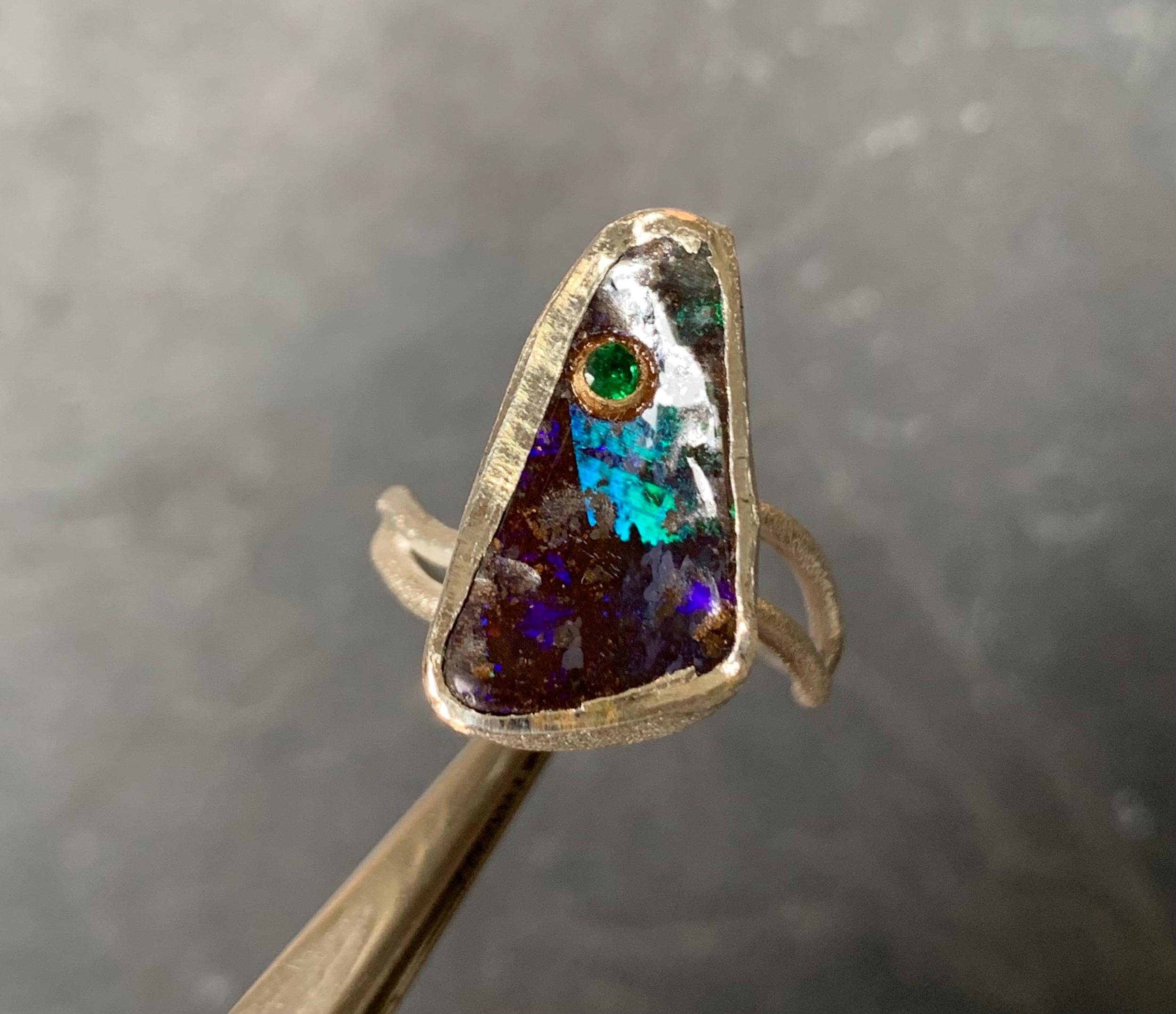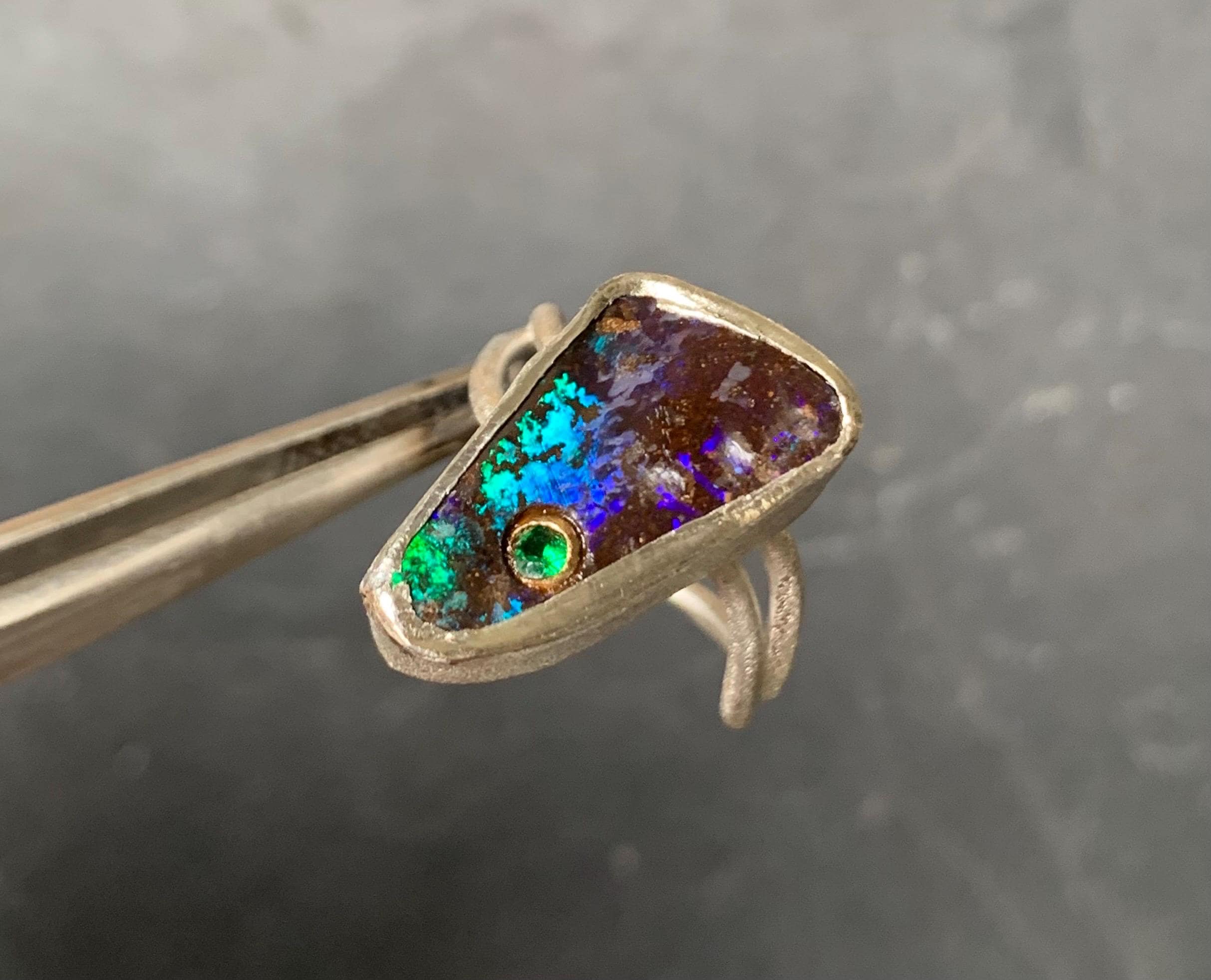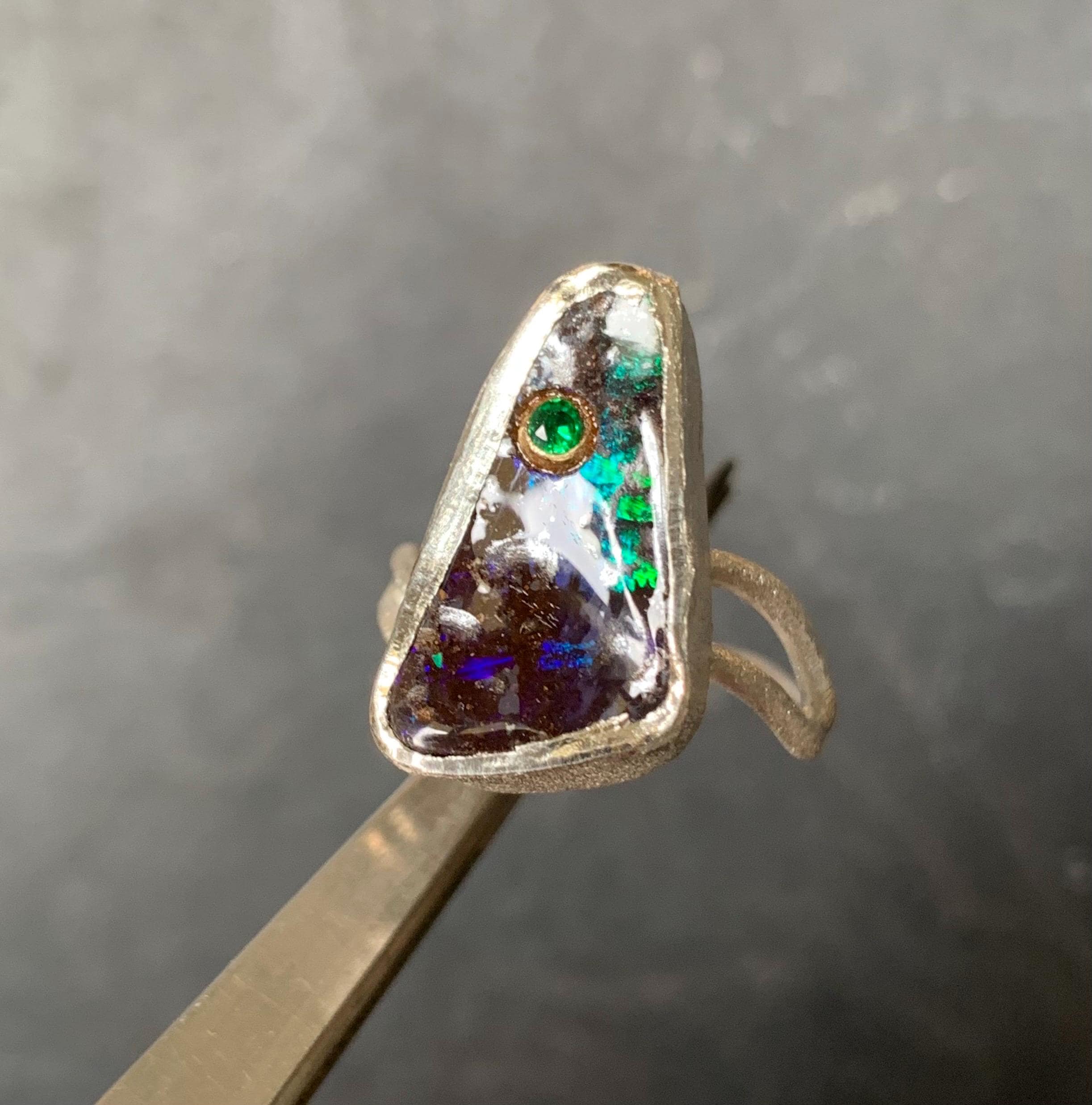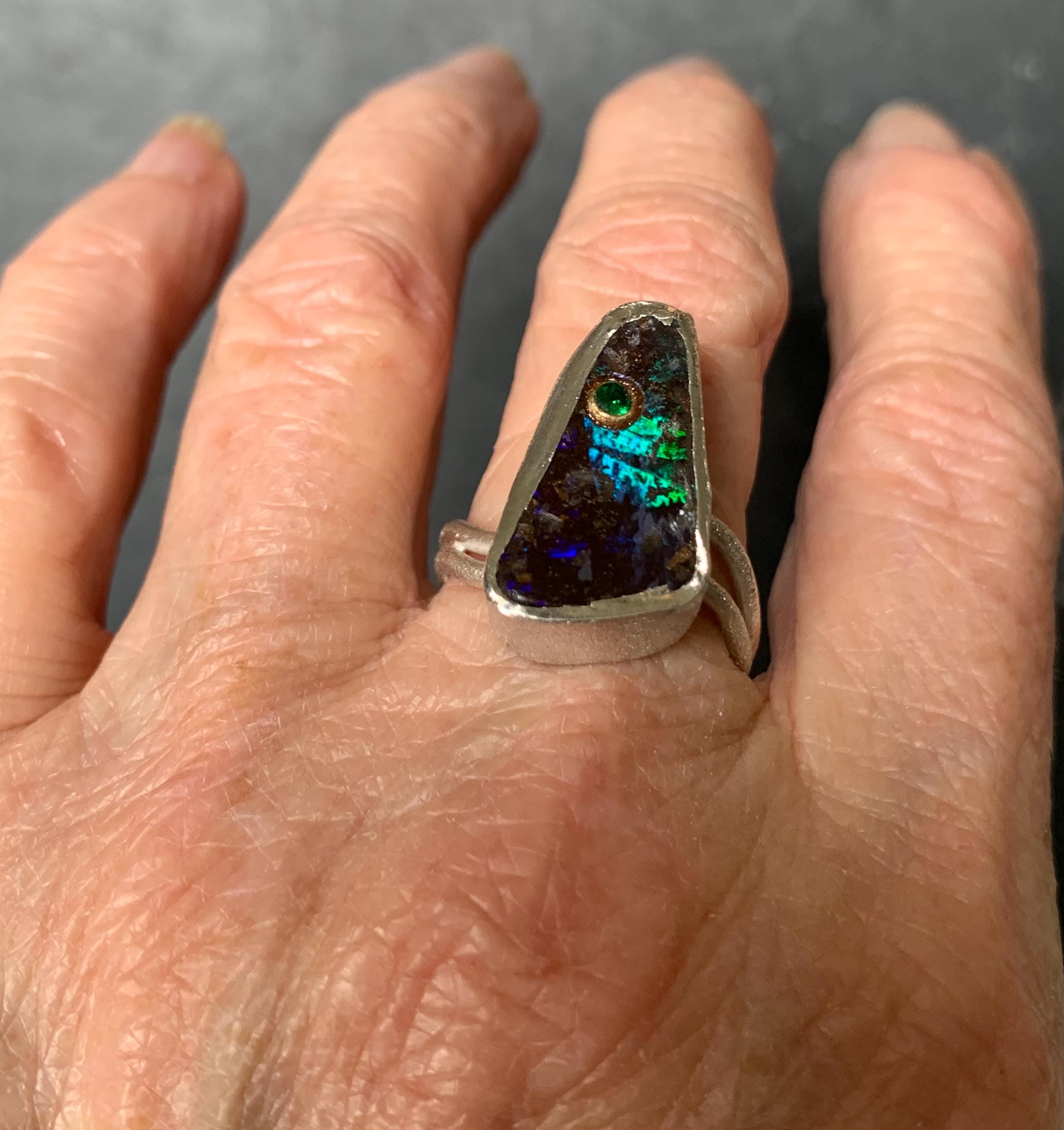 The ring is done in silver with 1 australian boulder opal and a little 18 ct gold setting with a tsavorite.