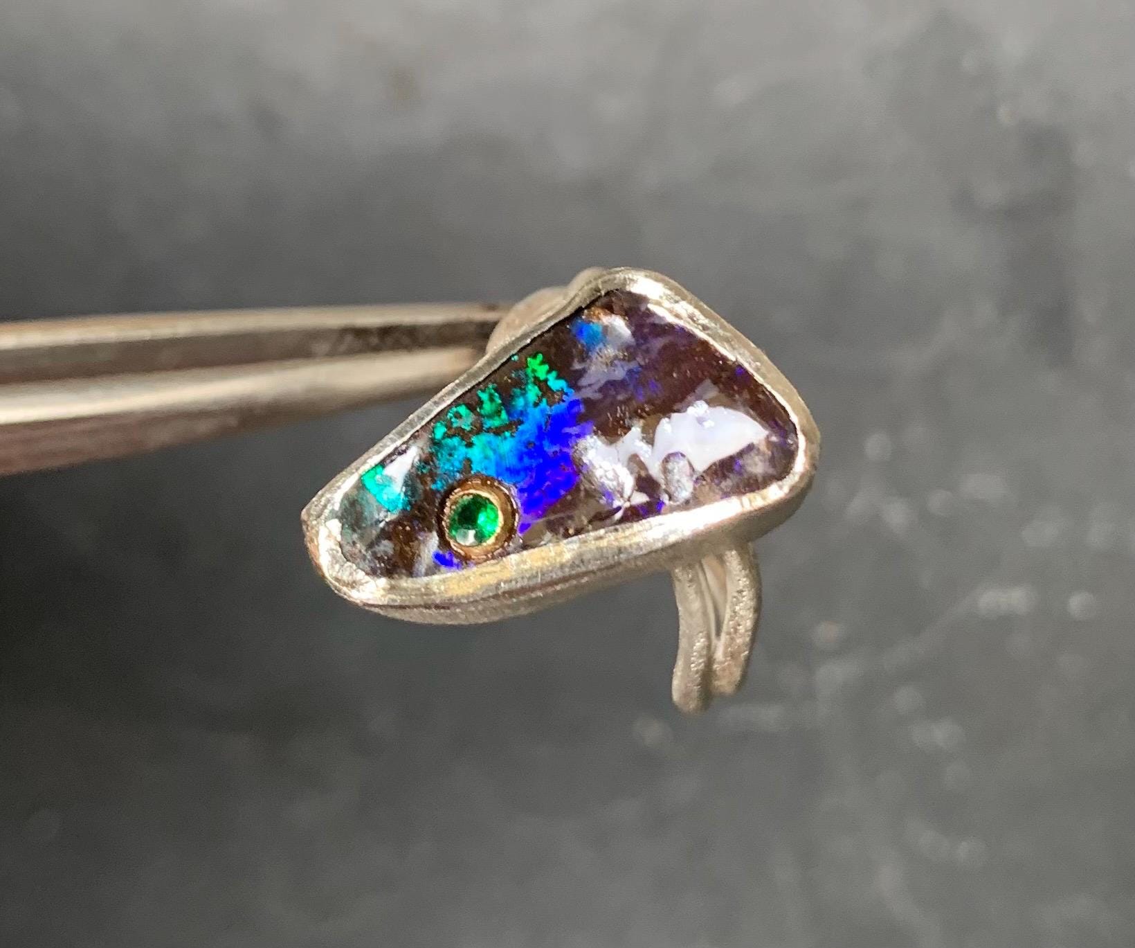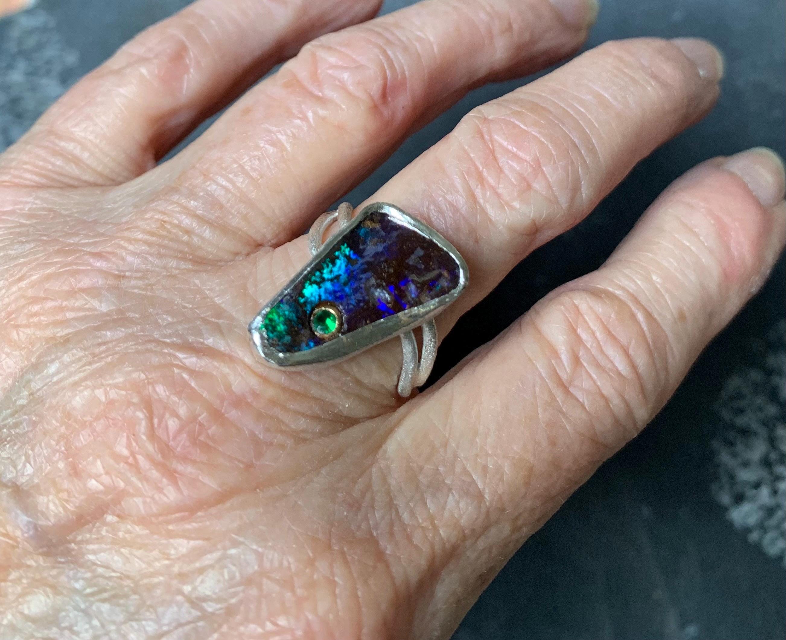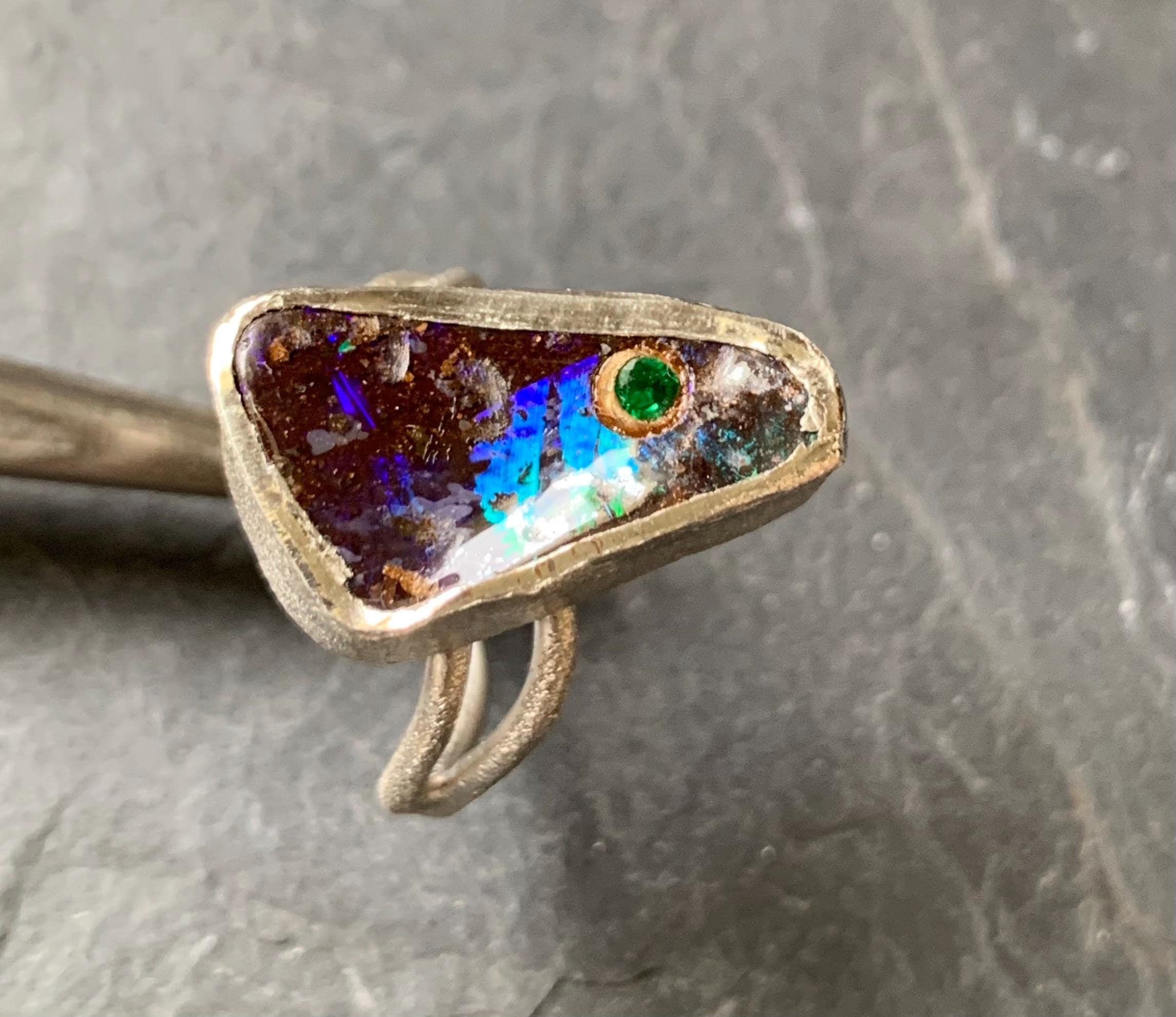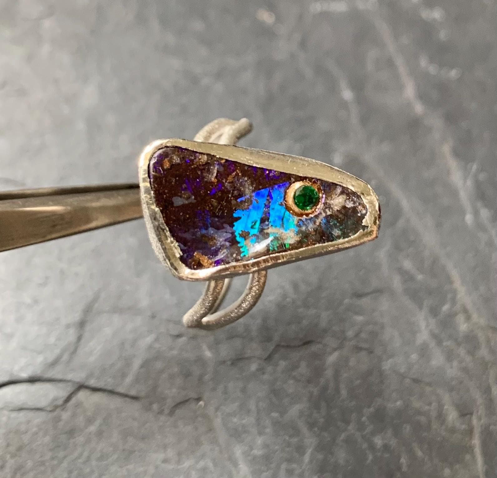 The ring is done in silver with 1 australian boulder opal and a little 18 ct gold setting with a tsavorite.