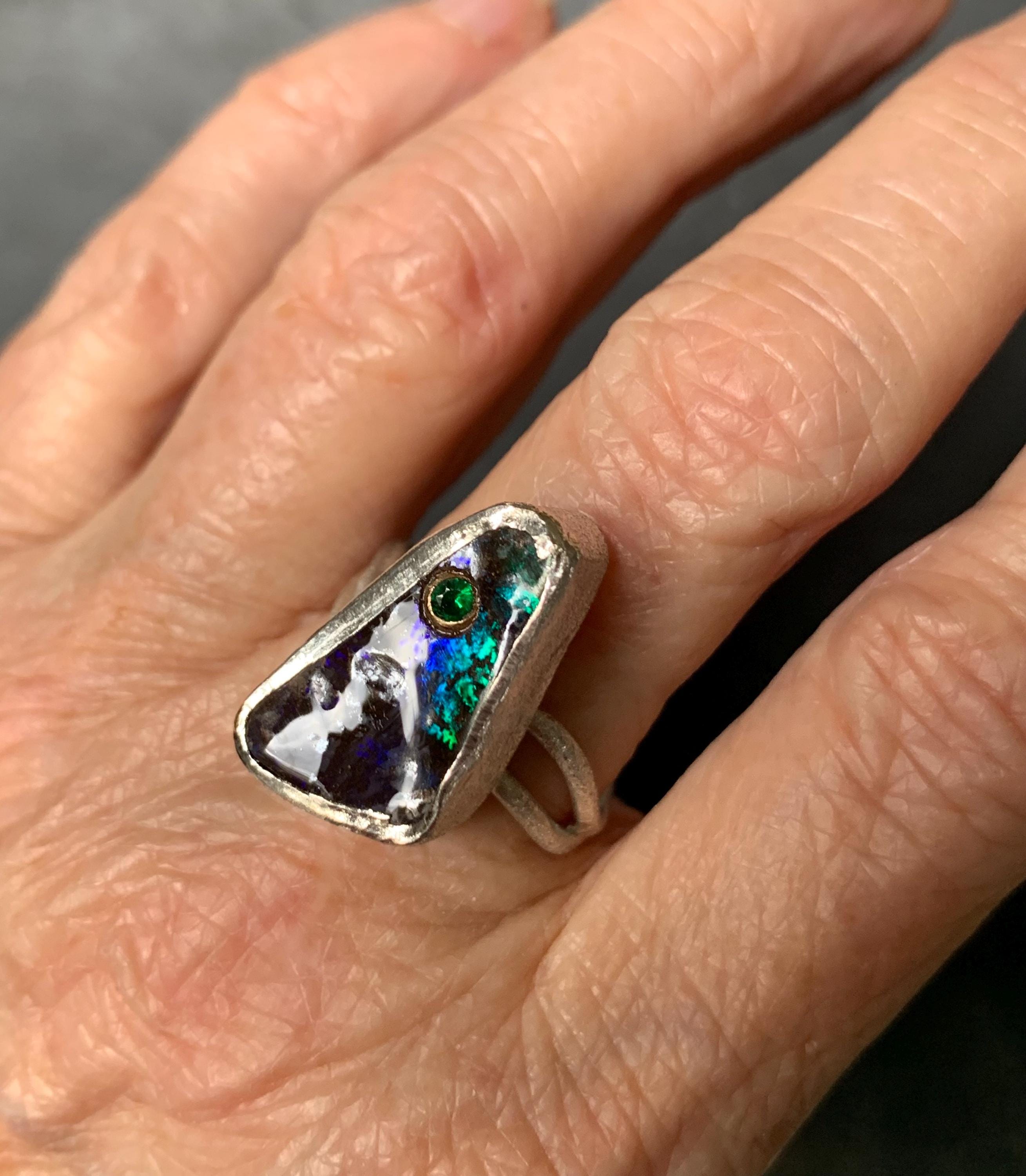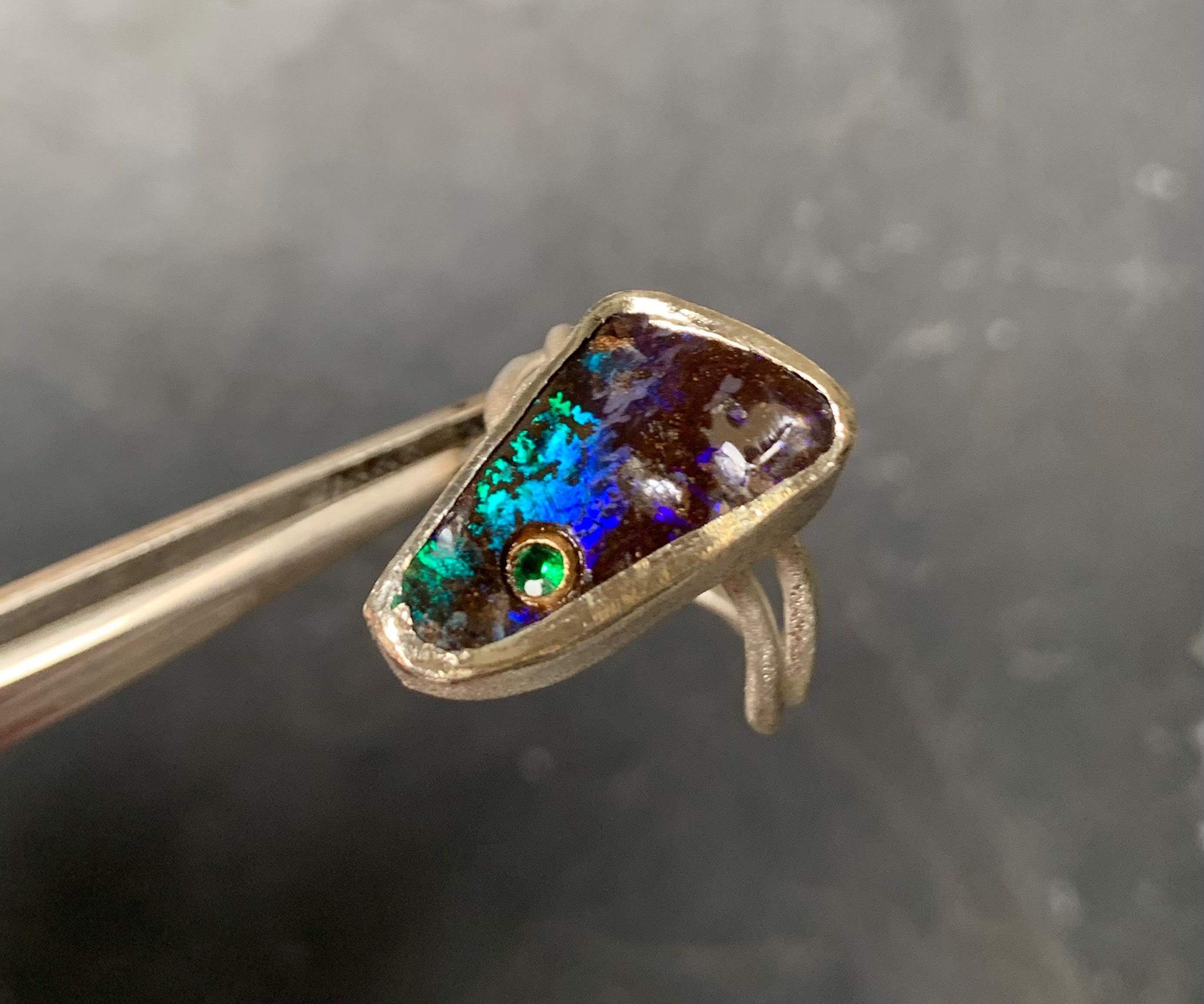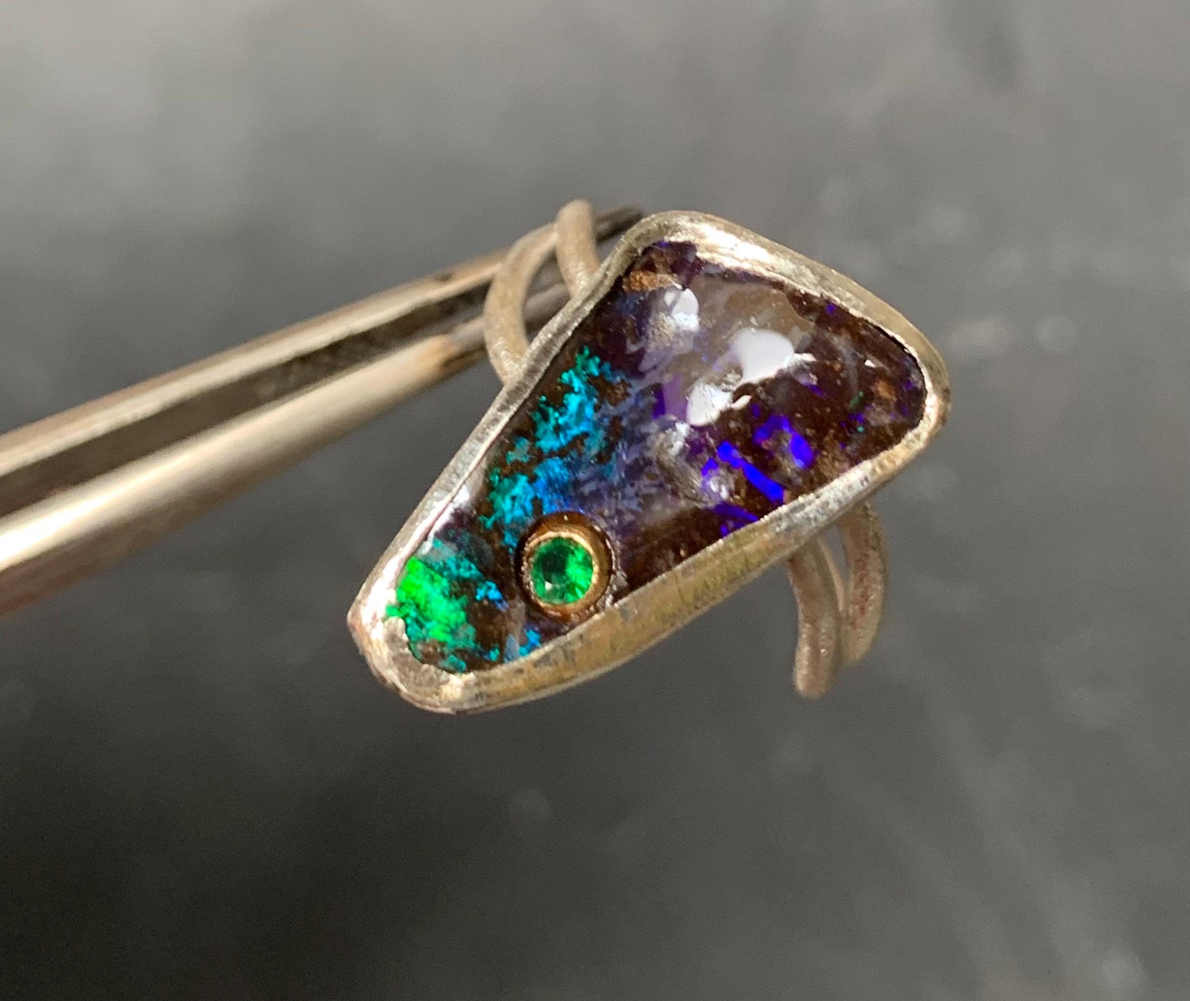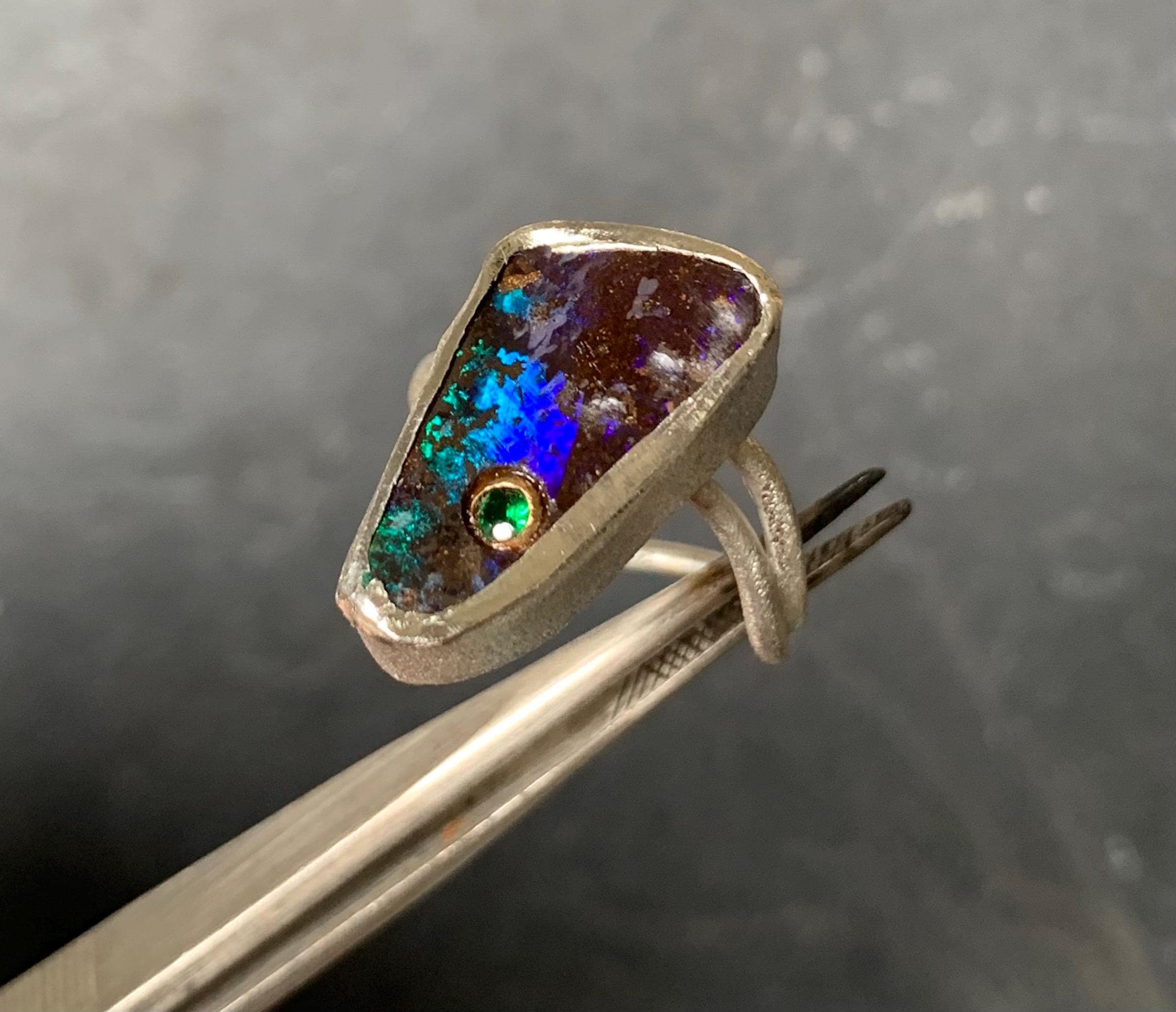 The ring is done in silver with 1 australian boulder opal and a little 18 ct gold setting with a tsavorite.