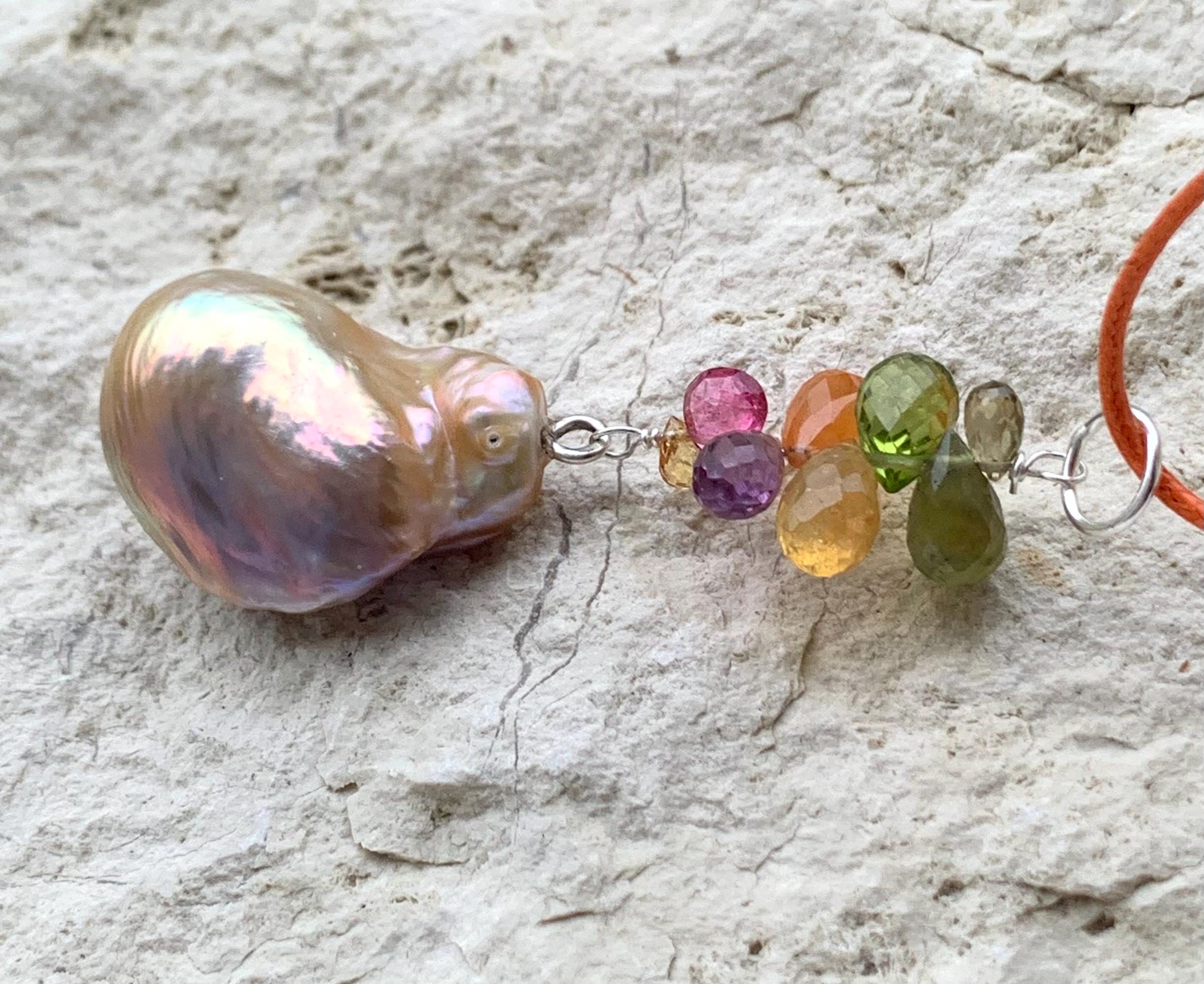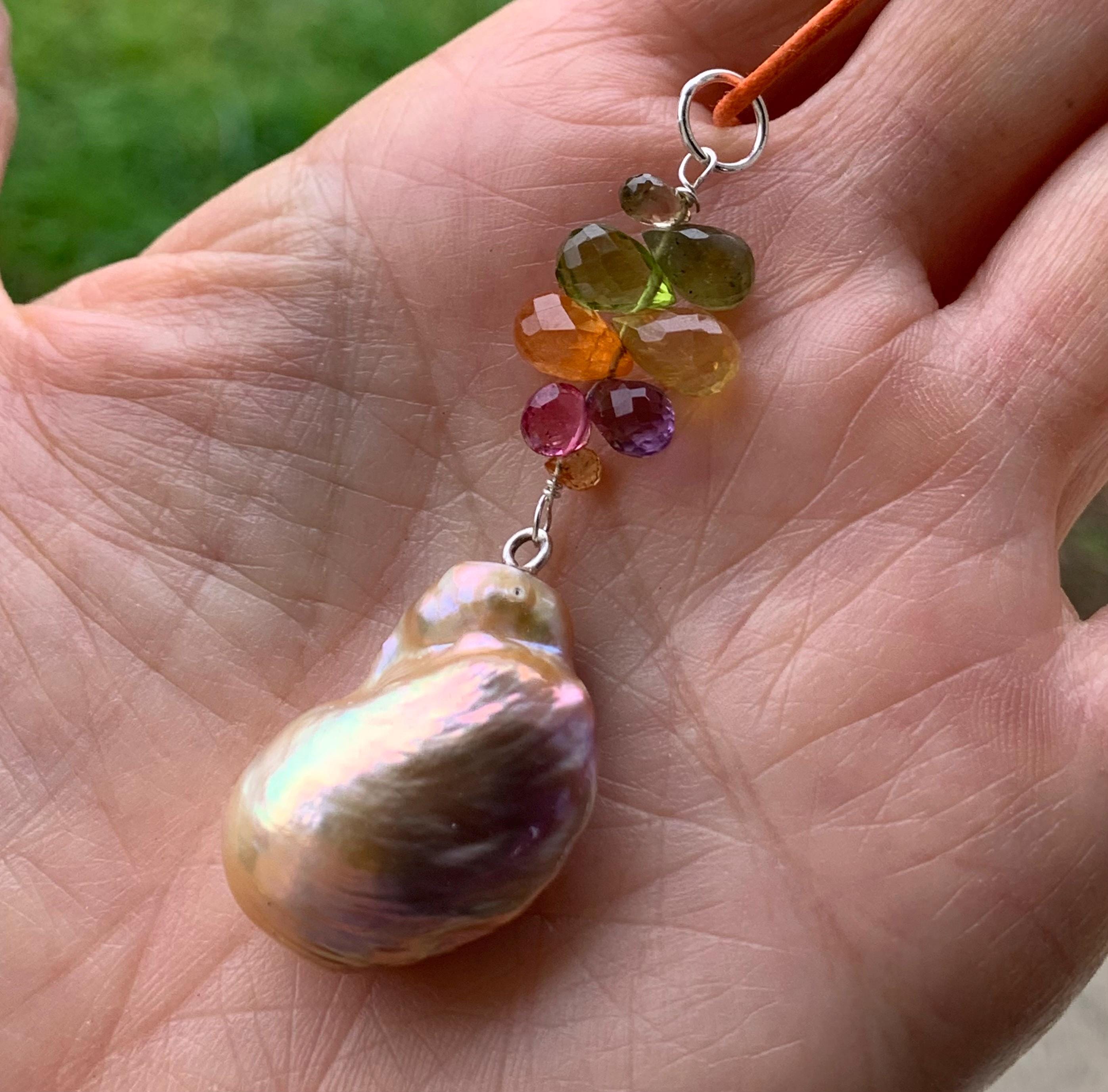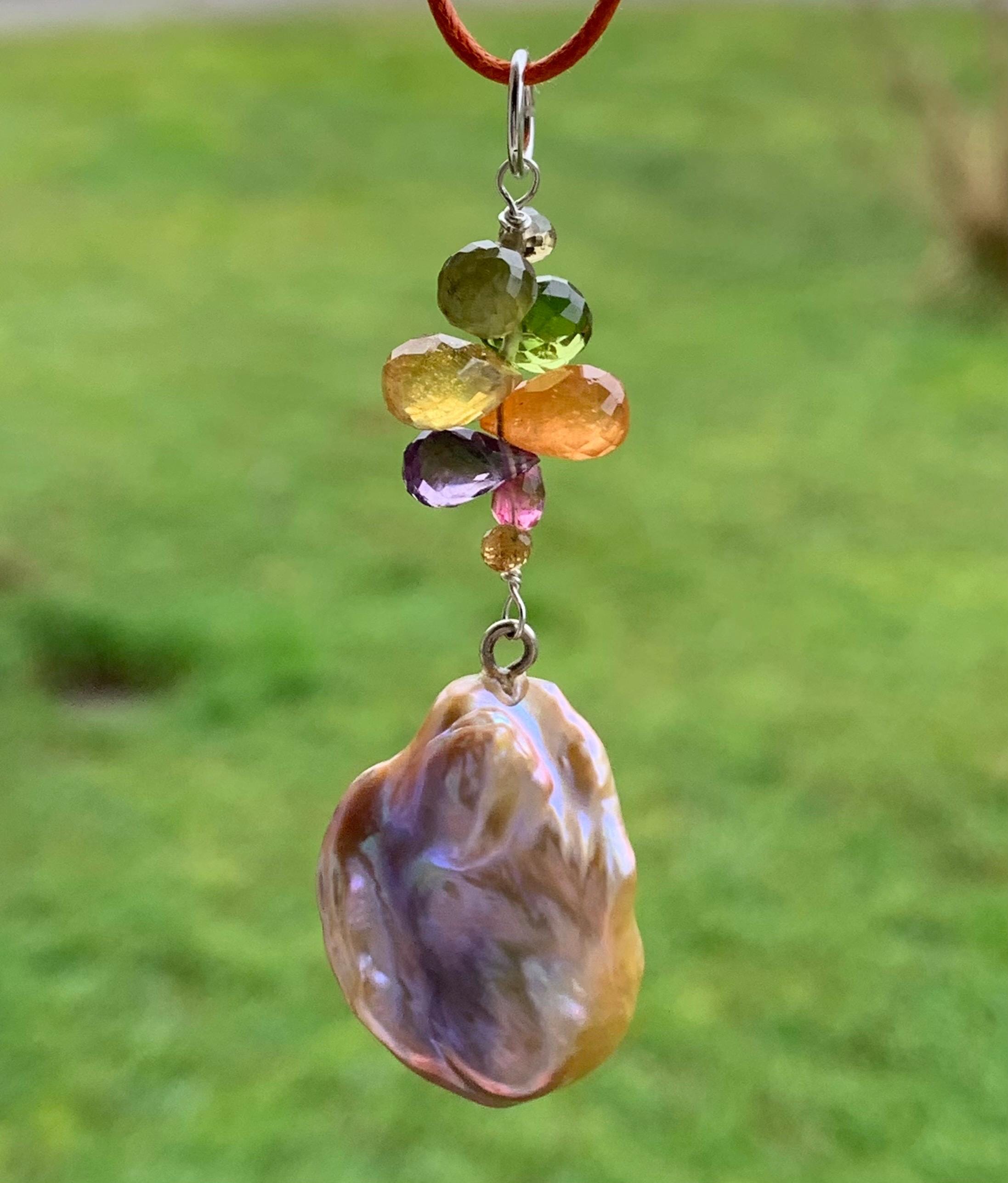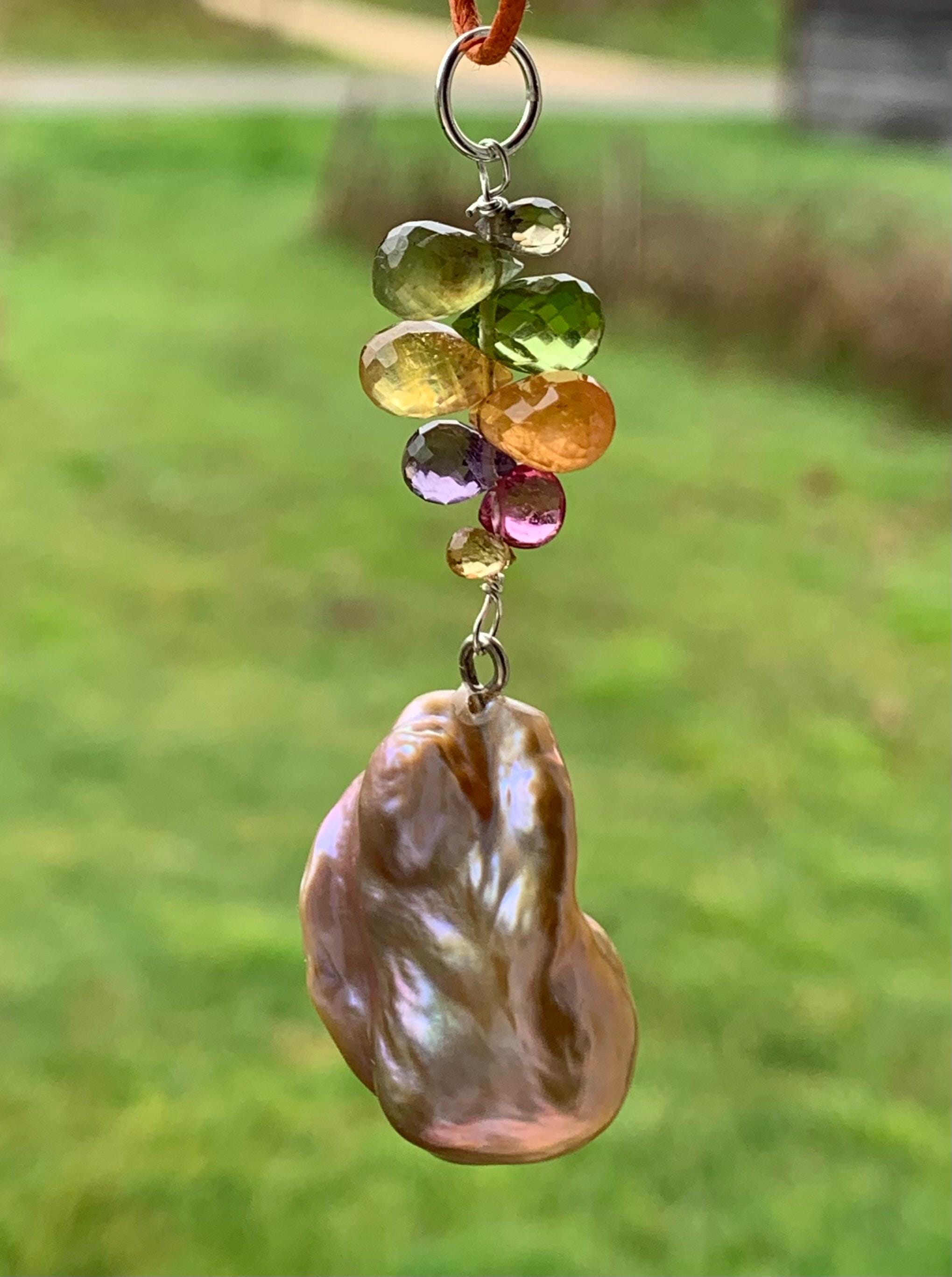 The main piece is a baroque, fresh water pearl and tourmalines hanging on silver wire.