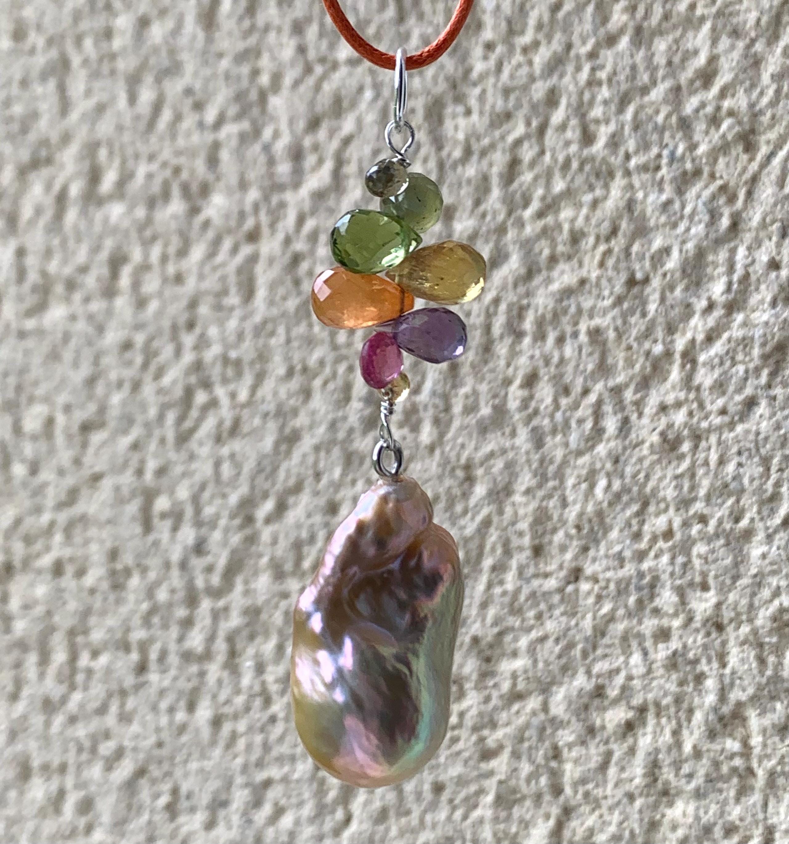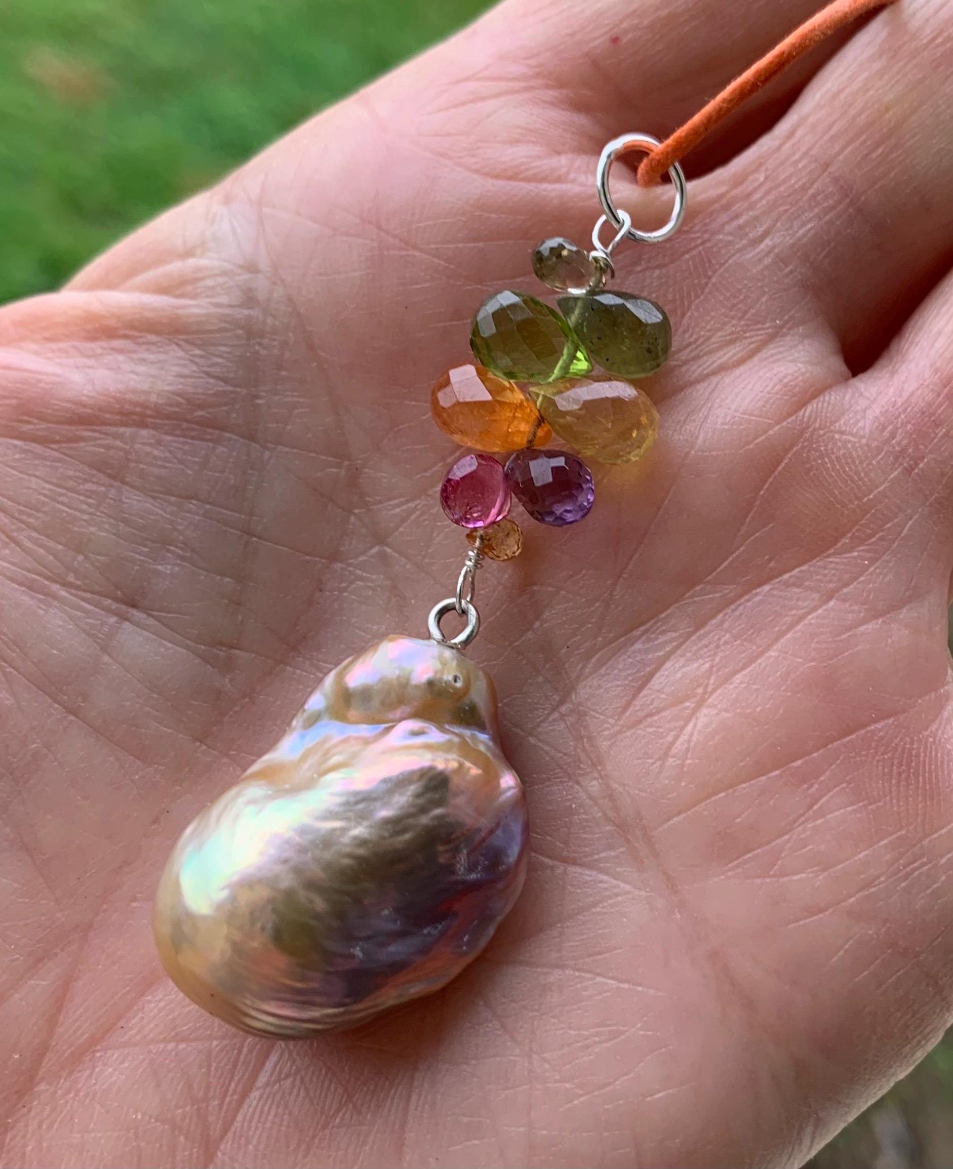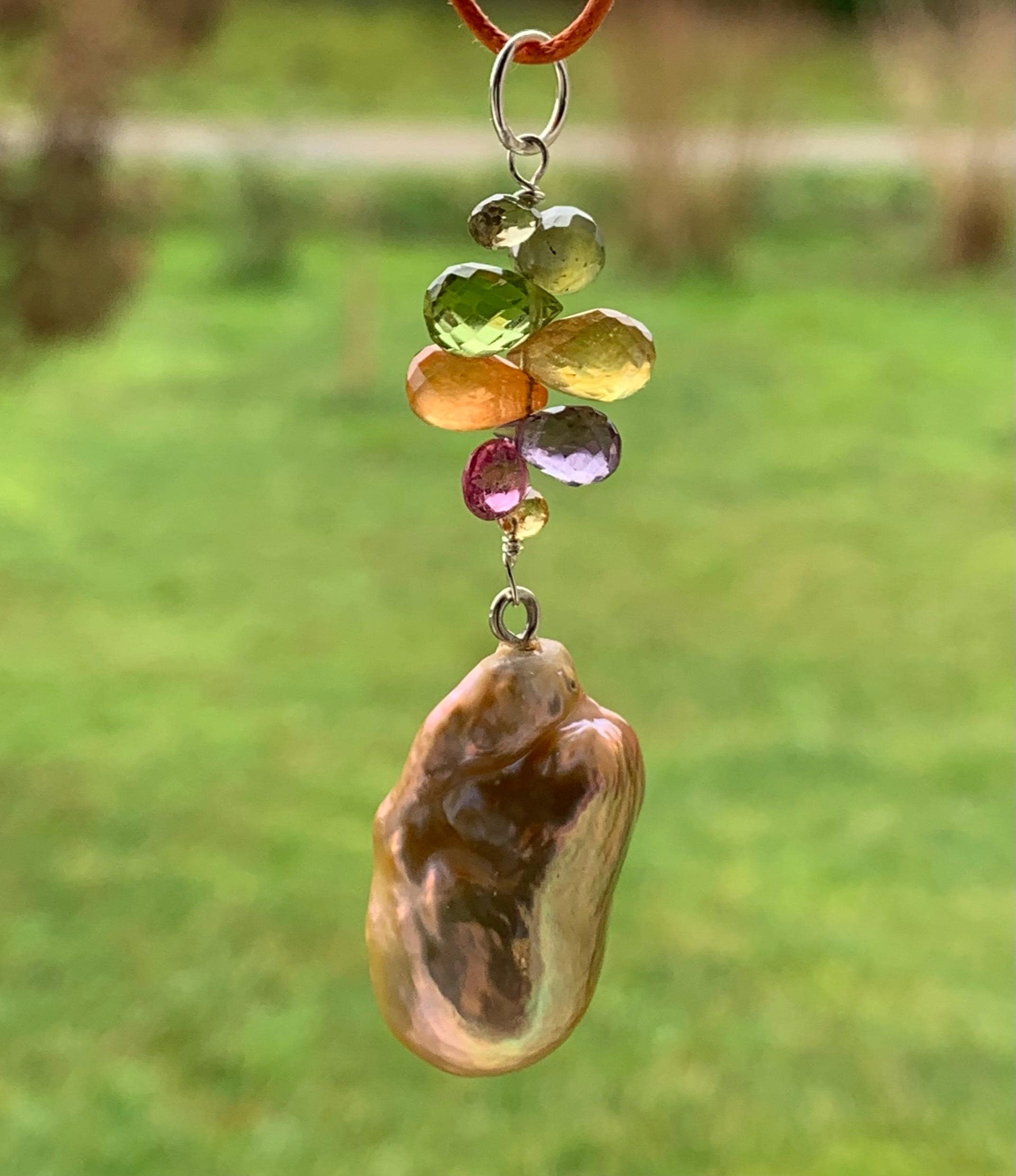 The main piece is a baroque, fresh water pearl and tourmalines hanging on silver wire.