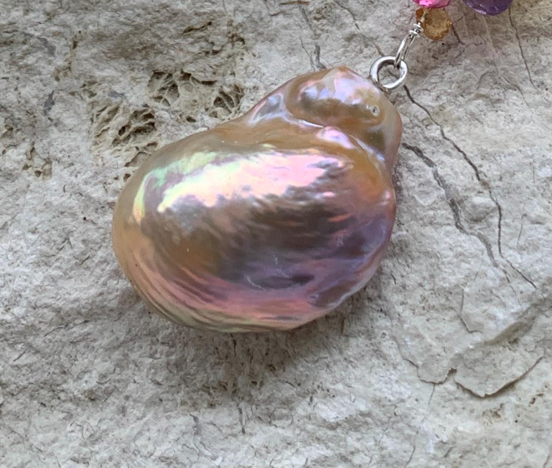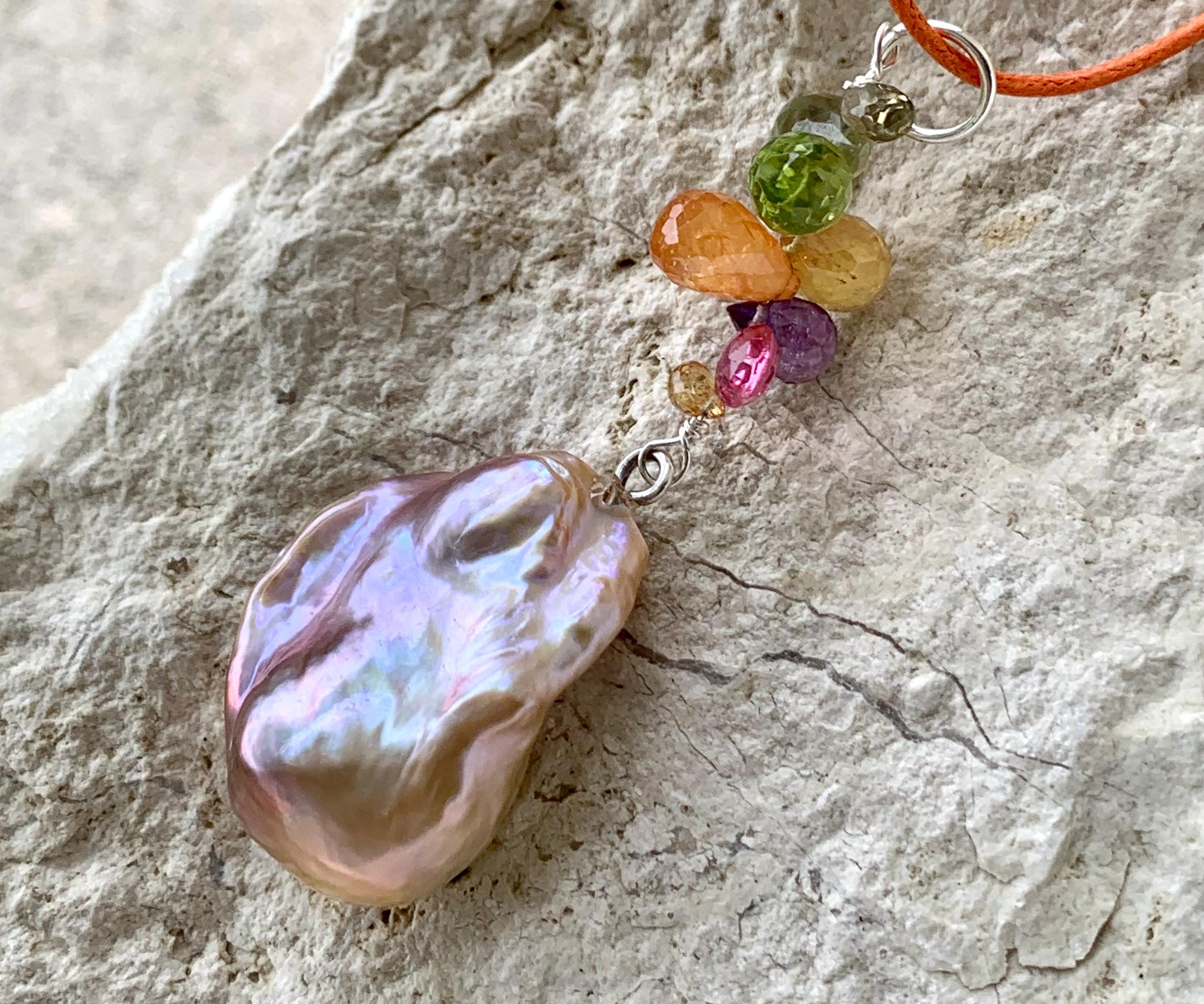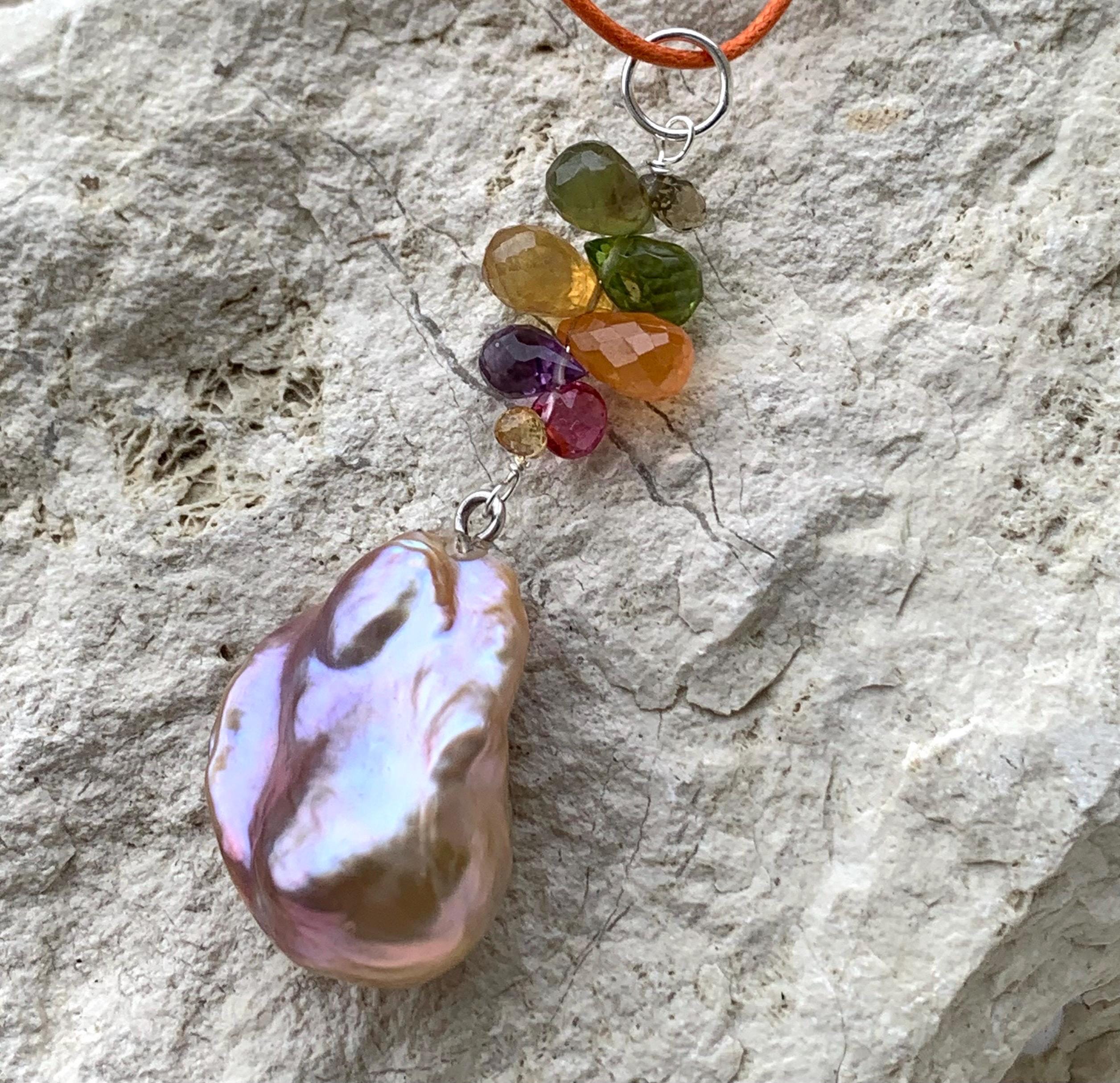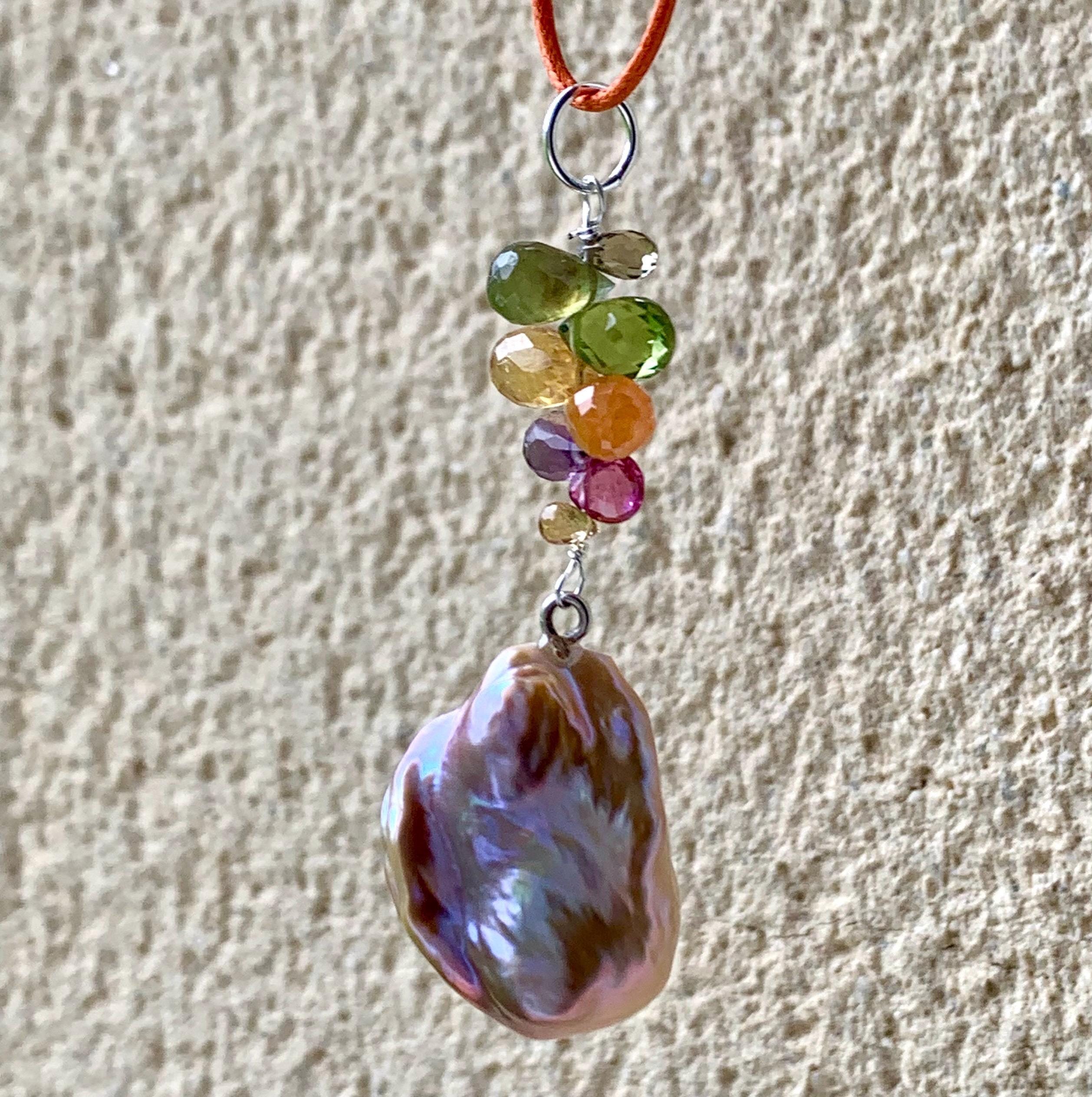 The main piece is a baroque, fresh water pearl and tourmalines hanging on silver wire.