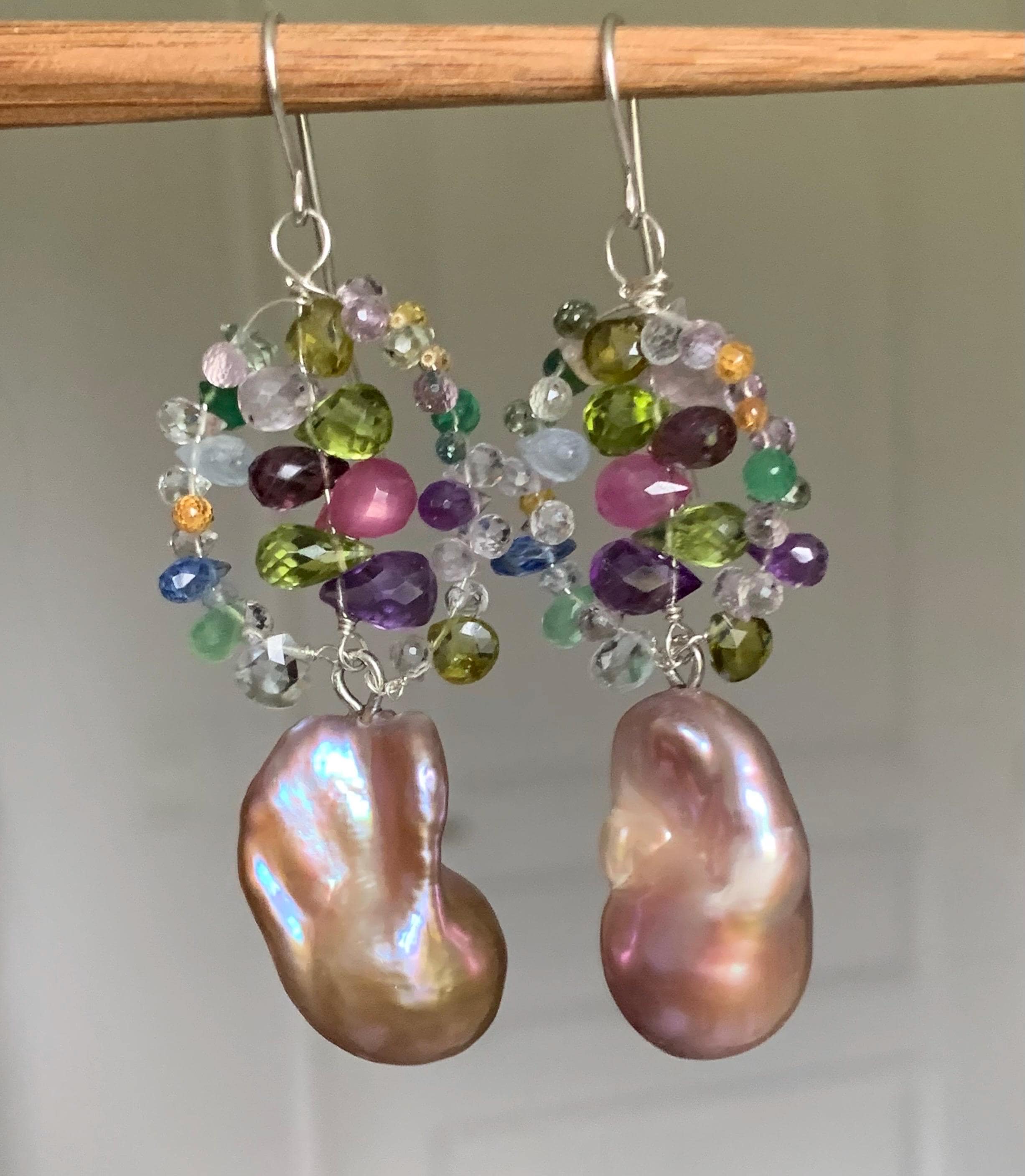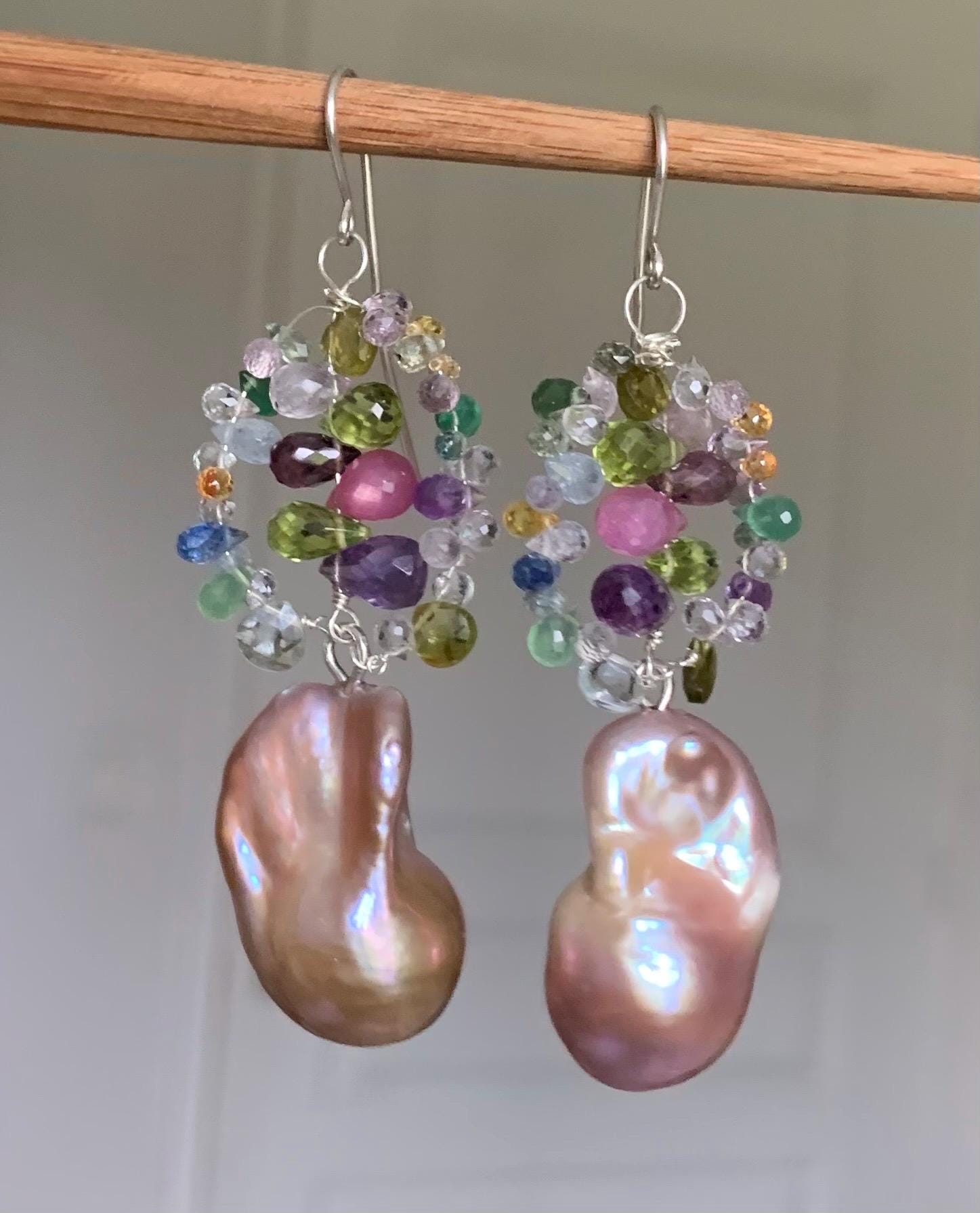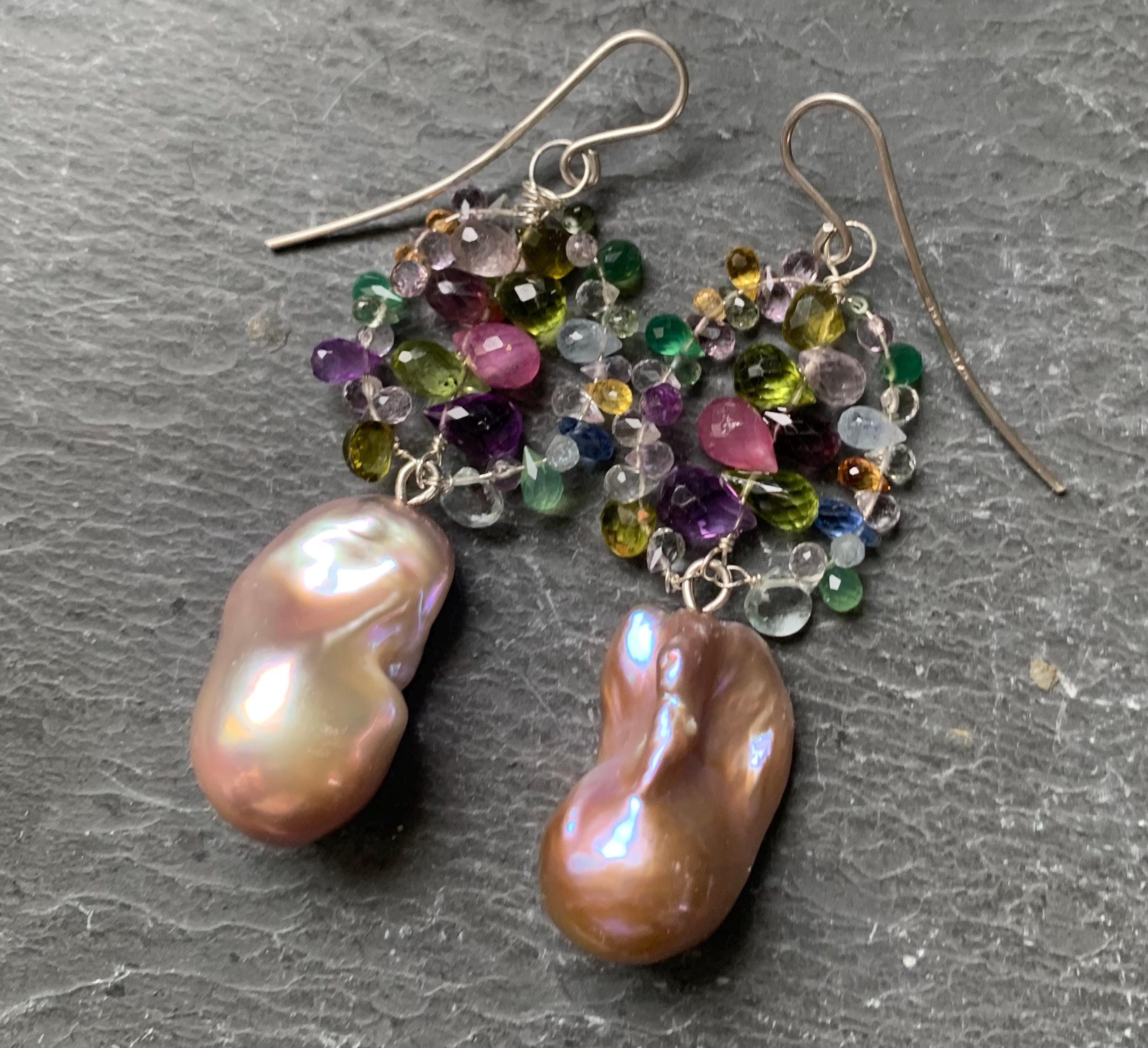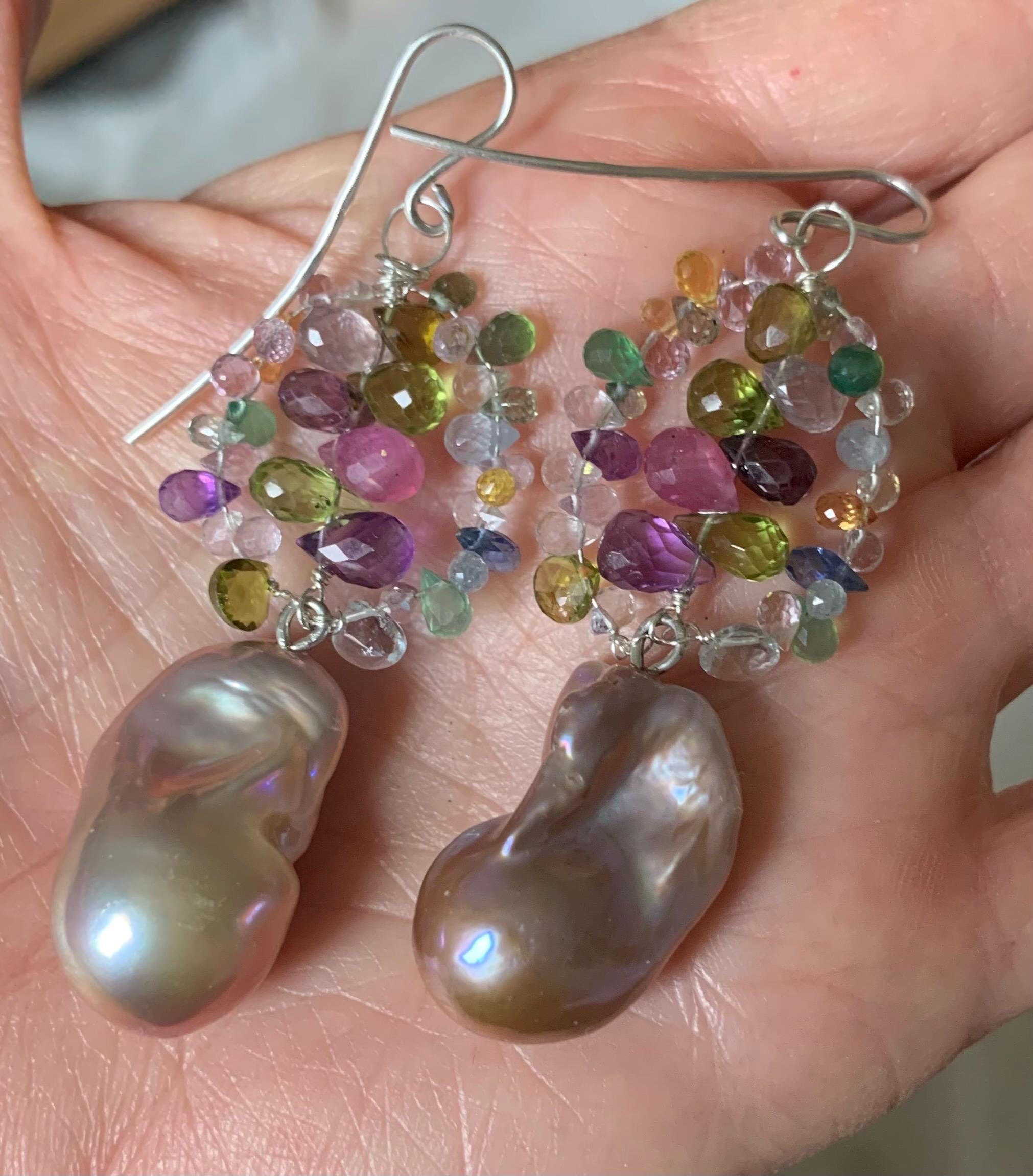 They are done in silver with tourmalins, peridots, coloured sapphires, aventurins, cyanits, rubys, améthysts and 2 freshwater baroque pearls.