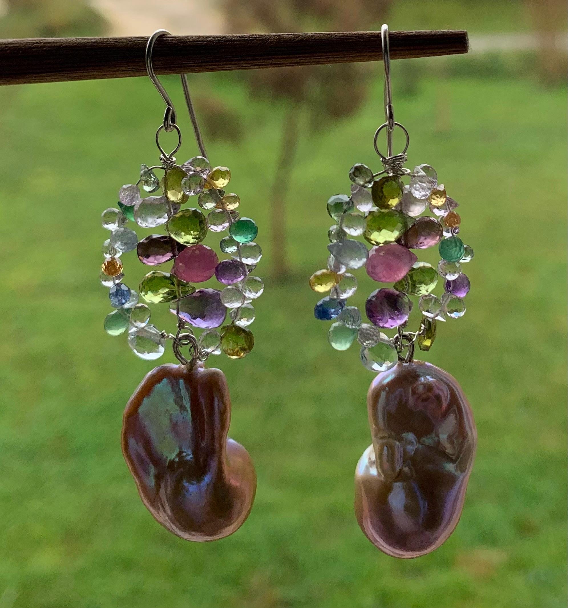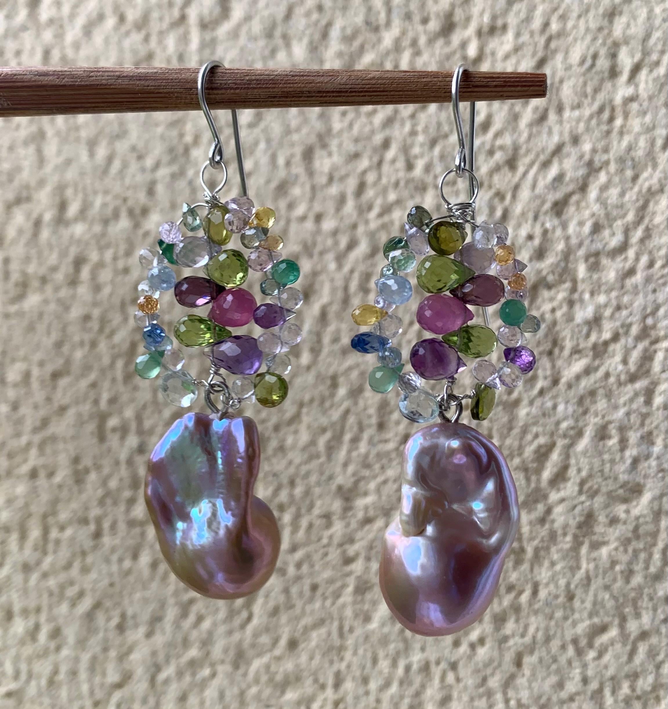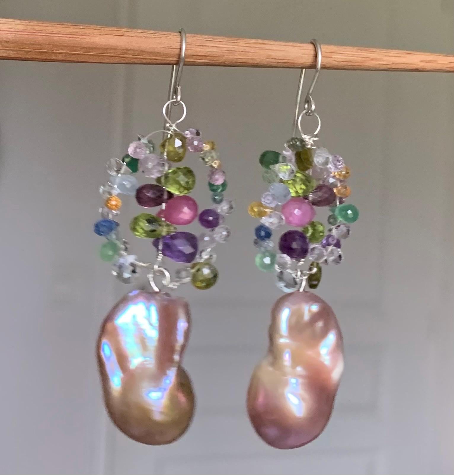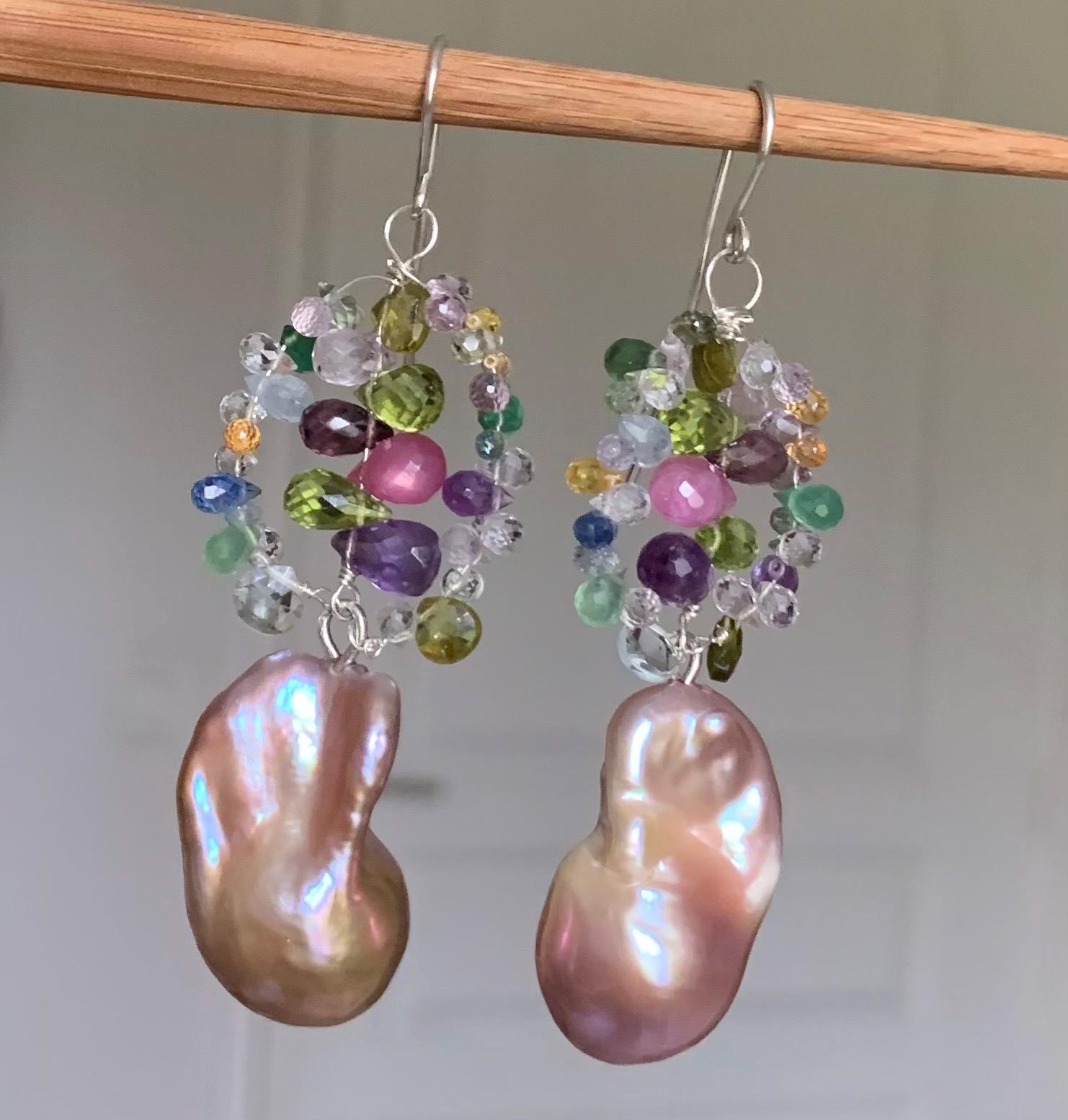 They are done in silver with tourmalins, peridots, coloured sapphires, aventurins, cyanits, rubys, améthysts and 2 freshwater baroque pearls.