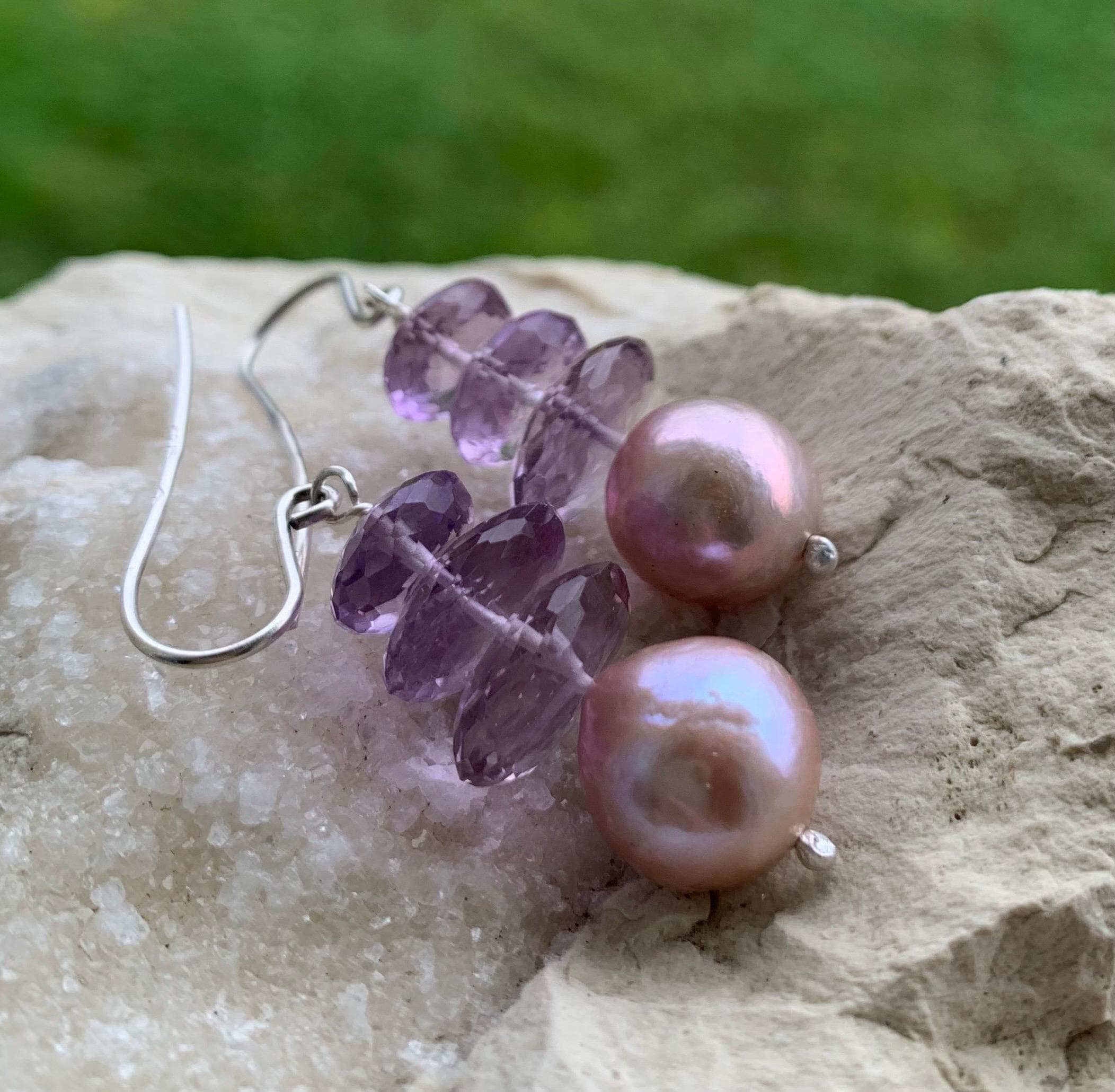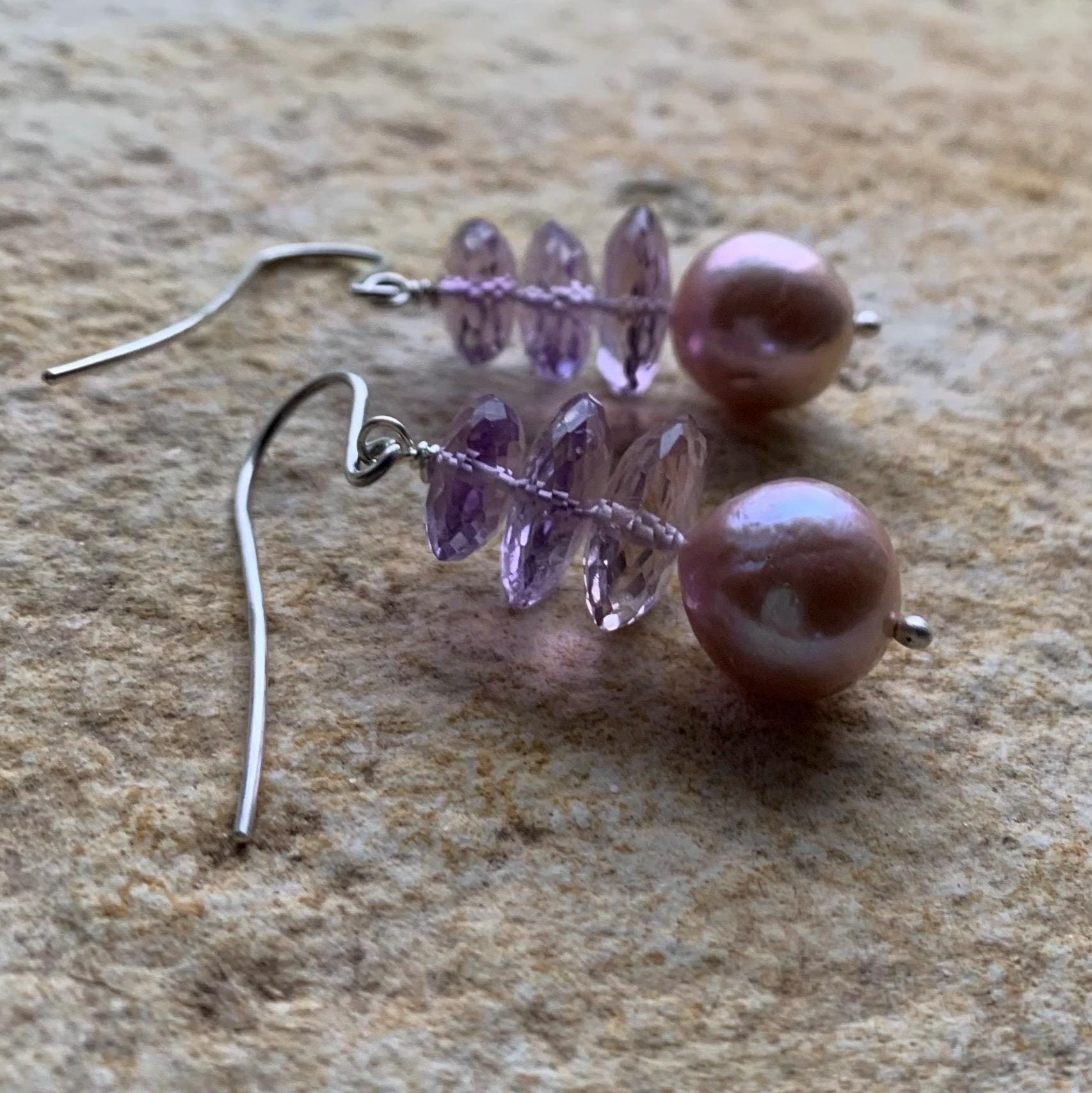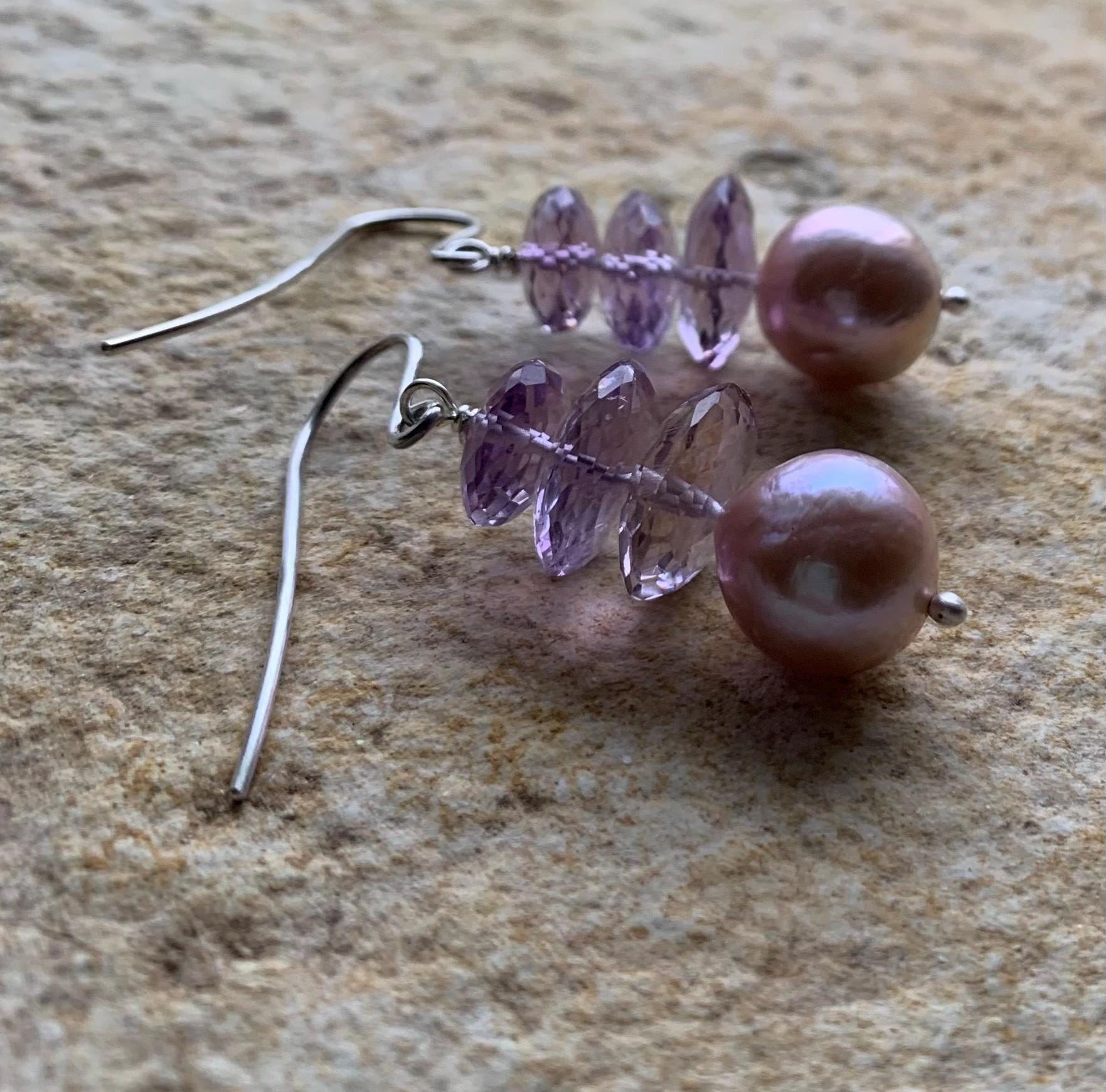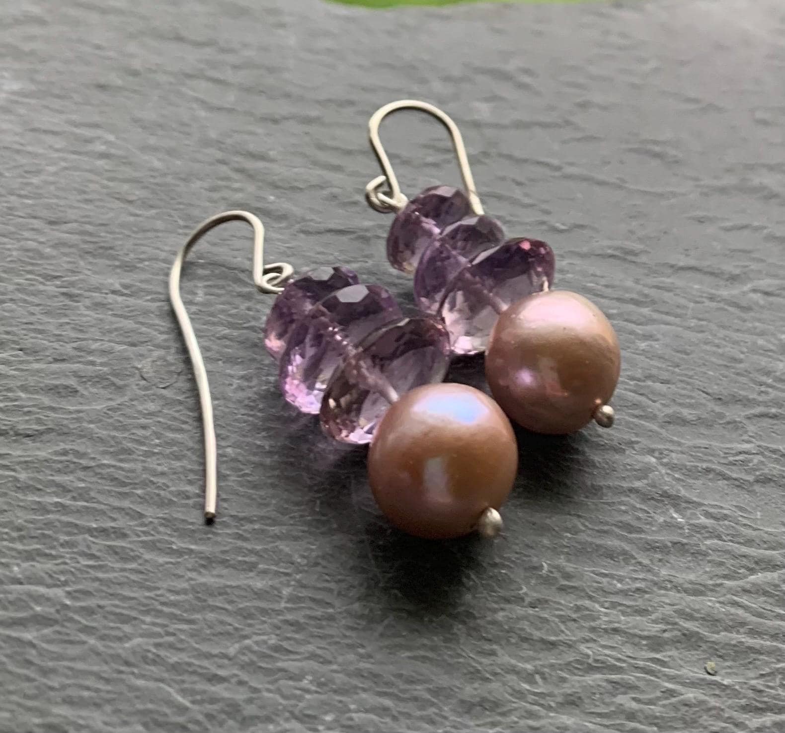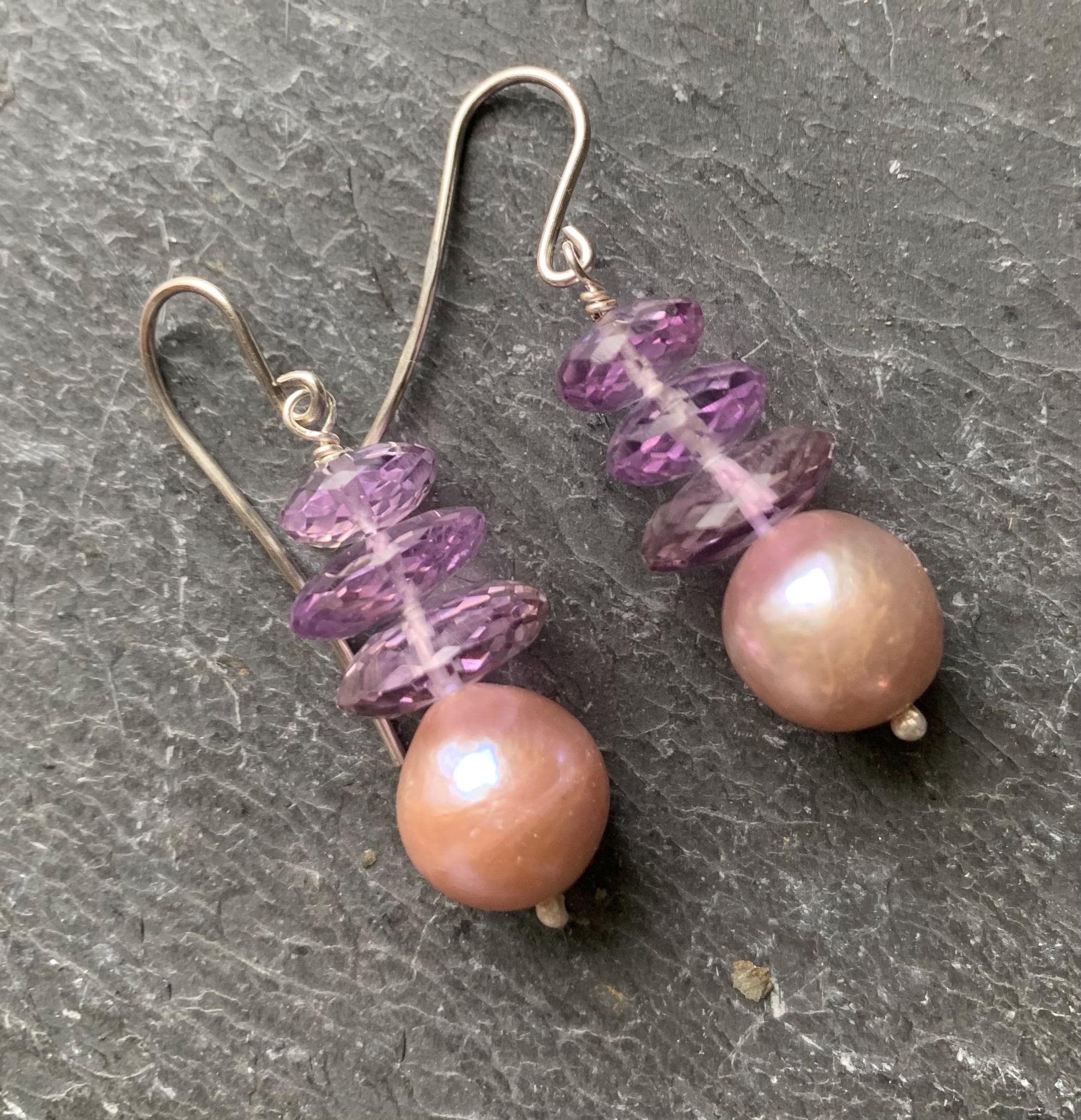 On the top of the earrings are hanging 2 x 3 amethysts and under these 2 rose/peach fresh water pearls on solid silver wire.