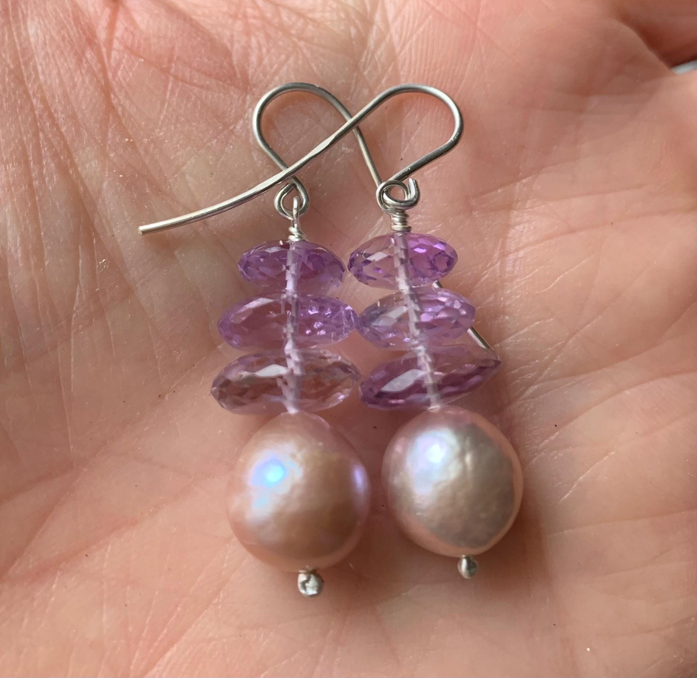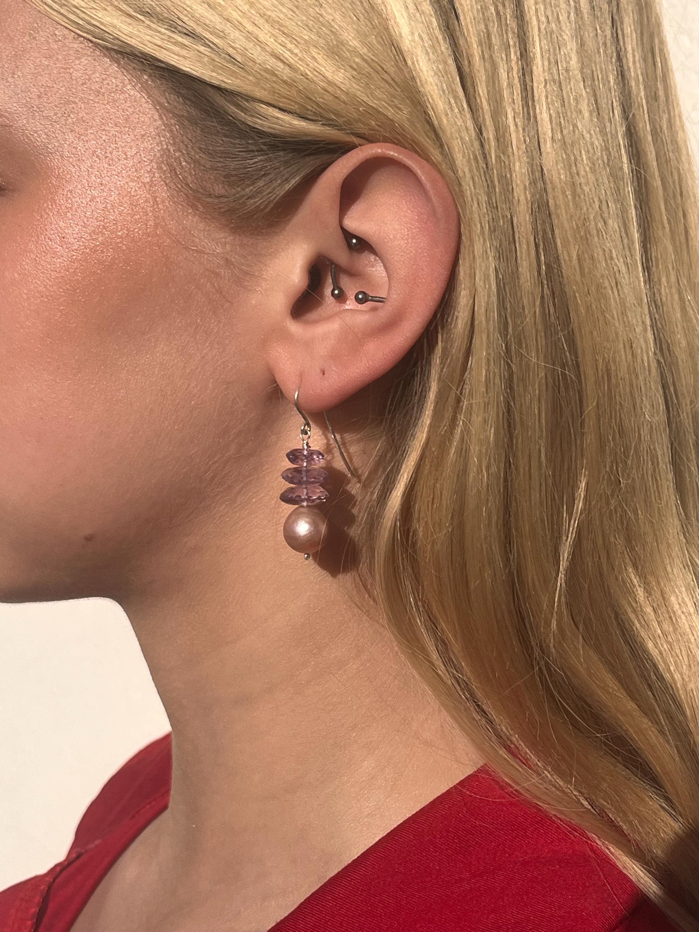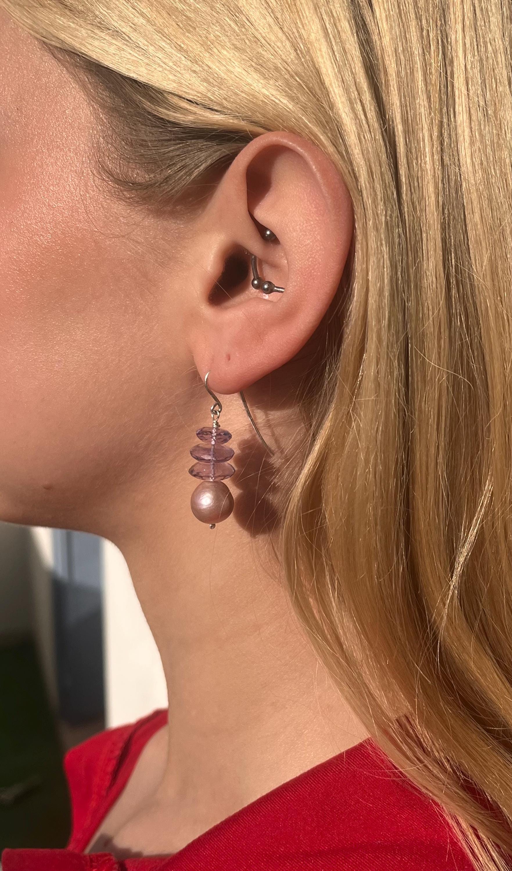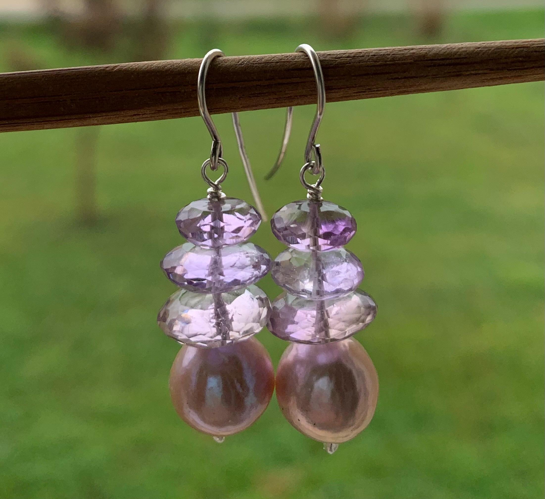 On the top of the earrings are hanging 2 x 3 amethysts and under these 2 rose/peach fresh water pearls on solid silver wire.