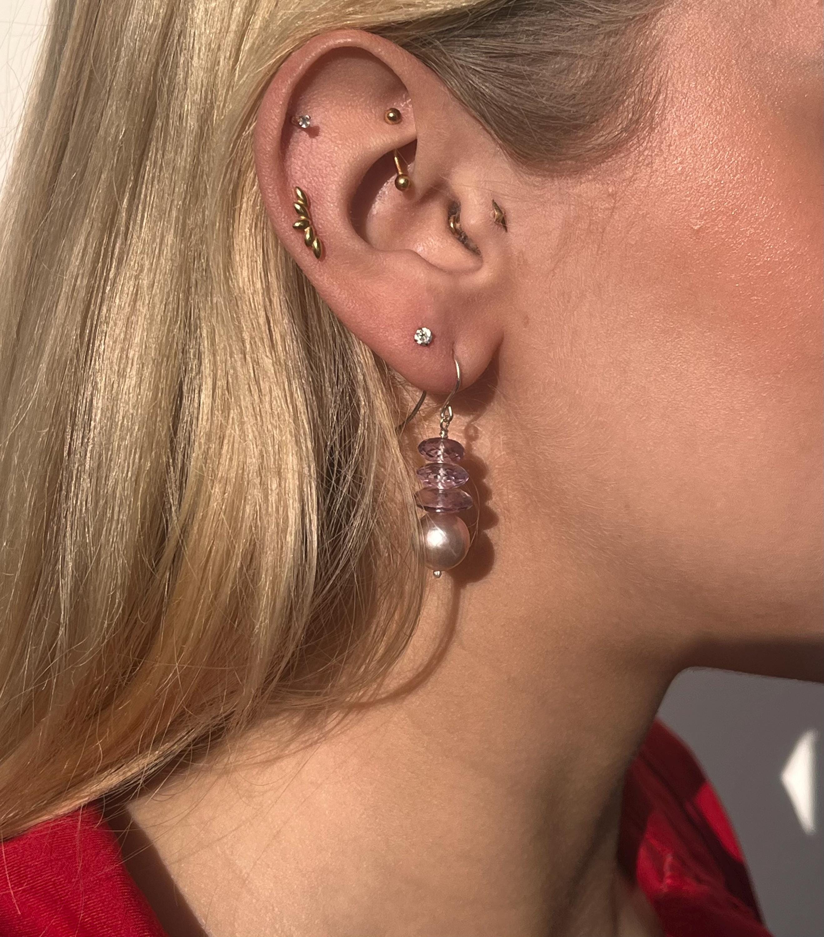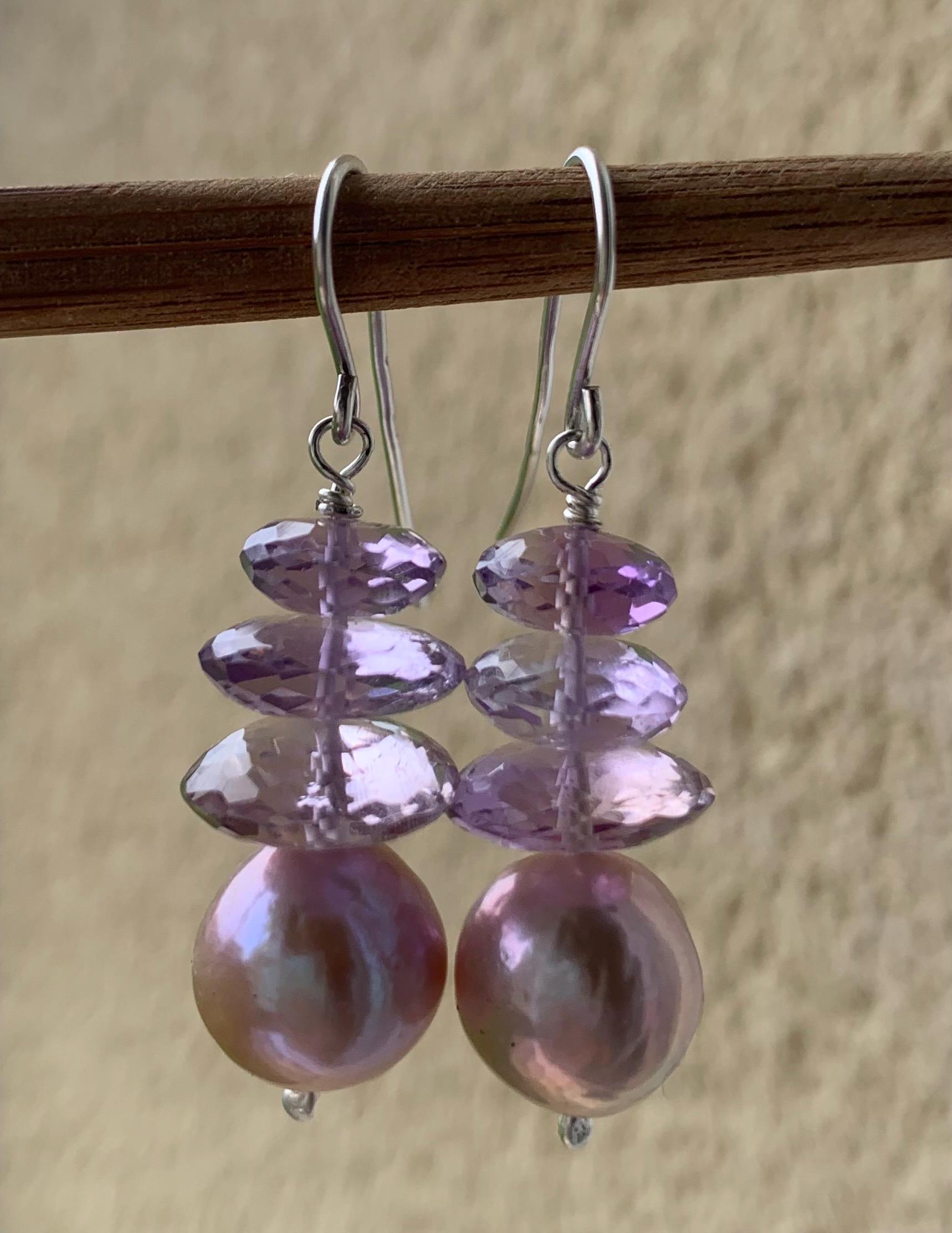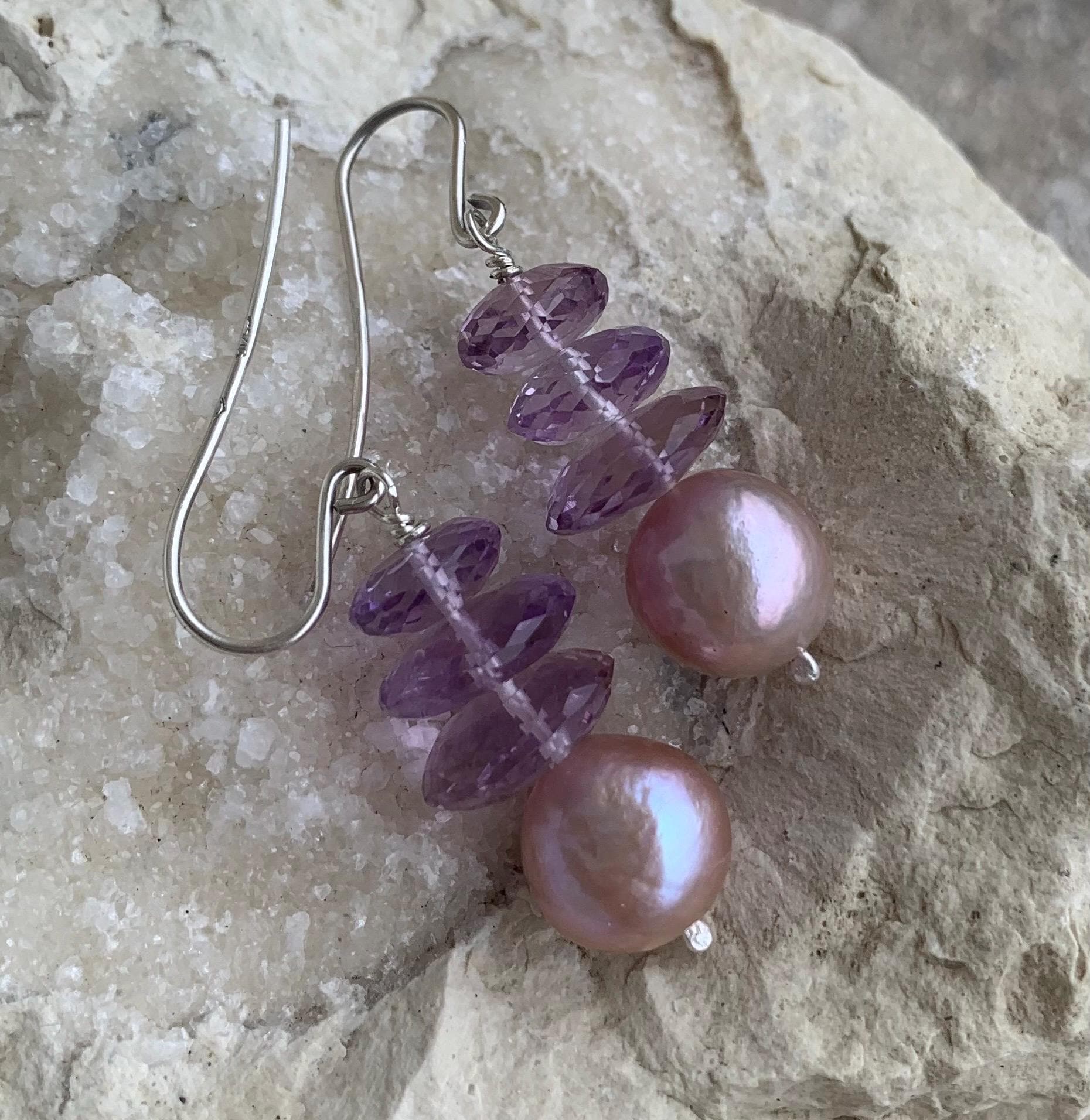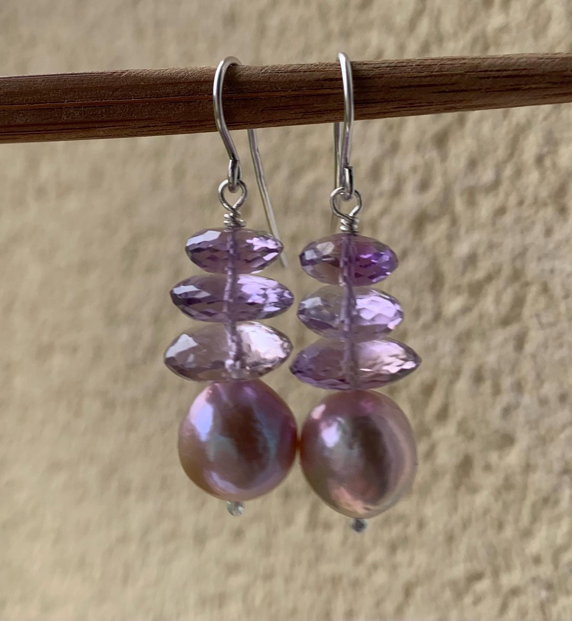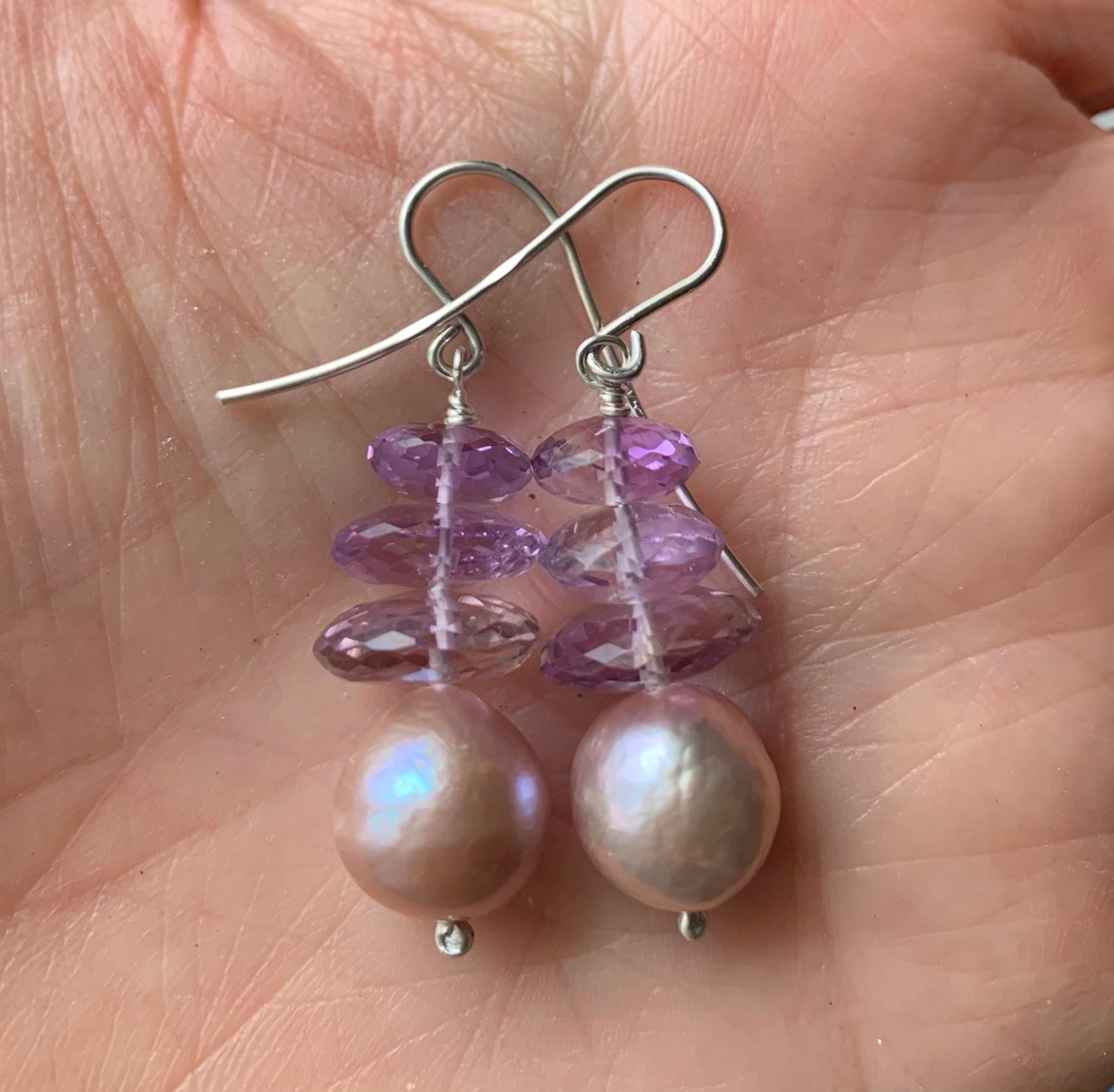 On the top of the earrings are hanging 2 x 3 amethysts and under these 2 rose/peach fresh water pearls on solid silver wire.