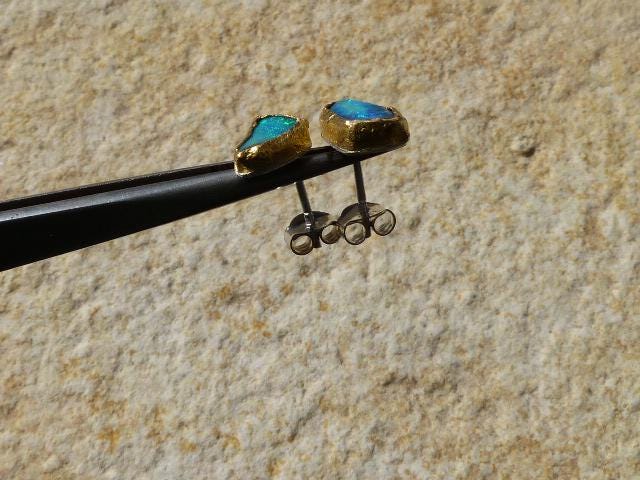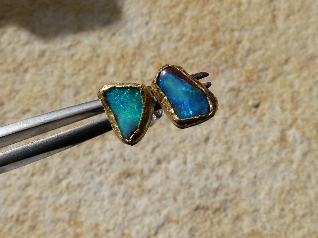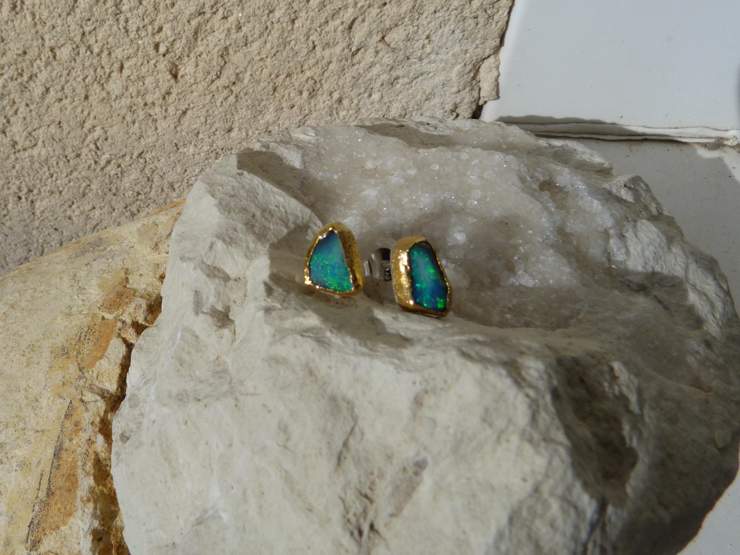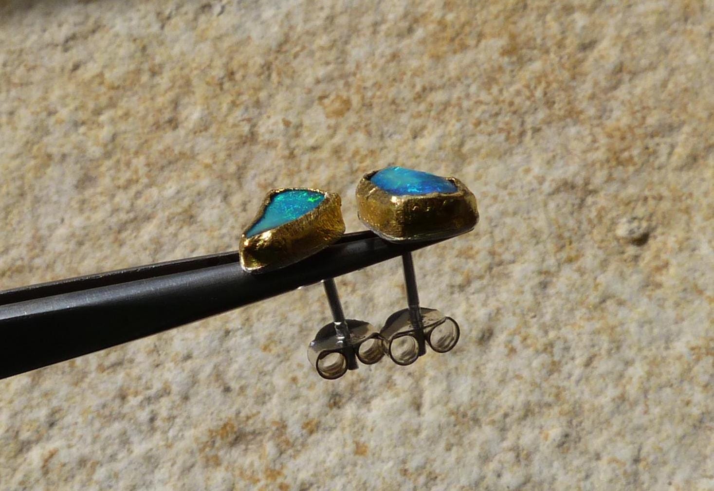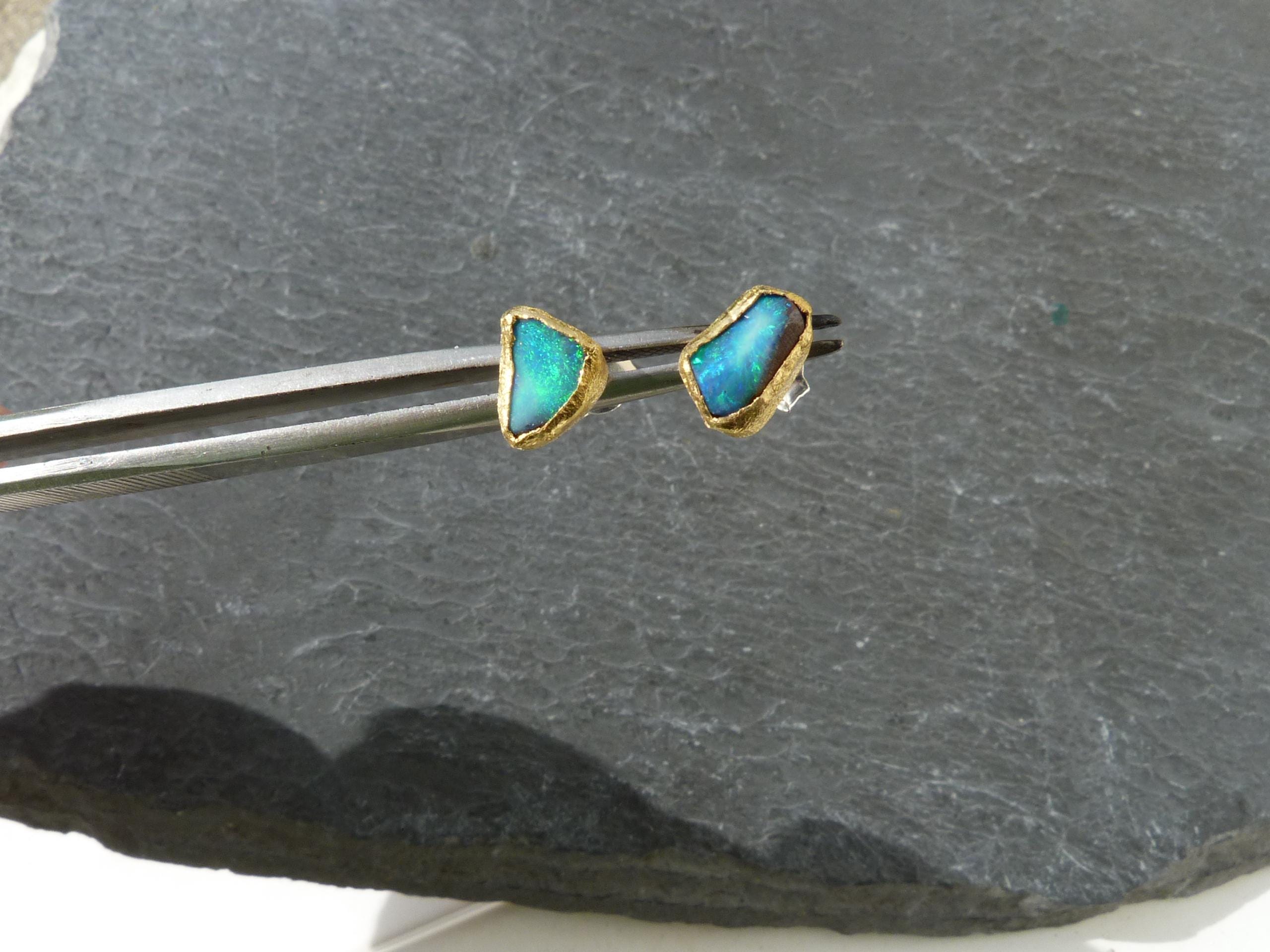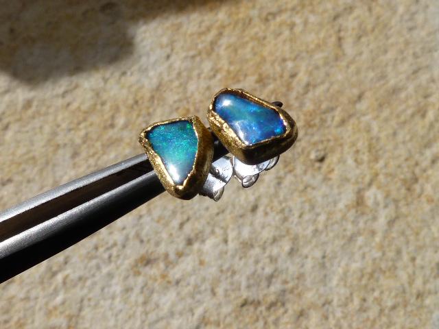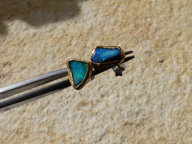 The studs are done in silver with 2 solid australian boulder opals ( 2,2 ct the both; 0,87 cm x 0,5 cm and 0,75 cm x 0,56 cm ) setted in 24 k fine gold.