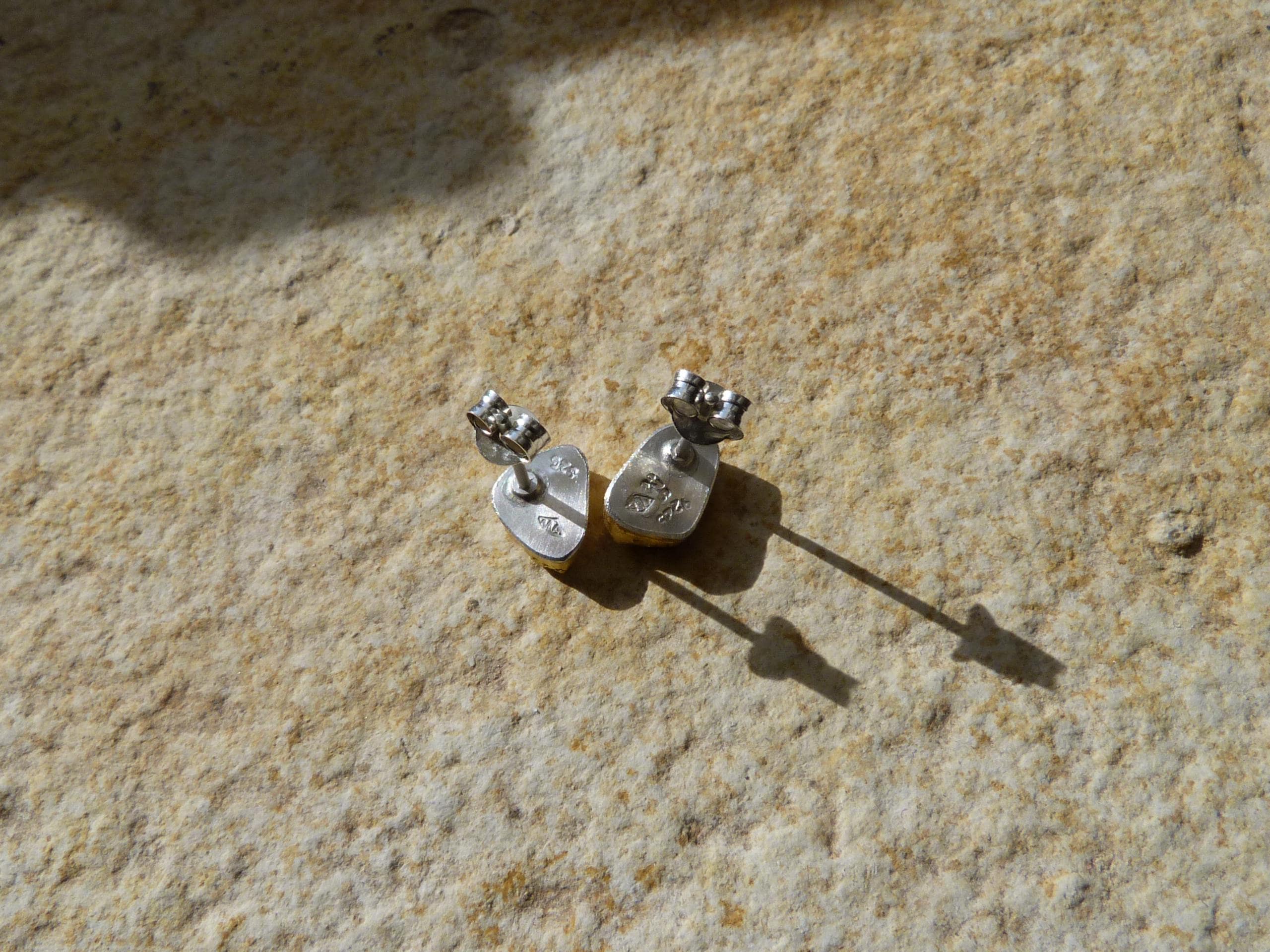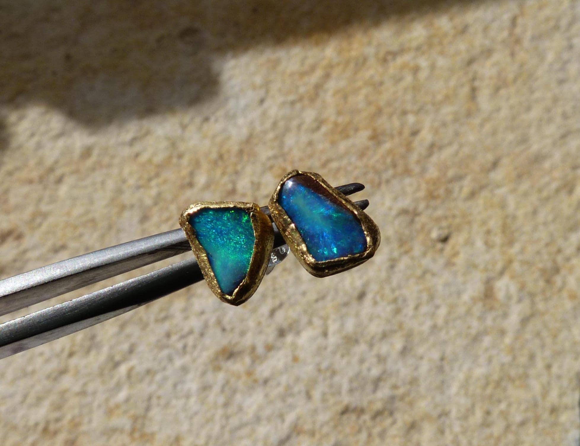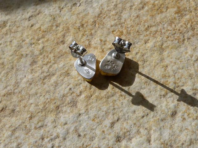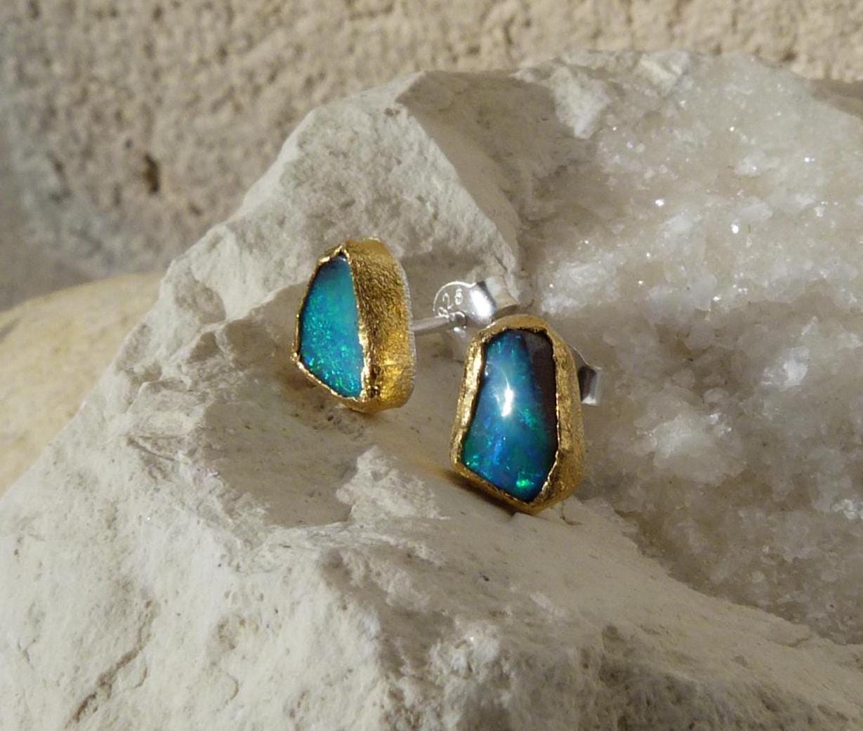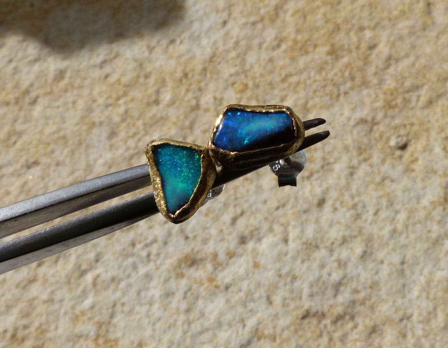 The studs are done in silver with 2 solid australian boulder opals ( 2,2 ct the both; 0,87 cm x 0,5 cm and 0,75 cm x 0,56 cm ) setted in 24 k fine gold.