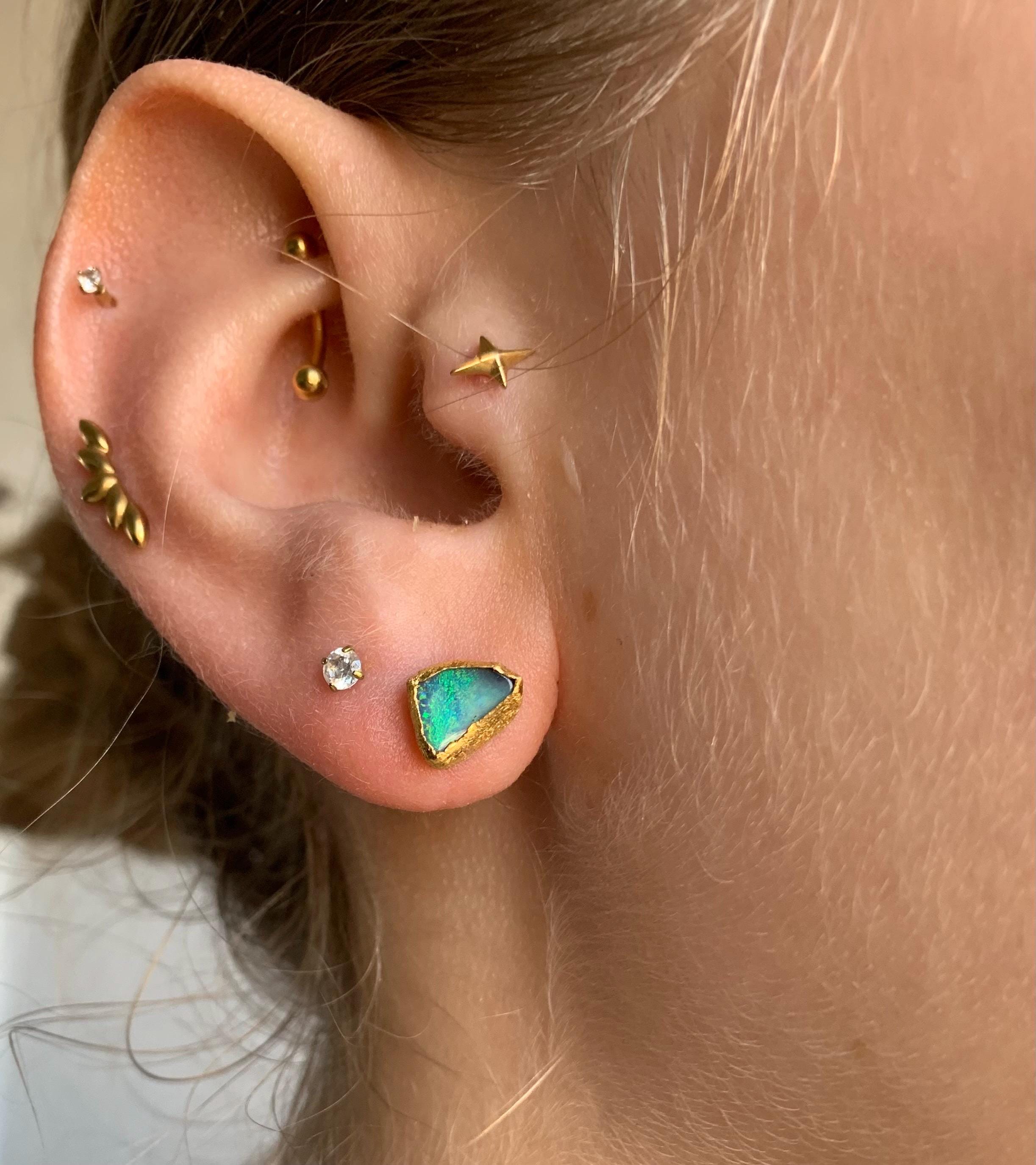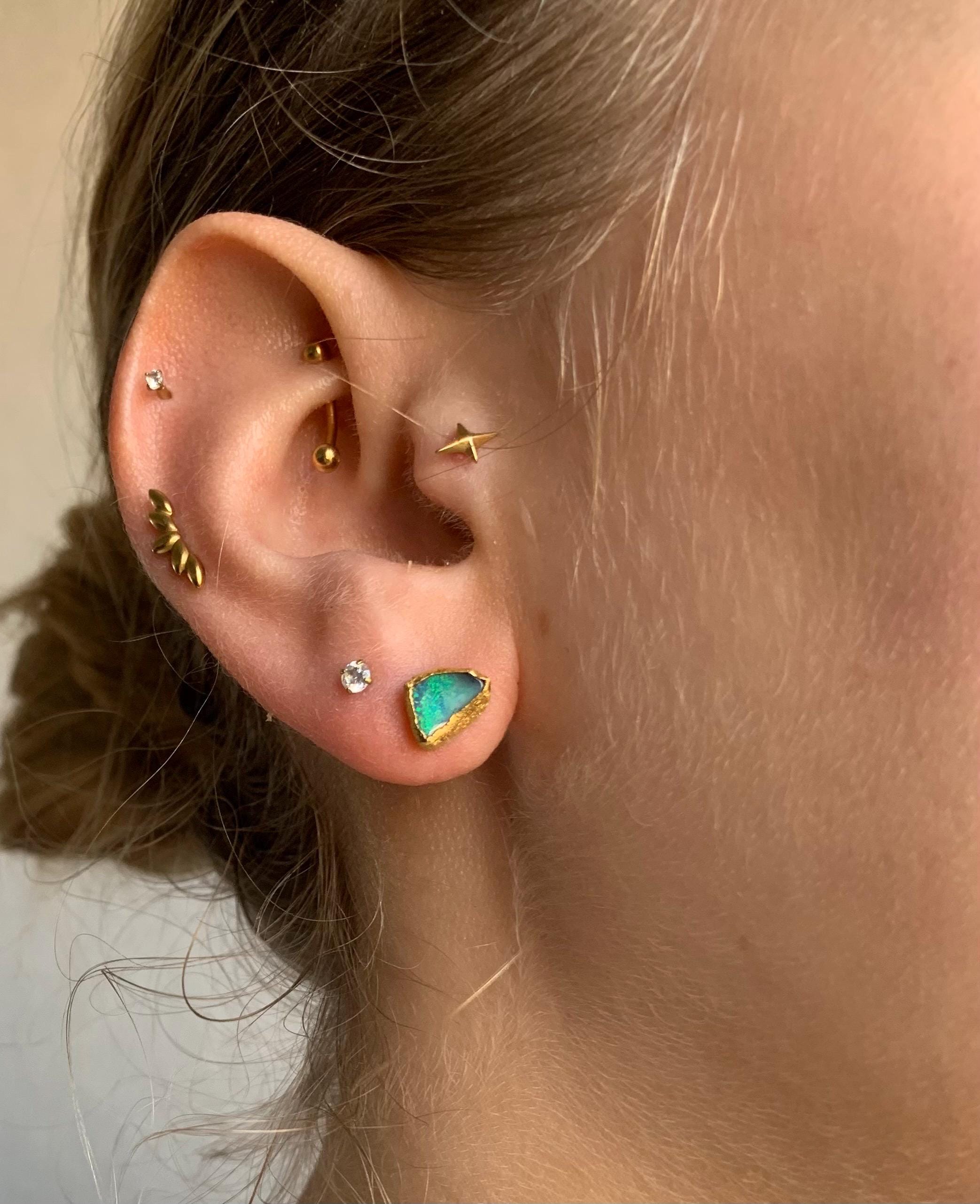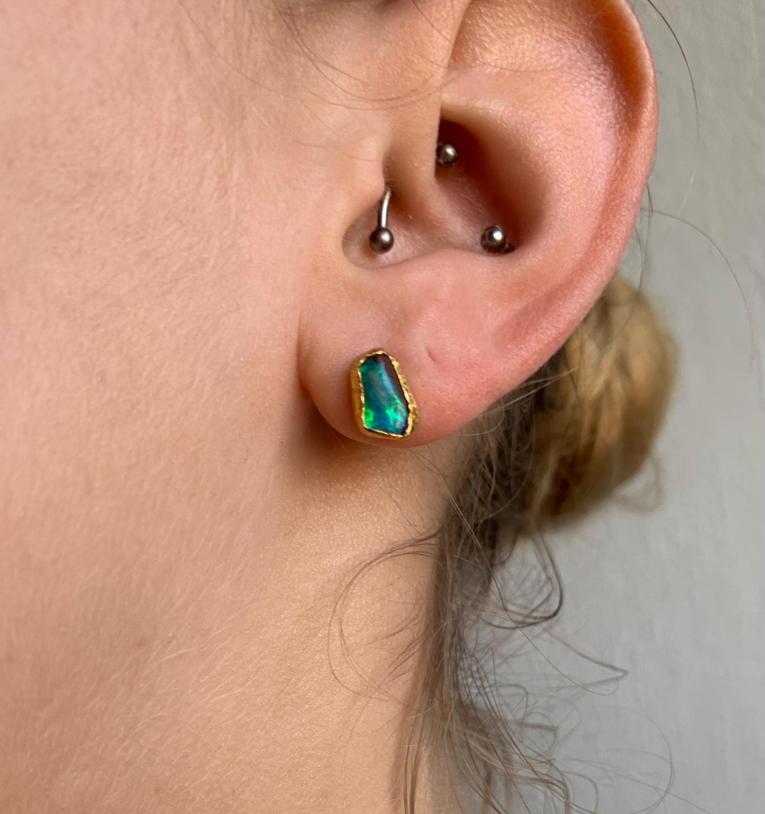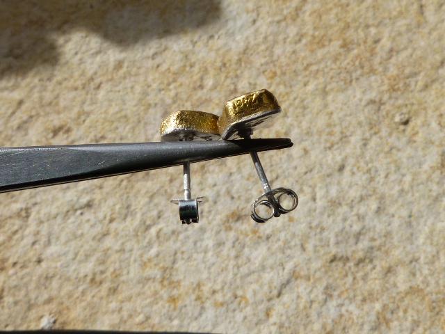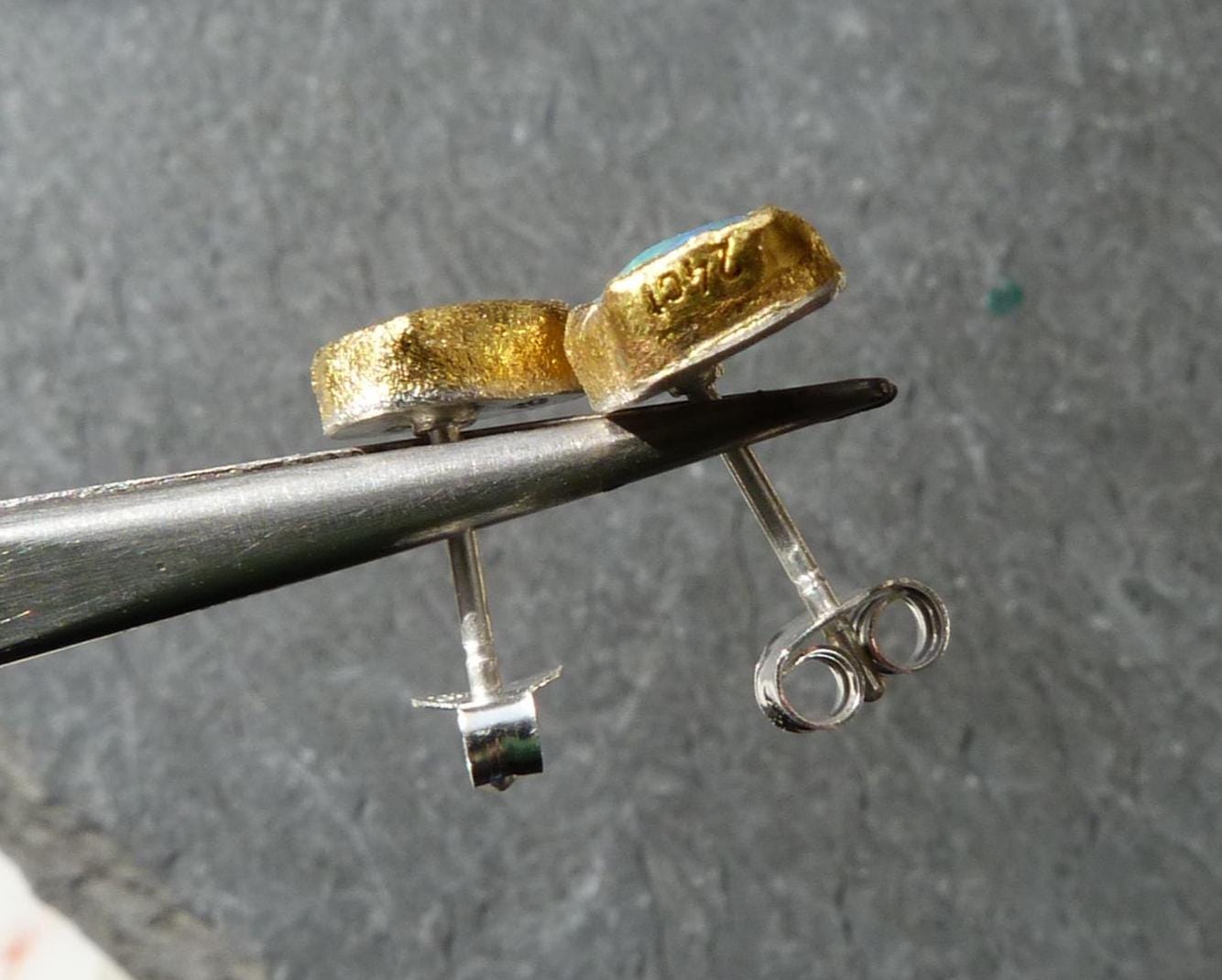 The studs are done in silver with 2 solid australian boulder opals ( 2,2 ct the both; 0,87 cm x 0,5 cm and 0,75 cm x 0,56 cm ) setted in 24 k fine gold.