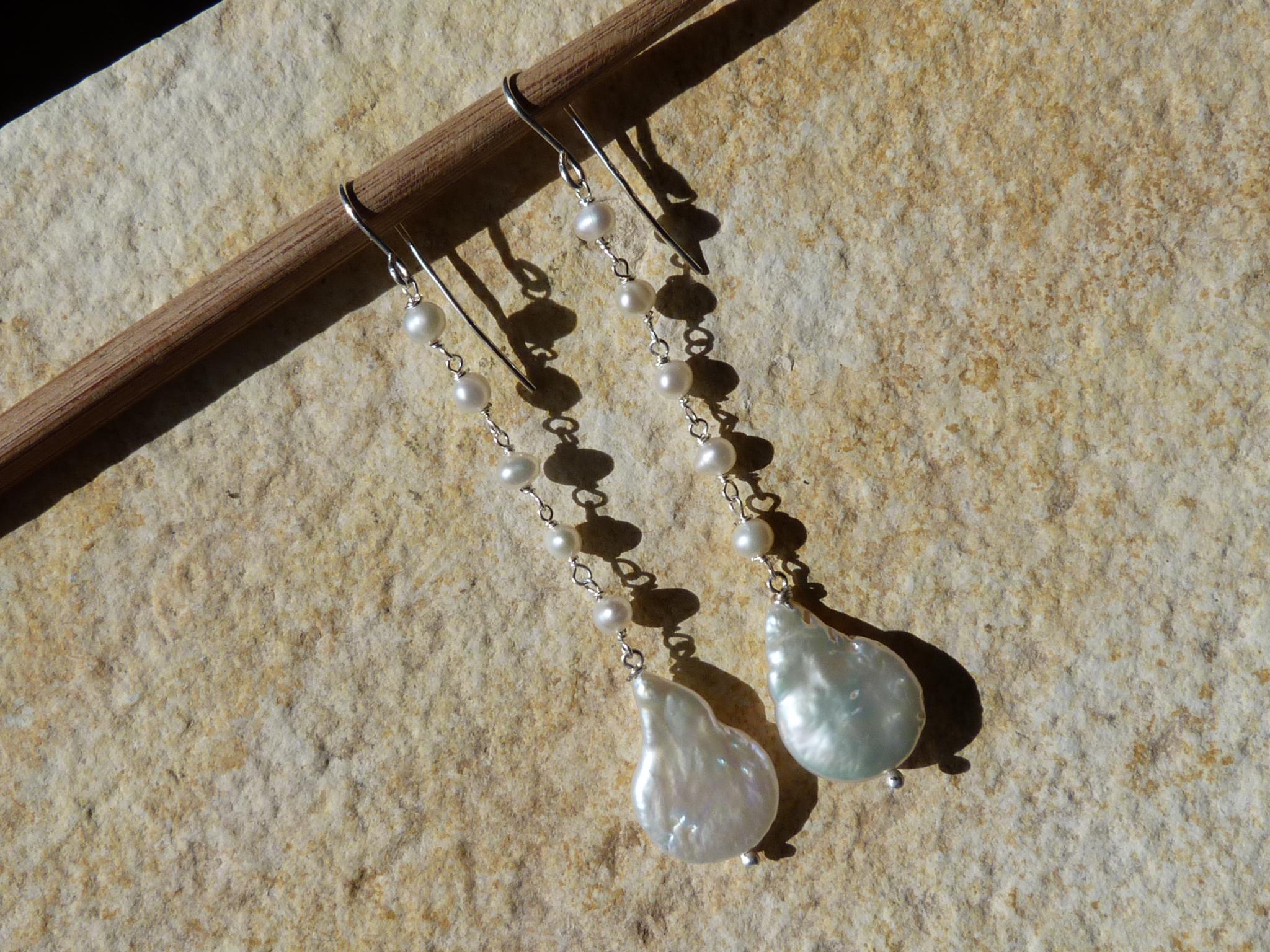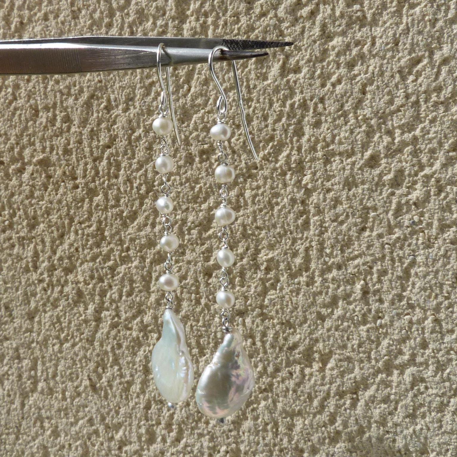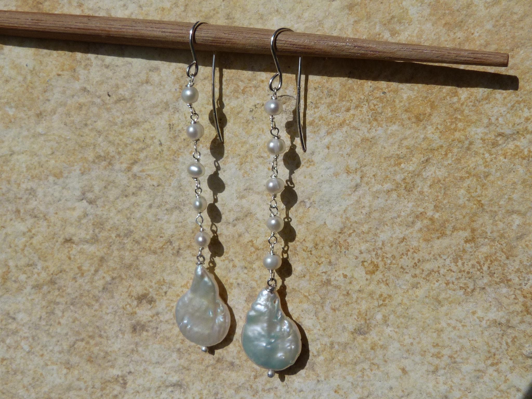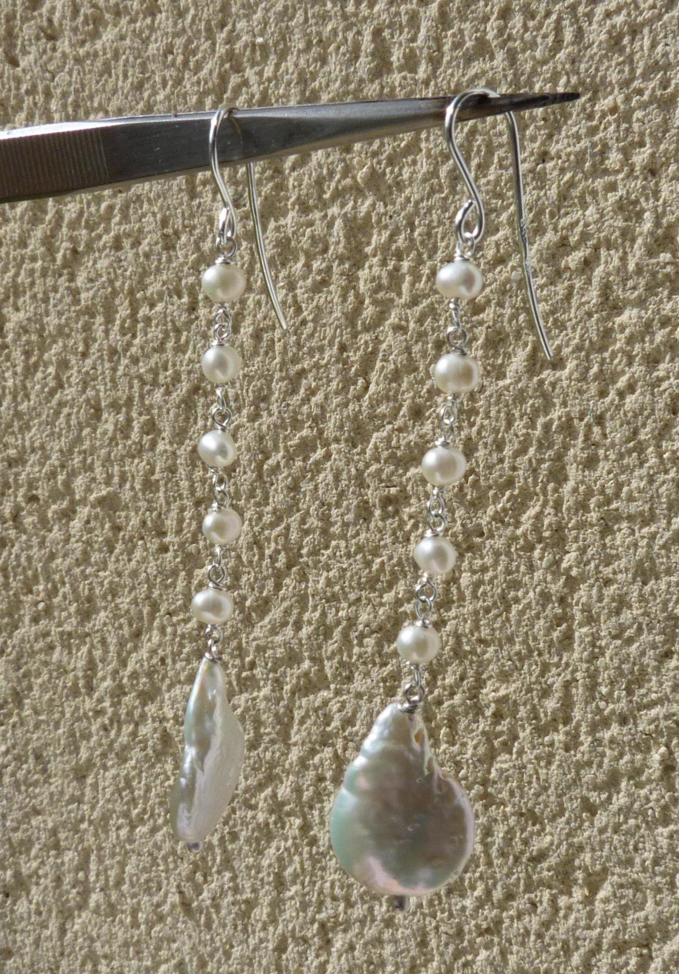 The earrings are done with 2 x 5 freshwater pearls ( 4 mm ) and 2 keishi pearls hanging on silver wire.