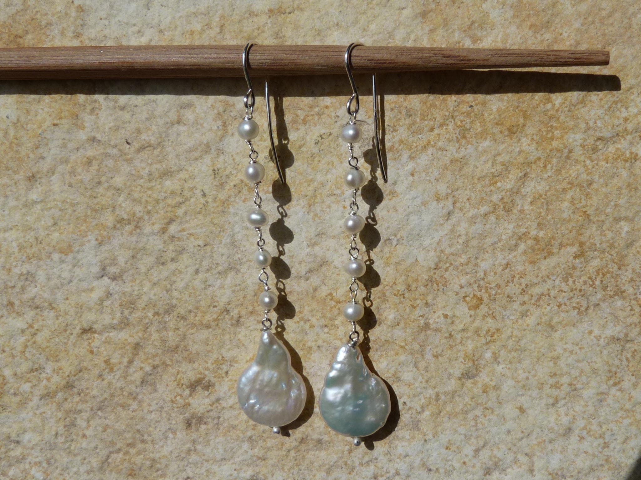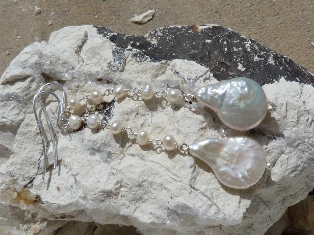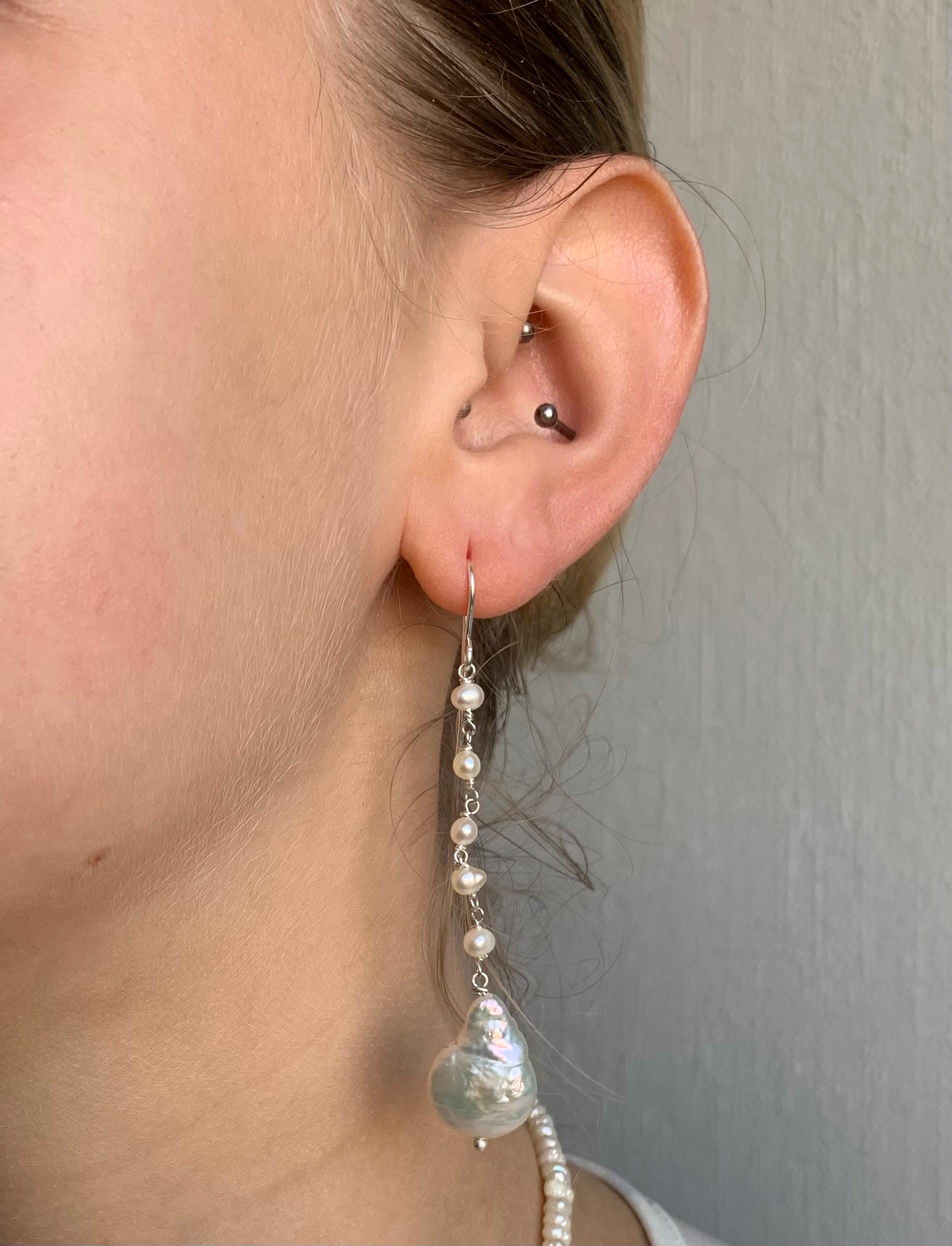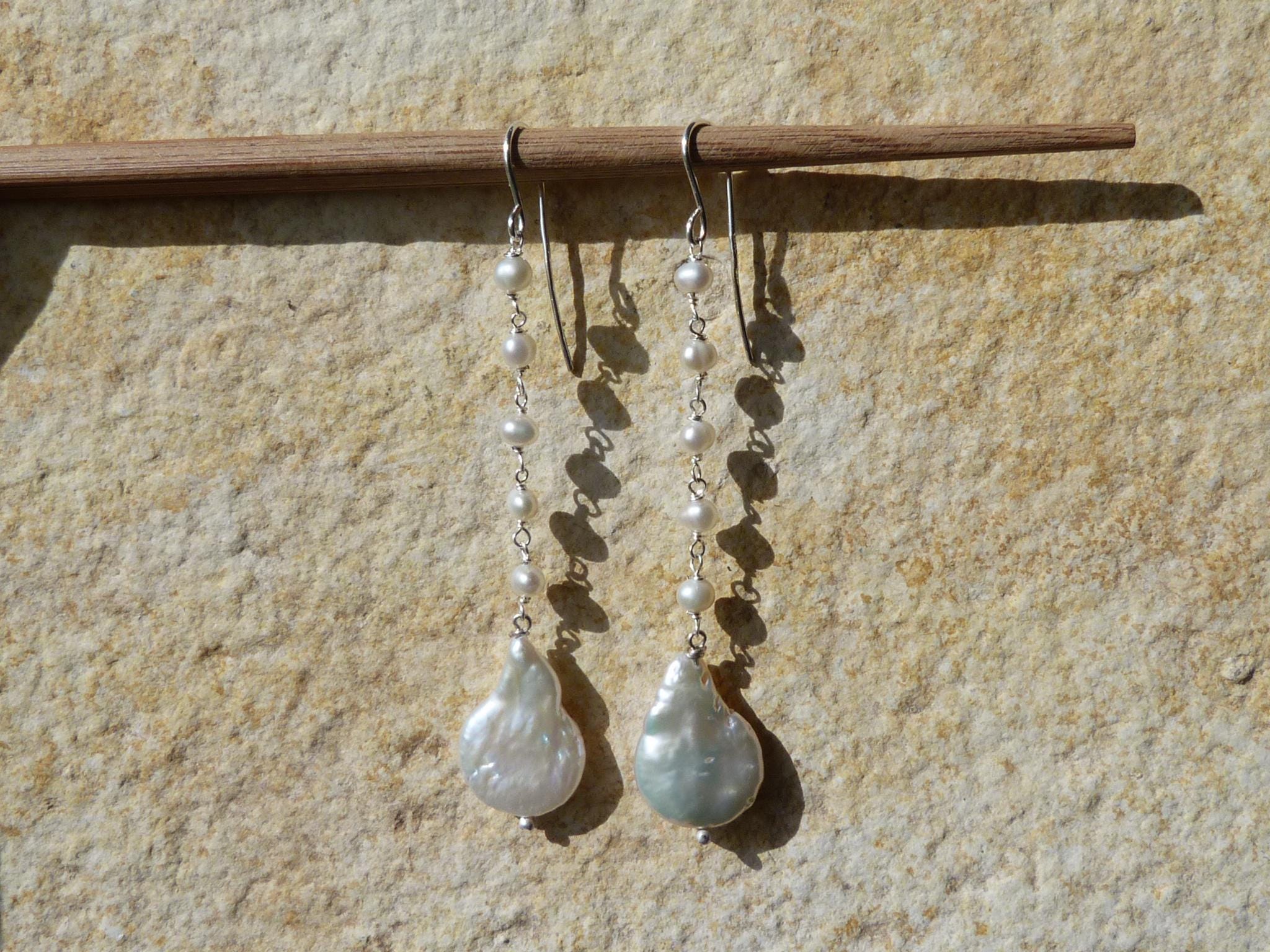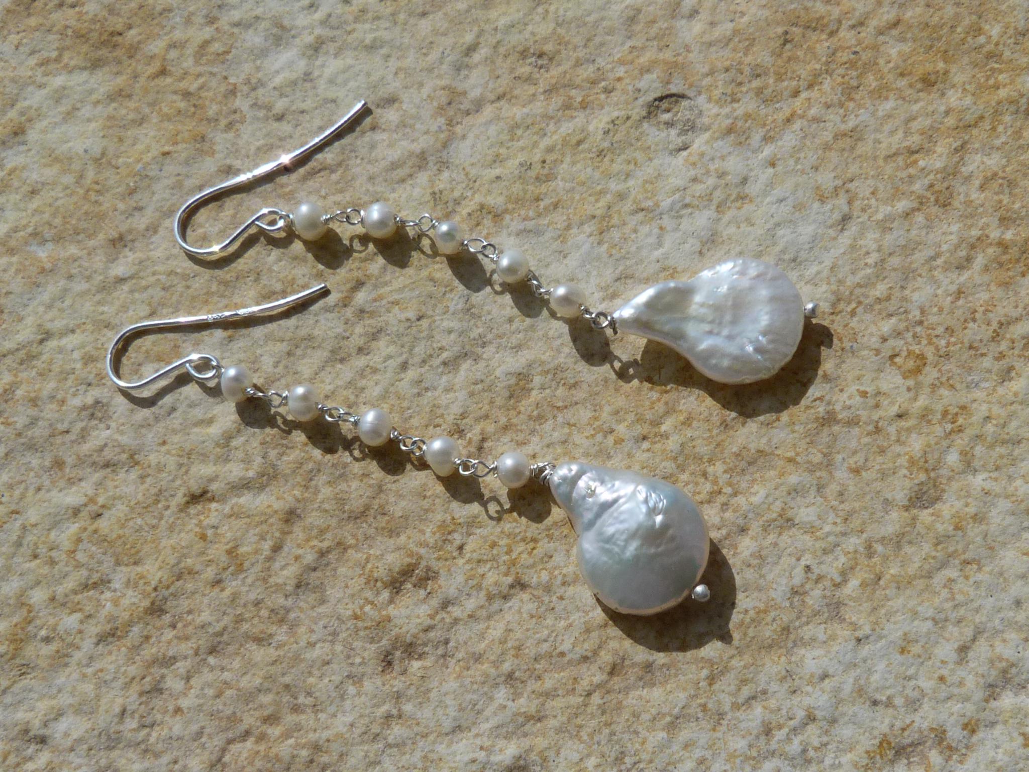 The earrings are done with 2 x 5 freshwater pearls ( 4 mm ) and 2 keishi pearls hanging on silver wire.