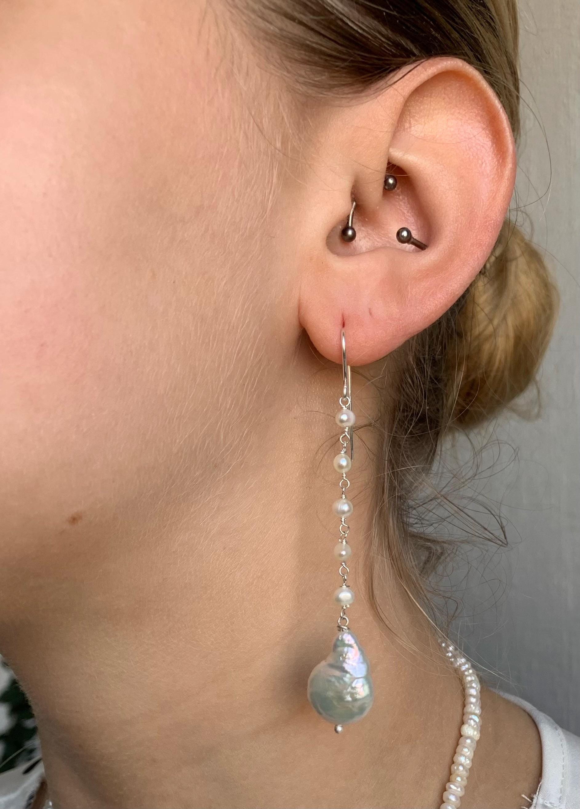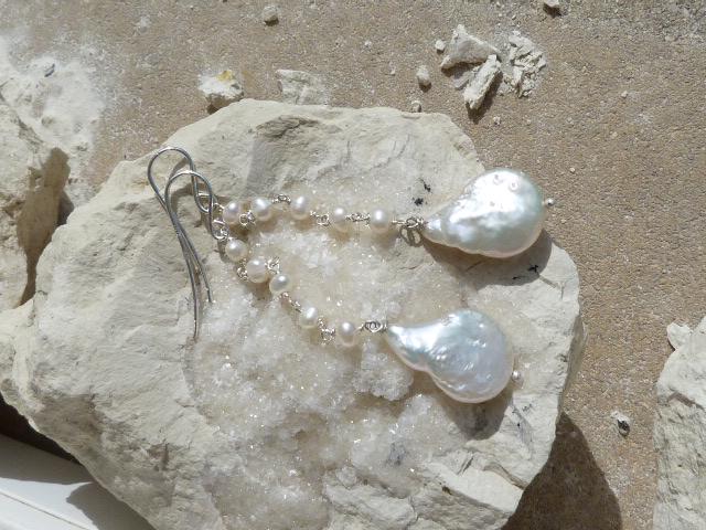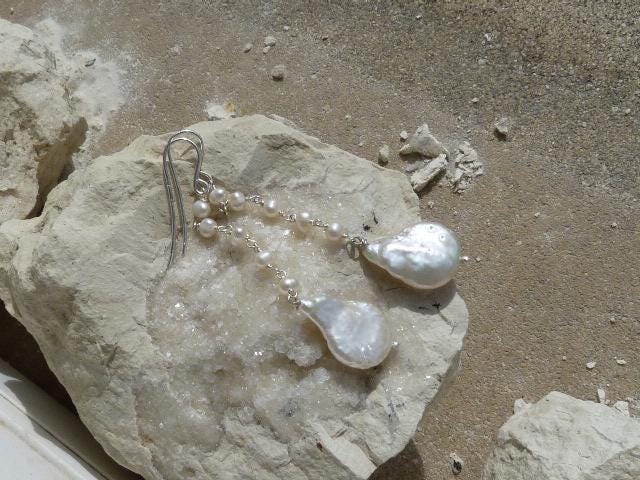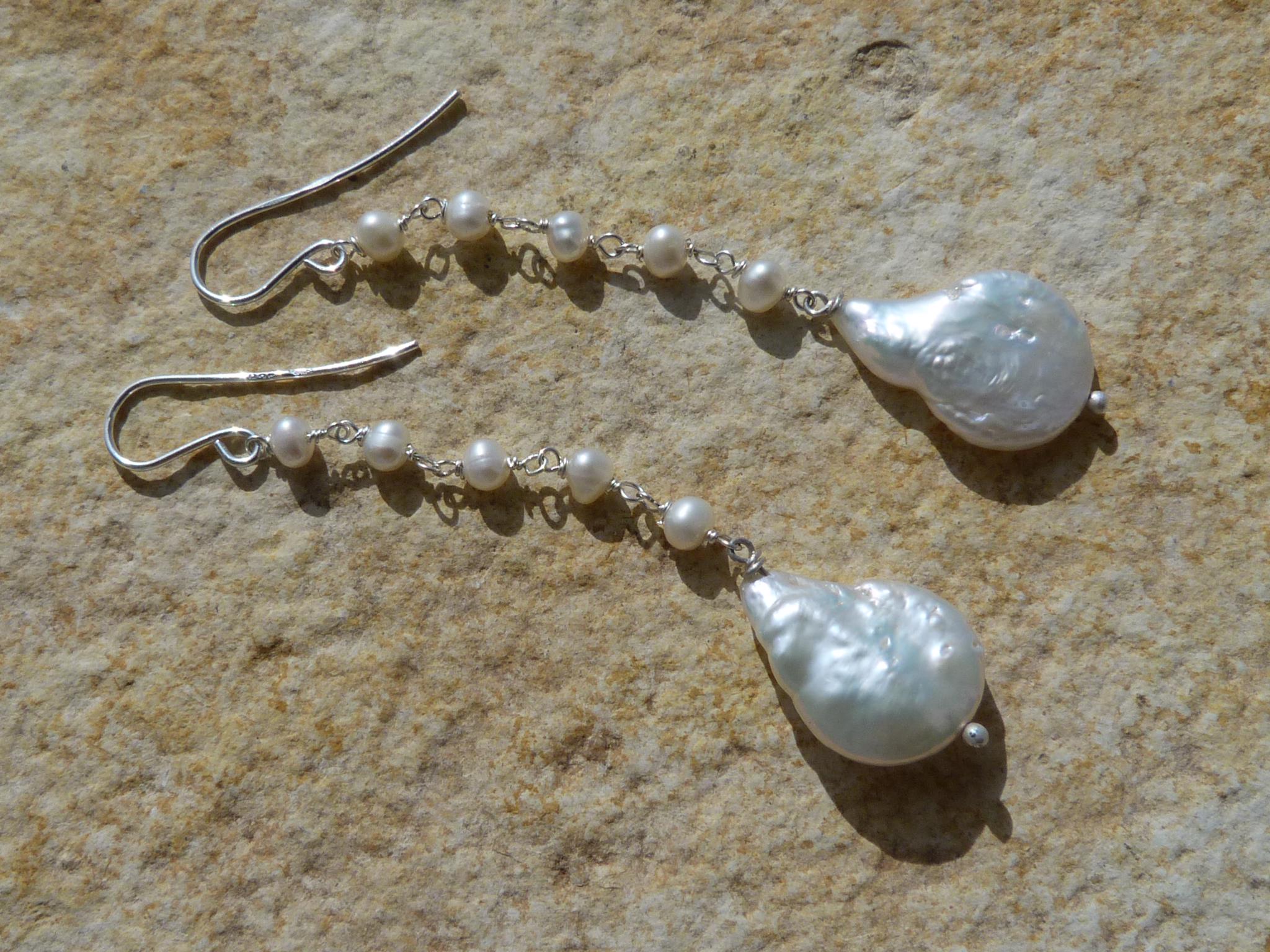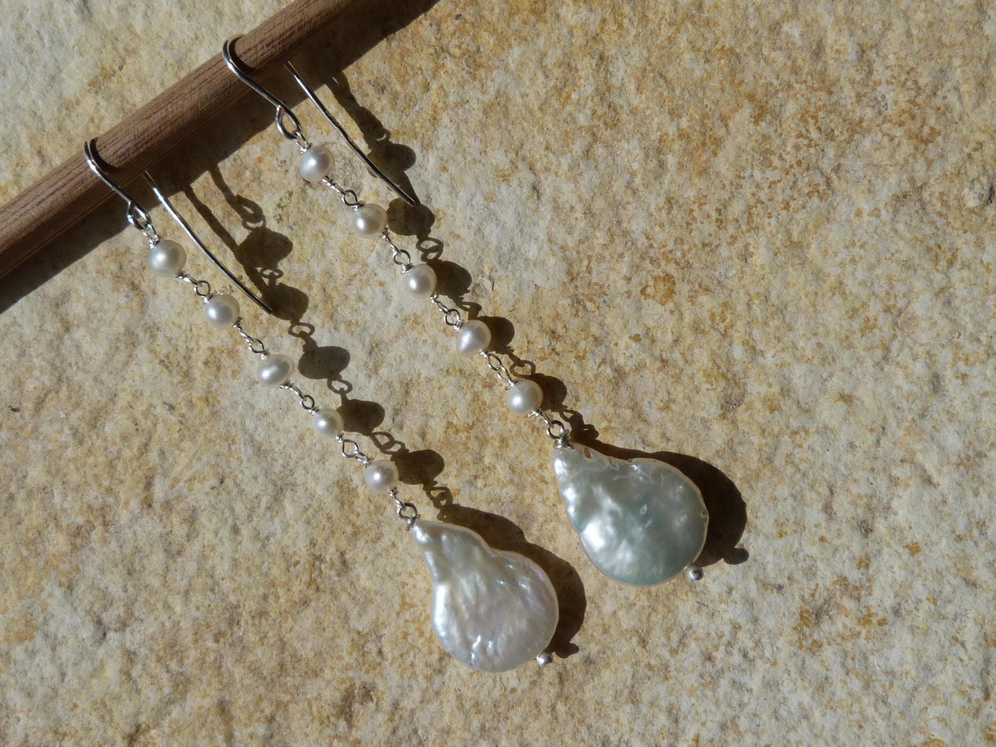 The earrings are done with 2 x 5 freshwater pearls ( 4 mm ) and 2 keishi pearls hanging on silver wire.