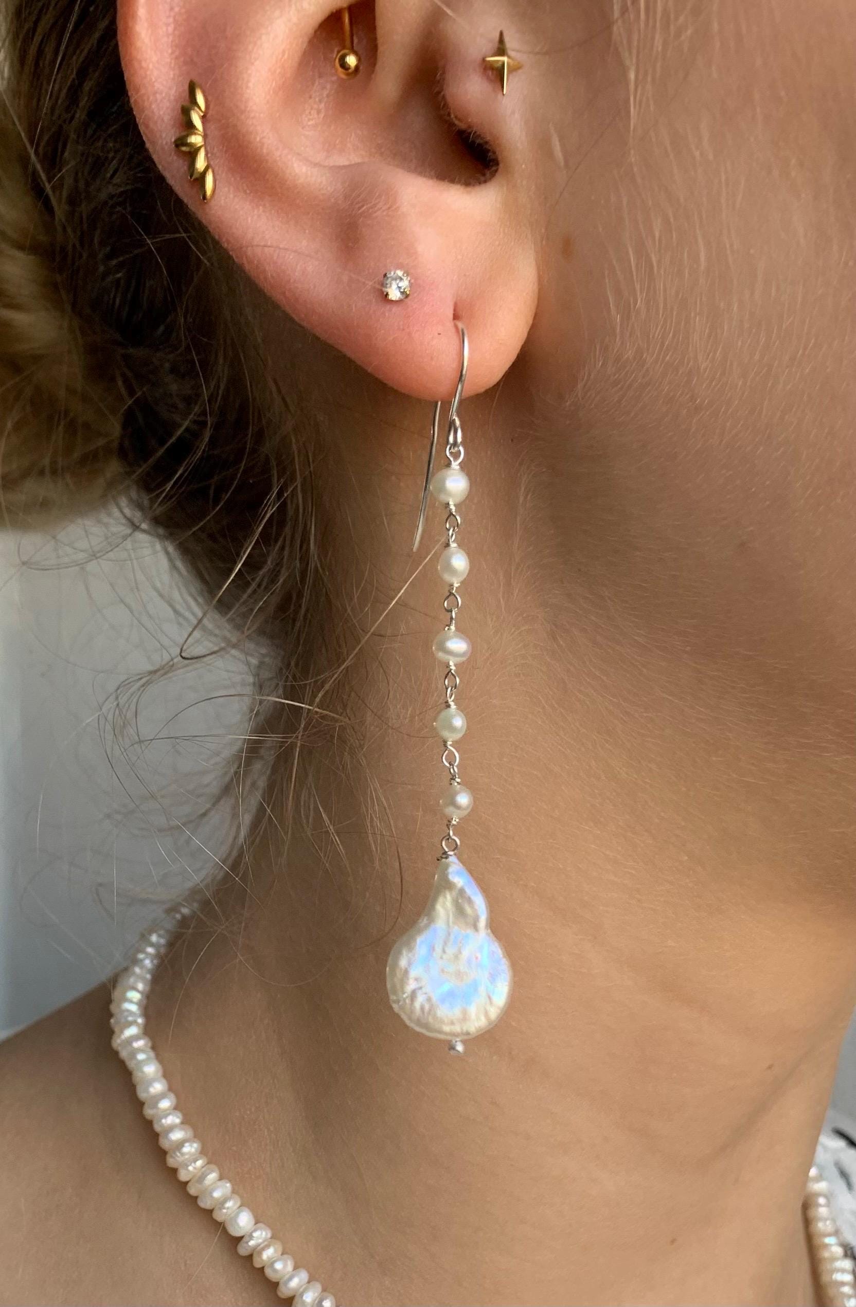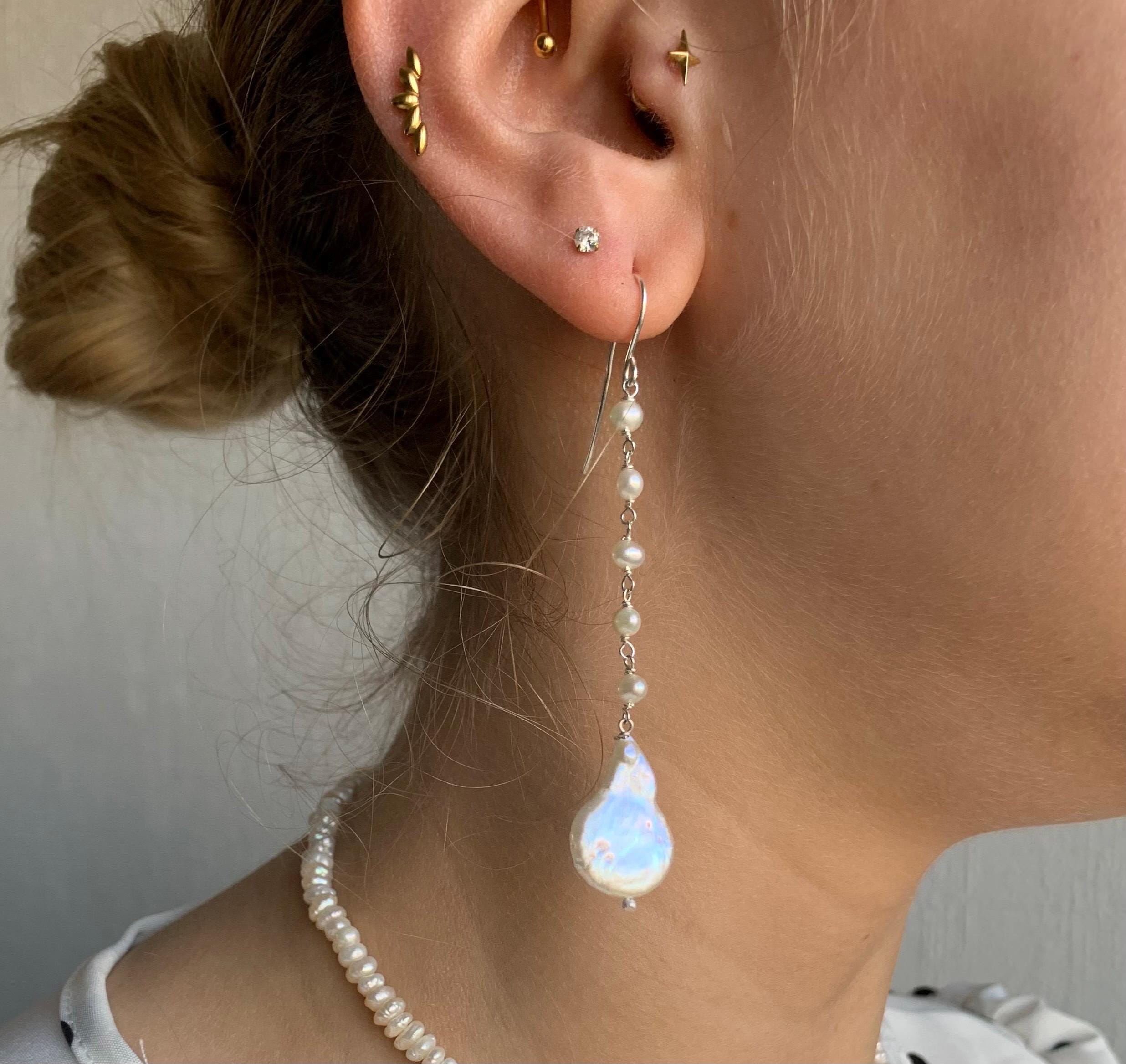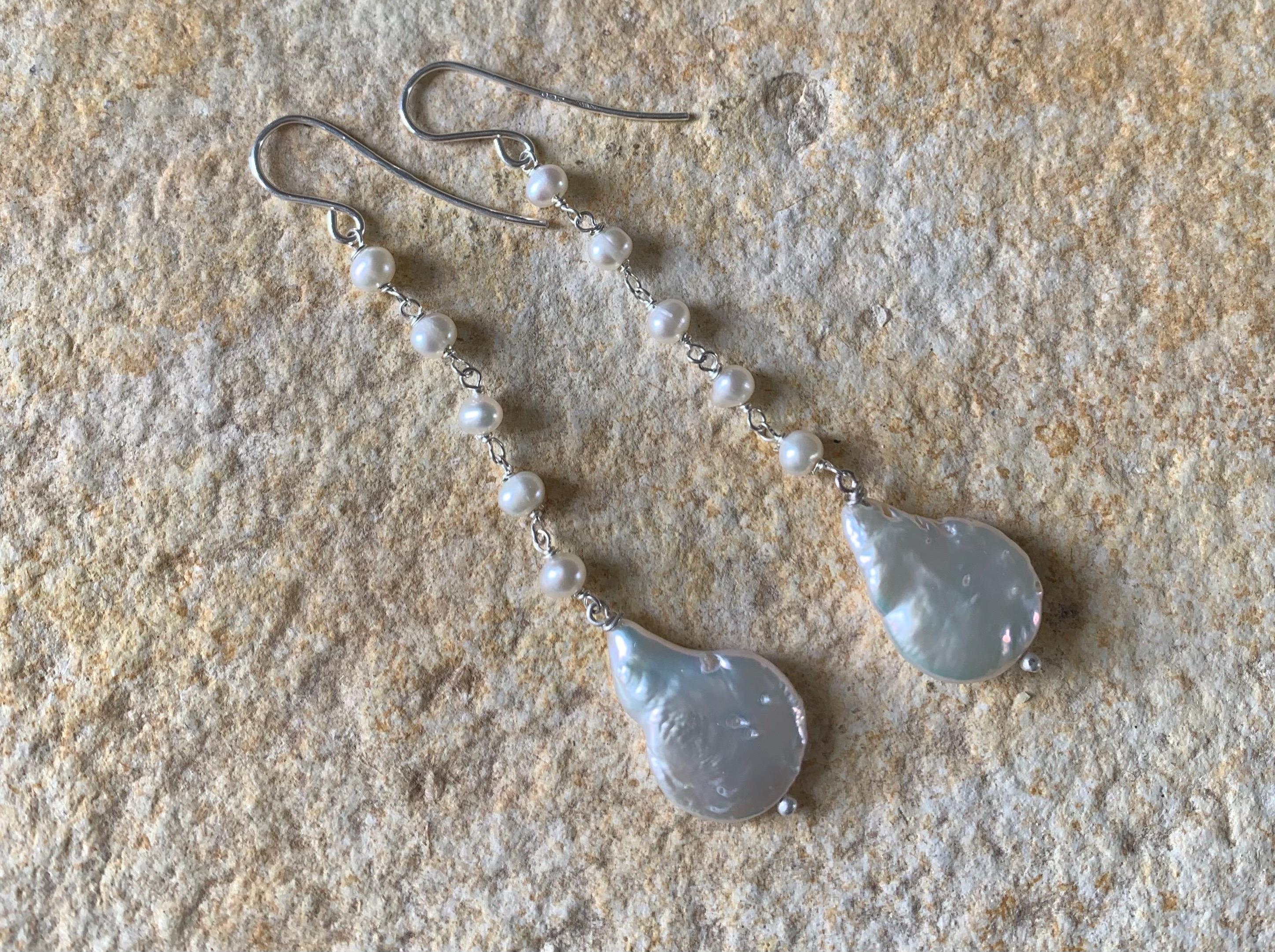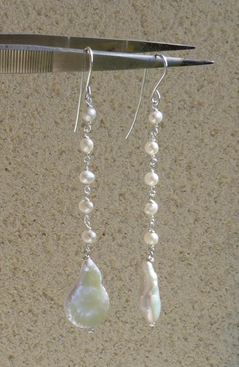 The earrings are done with 2 x 5 freshwater pearls ( 4 mm ) and 2 keishi pearls hanging on silver wire.