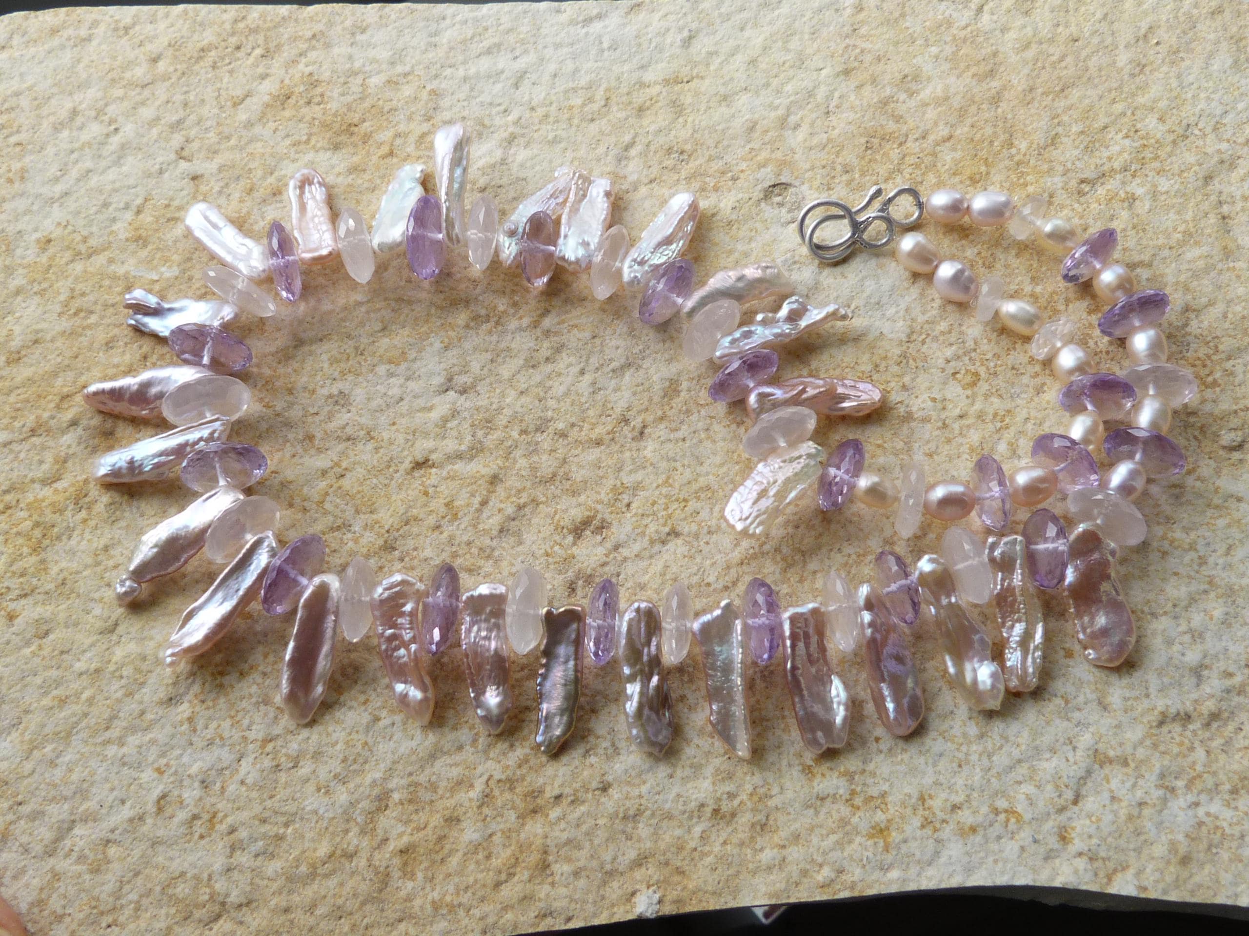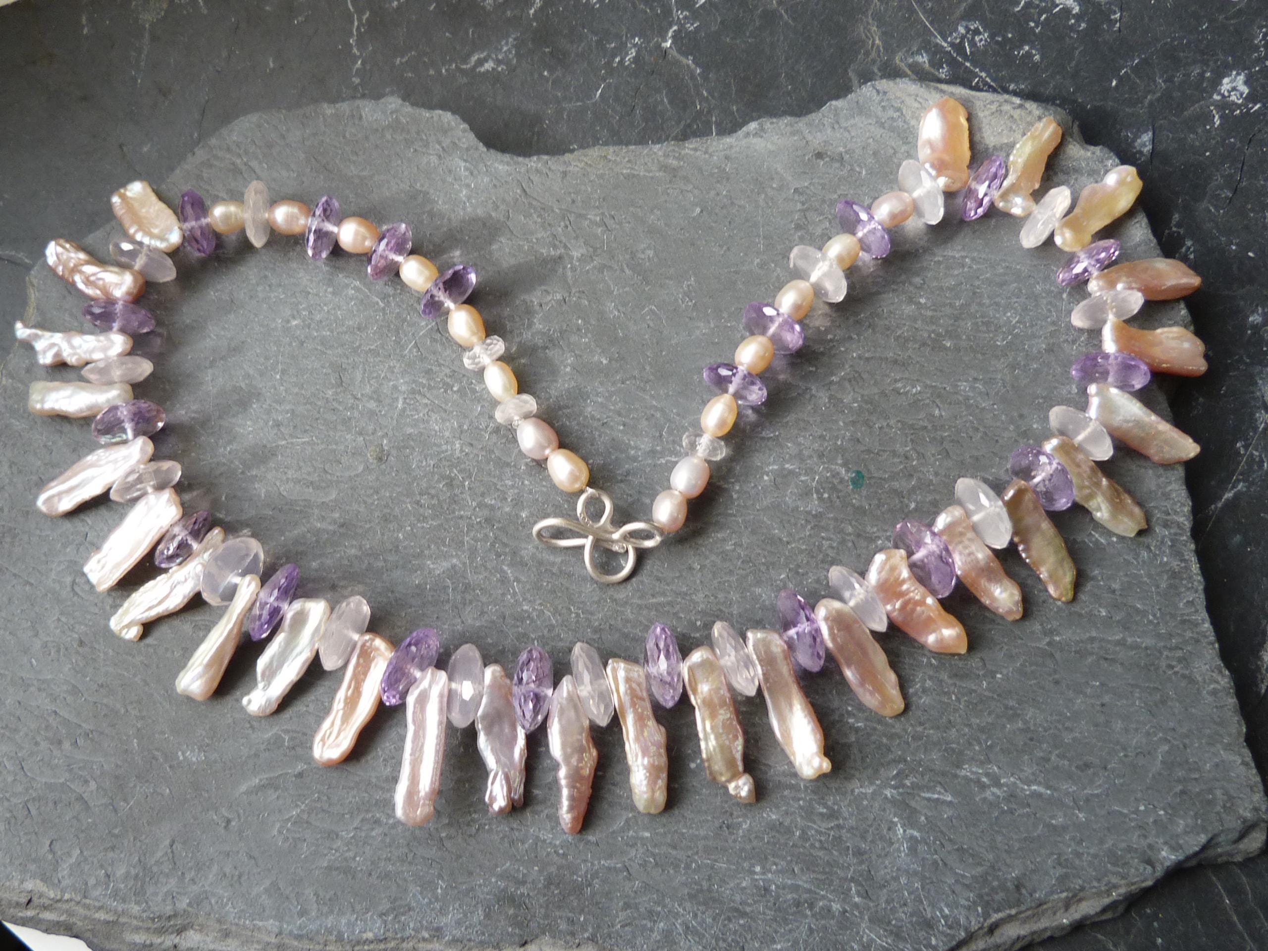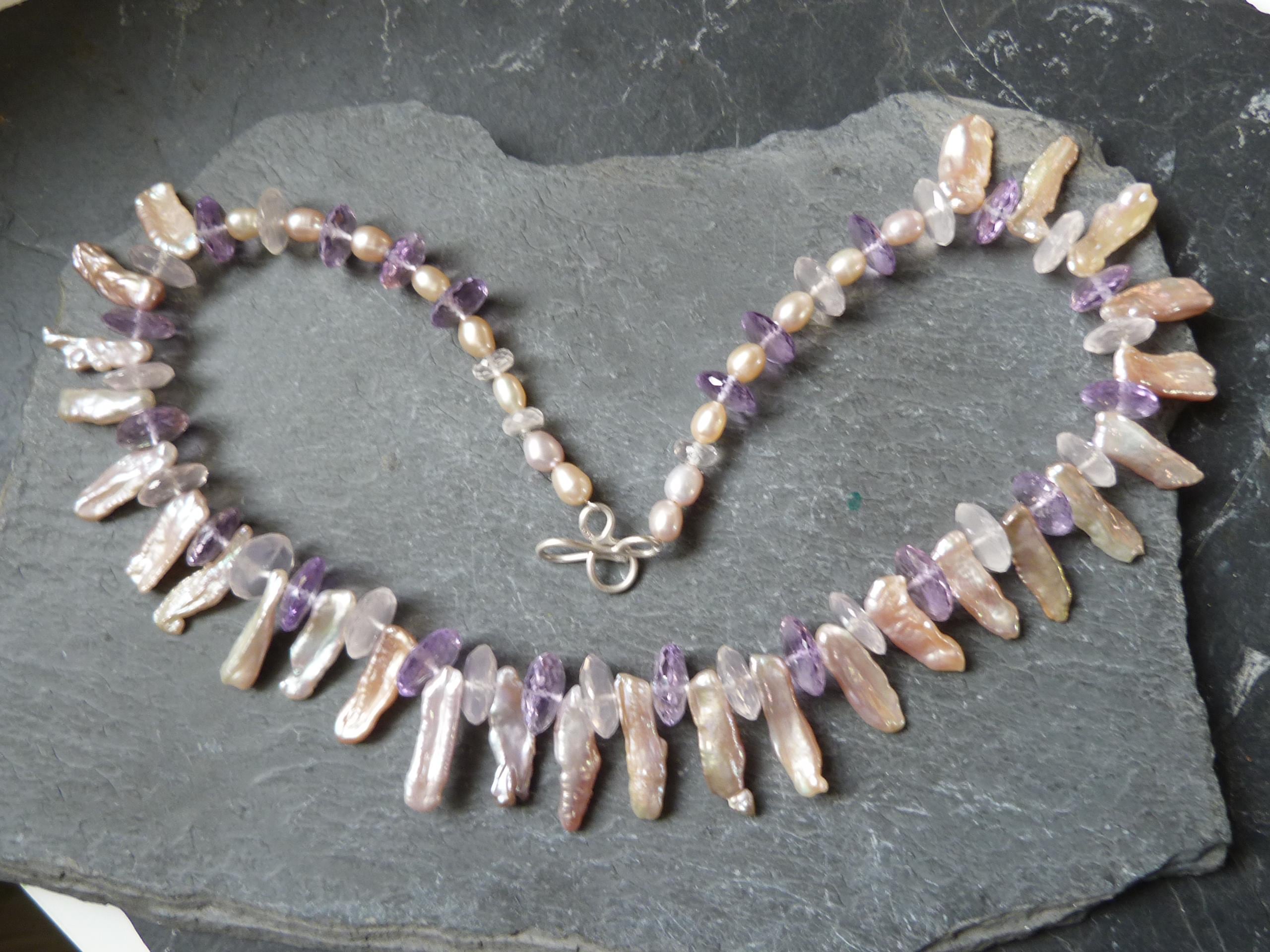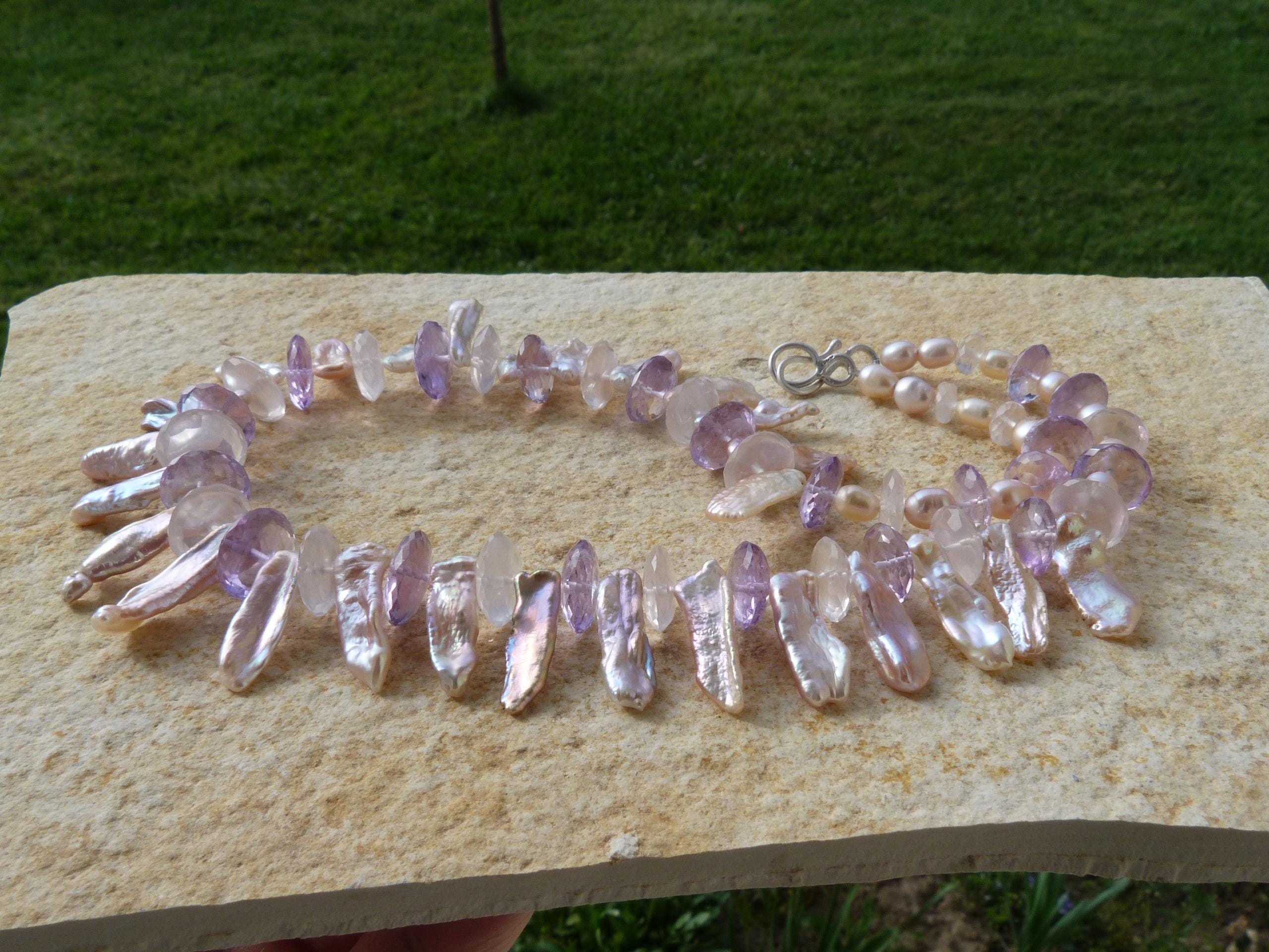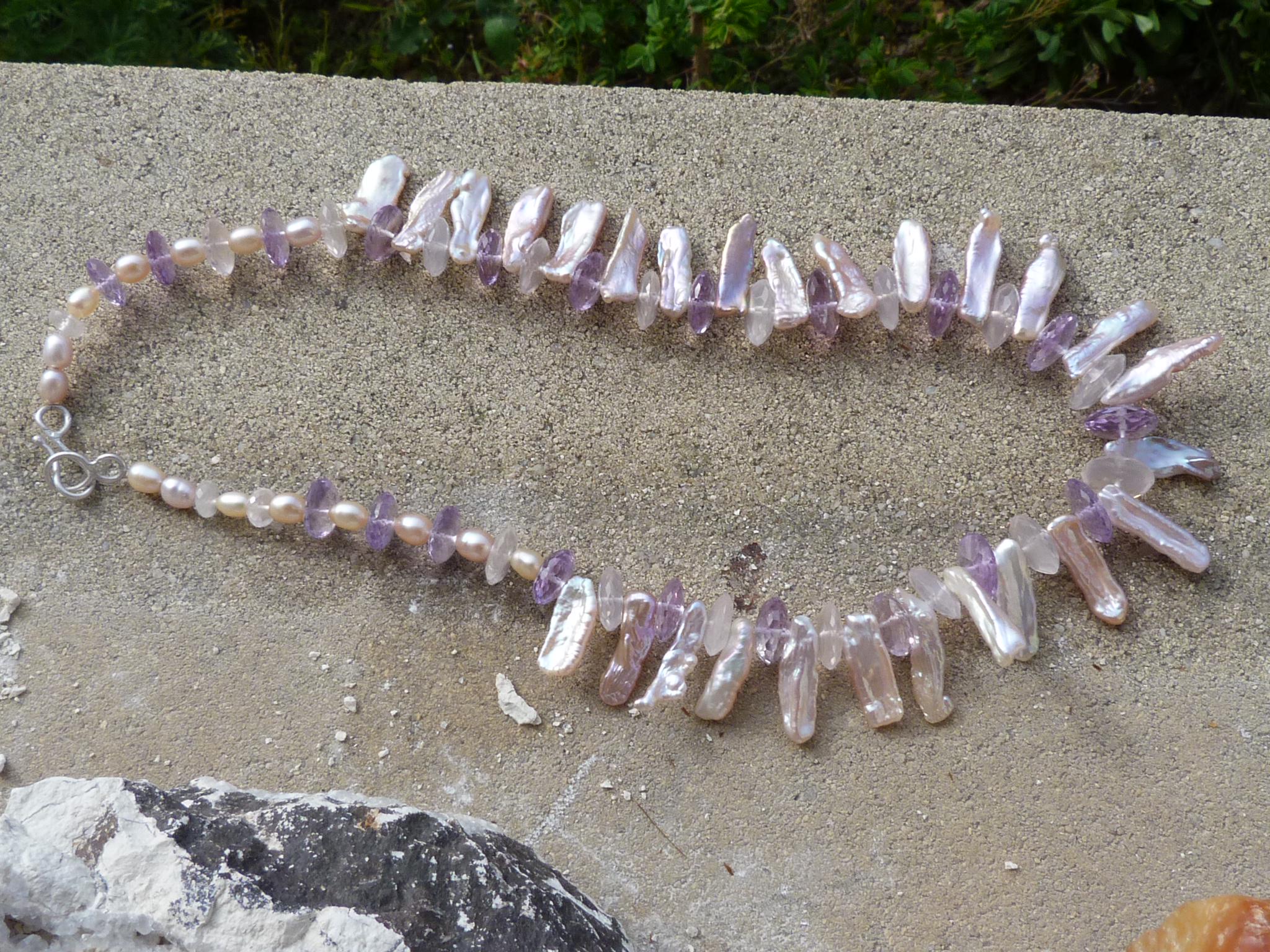 It is done with rose quartzes, améthystes, freshwater pearls and keishi pearls and a handmade sterling silver (925) claps .