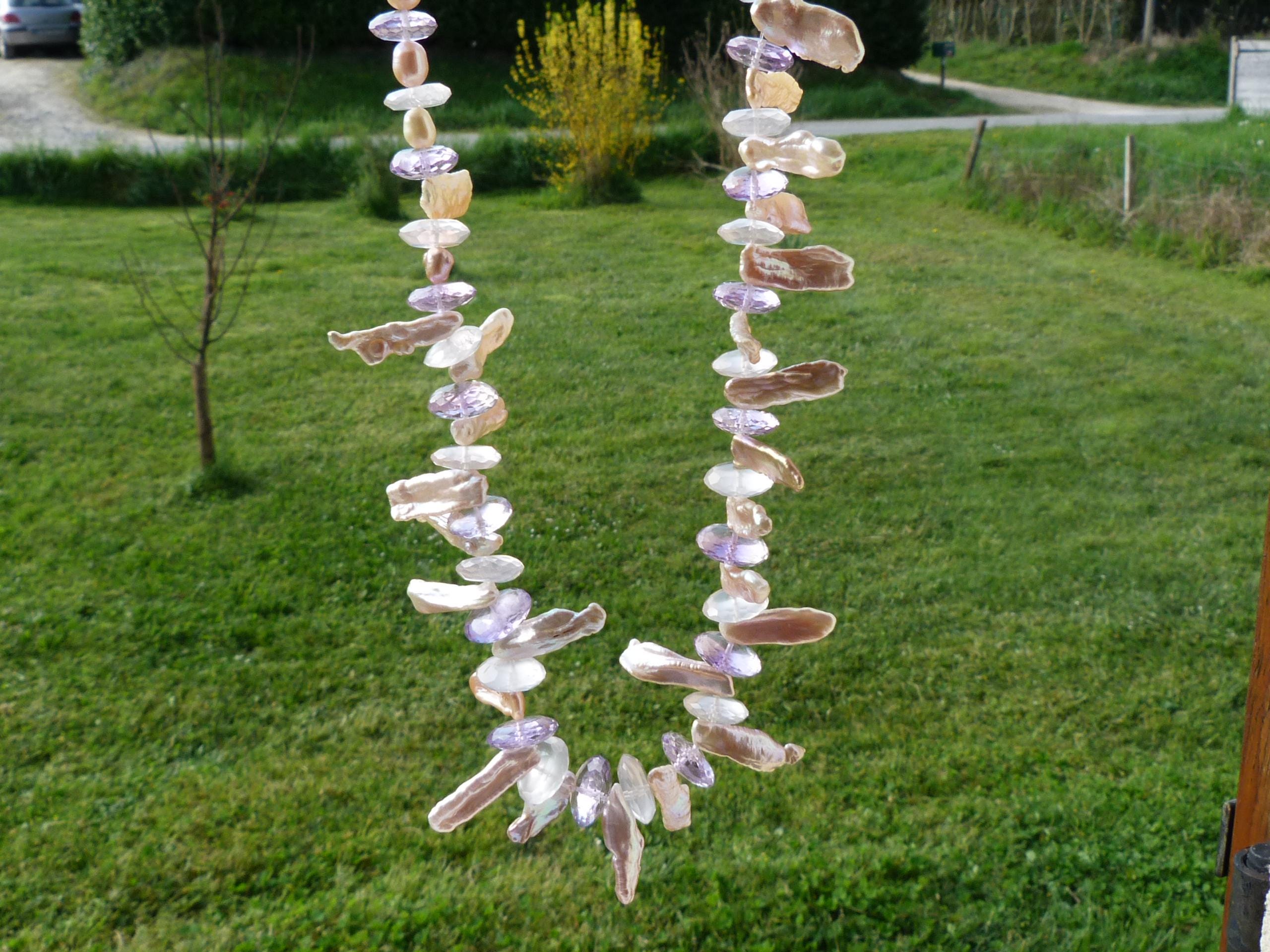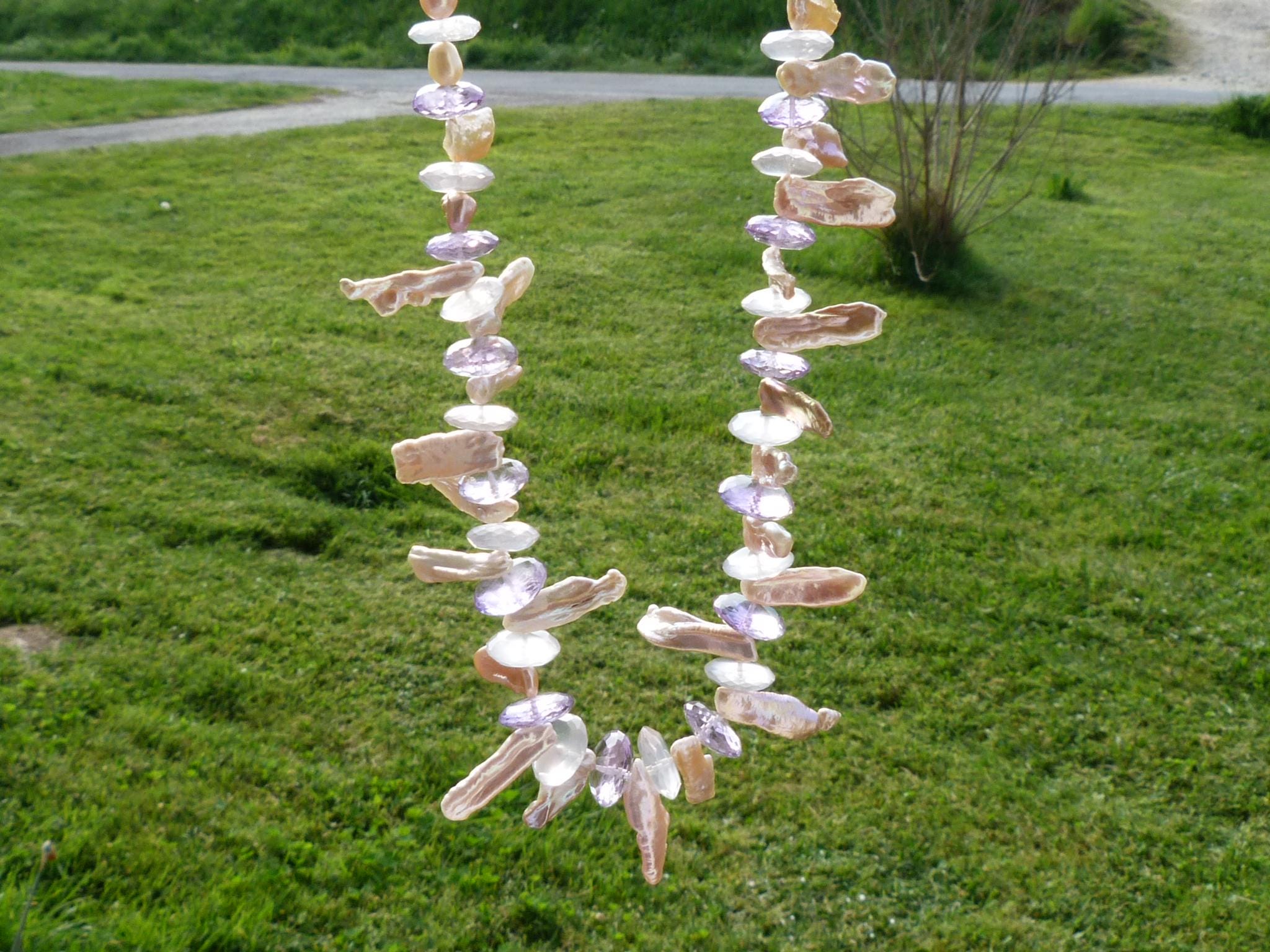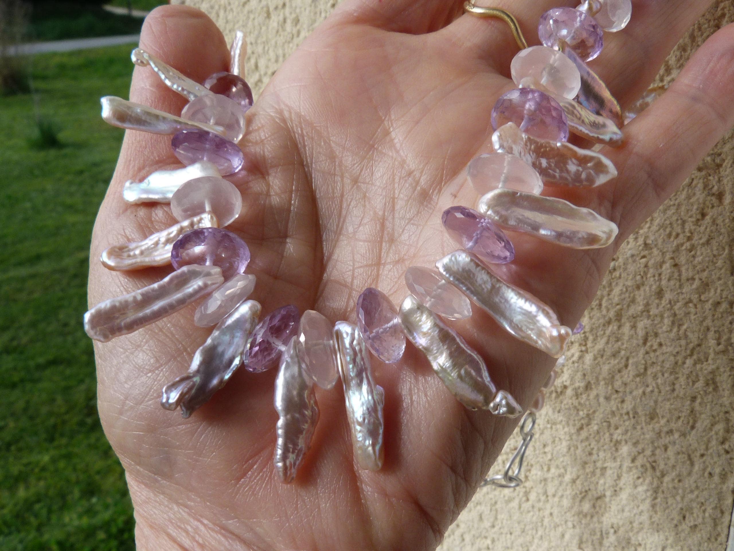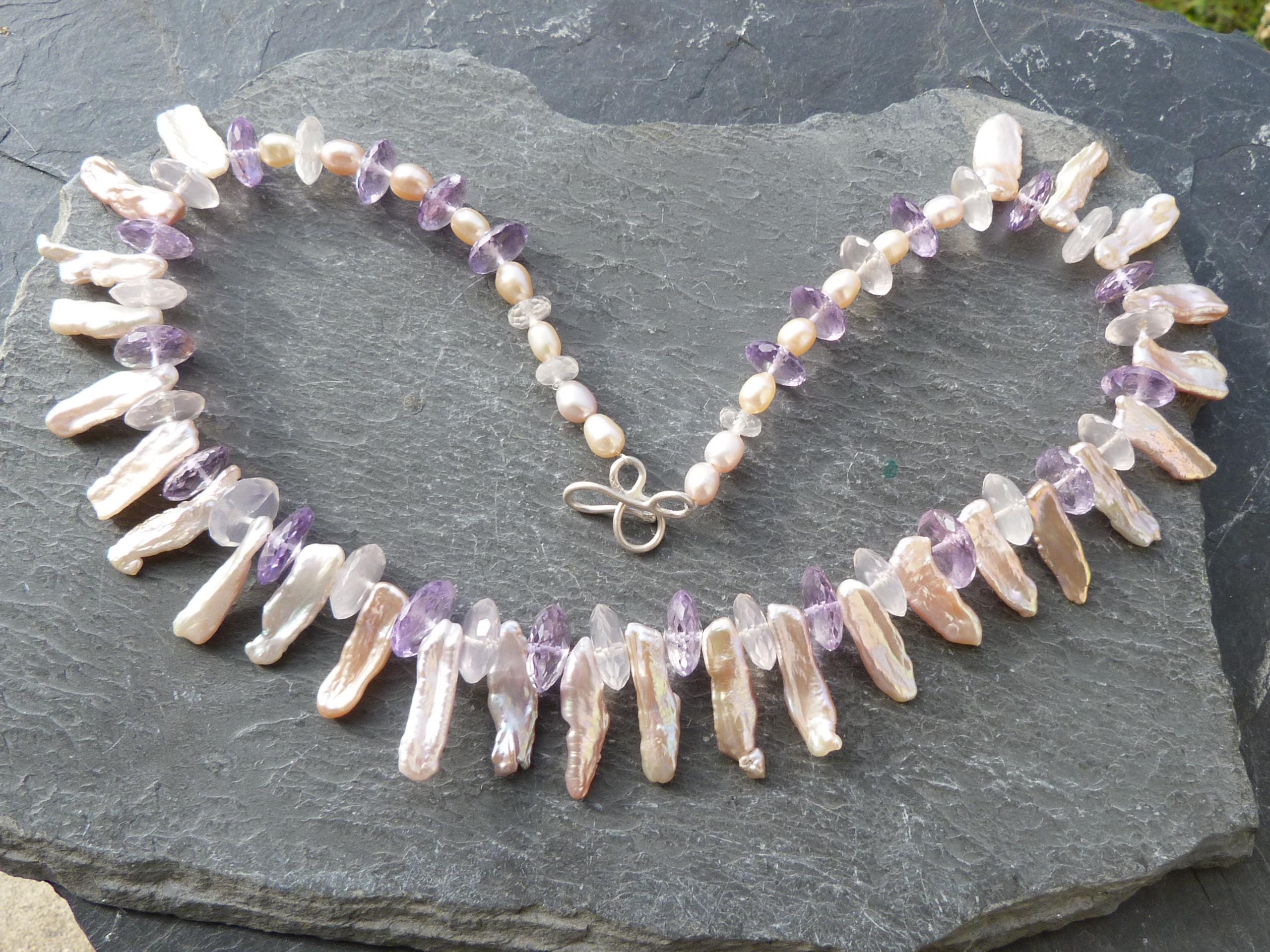 It is done with rose quartzes, améthystes, freshwater pearls and keishi pearls and a handmade sterling silver (925) claps .