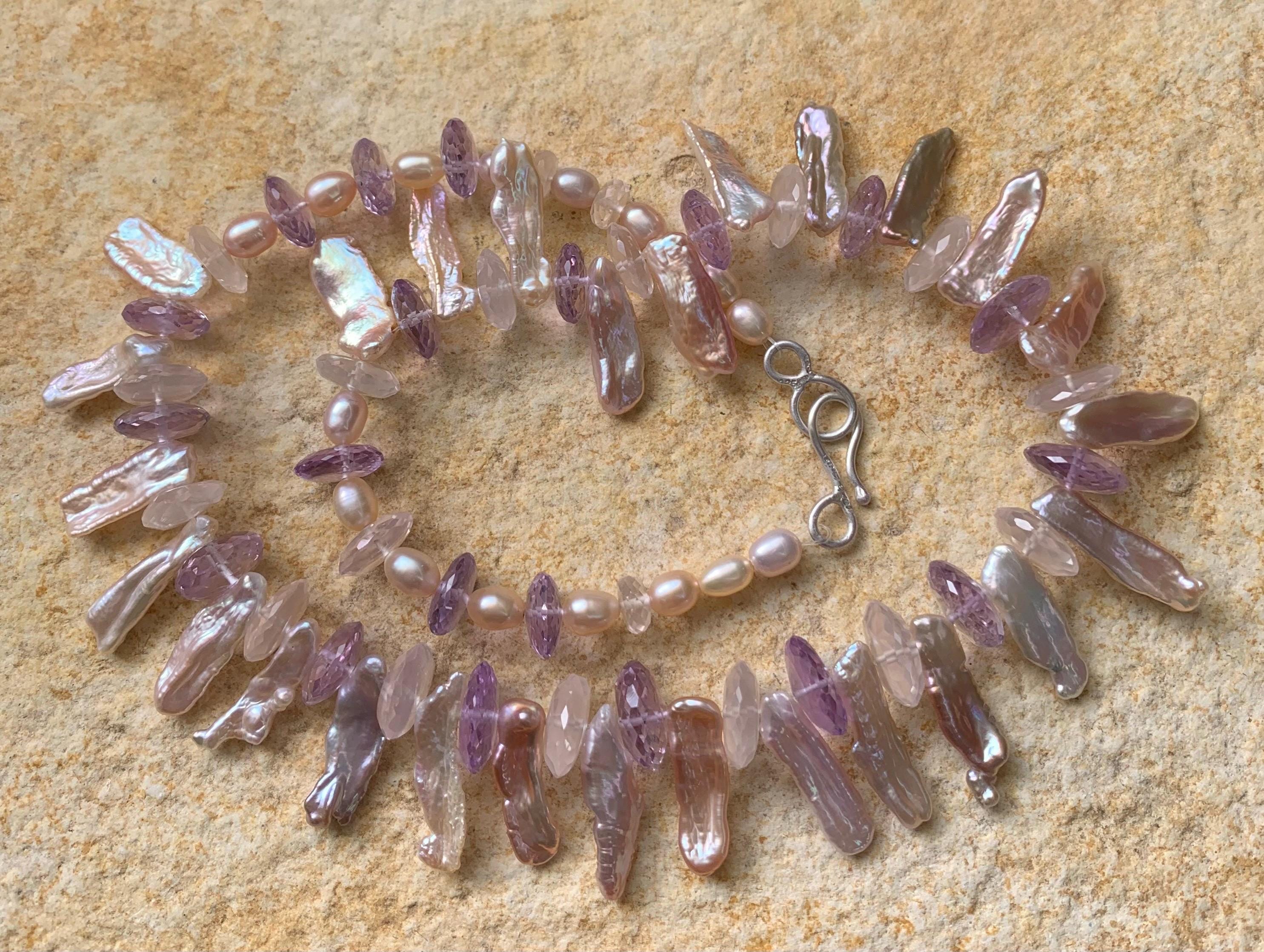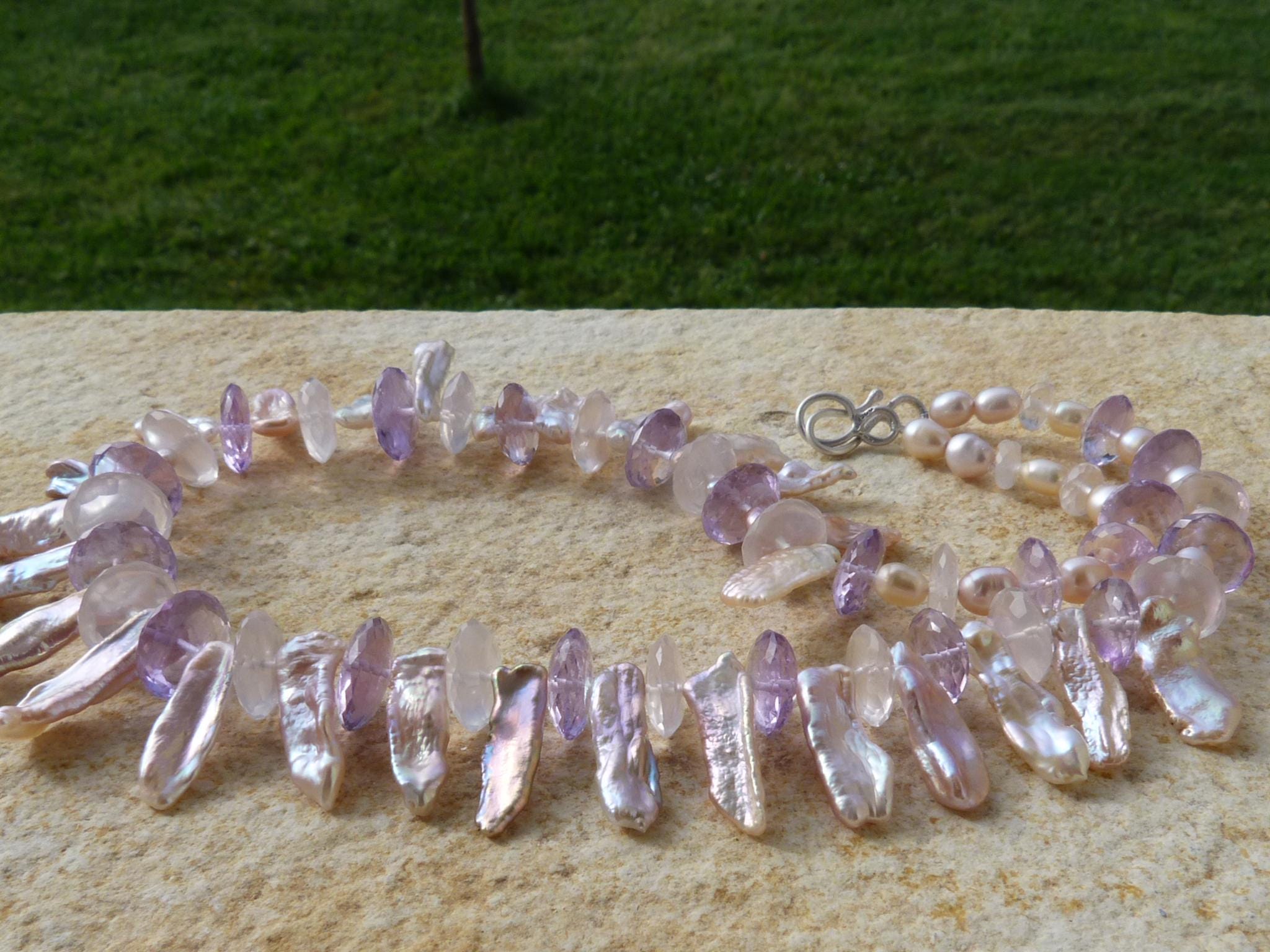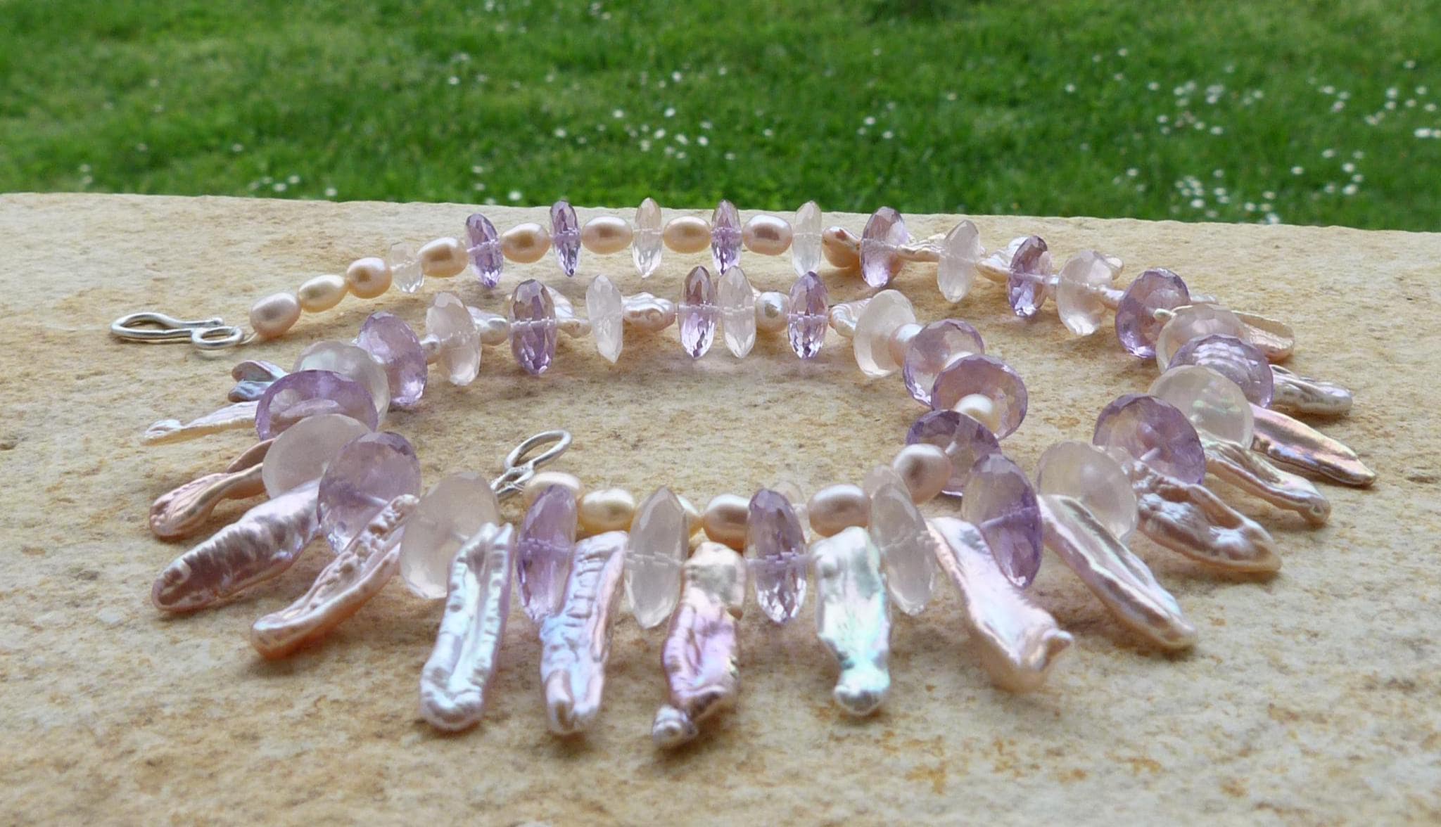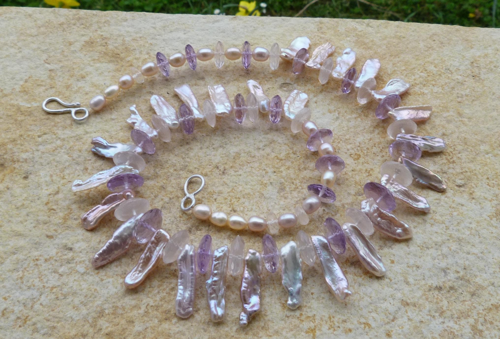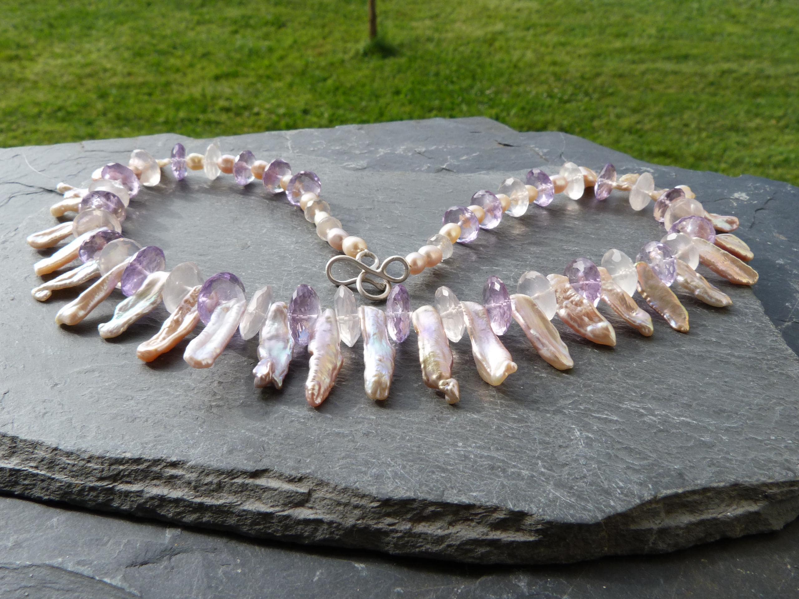 It is done with rose quartzes, améthystes, freshwater pearls and keishi pearls and a handmade sterling silver (925) claps .