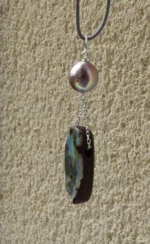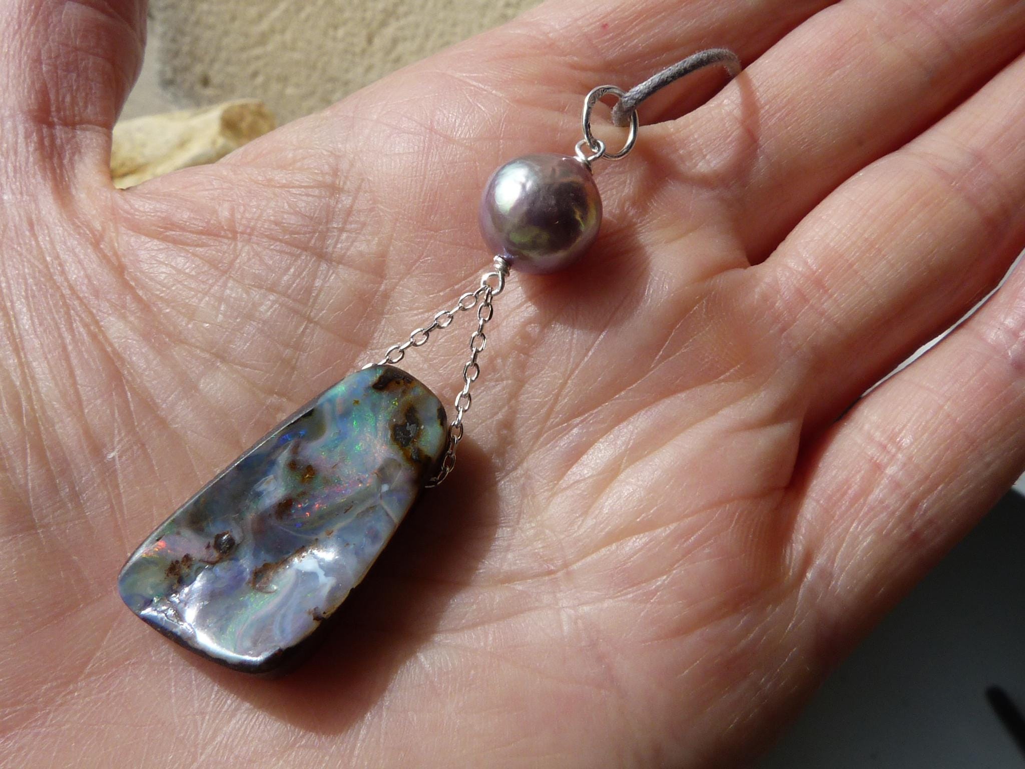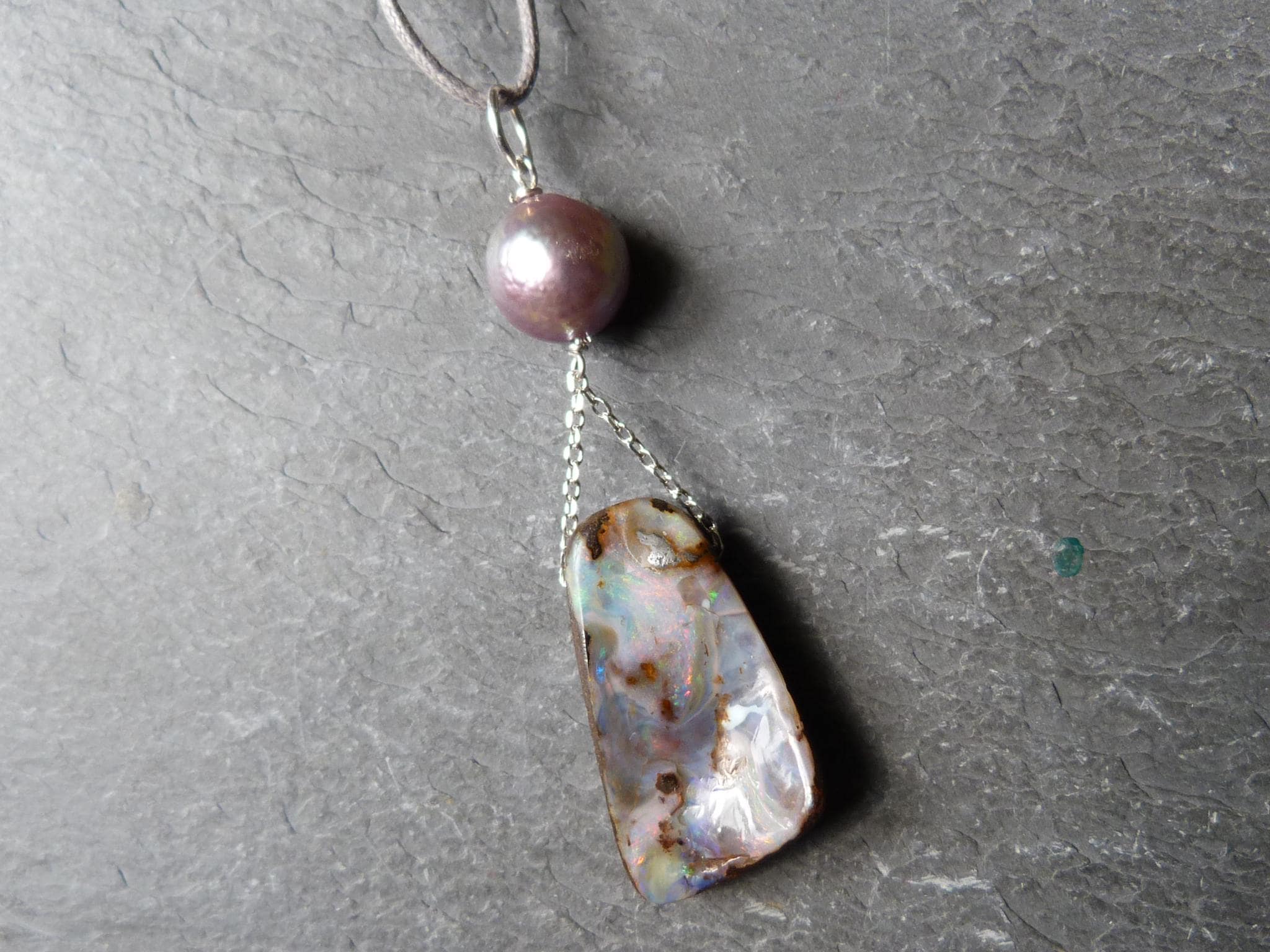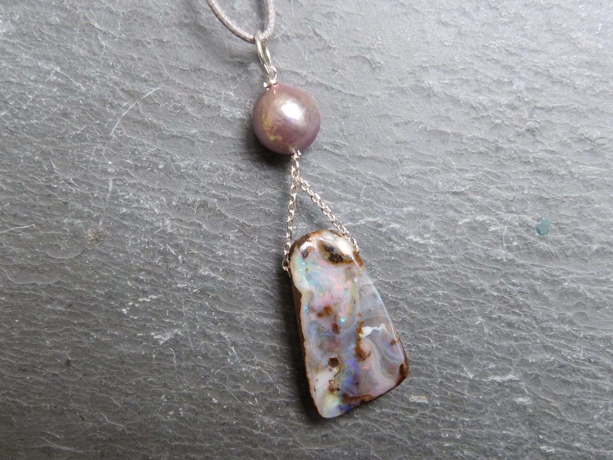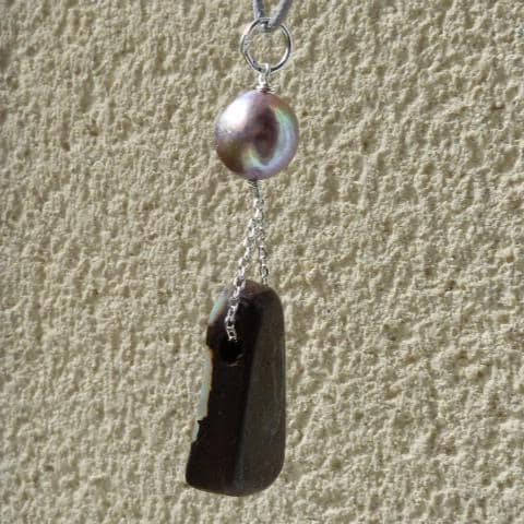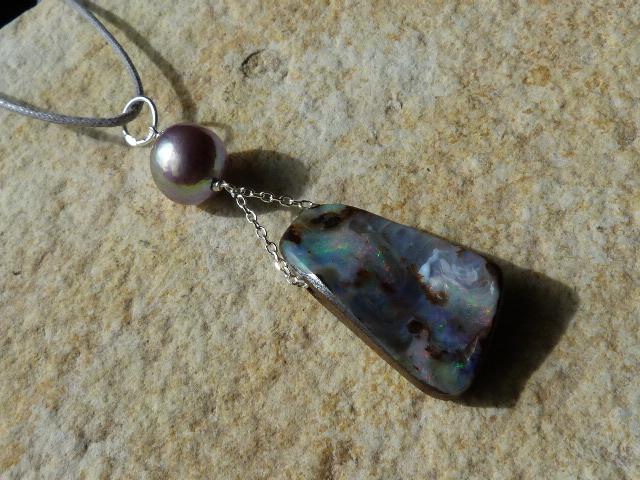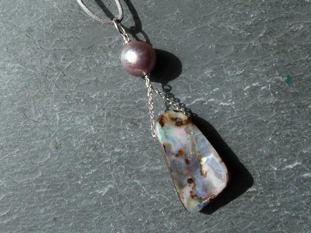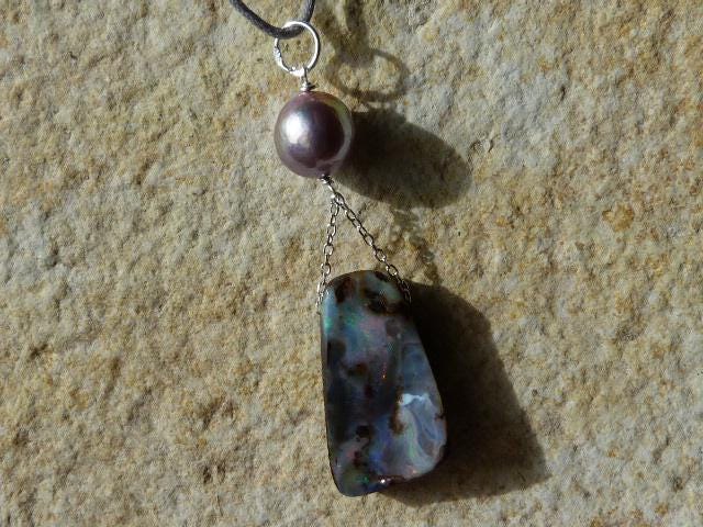 This pendant is done with 1 australian boulder opal and 1 freshwater pearl hanging on silver wire and chain.