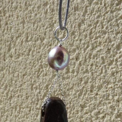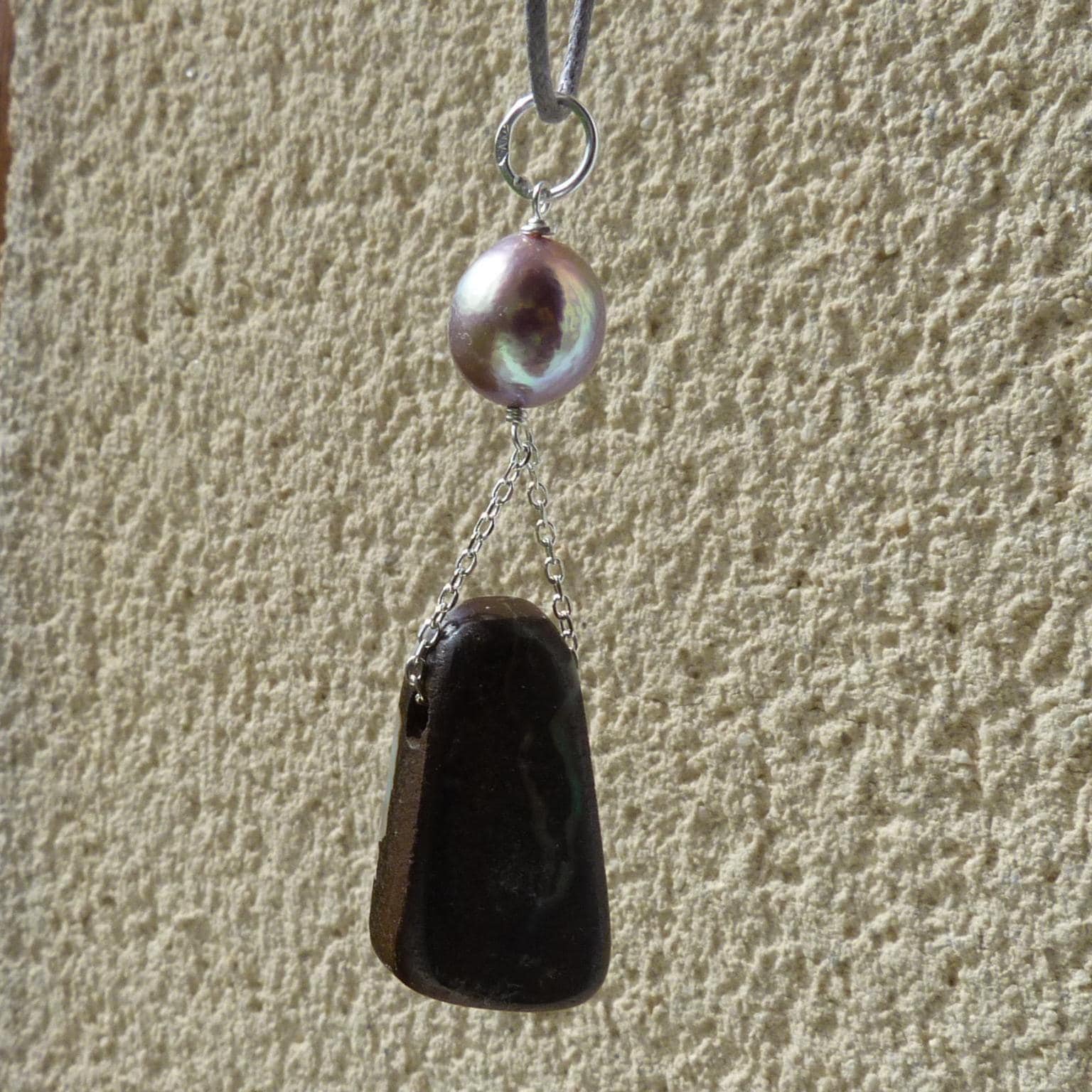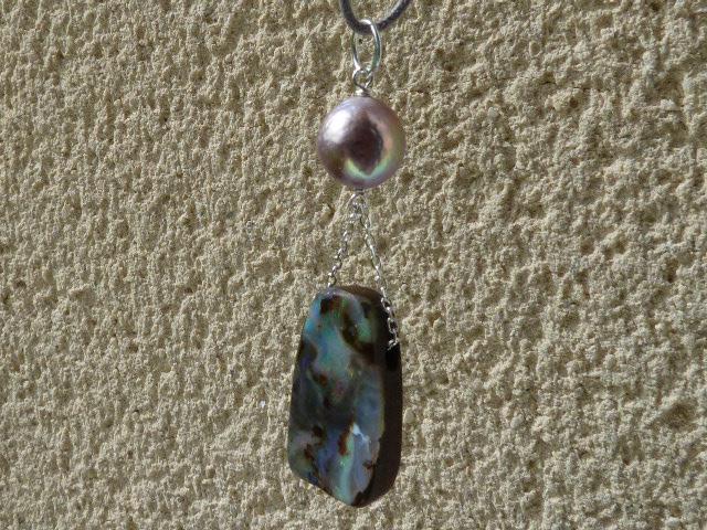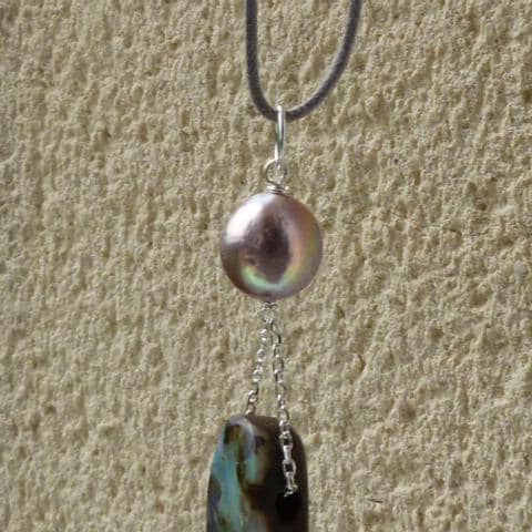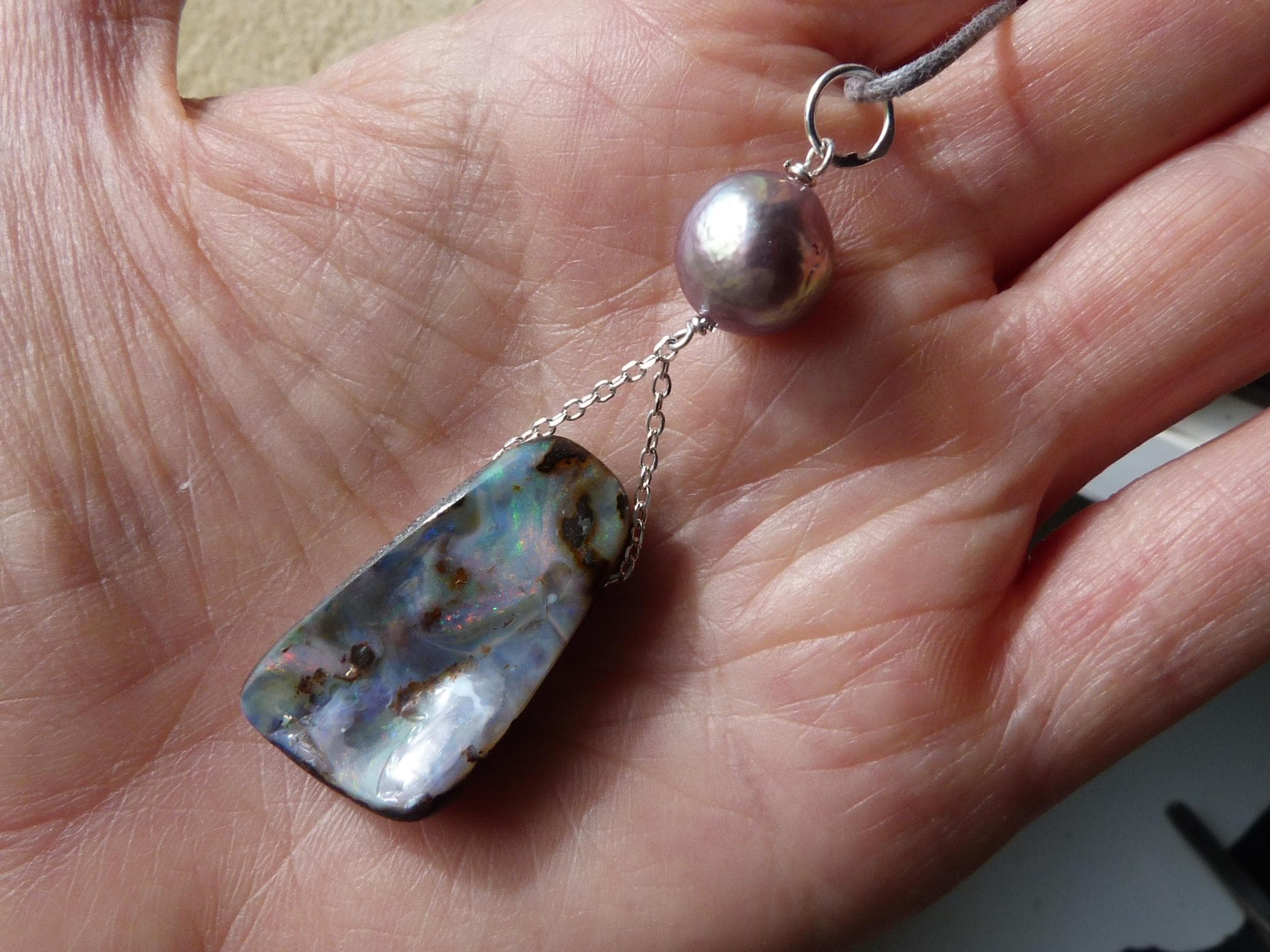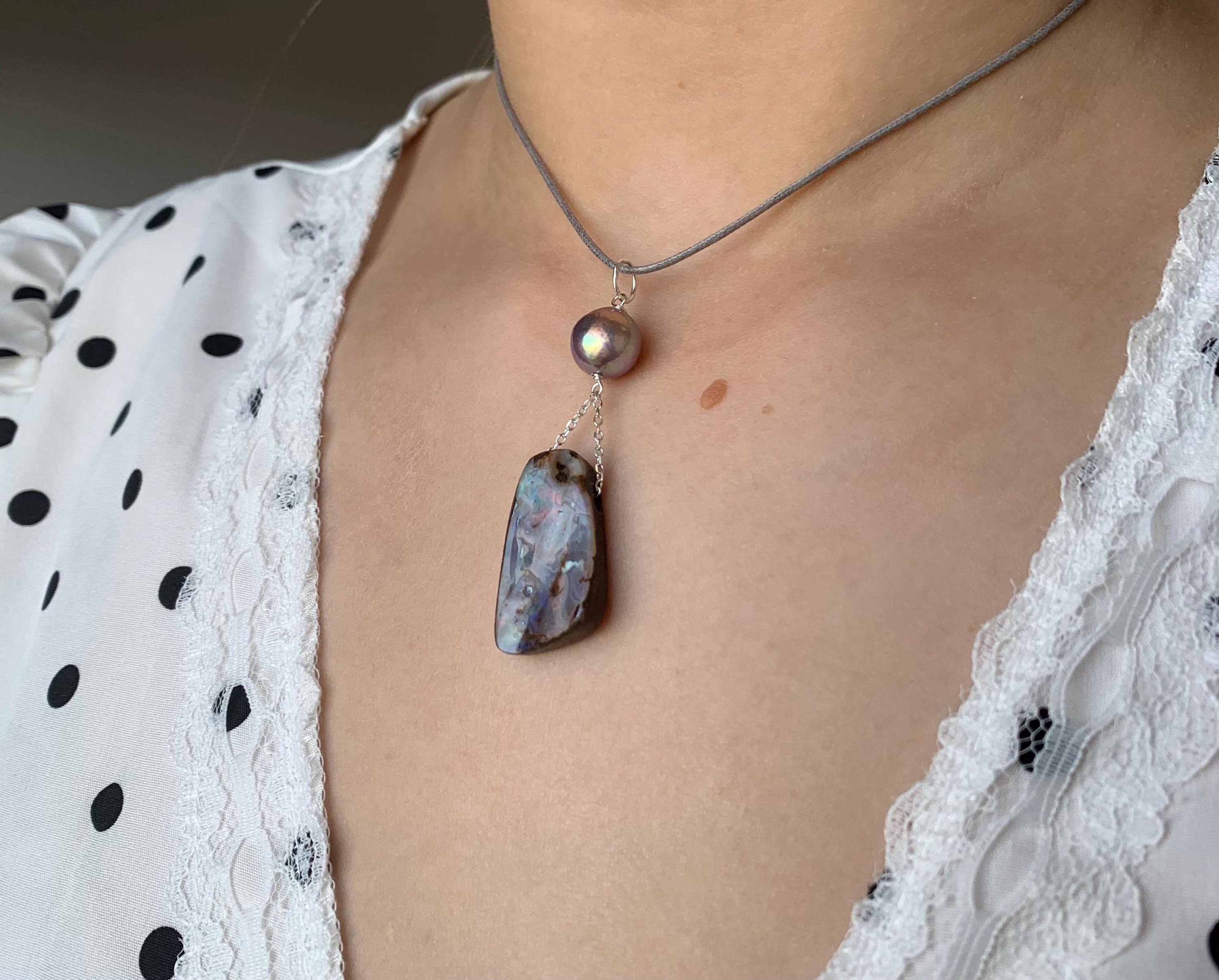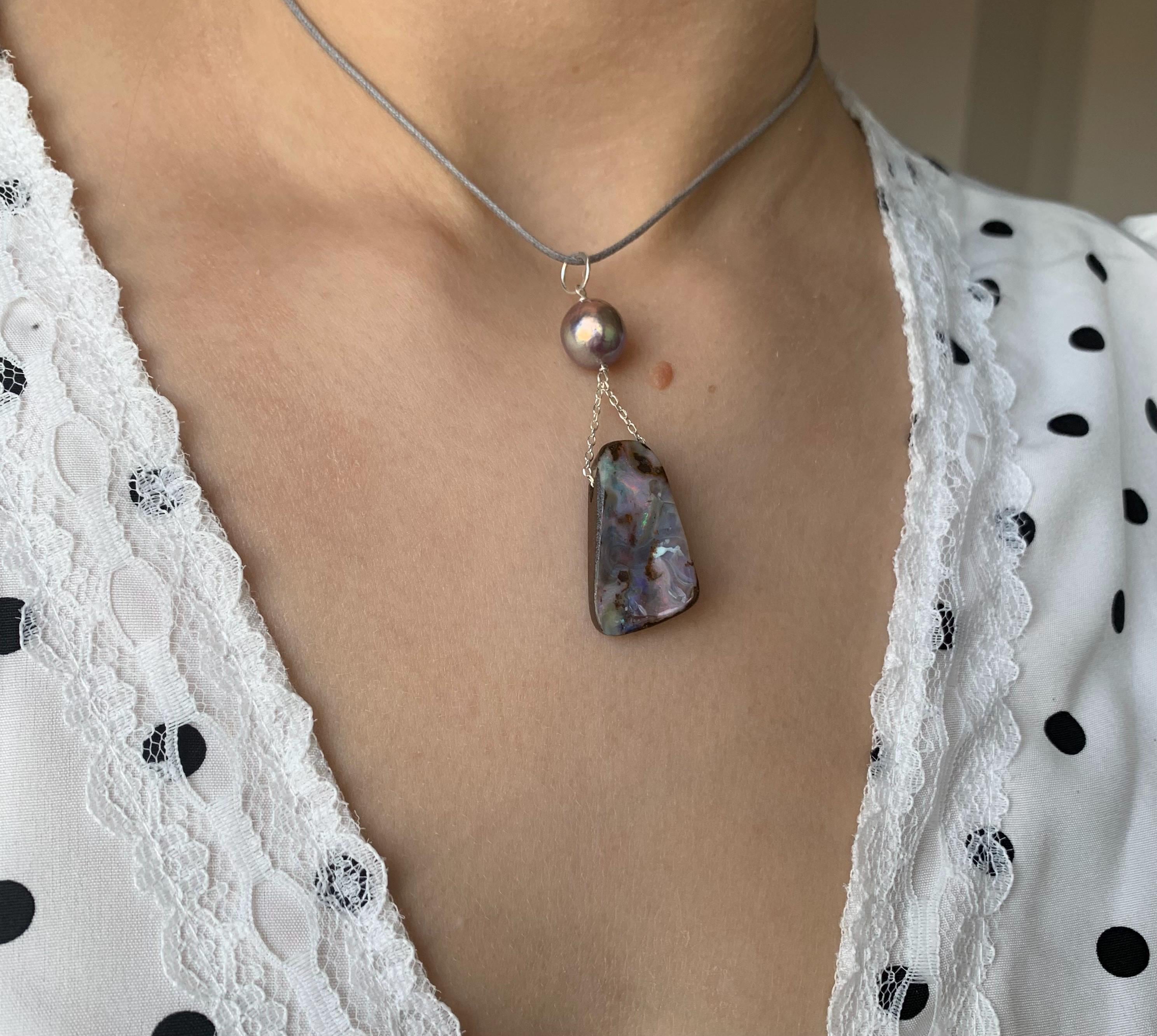 This pendant is done with 1 australian boulder opal and 1 freshwater pearl hanging on silver wire and chain.