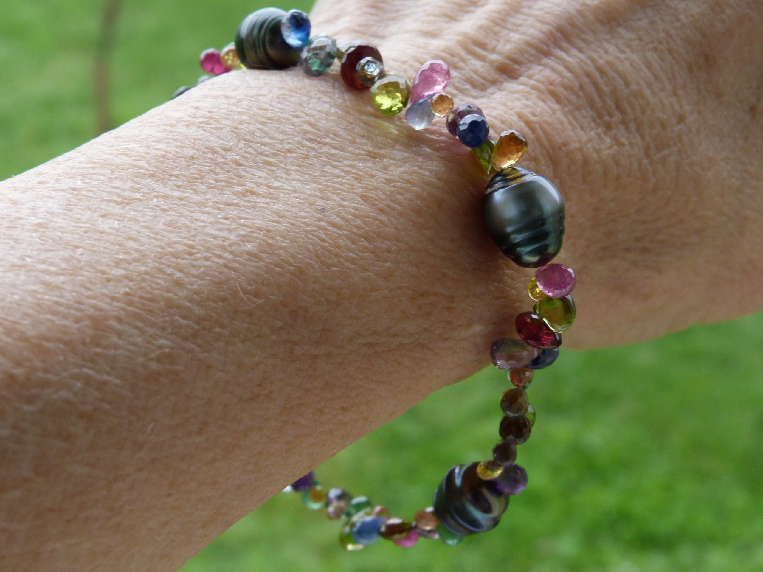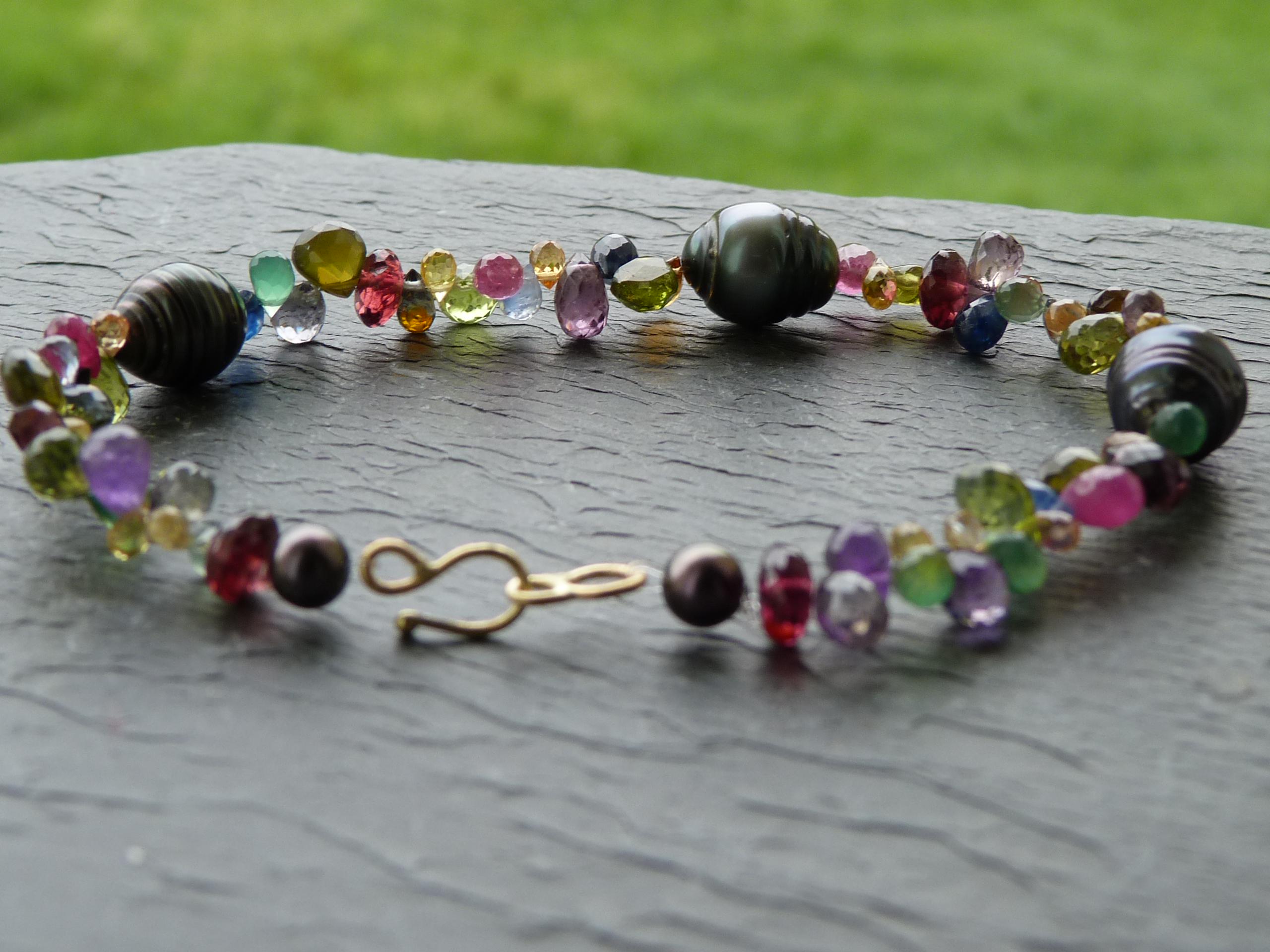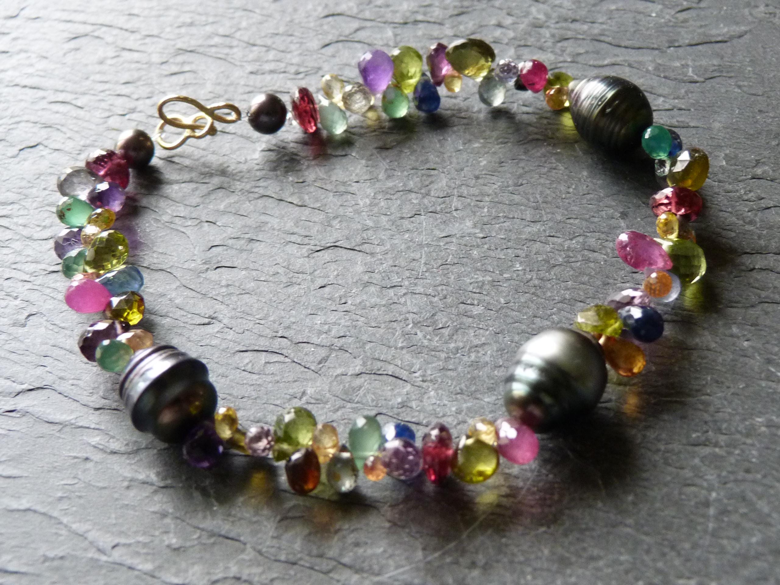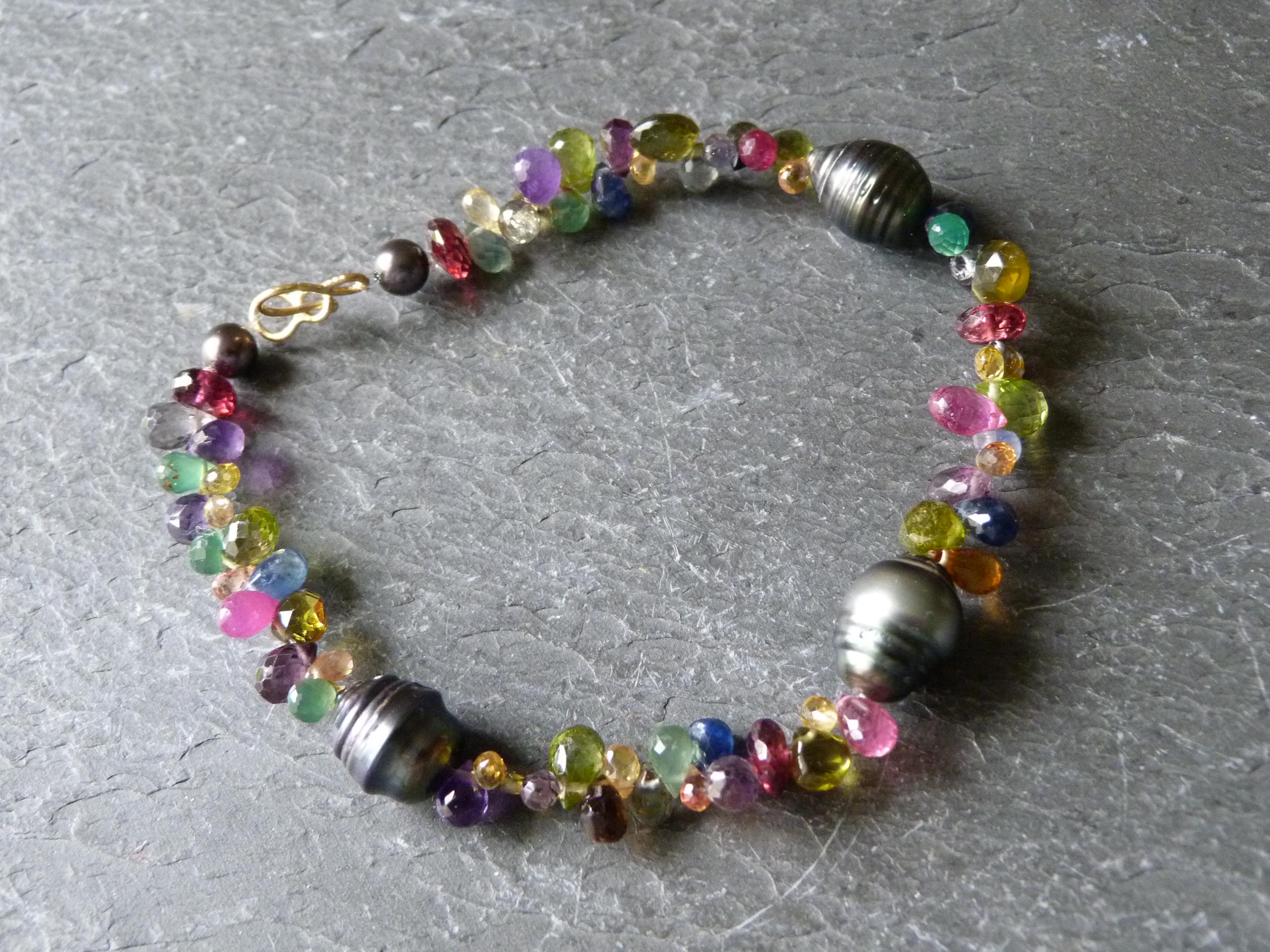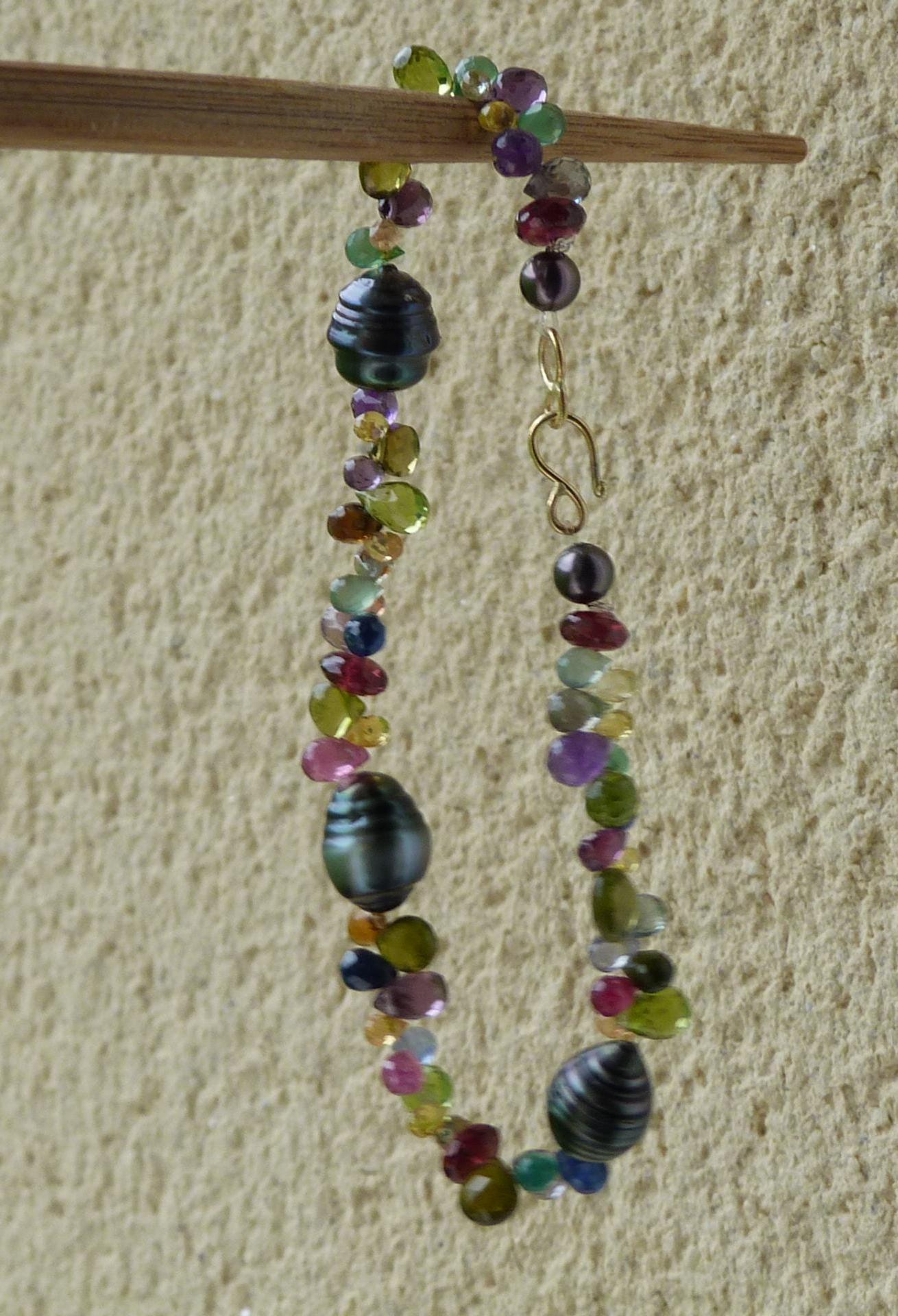 It is done with black tahitian pearls and gem stones ( sapphires of different colours, rubis, aventurines, peridots, amethystes, garnets and tourmalines.