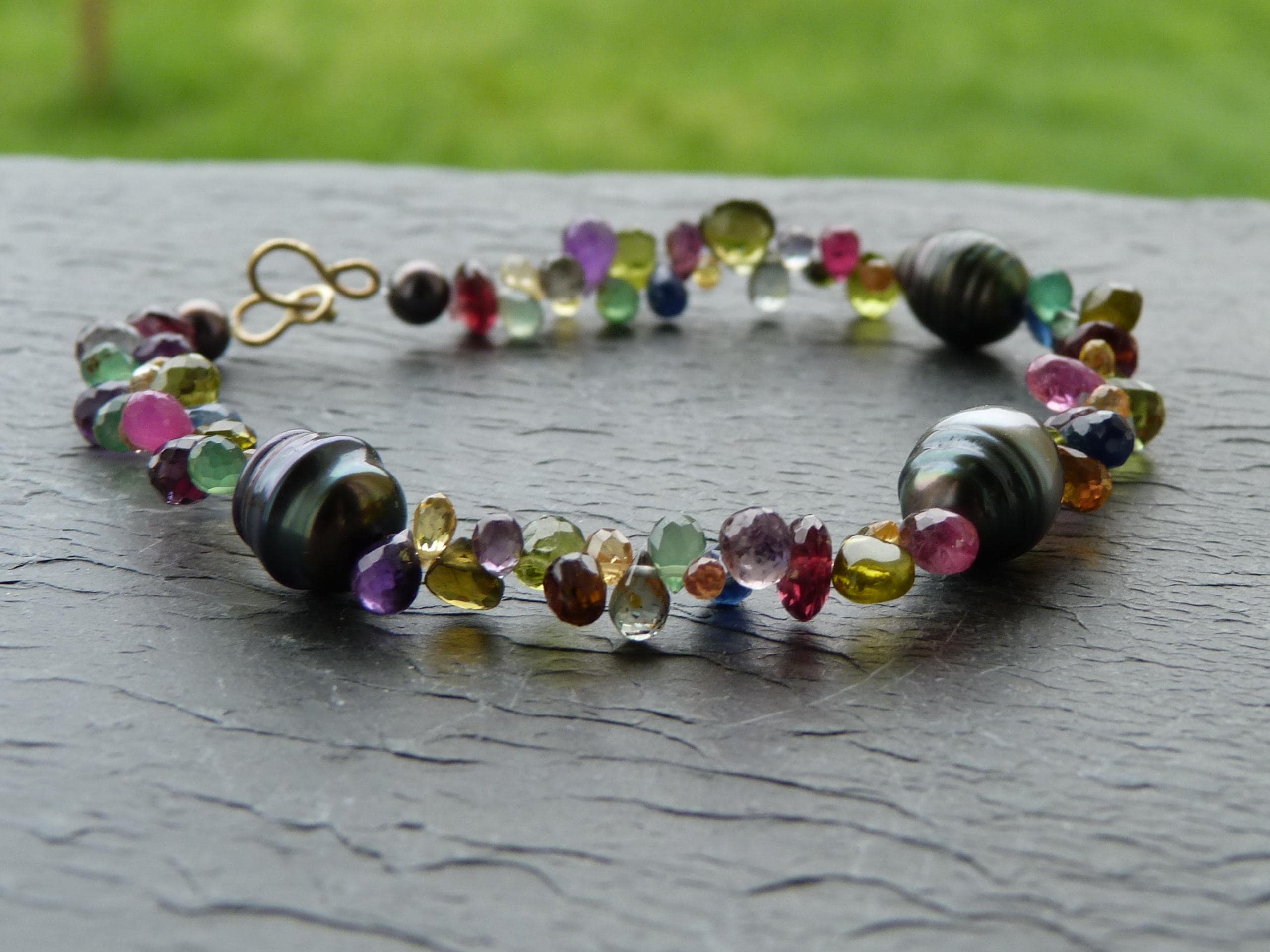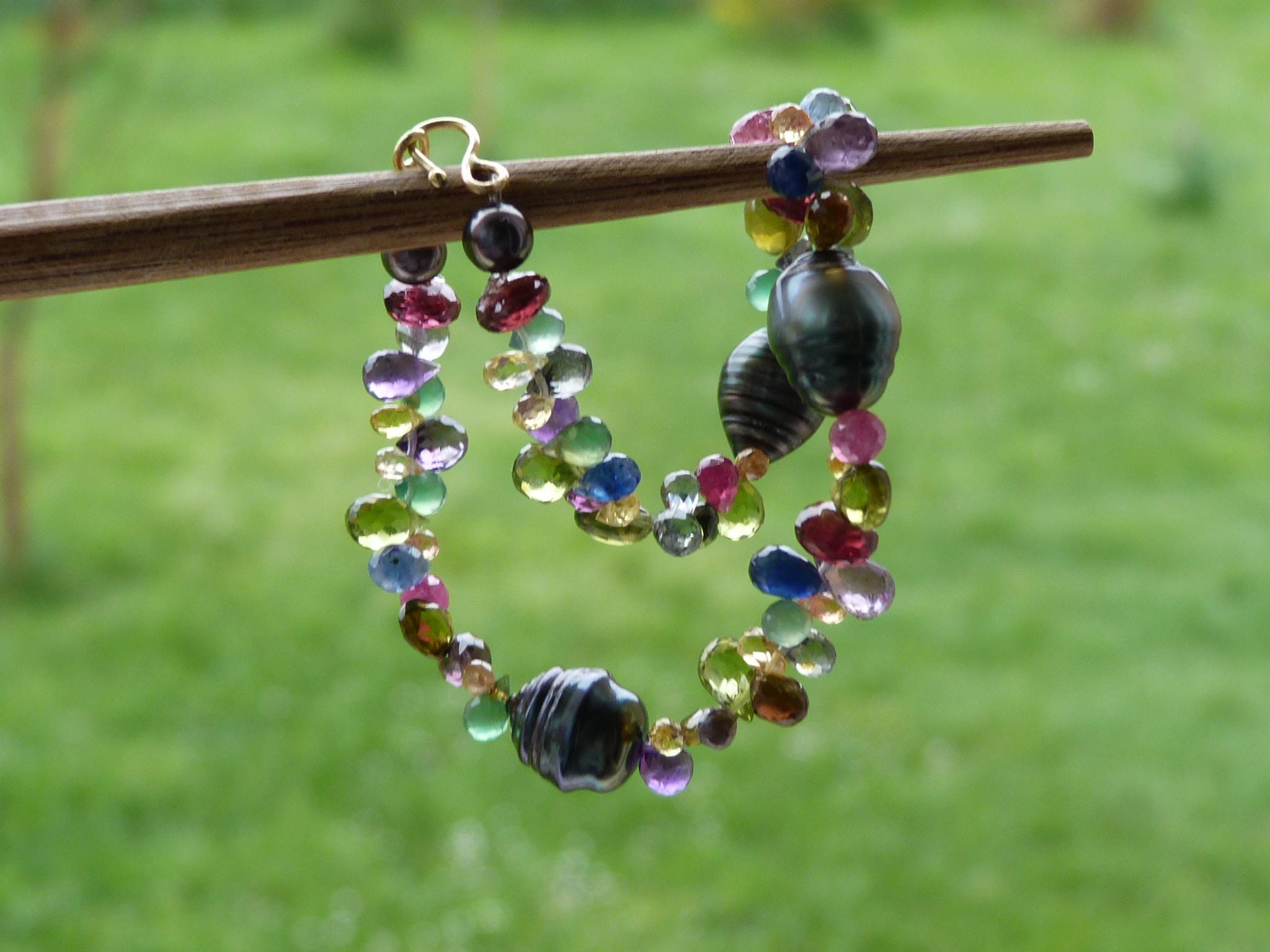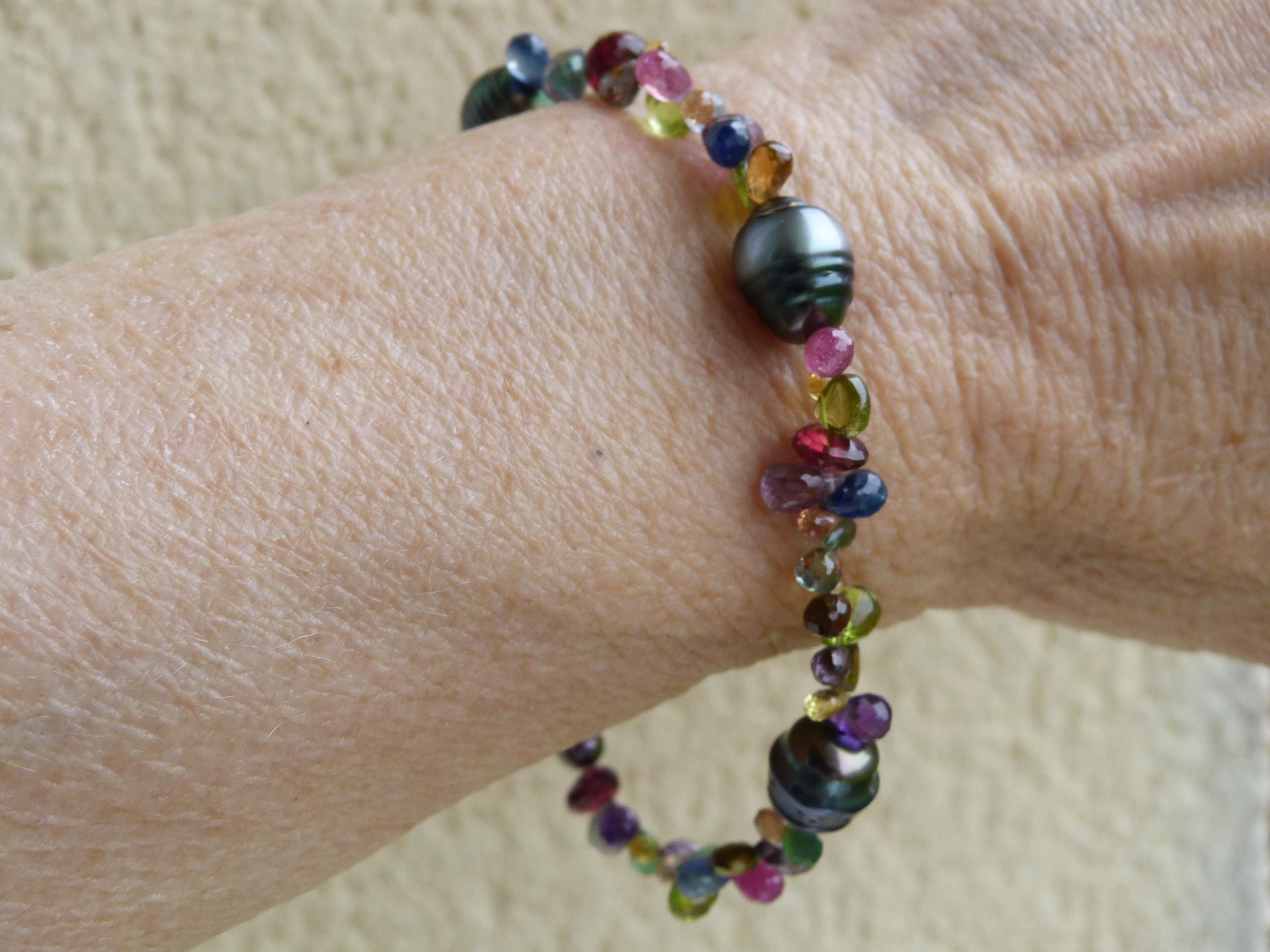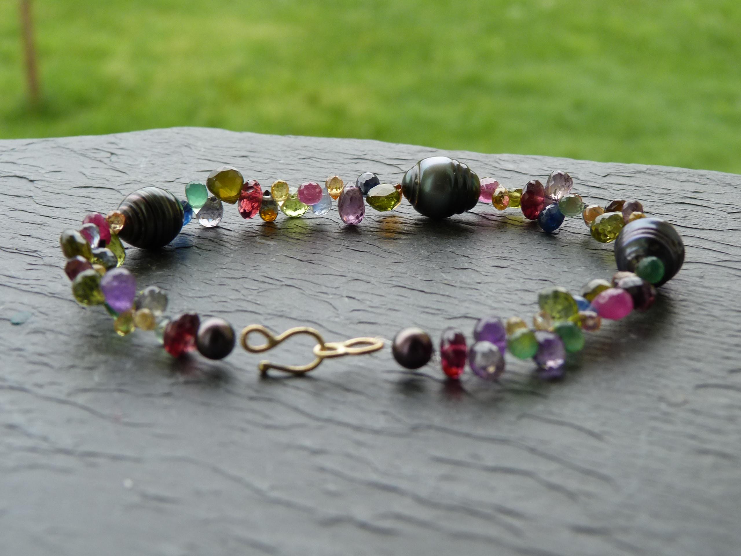 It is done with black tahitian pearls and gem stones ( sapphires of different colours, rubis, aventurines, peridots, amethystes, garnets and tourmalines.