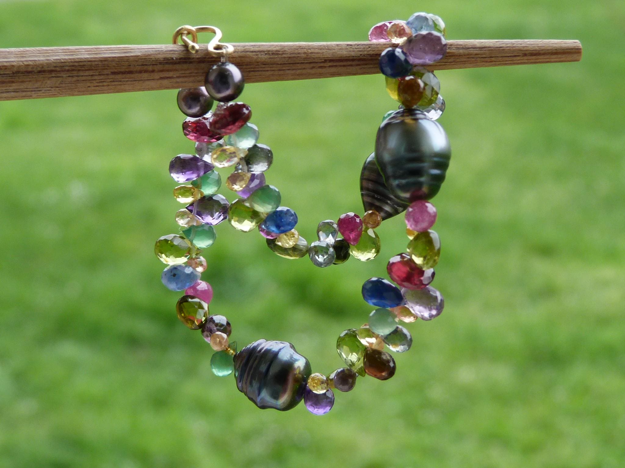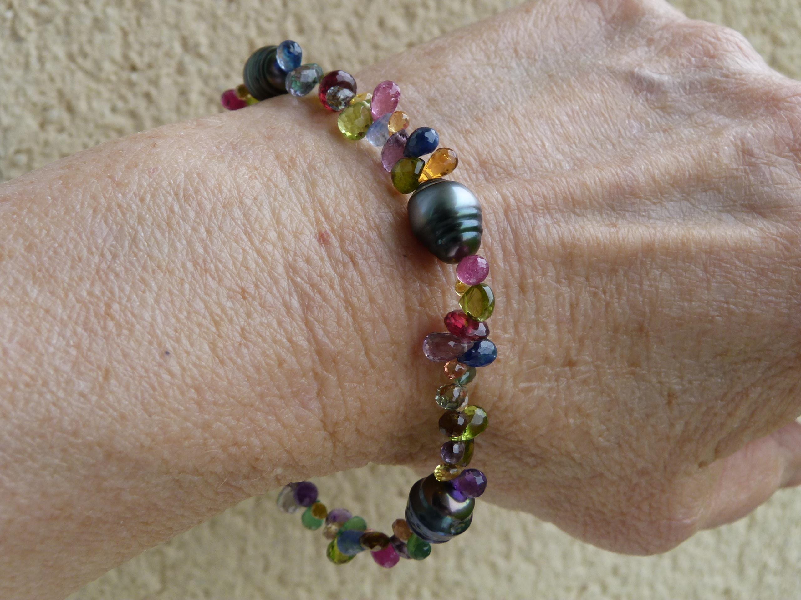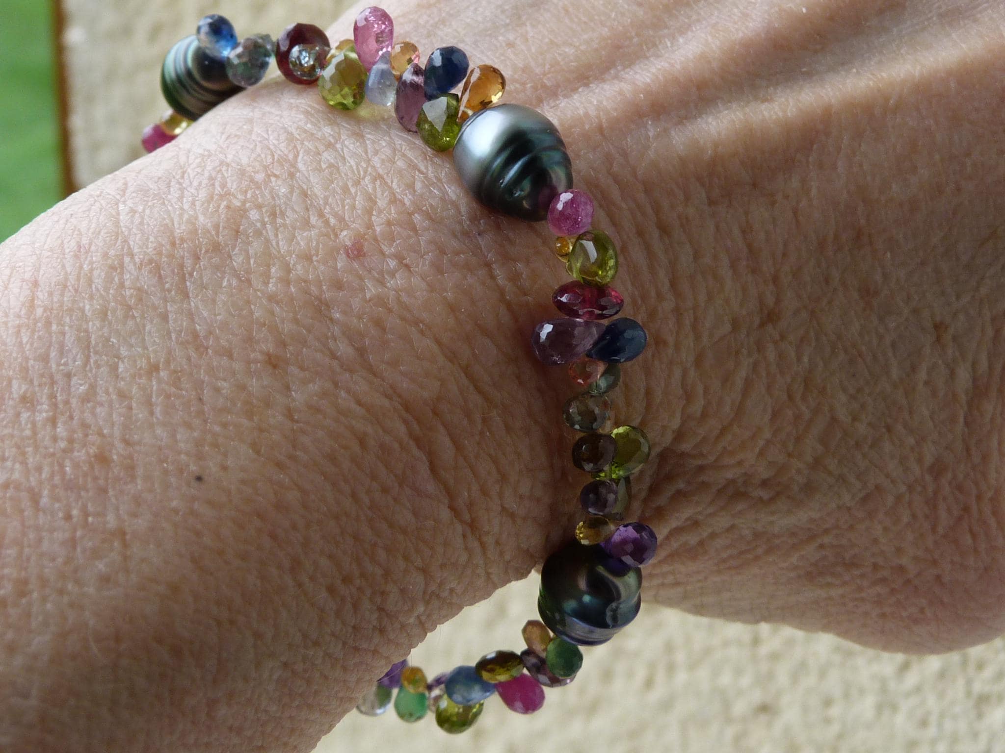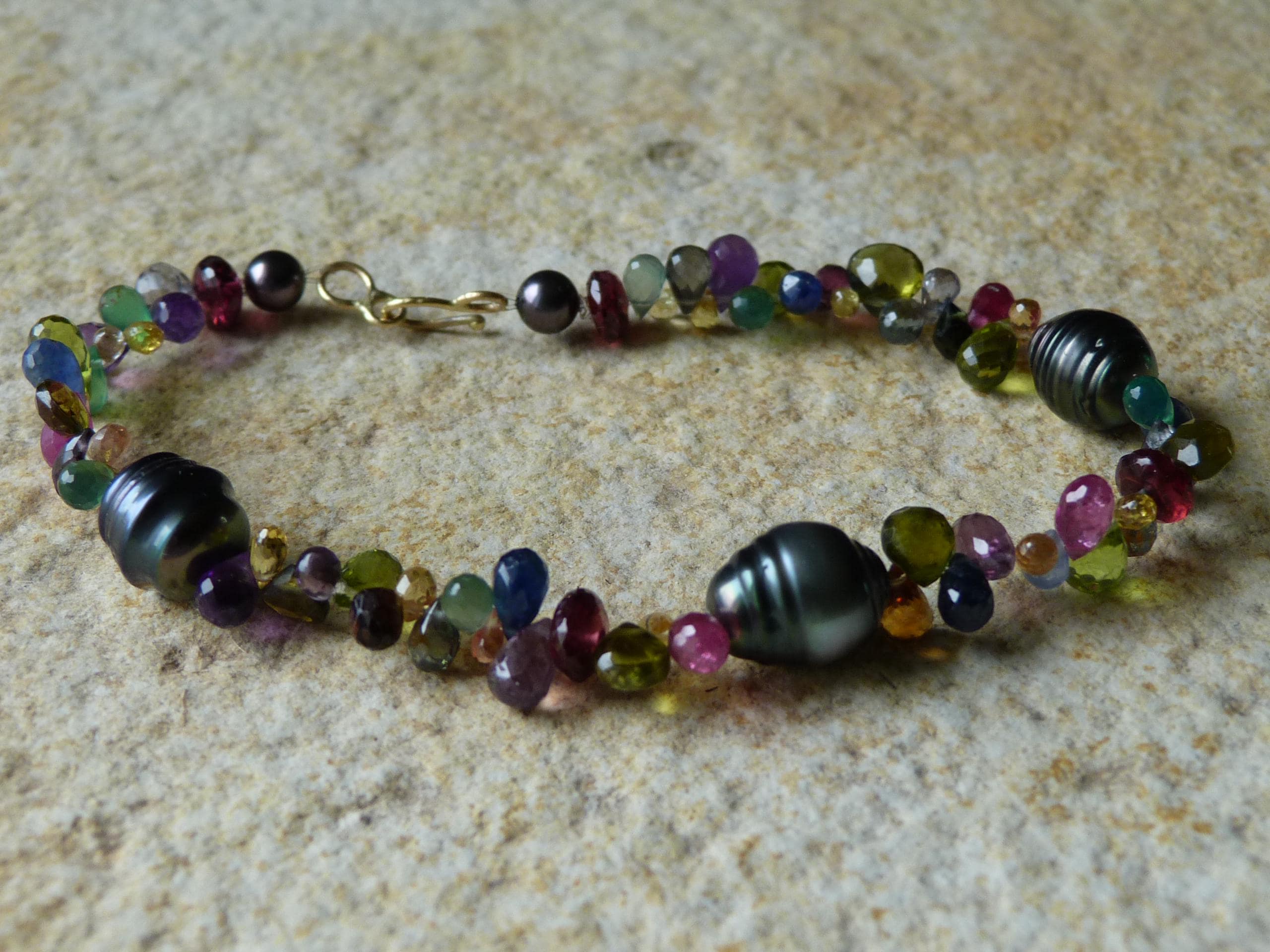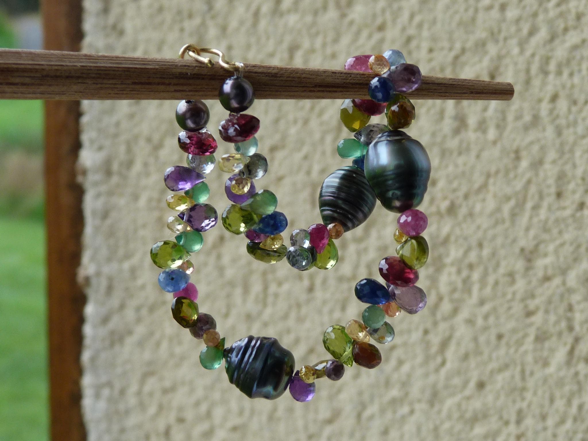 It is done with black tahitian pearls and gem stones ( sapphires of different colours, rubis, aventurines, peridots, amethystes, garnets and tourmalines.