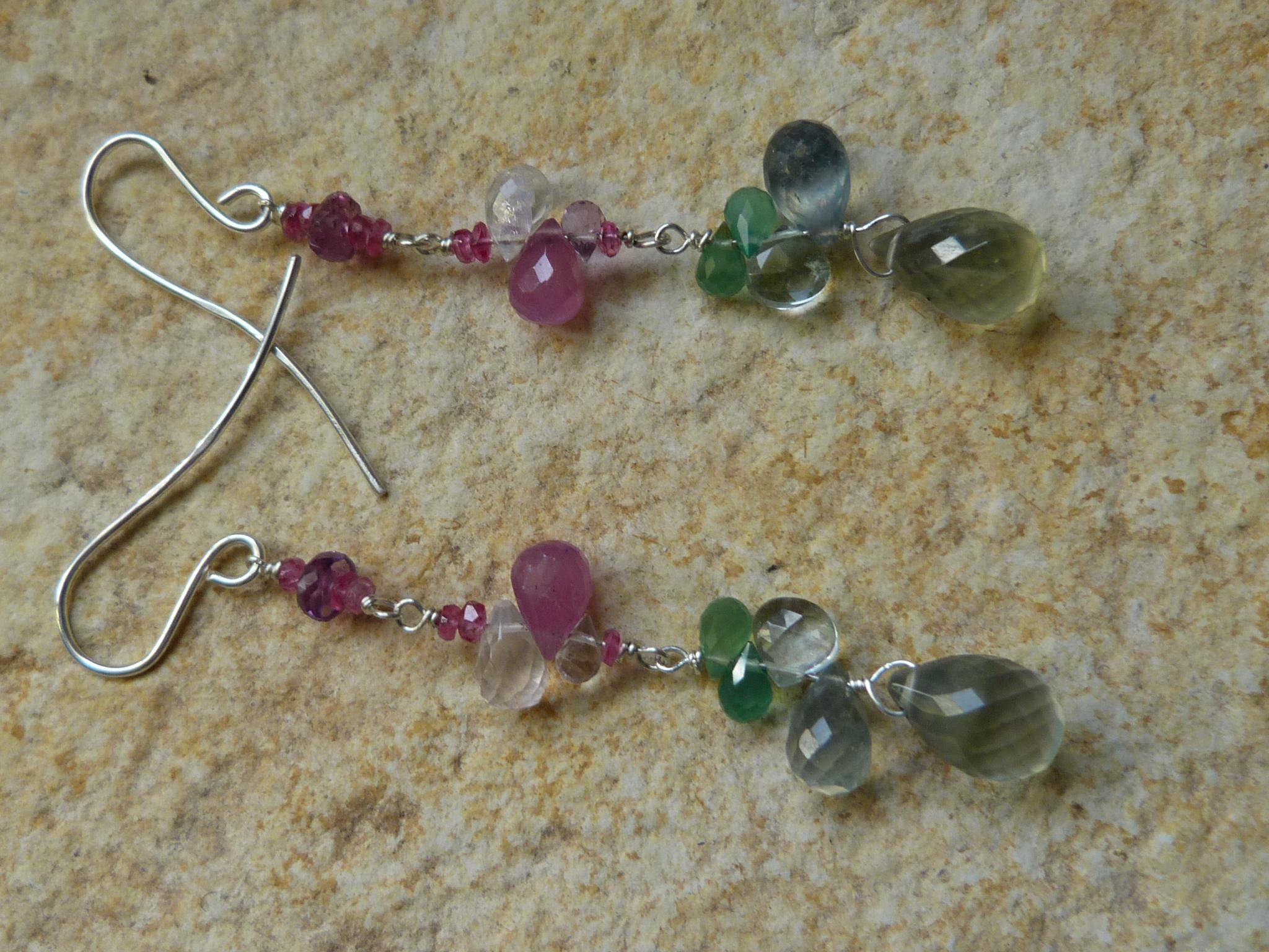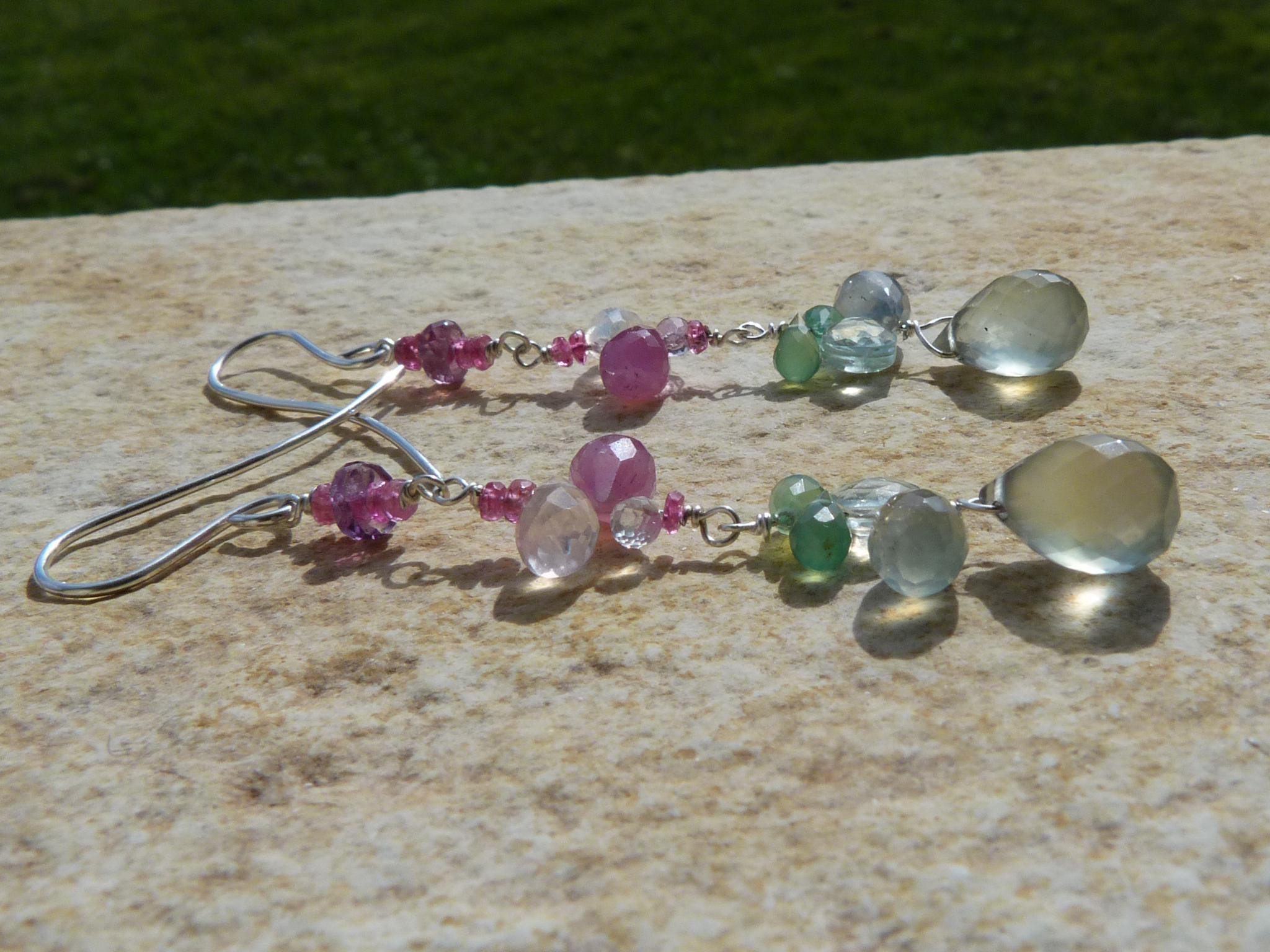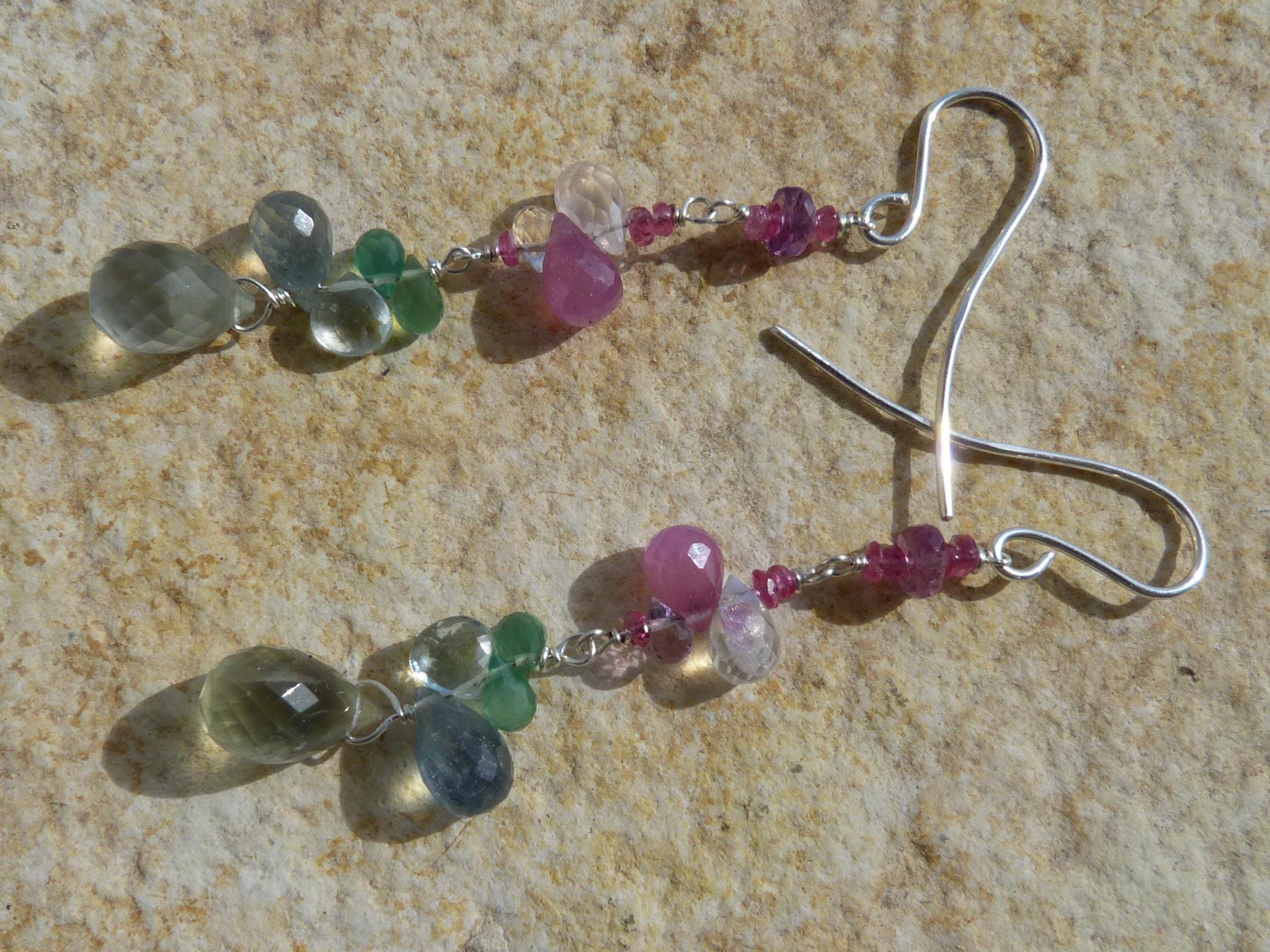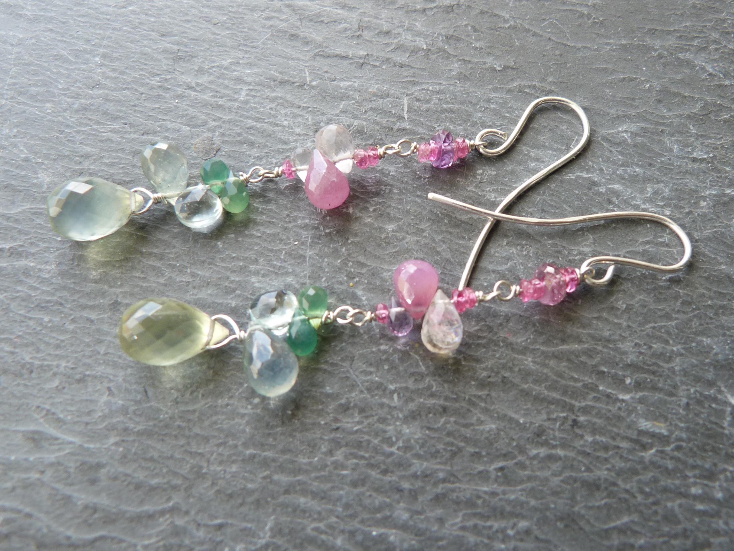 The metal is solid 925 silver with rose sapphire, aventurine, aqua marine, rose quartz and prehnit briolettes.