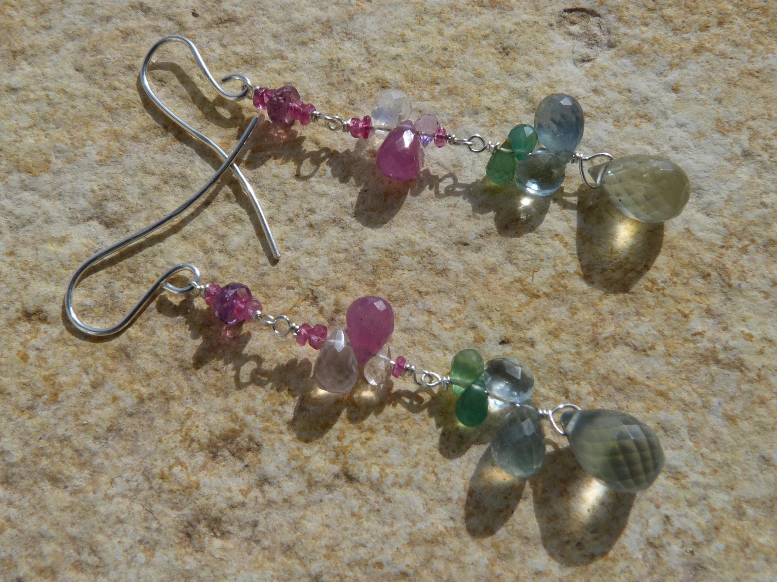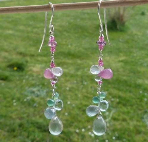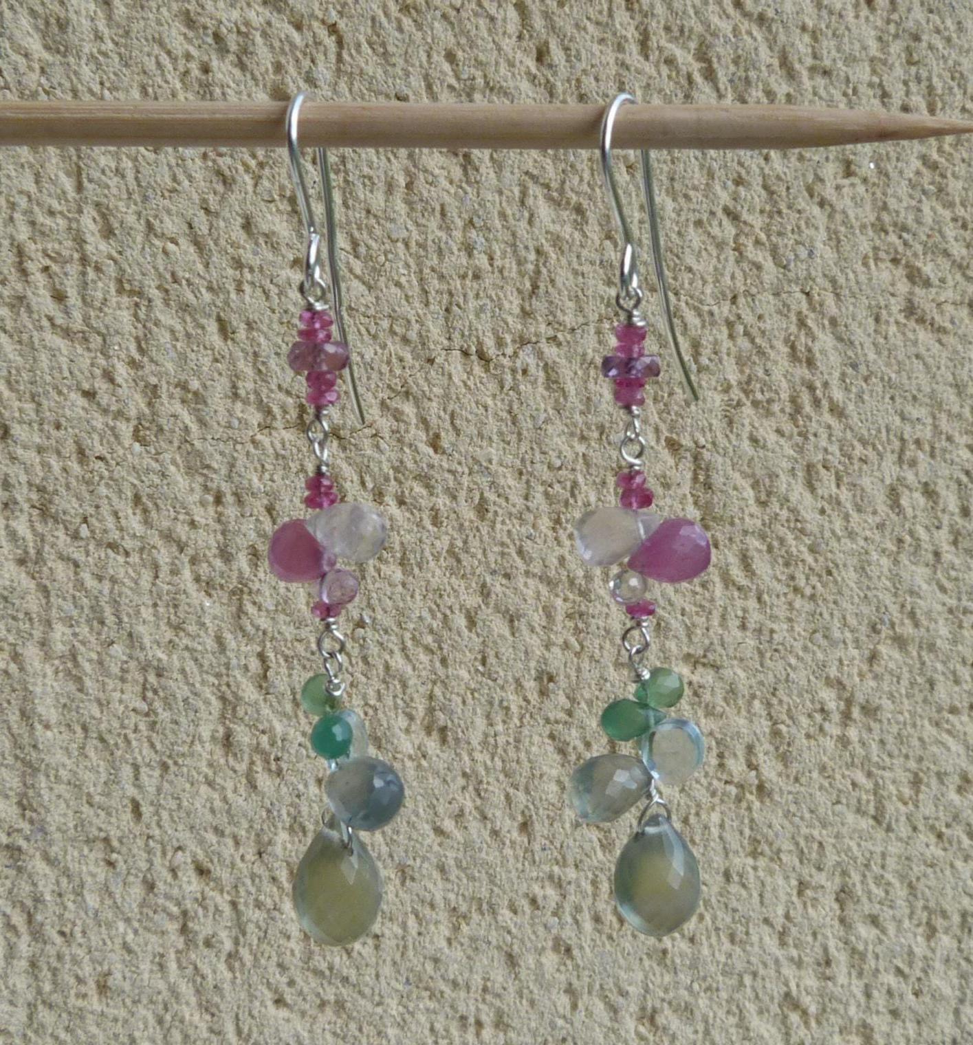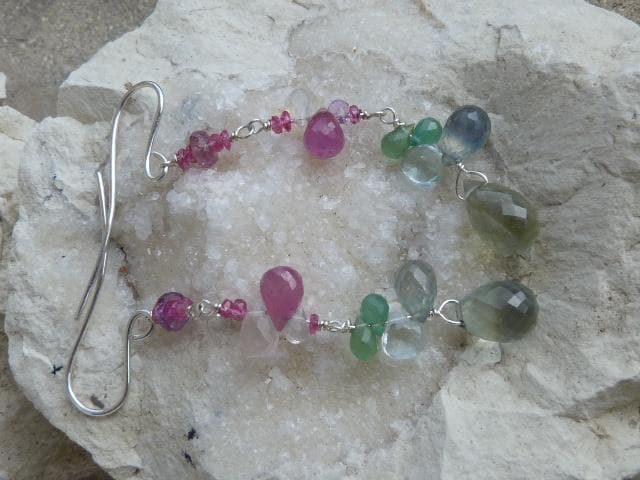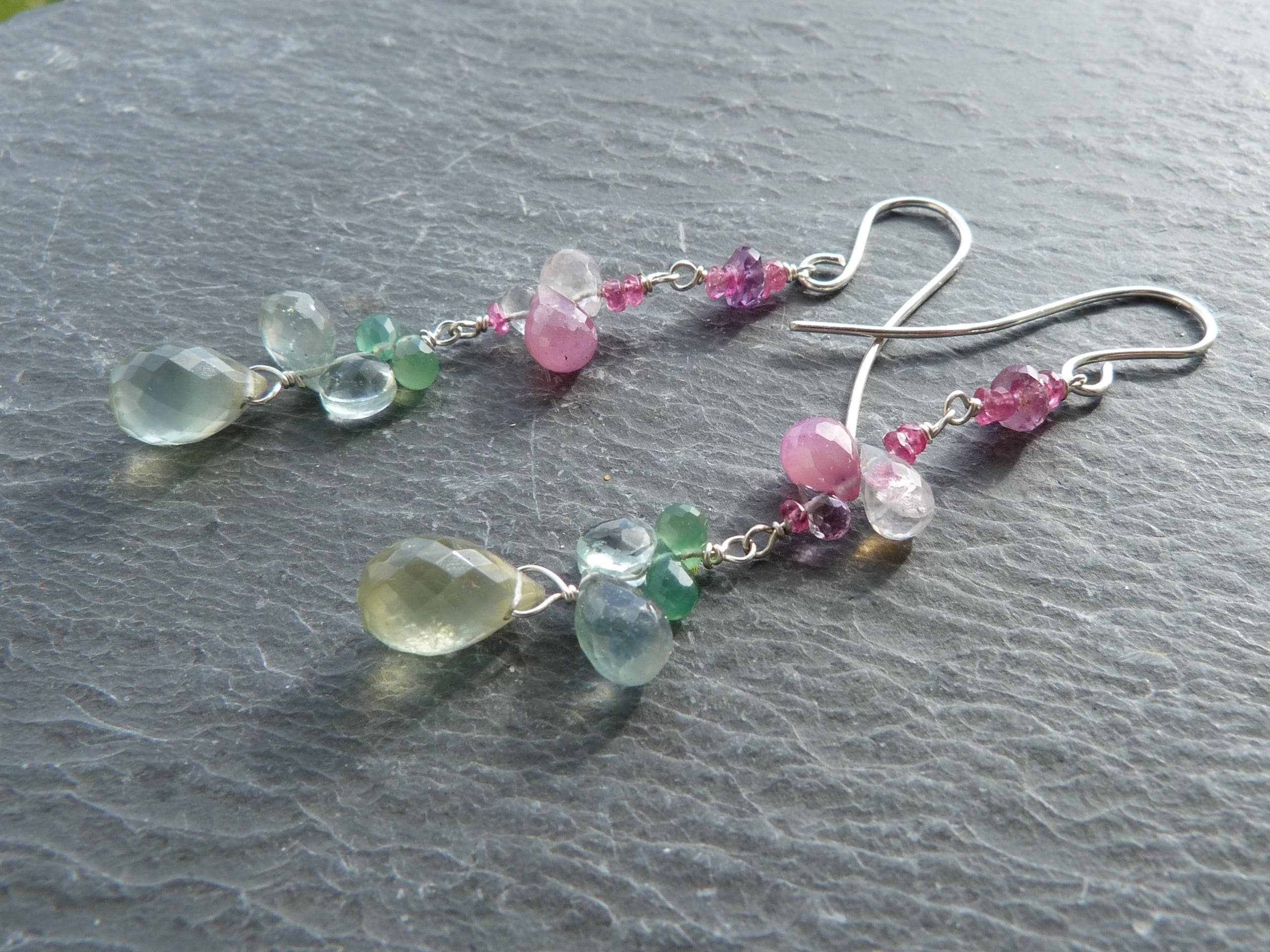 The metal is solid 925 silver with rose sapphire, aventurine, aqua marine, rose quartz and prehnit briolettes.