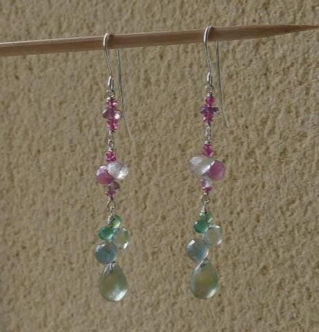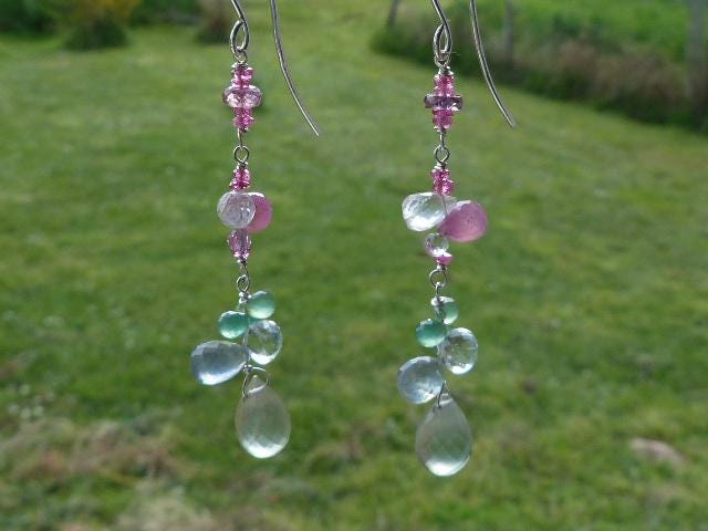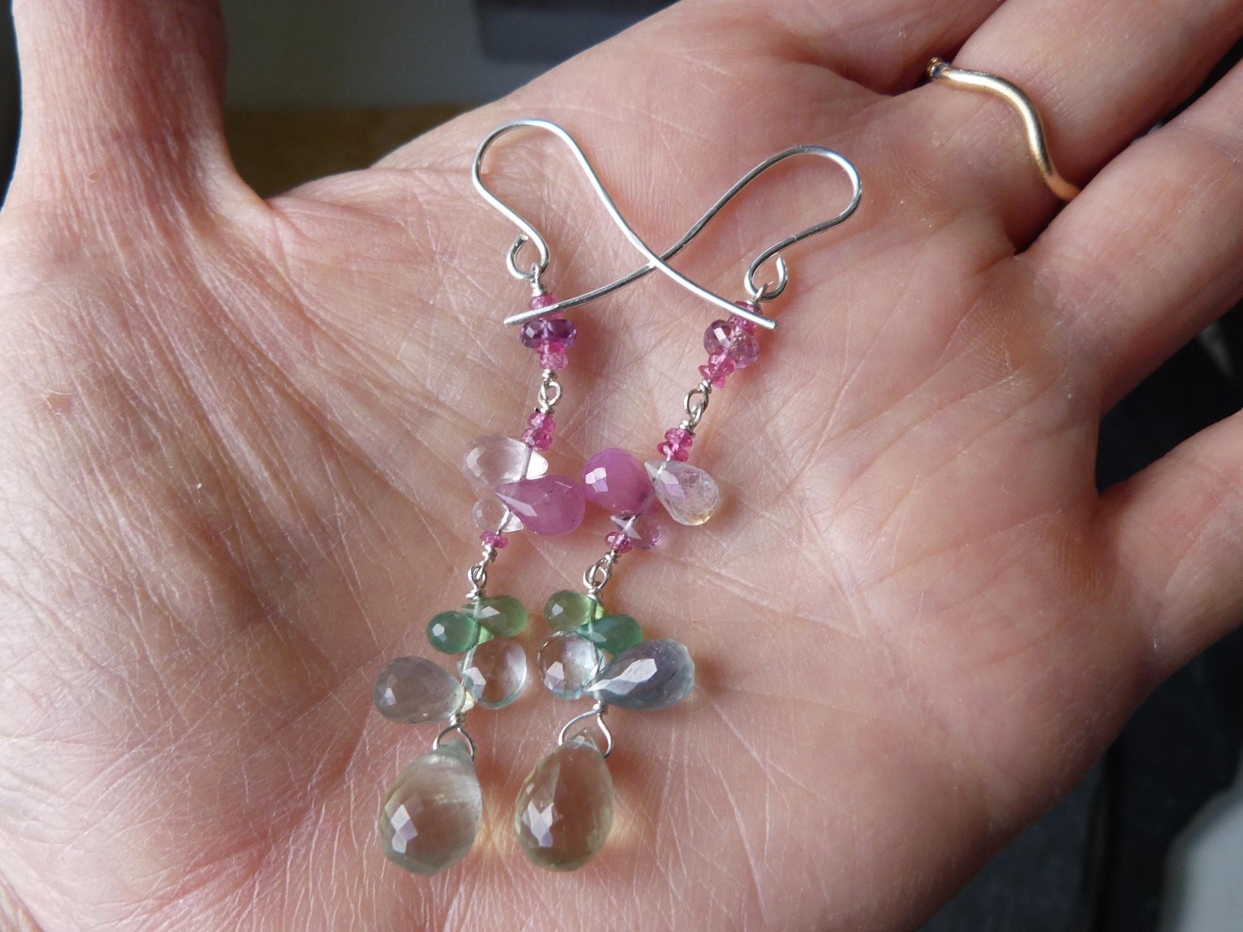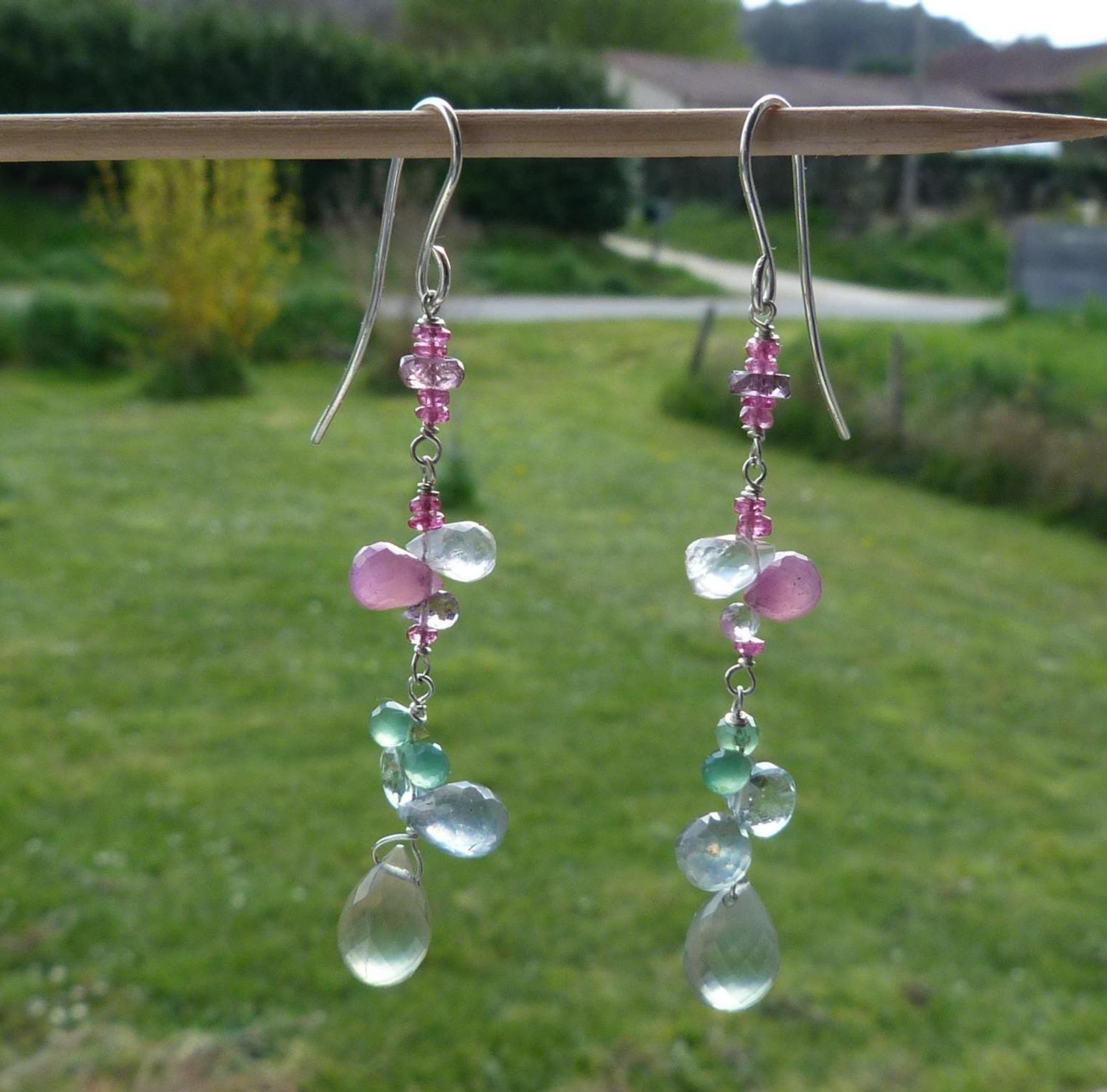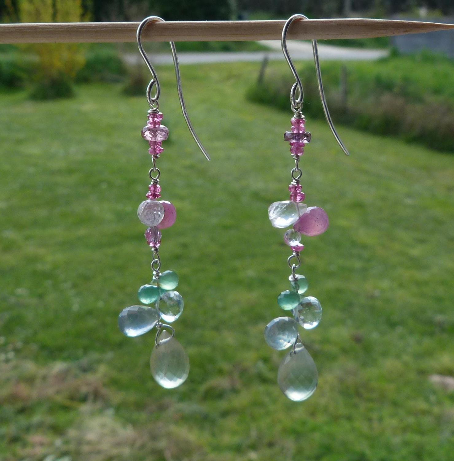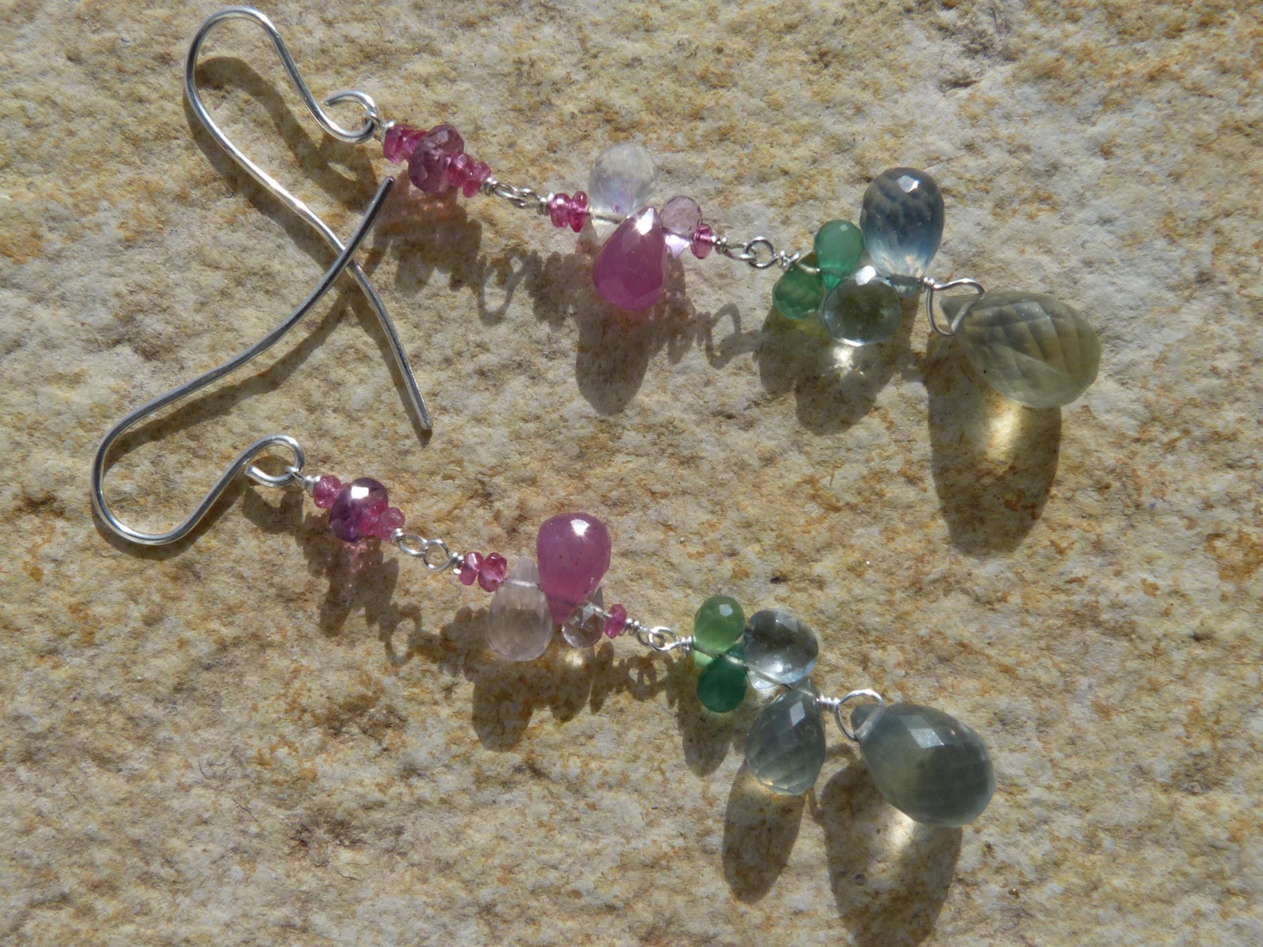 The metal is solid 925 silver with rose sapphire, aventurine, aqua marine, rose quartz and prehnit briolettes.